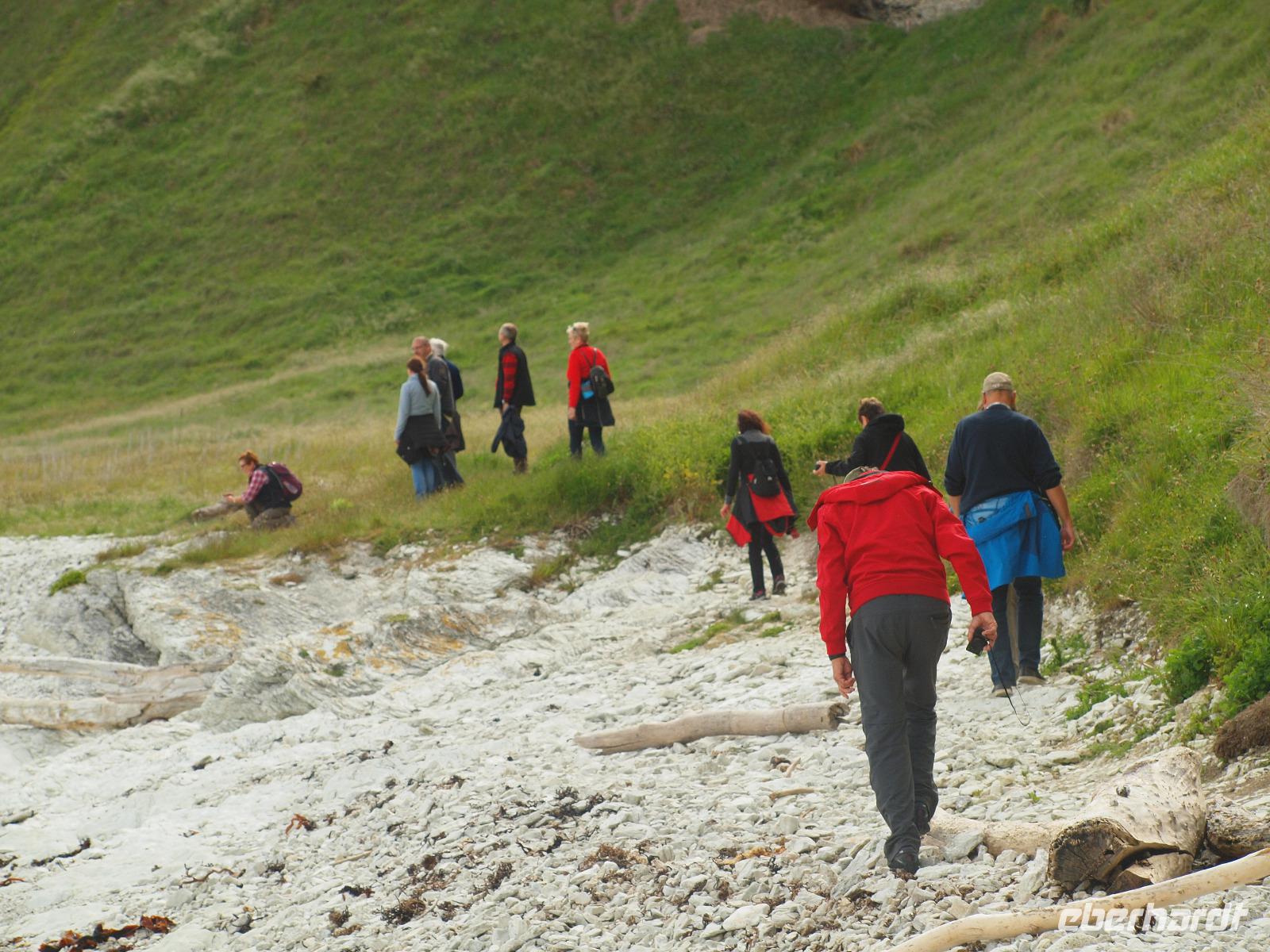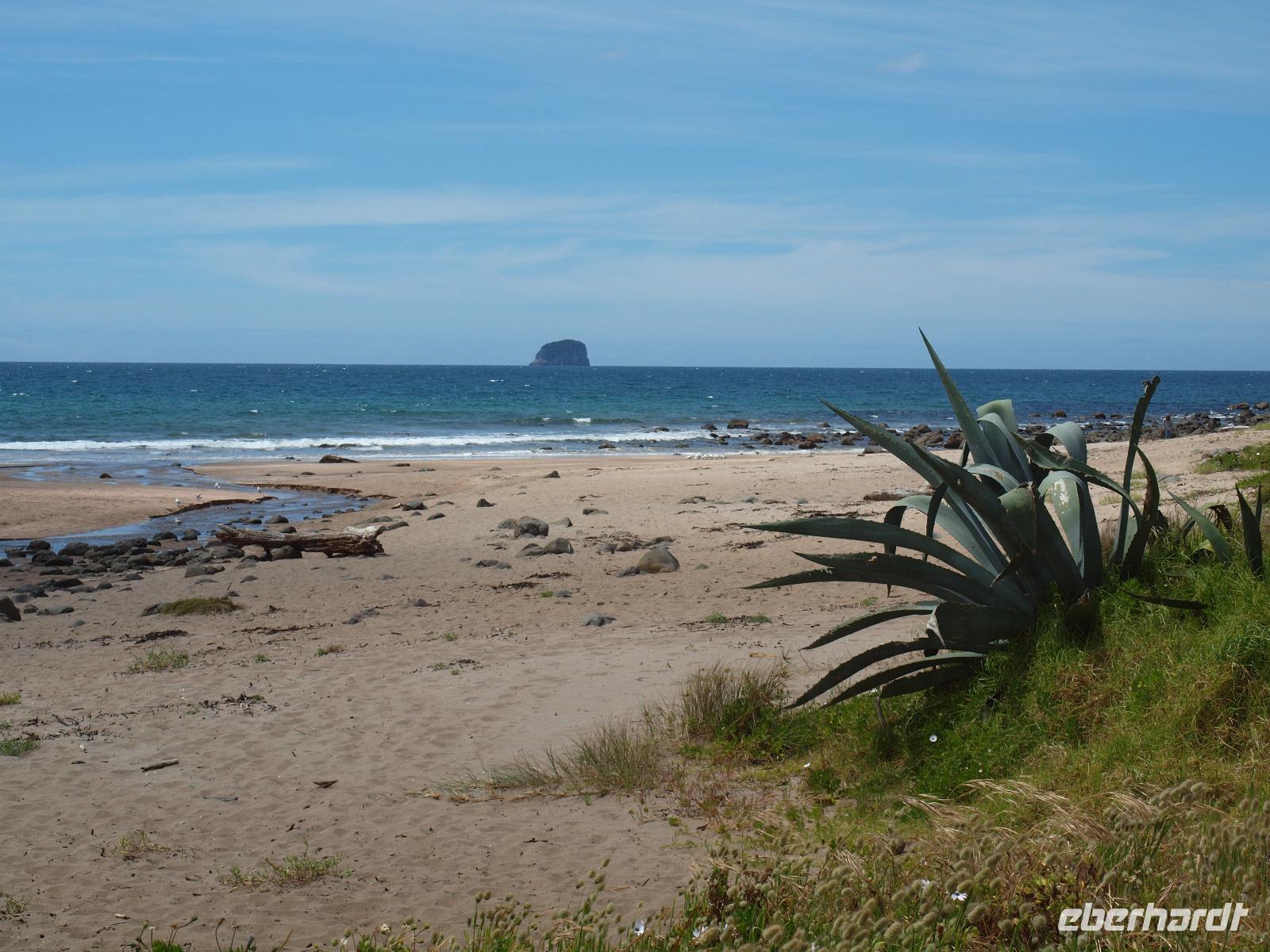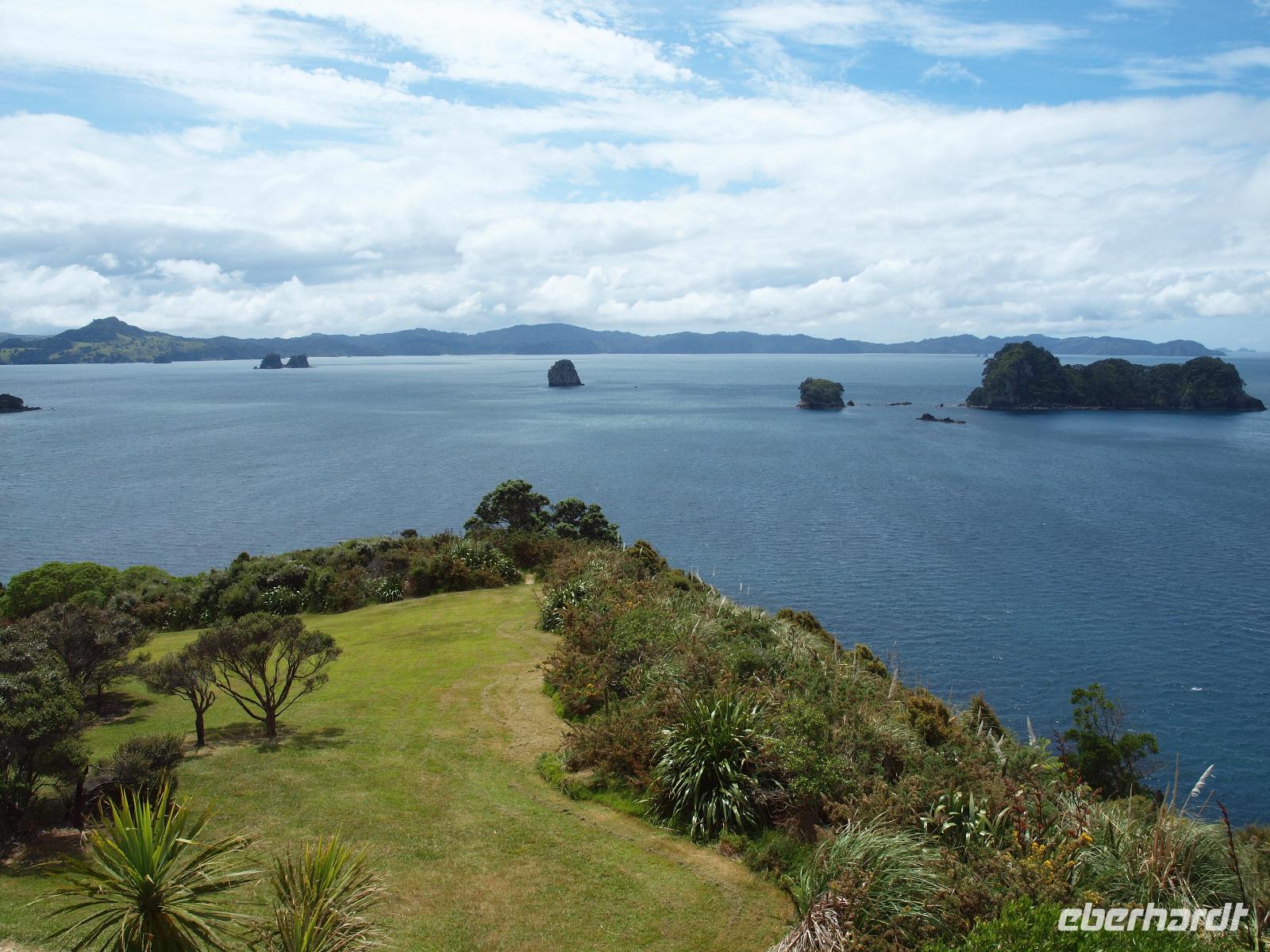 Selbst die Städter aus Auckland schätzen diese Gegend sehr. Der Ort Whangamata ist ein beliebter Urlaubsort. Wir fahren weiter nach Norden, zur Cathedral Cove. Von einem Parkplatz aus geht ein Weg entlang der Küste zur Bucht. Den Schildern nach benötigt man ca. 45 Minuten, der Weg führt mittlerweile auch nicht mehr über Stock und über Stein, nein, er ist inzwischen ausgebaut und geteert und somit etwas leichter zu gehen, die Höhen und Tiefen aber sind geblieben! Ein paar Treppen führen uns dann hinunter an den Strand. Die „Kathedrale" ist eine Höhle, die eine spitz zulaufende Decke aufweist und wie der Name schon sagt einer Kathedrale gleicht. Entstanden ist diese Ausprägung der Höhle durch unterschiedlich ausgerichtete Gesteinsschichten und durch die Wirkung der Gezeiten. Wir haben Glück und die Flut ist noch nicht zu hoch. Einige wagen sich sogar auf die andere Seite und riskieren nasse Füße. :)