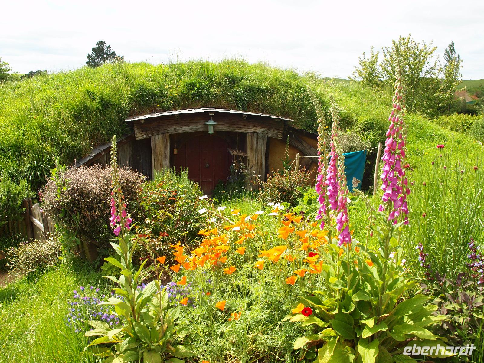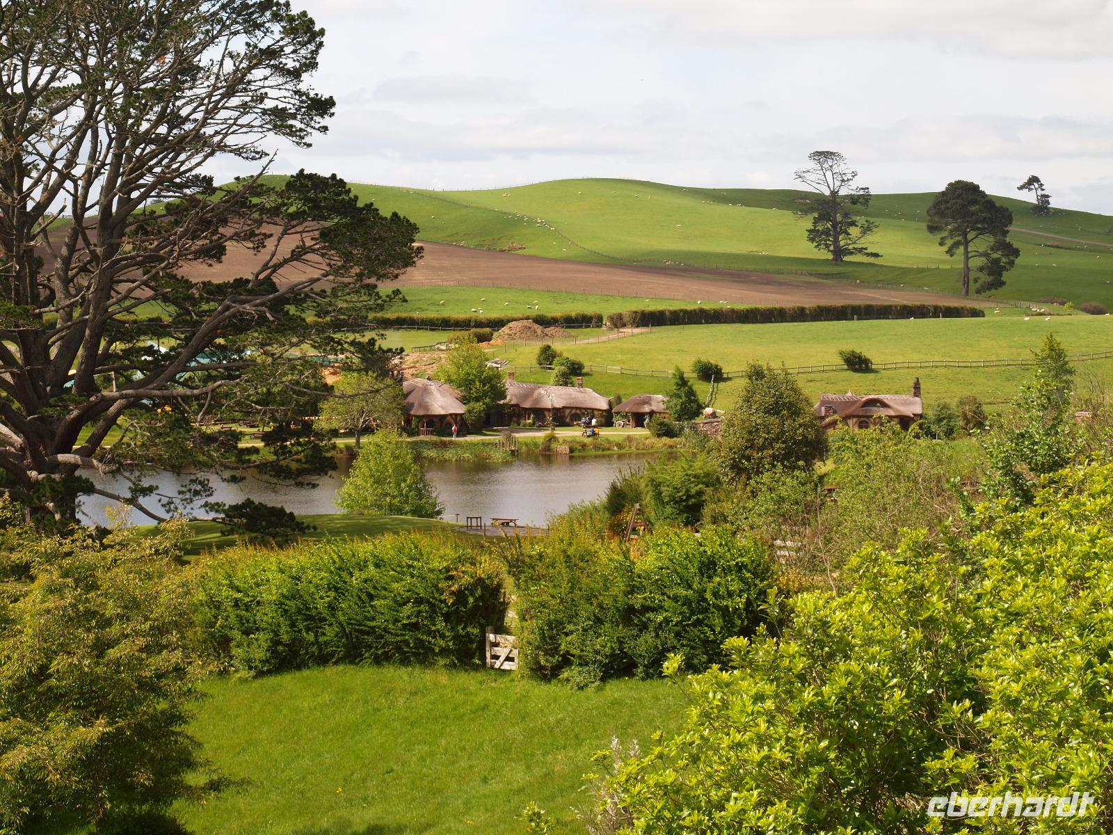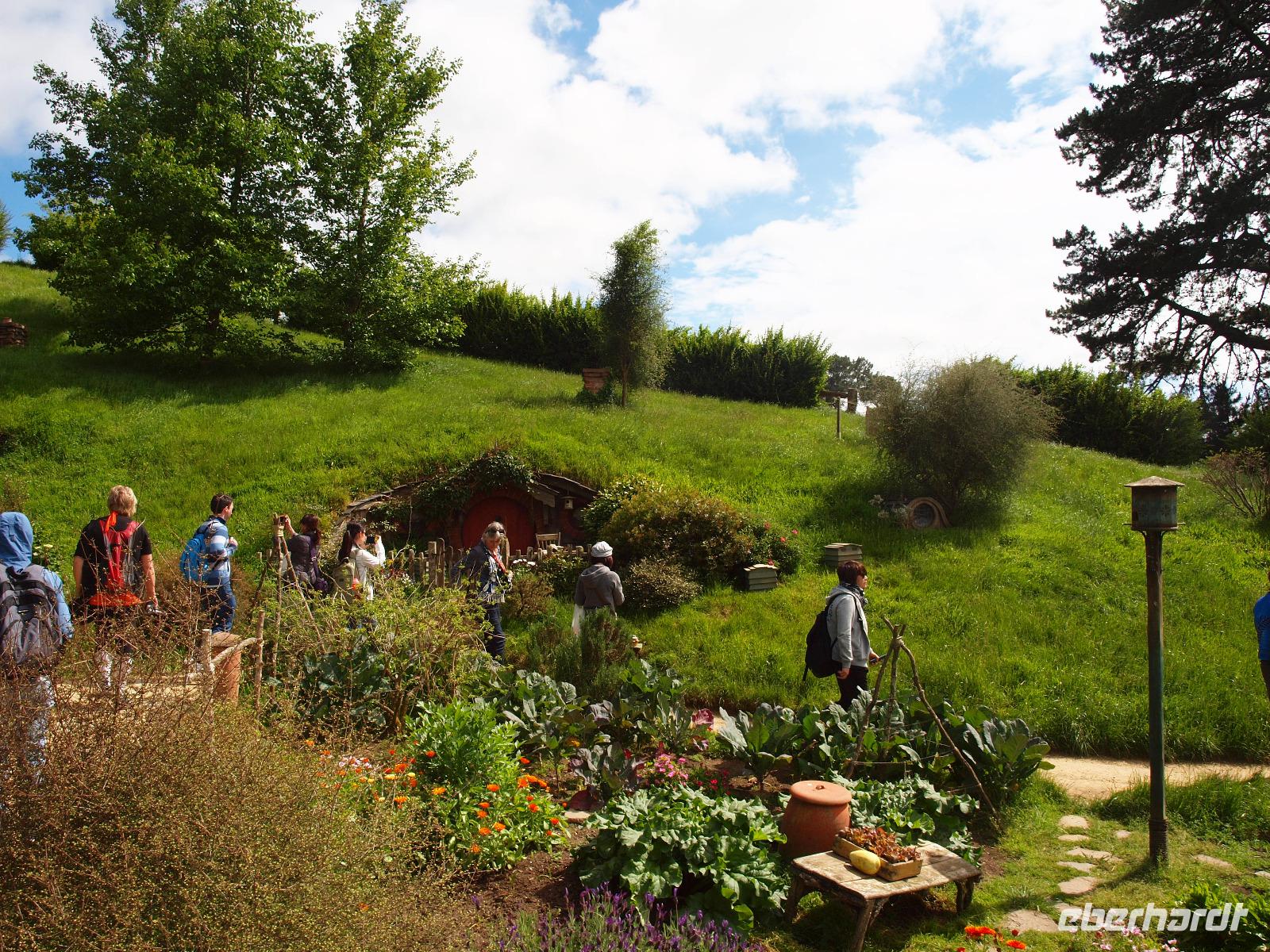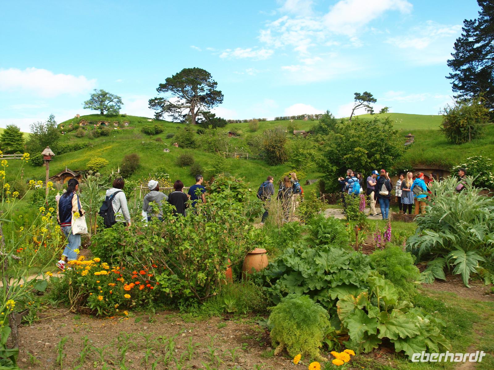 Der Morgen beginnt für einige von früher als für den Rest der Gruppe. Eine Handvoll Freiwillige begeben sich heute auf die Spuren der Hobbits. Von Rotorua aus fahren wir ca. eine Stunde lang durch grasgrüne Hügellandschaften immer weiter in nordwestliche Richtung, eigentlich in genau die Richtung, in der unser Tagesziel etwas später liegt... doch vorher biegen wir rechts nach Matamata ab, die Heimat der Hobbit-Drehorte. Die „Herr der Ringe"-Filmfreunde unter uns sind schon sehr gespannt auf das Filmset „Hobbiton". Während der Fahrt bekommen wir ein paar Informationen von unserem Fahrer bezüglich Rotorua und Umgebung, dann lässt er ein paar Videos über den Busmonitor abspielen, diese sollen uns schon mal in „Hobbit-Stimmung" bringen... Wir erreichen das Filmset und werden von unserem Guide Kacey in Empfang genommen. Er begleitet und führt uns durch die Anlage. Die kleinen Wohnhöhlen sind in die umliegenden Grashügel gebaut, nur kleine Höhlen sind dahinter, die gerade einmal Platz für zwei Personen bieten. Beim Dreh sind die Schauspieler nur schnell darin verschwunden und haben drinnen dann gewartet bis die Kamera vorbei war. Über die Hügel gehen wir an fast allen 40 Wohnhöhlen vorbei und mindestens drei Damen unserer Gruppe haben ein Foto von jeder Höhle. ;) Wir lassen uns etwas vom Fotografieren anstecken und lassen uns zusammen von Kacey fotografieren. Während des Rundgangs sehen wir die Liebe zum Detail. Die Gärten sind echt, das Gemüse kann man tatsächlich ernten und genießen. Die kleinen Briefkästen, Hofläden und Wäscheleinen runden das Bild ab, es fehlt nur noch dass die Bewohner draußen in der Sonne sitzen und sich bei einem Plausch mit den Nachbarn über die Schultern schauen lassen. Die Tour führt uns weiter über die große Wiese, wo sich im Film Groß und Klein zum Feiern und Amüsieren versammeln. Kurz danach erreichen wir den „Green Dragon" den Pub der Hobbits. Ein Freibier wartet hier auf uns und lässt die Besichtigung dann auch schon enden. Auf dem Weg zum Bus laufen wir entlang des Sees und hier sehen wir sogar die übrig gebliebenen Fischerutensilien und Fische. Dieses malerische Filmset benötigt keinerlei Verbesserung durch Technik. Der Produzent, Peter Jackson, hat hier wirklich 100 Prozent Leidenschaft gezeigt.