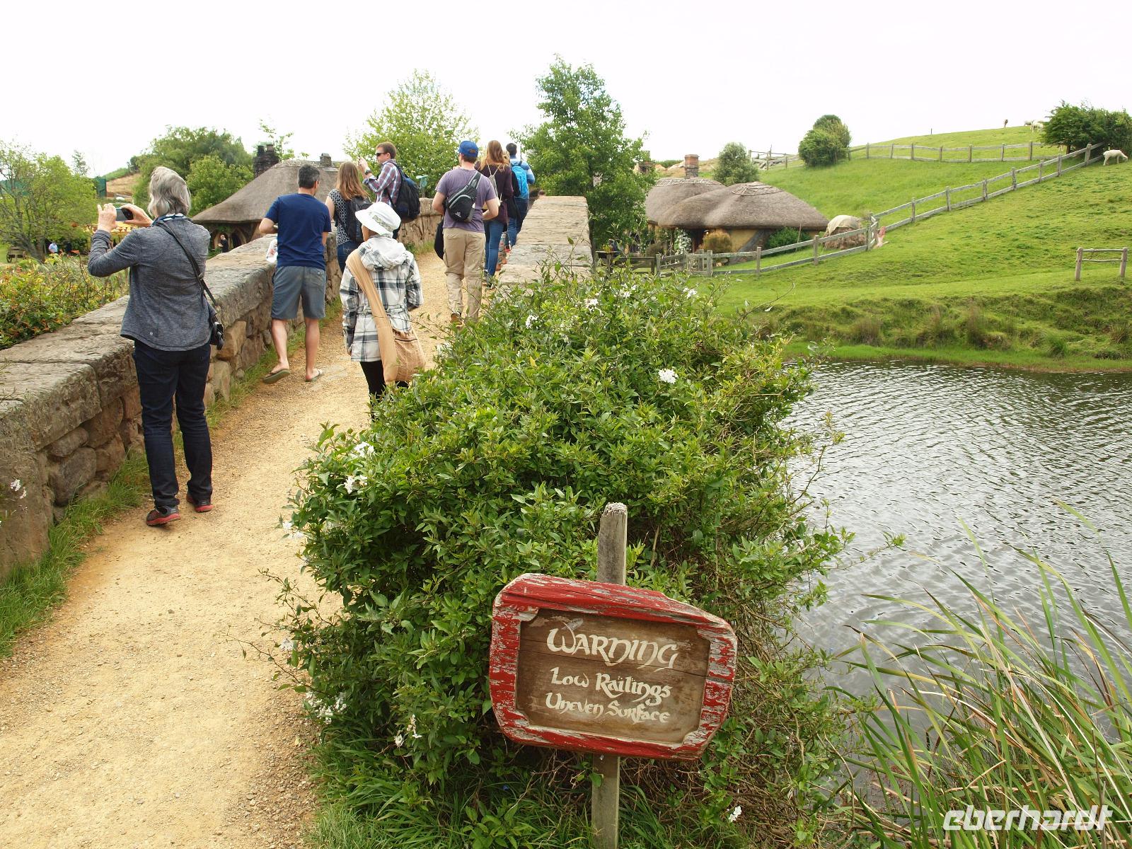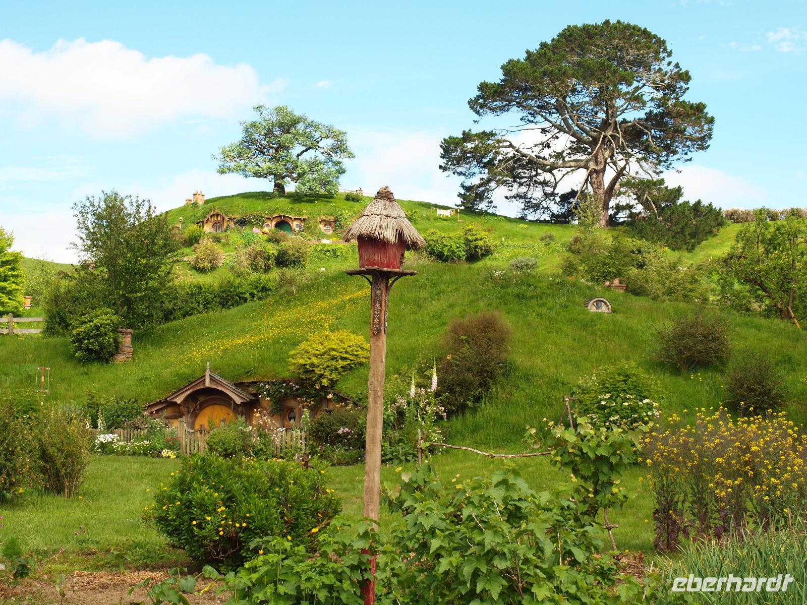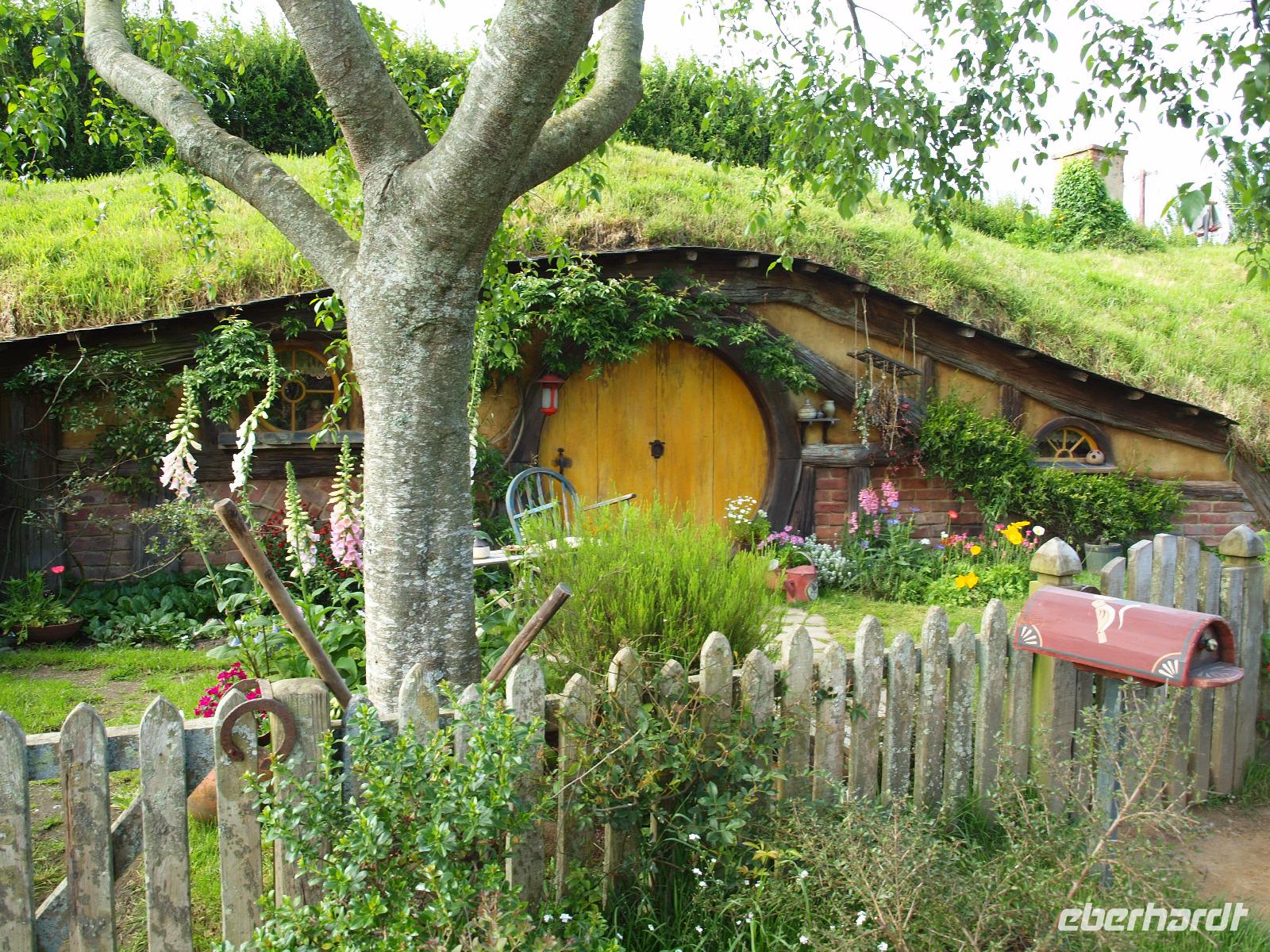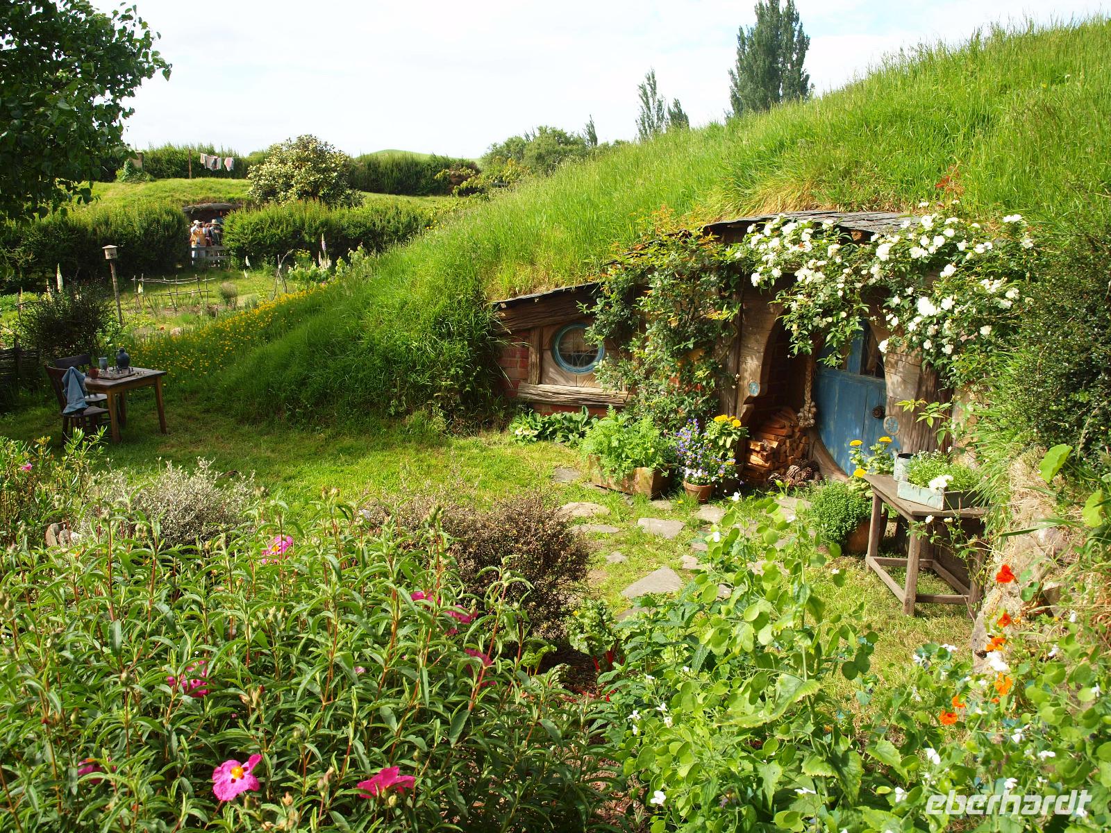 Der Morgen beginnt für einige von früher als für den Rest der Gruppe. Eine Handvoll Freiwillige begeben sich heute auf die Spuren der Hobbits. Von Rotorua aus fahren wir ca. eine Stunde lang durch grasgrüne Hügellandschaften immer weiter in nordwestliche Richtung, eigentlich in genau die Richtung, in der unser Tagesziel etwas später liegt... doch vorher biegen wir rechts nach Matamata ab, die Heimat der Hobbit-Drehorte. Die „Herr der Ringe"-Filmfreunde unter uns sind schon sehr gespannt auf das Filmset „Hobbiton". Während der Fahrt bekommen wir ein paar Informationen von unserem Fahrer bezüglich Rotorua und Umgebung, dann lässt er ein paar Videos über den Busmonitor abspielen, diese sollen uns schon mal in „Hobbit-Stimmung" bringen... Wir erreichen das Filmset und werden von unserem Guide Kacey in Empfang genommen. Er begleitet und führt uns durch die Anlage. Die kleinen Wohnhöhlen sind in die umliegenden Grashügel gebaut, nur kleine Höhlen sind dahinter, die gerade einmal Platz für zwei Personen bieten. Beim Dreh sind die Schauspieler nur schnell darin verschwunden und haben drinnen dann gewartet bis die Kamera vorbei war. Über die Hügel gehen wir an fast allen 40 Wohnhöhlen vorbei und mindestens drei Damen unserer Gruppe haben ein Foto von jeder Höhle. ;) Wir lassen uns etwas vom Fotografieren anstecken und lassen uns zusammen von Kacey fotografieren. Während des Rundgangs sehen wir die Liebe zum Detail. Die Gärten sind echt, das Gemüse kann man tatsächlich ernten und genießen. Die kleinen Briefkästen, Hofläden und Wäscheleinen runden das Bild ab, es fehlt nur noch dass die Bewohner draußen in der Sonne sitzen und sich bei einem Plausch mit den Nachbarn über die Schultern schauen lassen. Die Tour führt uns weiter über die große Wiese, wo sich im Film Groß und Klein zum Feiern und Amüsieren versammeln. Kurz danach erreichen wir den „Green Dragon" den Pub der Hobbits. Ein Freibier wartet hier auf uns und lässt die Besichtigung dann auch schon enden. Auf dem Weg zum Bus laufen wir entlang des Sees und hier sehen wir sogar die übrig gebliebenen Fischerutensilien und Fische. Dieses malerische Filmset benötigt keinerlei Verbesserung durch Technik. Der Produzent, Peter Jackson, hat hier wirklich 100 Prozent Leidenschaft gezeigt.