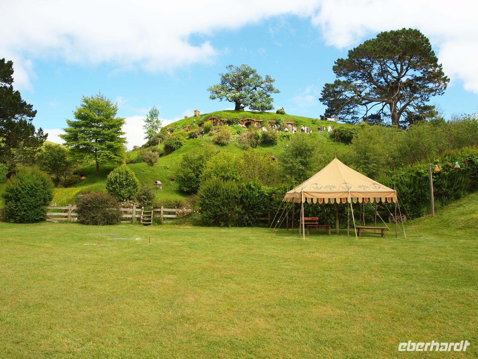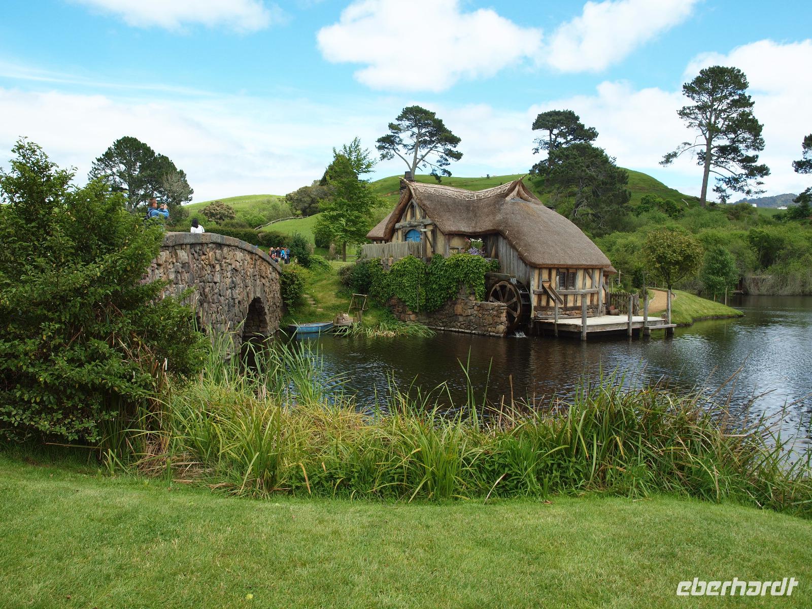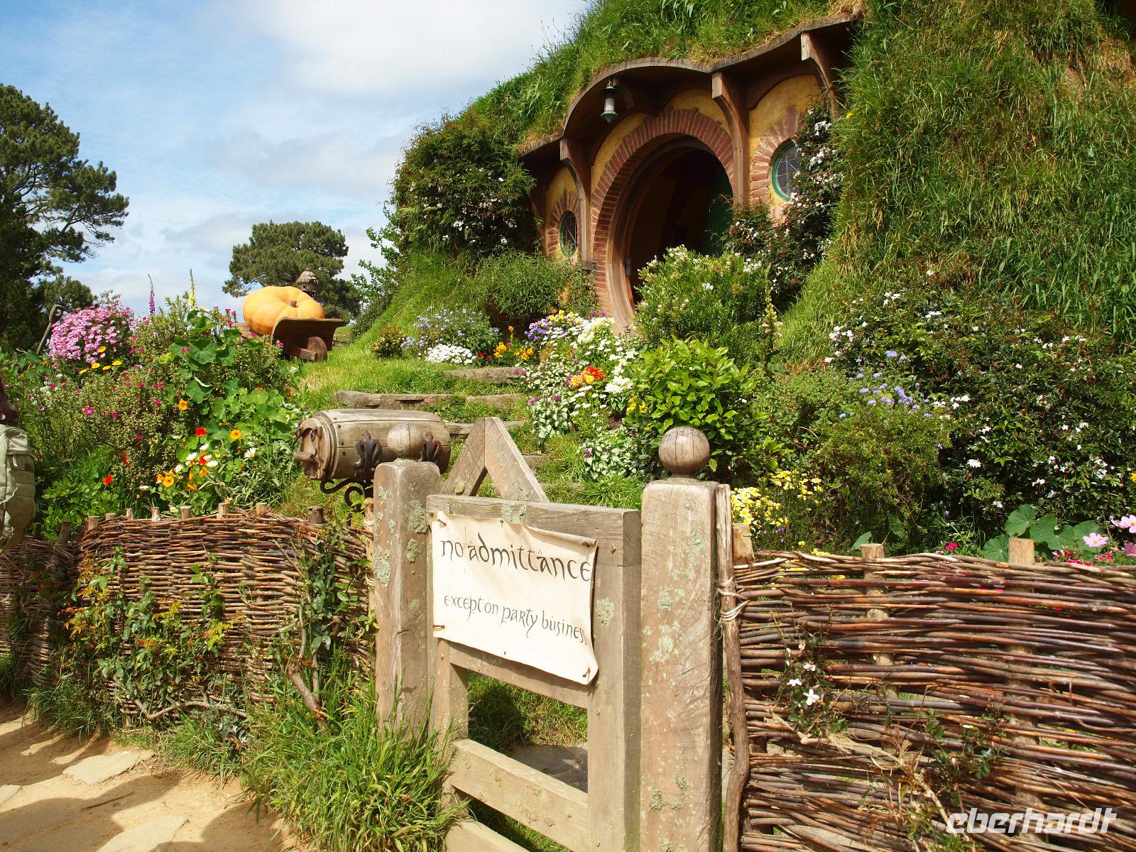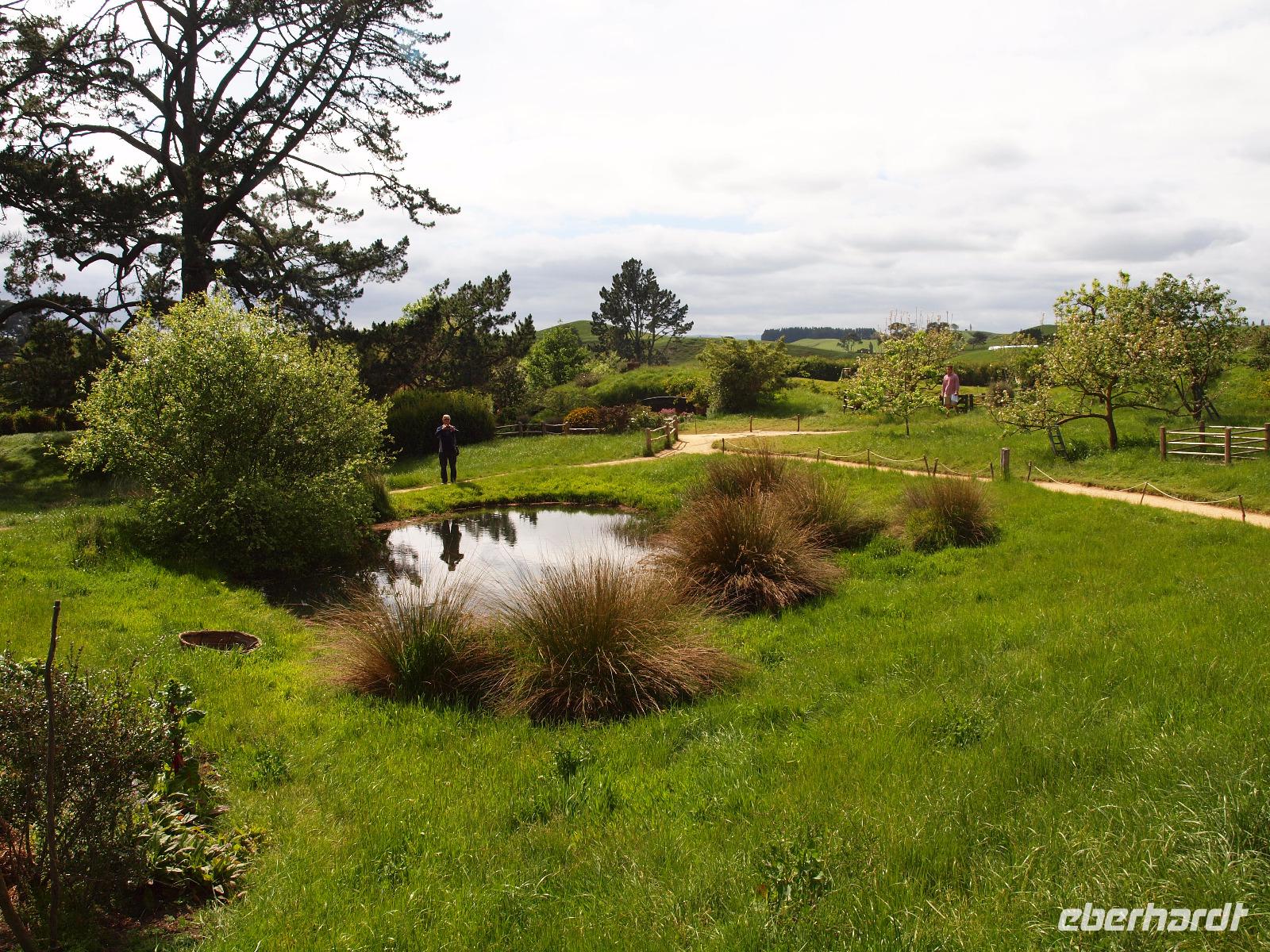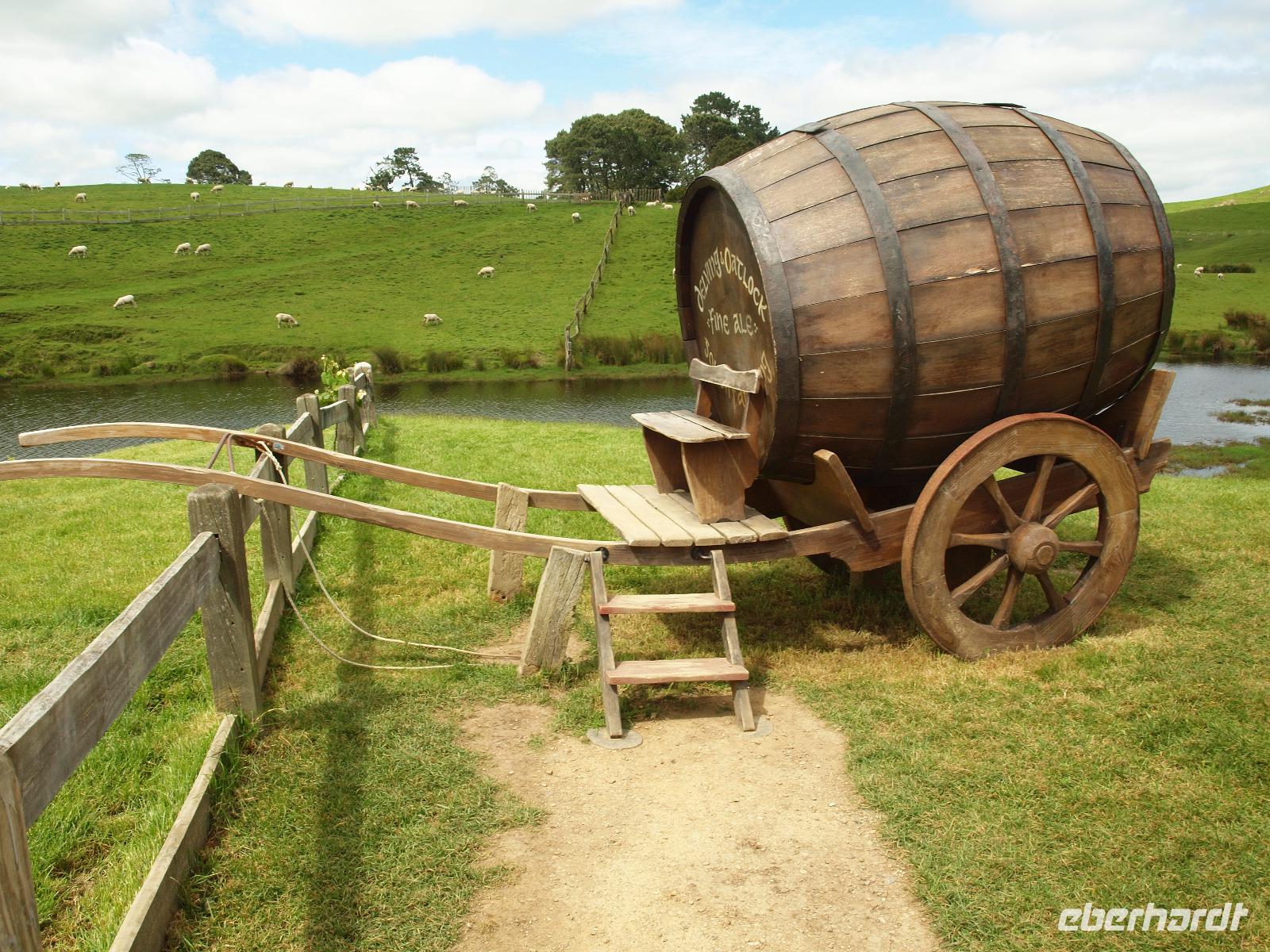 Der Morgen beginnt für einige von früher als für den Rest der Gruppe. Eine Handvoll Freiwillige begeben sich heute auf die Spuren der Hobbits. Von Rotorua aus fahren wir ca. eine Stunde lang durch grasgrüne Hügellandschaften immer weiter in nordwestliche Richtung, eigentlich in genau die Richtung, in der unser Tagesziel etwas später liegt... doch vorher biegen wir rechts nach Matamata ab, die Heimat der Hobbit-Drehorte. Die „Herr der Ringe"-Filmfreunde unter uns sind schon sehr gespannt auf das Filmset „Hobbiton". Während der Fahrt bekommen wir ein paar Informationen von unserem Fahrer bezüglich Rotorua und Umgebung, dann lässt er ein paar Videos über den Busmonitor abspielen, diese sollen uns schon mal in „Hobbit-Stimmung" bringen... Wir erreichen das Filmset und werden von unserem Guide Kacey in Empfang genommen. Er begleitet und führt uns durch die Anlage. Die kleinen Wohnhöhlen sind in die umliegenden Grashügel gebaut, nur kleine Höhlen sind dahinter, die gerade einmal Platz für zwei Personen bieten. Beim Dreh sind die Schauspieler nur schnell darin verschwunden und haben drinnen dann gewartet bis die Kamera vorbei war. Über die Hügel gehen wir an fast allen 40 Wohnhöhlen vorbei und mindestens drei Damen unserer Gruppe haben ein Foto von jeder Höhle. ;) Wir lassen uns etwas vom Fotografieren anstecken und lassen uns zusammen von Kacey fotografieren. Während des Rundgangs sehen wir die Liebe zum Detail. Die Gärten sind echt, das Gemüse kann man tatsächlich ernten und genießen. Die kleinen Briefkästen, Hofläden und Wäscheleinen runden das Bild ab, es fehlt nur noch dass die Bewohner draußen in der Sonne sitzen und sich bei einem Plausch mit den Nachbarn über die Schultern schauen lassen. Die Tour führt uns weiter über die große Wiese, wo sich im Film Groß und Klein zum Feiern und Amüsieren versammeln. Kurz danach erreichen wir den „Green Dragon" den Pub der Hobbits. Ein Freibier wartet hier auf uns und lässt die Besichtigung dann auch schon enden. Auf dem Weg zum Bus laufen wir entlang des Sees und hier sehen wir sogar die übrig gebliebenen Fischerutensilien und Fische. Dieses malerische Filmset benötigt keinerlei Verbesserung durch Technik. Der Produzent, Peter Jackson, hat hier wirklich 100 Prozent Leidenschaft gezeigt.