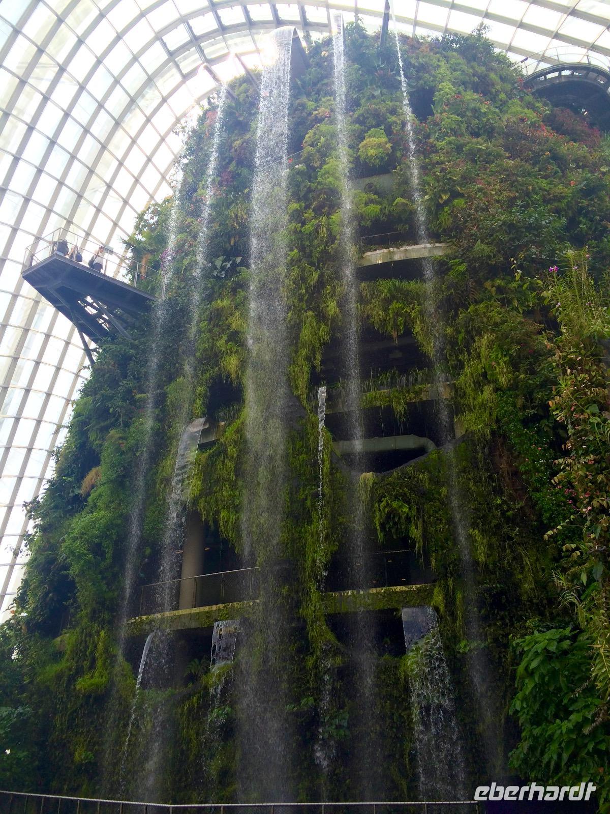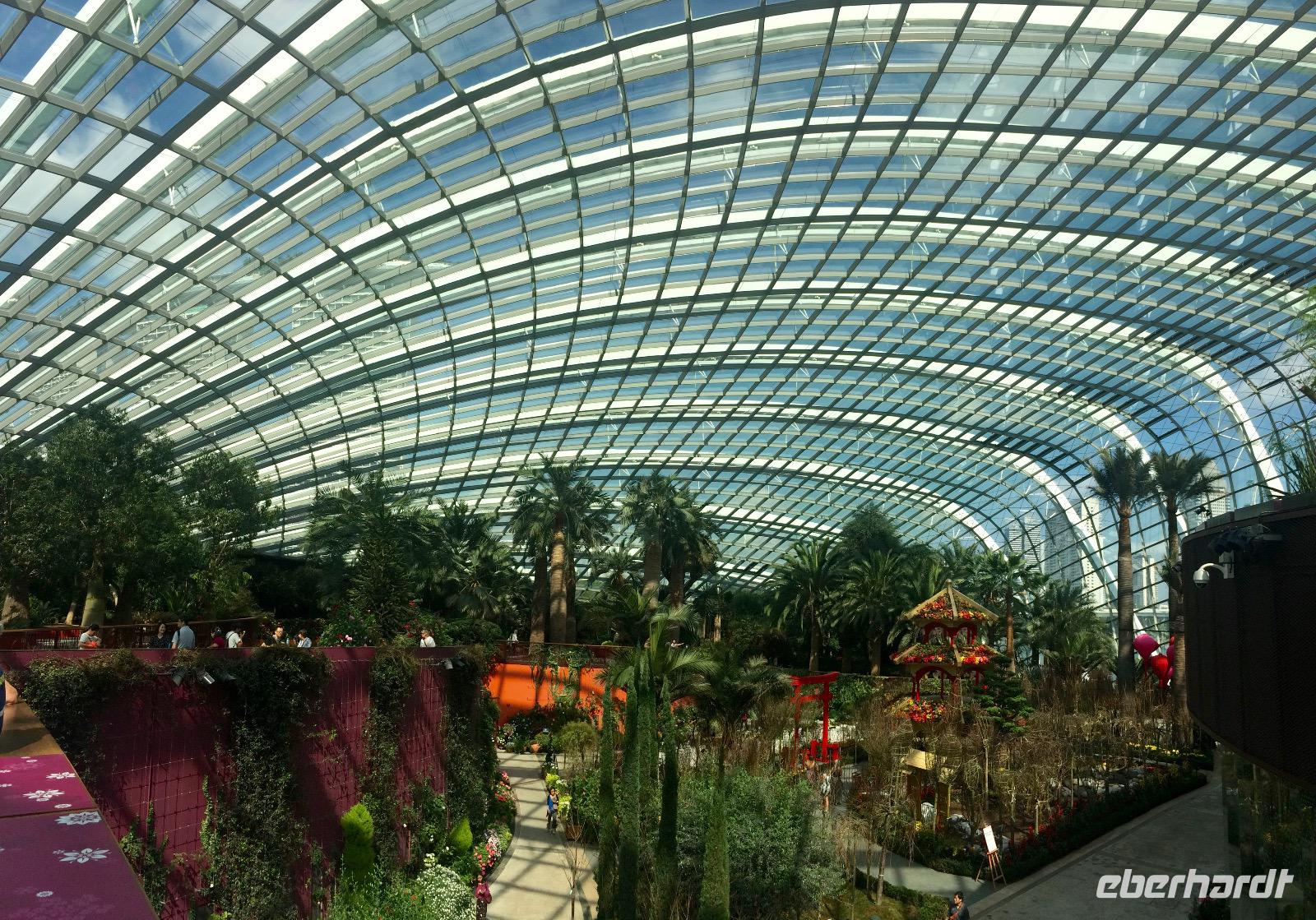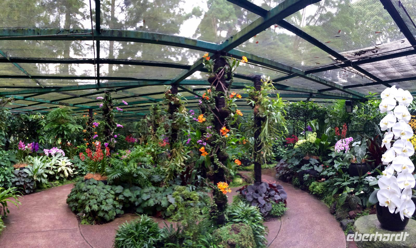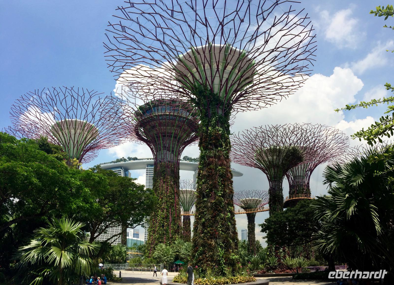 Singapur wurde im Jahr 1819 von Sir Raffles gegründet. Er sah in diesem Fischerdorf eine strategisch gute Lage zwischen Indien und China mit guter Voraussetzung für den Seehandel, denn das Gewässer vor dem Dorf war tief genug, um große Schiffe zu ankern. So wurde das kleine Fischerdorf für 140 Jahr zu einer englischen Kolonie und entwickelte sich rasant zu einer bedeutenden Handelsstadt in Asien. Daher kommt es auch, dass man in Singapur heute Linksverkehr hat, das Parlamentarische System wie auch das Bildungssystem sind britisch. Die hier aufwachsenden Kinder haben später sehr gute Chancen auf dem internationalen Arbeitsmarkt.Mit dem Taxi düsen wir durch den Verkehr zum Marina Bay Sands Hotel. Doch erst einmal merken wir, dass die Uhren hier anders ticken. Zehn Minuten nach offizieller Öffnungszeit sind die Türen noch immer geschlossen. Dann kommt ein Mitarbeiter und schaut mit verwundertem Gesicht durch die Glastür in die wartende Menschenmenge bis er bemerkt, dass sie vergessen haben, die Türen zu öffnen. Eiligen Schrittes holt er den Schlüssel und entlockt ein „Ah..." von unseren Lippen. Per Aufzug und ohne zu warten, denn wir haben ja bereits die Tickets, geht es auf die Aussichtsplattform auf der 56. Etage, den Skypark. Von hier bietet sich ein fantastischer Ausblick über die Stadt und die vorgelagerten Inseln. Wieder auf Meeresspiegelebene spazieren wir zu den Gardens by the Bay. Der Flower Doom präsentiert eine Vielfalt an Blumenbeten und Bäumen aus aller Welt, harmonisch dekoriert mit Stein- und Holzskulpturen. Sobald wir den Cloud Forest betreten weiten sich unsere Augen und die Münder formen ein großes O. Wir stehen vor einem riesigen Wasserfall, der von einem üppig bewachsenen Berg hinabstürzt. Die Vielfalt der Farnen, Palmen und Blumen begeistert uns. Auf einem Abenteuerpfad klettern wir diesen tropischen Regenwald hinab. Auf der Außenanlage schlendern wir durch die kleinen Themengärten und den berühmten Big Tree Grove.Von einem Garten geht es nun zum anderen. Martine nimmt uns mit zum Orchideengarten. Eine Fülle und Pracht an Farben, Formen und Größen reizt unsere Sinne. Damit wir auch wirklich alles erlebt haben, scheint Petrus beschlossen zu haben, dass wir auch den gewaltigen Tropenregen ausprobieren sollten. Naja, immerhin ist es trotzdem warm und wir nehmen diesen Gruß mit Humor. Martine erzählt uns während der Stadtrundfahrt über das friedliche Zusammenleben der verschiedenen Ethnien, hauptsächlich finden wir Chinesen, Malaien, Inder und Eurasier vor. Etwa eine weitere Million Menschen sind Gastarbeiter, Bewohner aus Pakistan oder Bangladesch arbeiten auf den Straßen im Bau und zahlreiche Europäer wie auch Amerikaner sind in den großen Firmen im Management tätig. Während der Fahrt durchqueren wir die verschiedenen Stadteile wie das bunte Little India-Stadtteil, das koloniale Viertel mit dem futuristisch aussehenden Gerichtsgebäude sowie dem quirligen Chinatown. Was es hier alles so gibt...Gut gelaunt treten wir nun den zweiten Teil unserer Reise an und steigen in den A380 mit dem nächsten Ziel: das andere Ende der Welt.