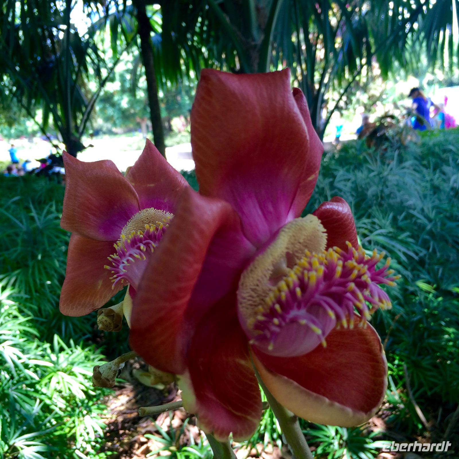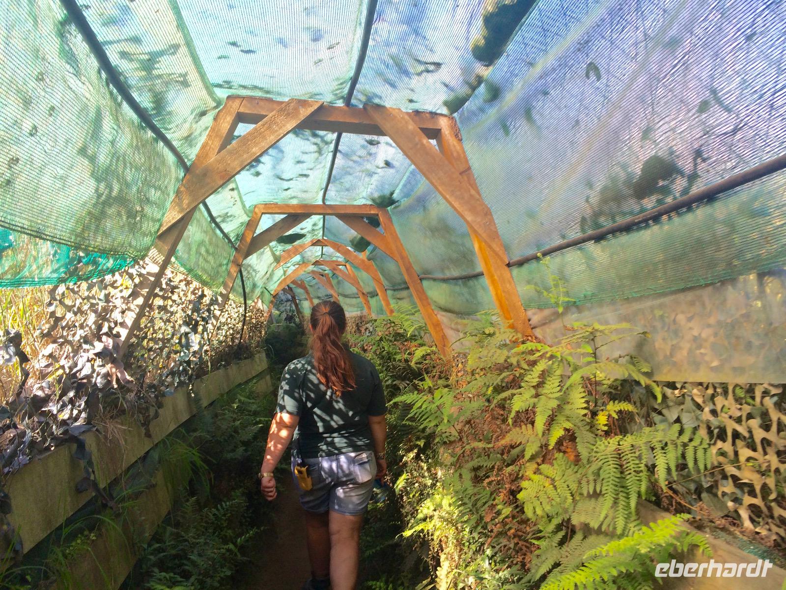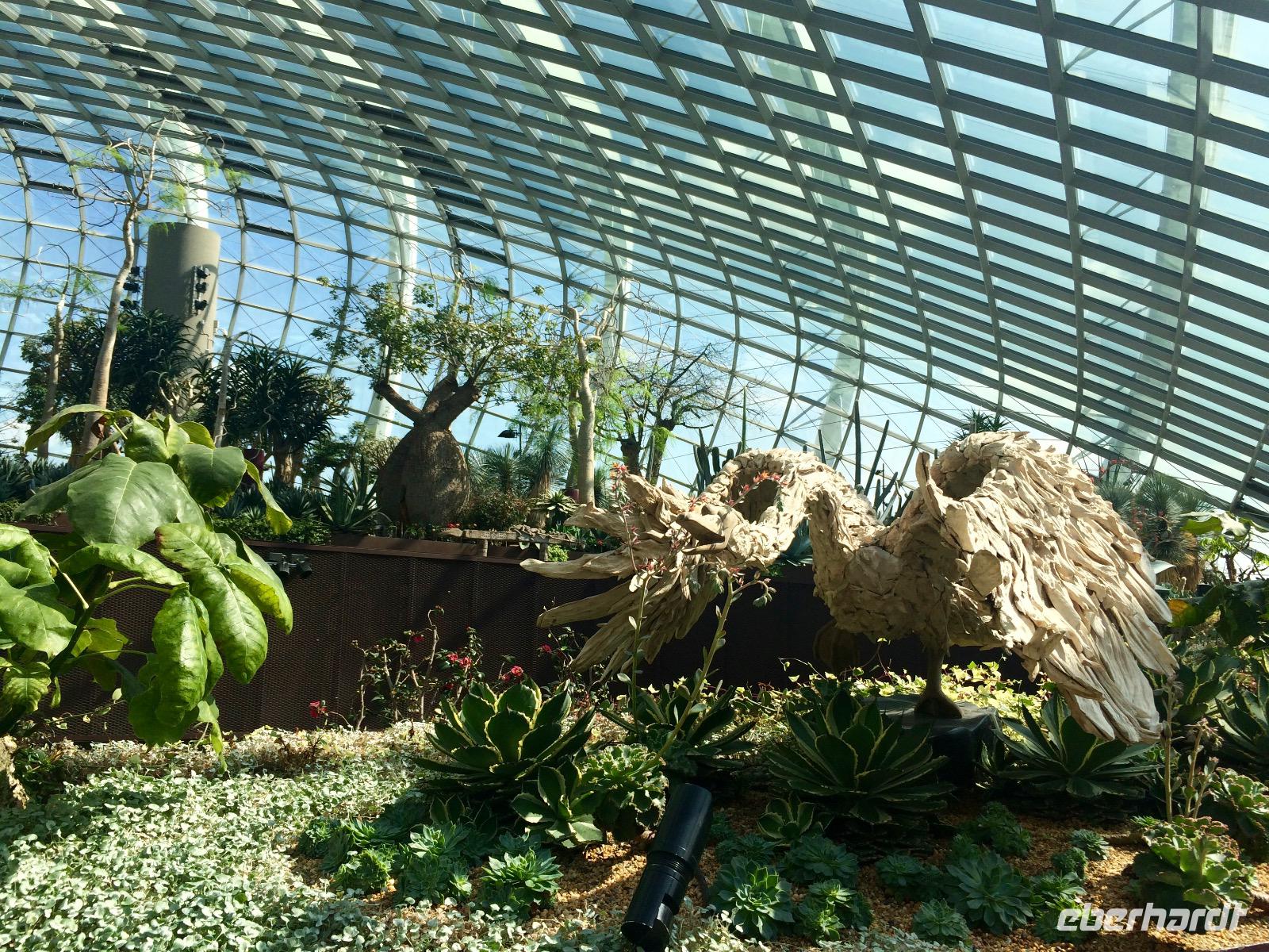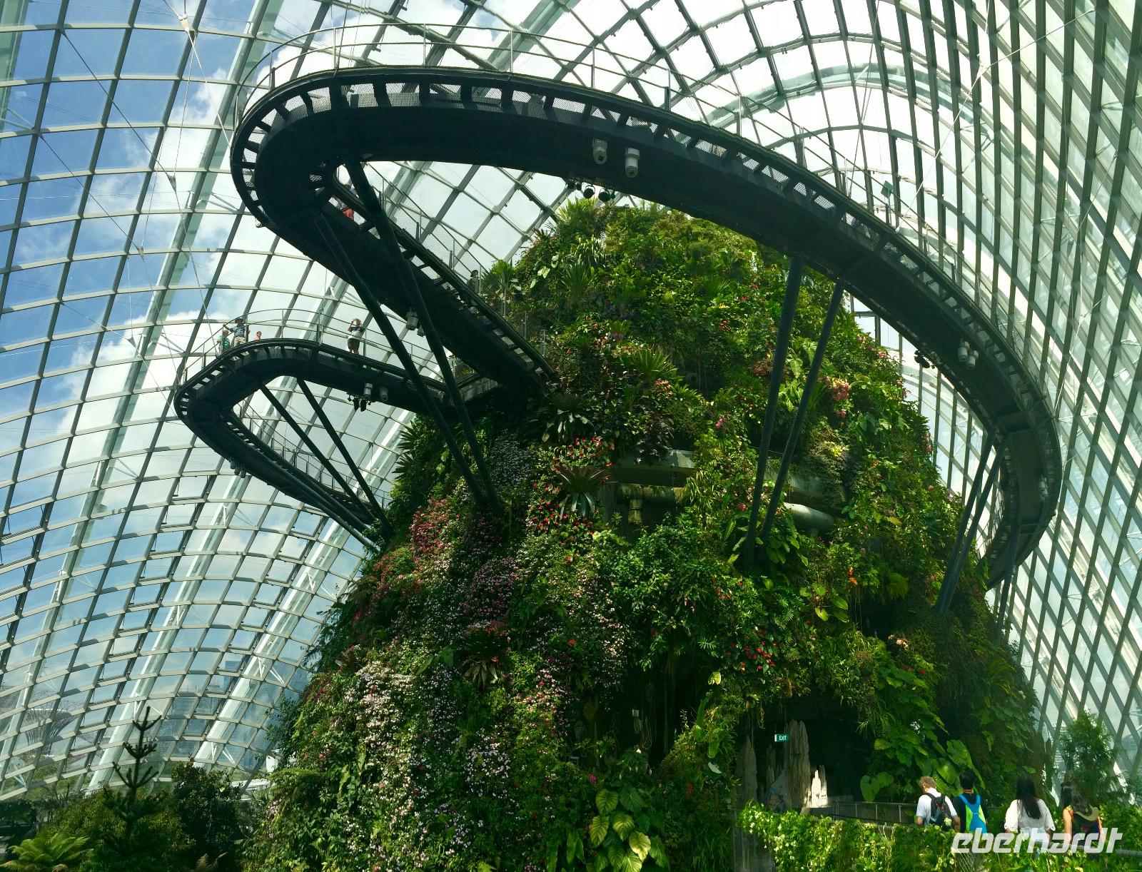 Singapur wurde im Jahr 1819 von Sir Raffles gegründet. Er sah in diesem Fischerdorf eine strategisch gute Lage zwischen Indien und China mit guter Voraussetzung für den Seehandel, denn das Gewässer vor dem Dorf war tief genug, um große Schiffe zu ankern. So wurde das kleine Fischerdorf für 140 Jahr zu einer englischen Kolonie und entwickelte sich rasant zu einer bedeutenden Handelsstadt in Asien. Daher kommt es auch, dass man in Singapur heute Linksverkehr hat, das Parlamentarische System wie auch das Bildungssystem sind britisch. Die hier aufwachsenden Kinder haben später sehr gute Chancen auf dem internationalen Arbeitsmarkt.Mit dem Taxi düsen wir durch den Verkehr zum Marina Bay Sands Hotel. Doch erst einmal merken wir, dass die Uhren hier anders ticken. Zehn Minuten nach offizieller Öffnungszeit sind die Türen noch immer geschlossen. Dann kommt ein Mitarbeiter und schaut mit verwundertem Gesicht durch die Glastür in die wartende Menschenmenge bis er bemerkt, dass sie vergessen haben, die Türen zu öffnen. Eiligen Schrittes holt er den Schlüssel und entlockt ein „Ah..." von unseren Lippen. Per Aufzug und ohne zu warten, denn wir haben ja bereits die Tickets, geht es auf die Aussichtsplattform auf der 56. Etage, den Skypark. Von hier bietet sich ein fantastischer Ausblick über die Stadt und die vorgelagerten Inseln. Wieder auf Meeresspiegelebene spazieren wir zu den Gardens by the Bay. Der Flower Doom präsentiert eine Vielfalt an Blumenbeten und Bäumen aus aller Welt, harmonisch dekoriert mit Stein- und Holzskulpturen. Sobald wir den Cloud Forest betreten weiten sich unsere Augen und die Münder formen ein großes O. Wir stehen vor einem riesigen Wasserfall, der von einem üppig bewachsenen Berg hinabstürzt. Die Vielfalt der Farnen, Palmen und Blumen begeistert uns. Auf einem Abenteuerpfad klettern wir diesen tropischen Regenwald hinab. Auf der Außenanlage schlendern wir durch die kleinen Themengärten und den berühmten Big Tree Grove.Von einem Garten geht es nun zum anderen. Martine nimmt uns mit zum Orchideengarten. Eine Fülle und Pracht an Farben, Formen und Größen reizt unsere Sinne. Damit wir auch wirklich alles erlebt haben, scheint Petrus beschlossen zu haben, dass wir auch den gewaltigen Tropenregen ausprobieren sollten. Naja, immerhin ist es trotzdem warm und wir nehmen diesen Gruß mit Humor. Martine erzählt uns während der Stadtrundfahrt über das friedliche Zusammenleben der verschiedenen Ethnien, hauptsächlich finden wir Chinesen, Malaien, Inder und Eurasier vor. Etwa eine weitere Million Menschen sind Gastarbeiter, Bewohner aus Pakistan oder Bangladesch arbeiten auf den Straßen im Bau und zahlreiche Europäer wie auch Amerikaner sind in den großen Firmen im Management tätig. Während der Fahrt durchqueren wir die verschiedenen Stadteile wie das bunte Little India-Stadtteil, das koloniale Viertel mit dem futuristisch aussehenden Gerichtsgebäude sowie dem quirligen Chinatown. Was es hier alles so gibt...Gut gelaunt treten wir nun den zweiten Teil unserer Reise an und steigen in den A380 mit dem nächsten Ziel: das andere Ende der Welt.