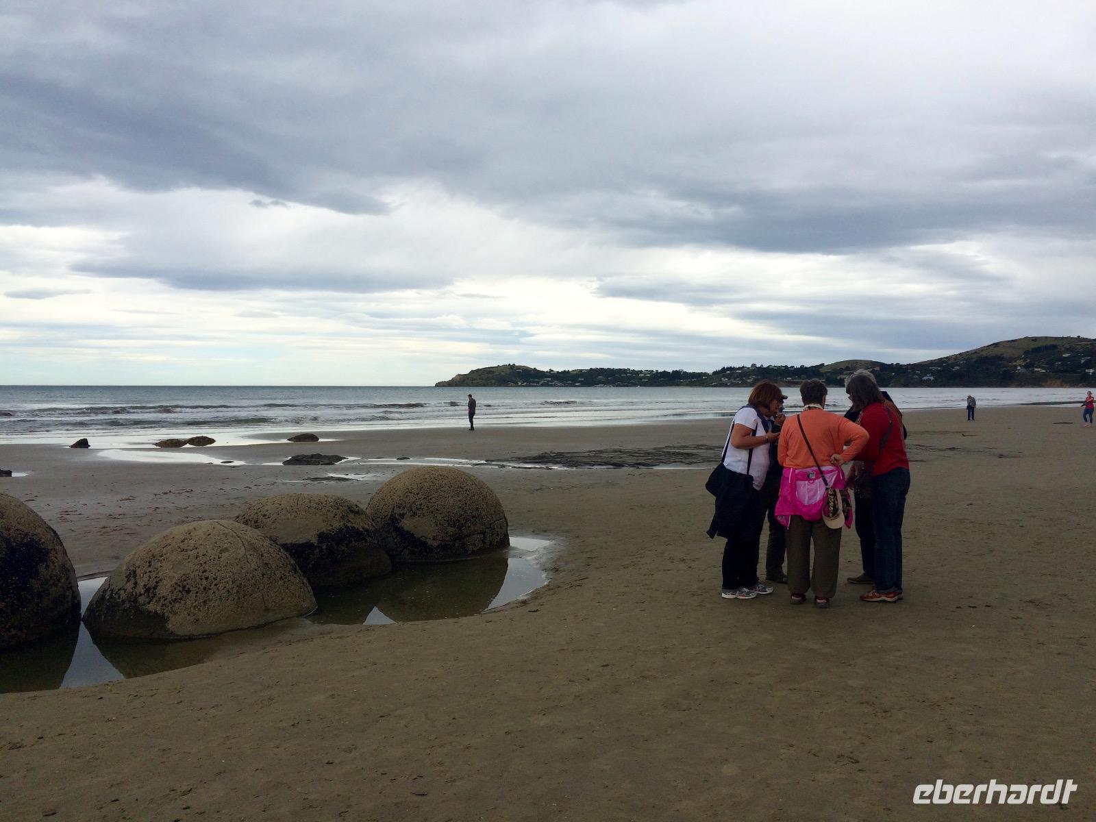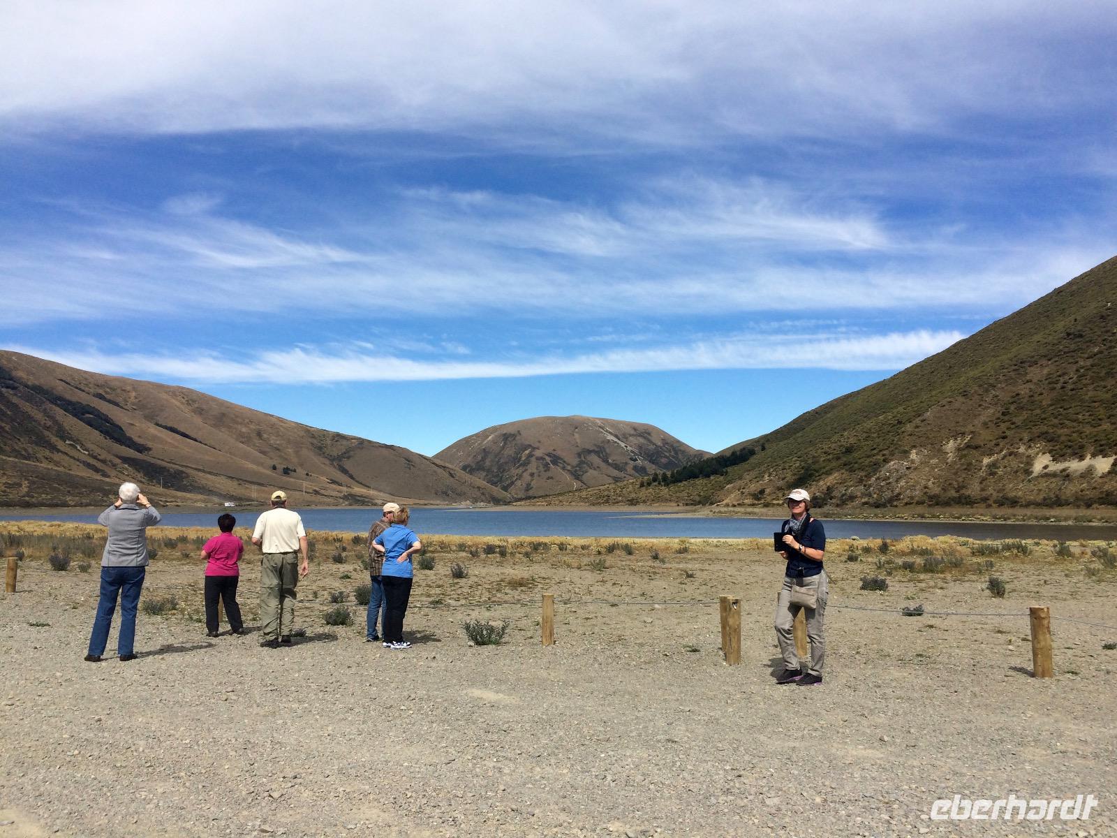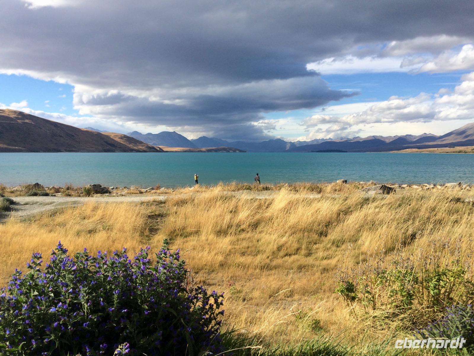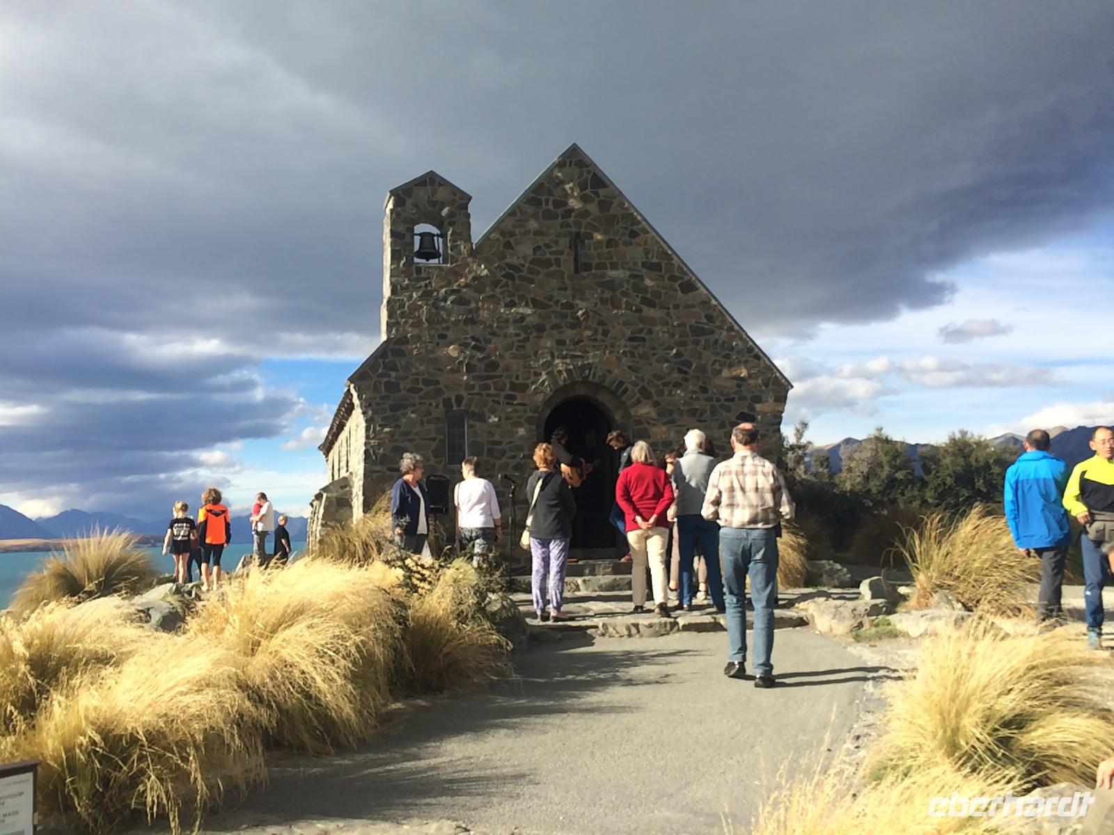 Der Tag ist vollgepackt mit spannenden Begegnungen. Erneut reisen wir durch diese neuseelandtypische Landschaft der "rolling hills". An der Küste legen wir einen Stopp bei den Moeraki Boulders ein, wo wir am Strand seltsam anmutende Steinkugeln finden. Eine beeindruckende Laune der Natur! In Richtung Landesinnere durchqueren wir die Mackenzie Hochebene: goldenes Tussockgras vor der Kulisse schneebedeckter Berge - wir befinden wir uns mitten im "Merino-Land", wo die Merino-Schafe für ihre hochwertige Wolle gezüchtet werden. Am smaragdgrünen Lake Tekapo werden wir Zeugen einer kleinen Hochzeit in der Church of the Good Sheperd (in der Kirche des guten Hirtens) und sehen das wohlmöglich schönste Altarbild der Welt - ein Panoramablick auf den See und den Mount Cook. Leider versteckt er sich gerade hinter den Wolken, aber das macht nichts. Wir haben seine volle Pracht schon einmal erleben dürfen und wir wissen, das können nicht viele behaupten. Wir beziehen unser Hotel am Lake Tekapo und lernen die indische Kiwi-Seite im Hotelrestaurant kennen. *Zwinker*