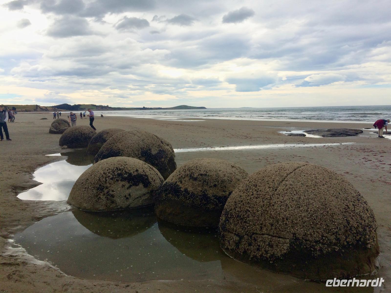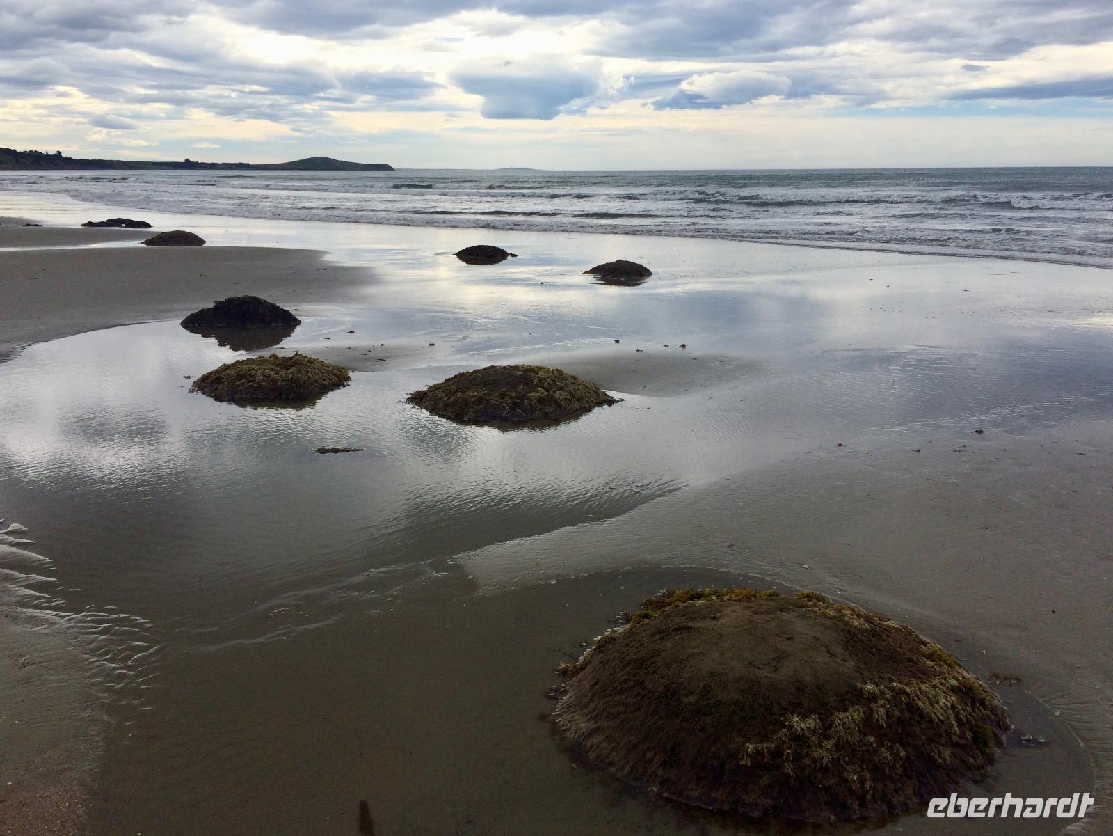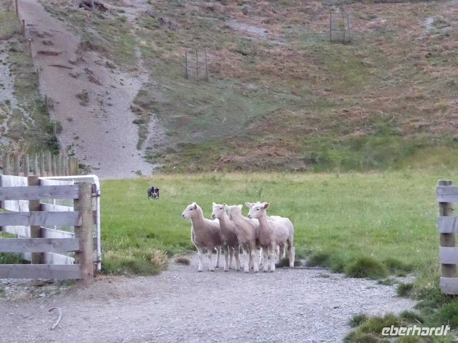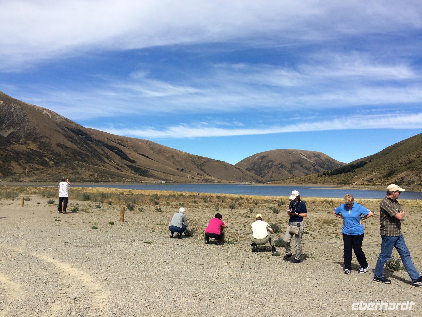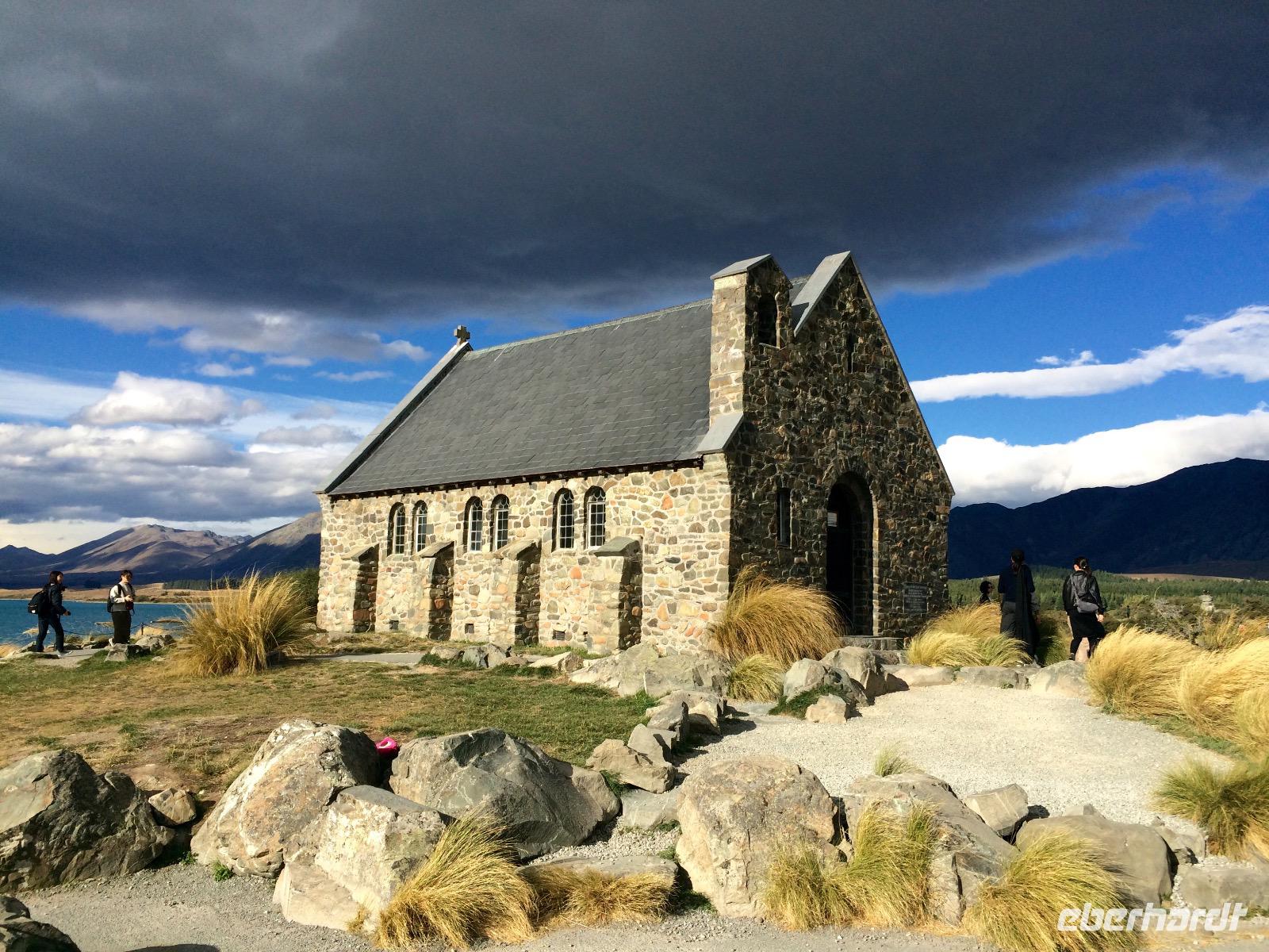 Der Tag ist vollgepackt mit spannenden Begegnungen. Erneut reisen wir durch diese neuseelandtypische Landschaft der "rolling hills". An der Küste legen wir einen Stopp bei den Moeraki Boulders ein, wo wir am Strand seltsam anmutende Steinkugeln finden. Eine beeindruckende Laune der Natur! In Richtung Landesinnere durchqueren wir die Mackenzie Hochebene: goldenes Tussockgras vor der Kulisse schneebedeckter Berge - wir befinden wir uns mitten im "Merino-Land", wo die Merino-Schafe für ihre hochwertige Wolle gezüchtet werden. Am smaragdgrünen Lake Tekapo werden wir Zeugen einer kleinen Hochzeit in der Church of the Good Sheperd (in der Kirche des guten Hirtens) und sehen das wohlmöglich schönste Altarbild der Welt - ein Panoramablick auf den See und den Mount Cook. Leider versteckt er sich gerade hinter den Wolken, aber das macht nichts. Wir haben seine volle Pracht schon einmal erleben dürfen und wir wissen, das können nicht viele behaupten. Wir beziehen unser Hotel am Lake Tekapo und lernen die indische Kiwi-Seite im Hotelrestaurant kennen. *Zwinker*