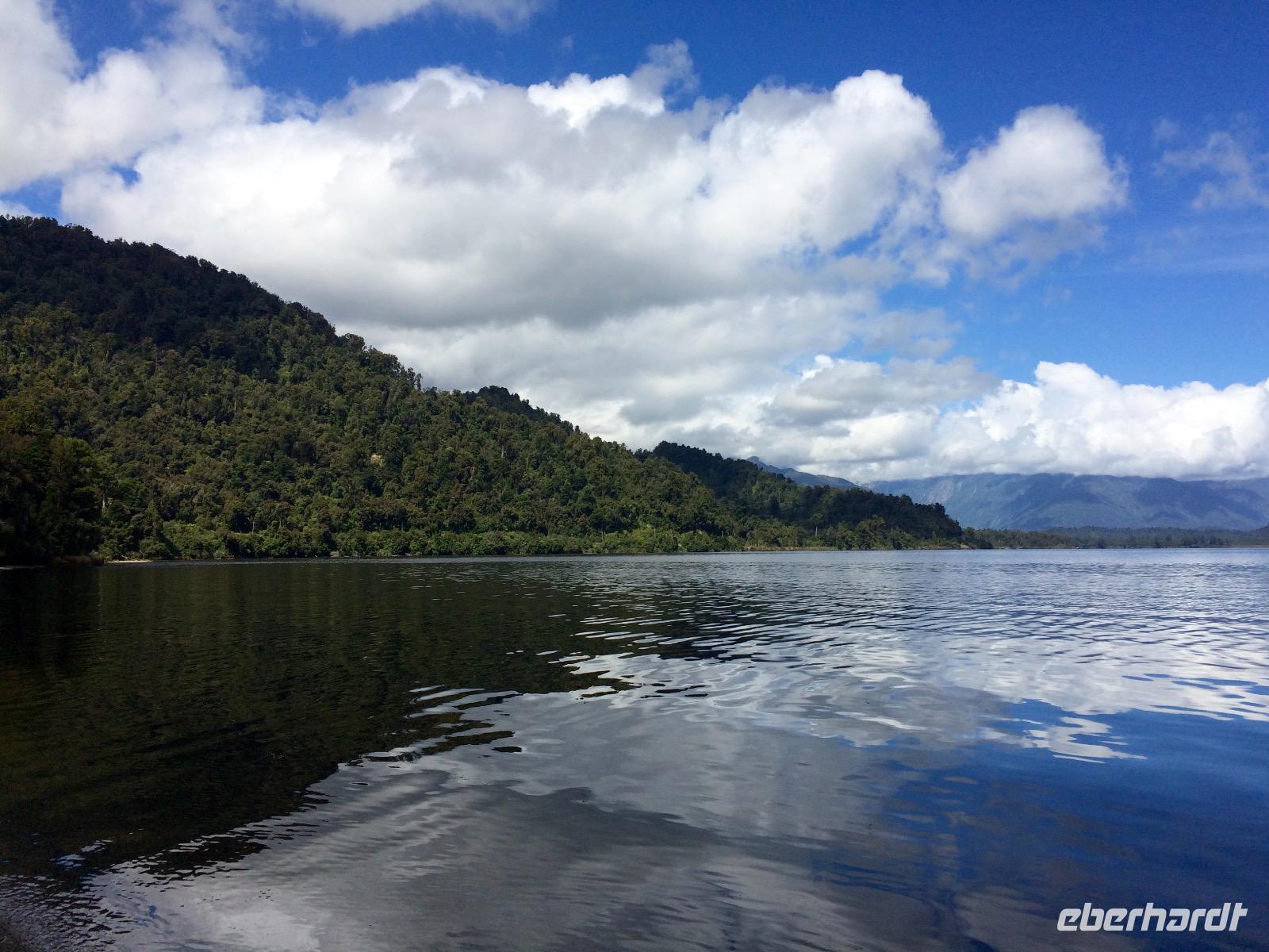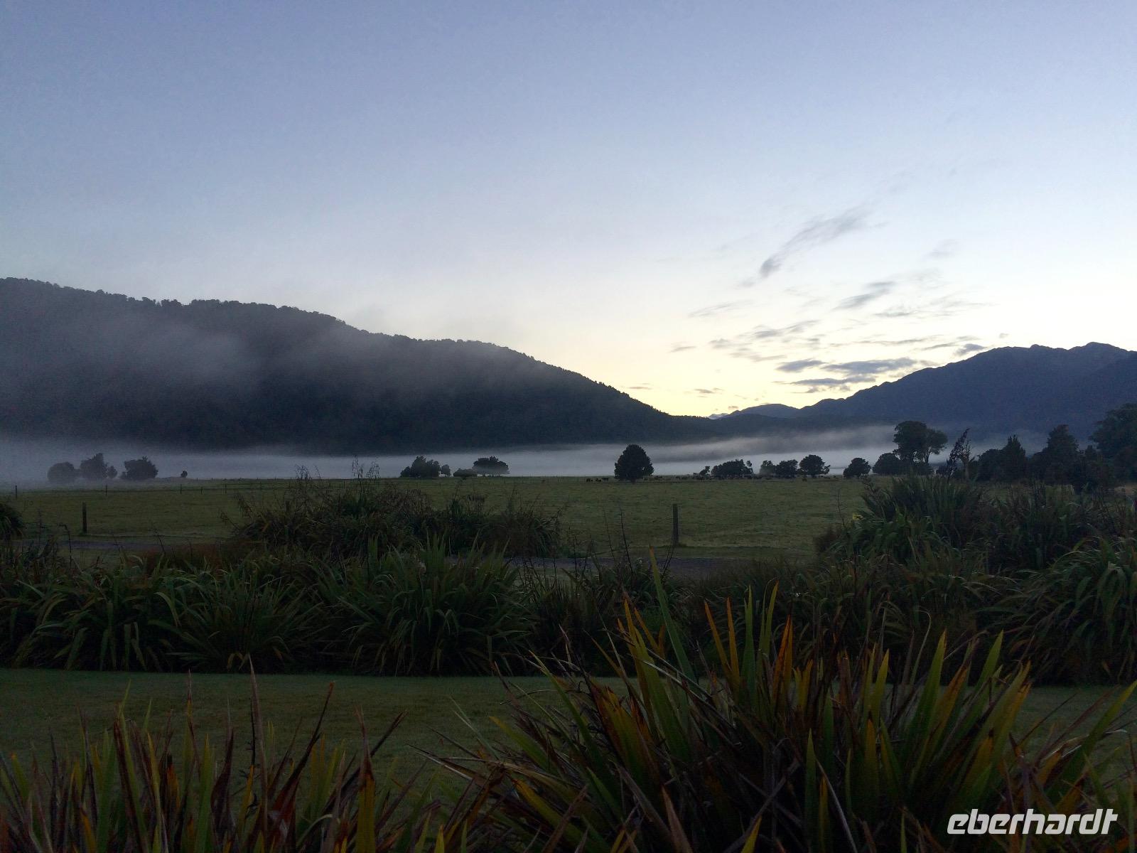 Zeitig, noch vor Sonnenaufgang klingelt unser Wecker. Aber die Mühe soll sich lohnen, denn wir fahren in Richtung Lake Matheson und nehmen unser Frühstück in einem kleinen Restaurant auf dem Land ein. Eine herrliche Stille ruht über die Landschaft. Ganz sachte umarmt der Nebelschleier die auf der Wiese weidenden Kühe und bald beginnt der Tau auf den Grashalmen an zu funkeln, während die Sonne hinter den Bergen hervorblickt. Ein grandioser Blick auf den Mount Cook und Mount Tasman eröffnet sich. Hach, so könnte jeder Morgen beginnen.