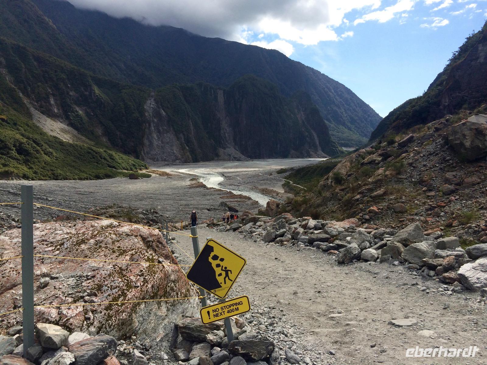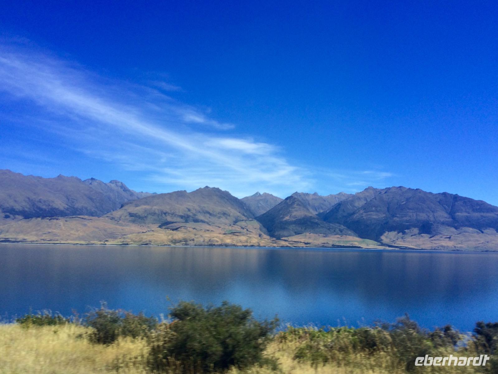 Das Westland gehört zu den am dünnsten besiedelten Regionen Neuseelands und bietet unendlich viel Natur sowie tolle Postkartenfotomotive für uns. Bis zum Haast-Pass bewegen wir uns im Westland-Nationalpark, der wie der Fjordland-, Mount-Aspiring- und Mount Cook-Nationalpark auch zum Weltnaturerbe der UNESCO zählt (zusammen nehmen die vier Nationalparks 10% der Landesfläche ein). Wir machen Halt am Ship Creek-Strand (Achtung Sandflies!) und begeben uns auf die Suche nach Pinguinspuren. Tatsächlich entdeckt Gernot welche im Sand. Diese scheuen Tiere sind wohlmöglich gerade zum Fischen gegangen oder kuscheln sich an schattigen Plätzchen. Dafür sehen wir zwei verspielte Delfine ganz nah am Strand. Vorbei am Lake Paringa und Knights Point spazieren wir zum Thunder Creek-Wasserfall. Die Route führt uns mit fantastischen Landschaftsbildern weiter entlang des Haast River über den Haast-Pass, den mit 563 Meter tiefst gelegenen und südlichsten der drei Alpenpässe. Und mit einem Schlag ändert sich auch die Vegetation - das dominante Grün des Regenwaldes weicht den goldenen Ebenen und Berghängen von Central Otago. Bald passieren wir den Lake Wanaka und Lake Hawea und lassen uns von der nostalgischen Atmosphäre im kleinen Städtchen Arrowtown einfangen. Das wohl hübscheste Dörfchen Neuseelands zog einst im Goldrausch viele Glücksritter. Am Nachmittag erreichen wir Queenstown.