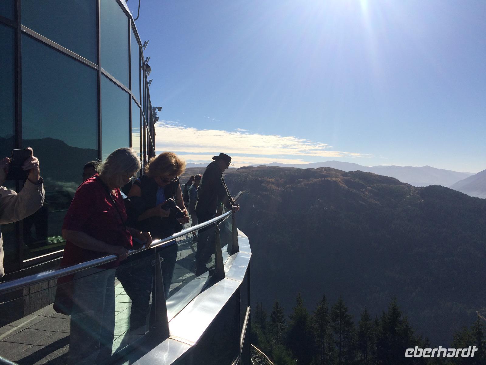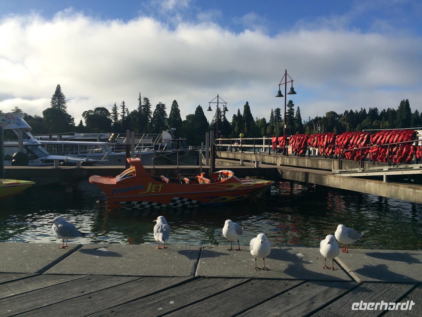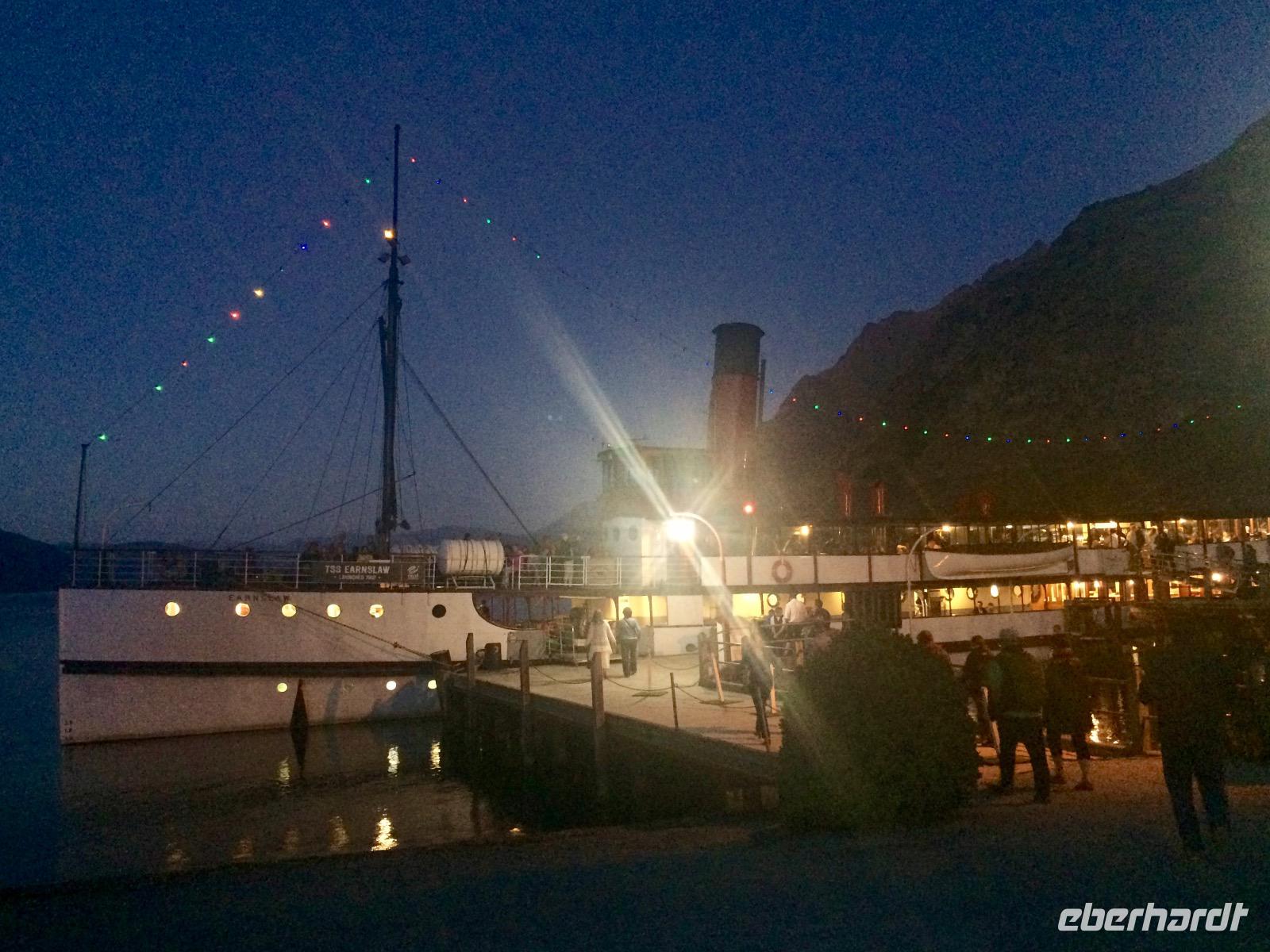 Nach all den Erlebnissen der vergangenen Tage ist heute ein echter Genießertag... und Queenstown bietet das Richtige für jeden Geschmack. Gernot führt uns durch das kleine Zentrum und über einen kleinen, aber steilen Umweg zur Seilbahnstation. Die Anstrengungen werden belohnt. Mit der Gondelbahn schweben wir hinauf auf den Bob's Peak, den Hausberg der Stadt. Hier bietet sich ein fantastisches Panorama auf die Stadt, den Lake Wakatipu und die markanten Berge der Umgebung. Queenstown zieht viele junge Menschen mit ganz anderen Attraktionen an: Abenteuerlustige finden hier alle möglichen und unmöglichen Sportarten. An der Bungee-Brücke können wir die mutigen Springer beobachten wie auch die elegant durch die Luft schwebenden Paragliding-Sportler bestaunen. Die Aussicht ist einfach atemberaubend! Dass die Neuseeländer ausgesprochen kreativ und einfallsreich sind, zeigt sich auch an den ausgefallenen Briefkästen bei einem Spaziergang durch die Stadt. Am Nachmittag ist Gelegenheit für einen gemütlichen Stadtbummel, ein leckeres Eis, den Besuch des Bird Parks oder des Botanischen Gartens. Das historische Dampfschiff "TSS Earnslaw", welches im gleichen Jahr wie die Titanic gebaut wurde, lädt am Abend zu einer Fahrt zum Peter auf der Walter Peak Station ein, wo neben einer Schaf-Show ein üppiges Buffet auf uns wartet. Yummy!