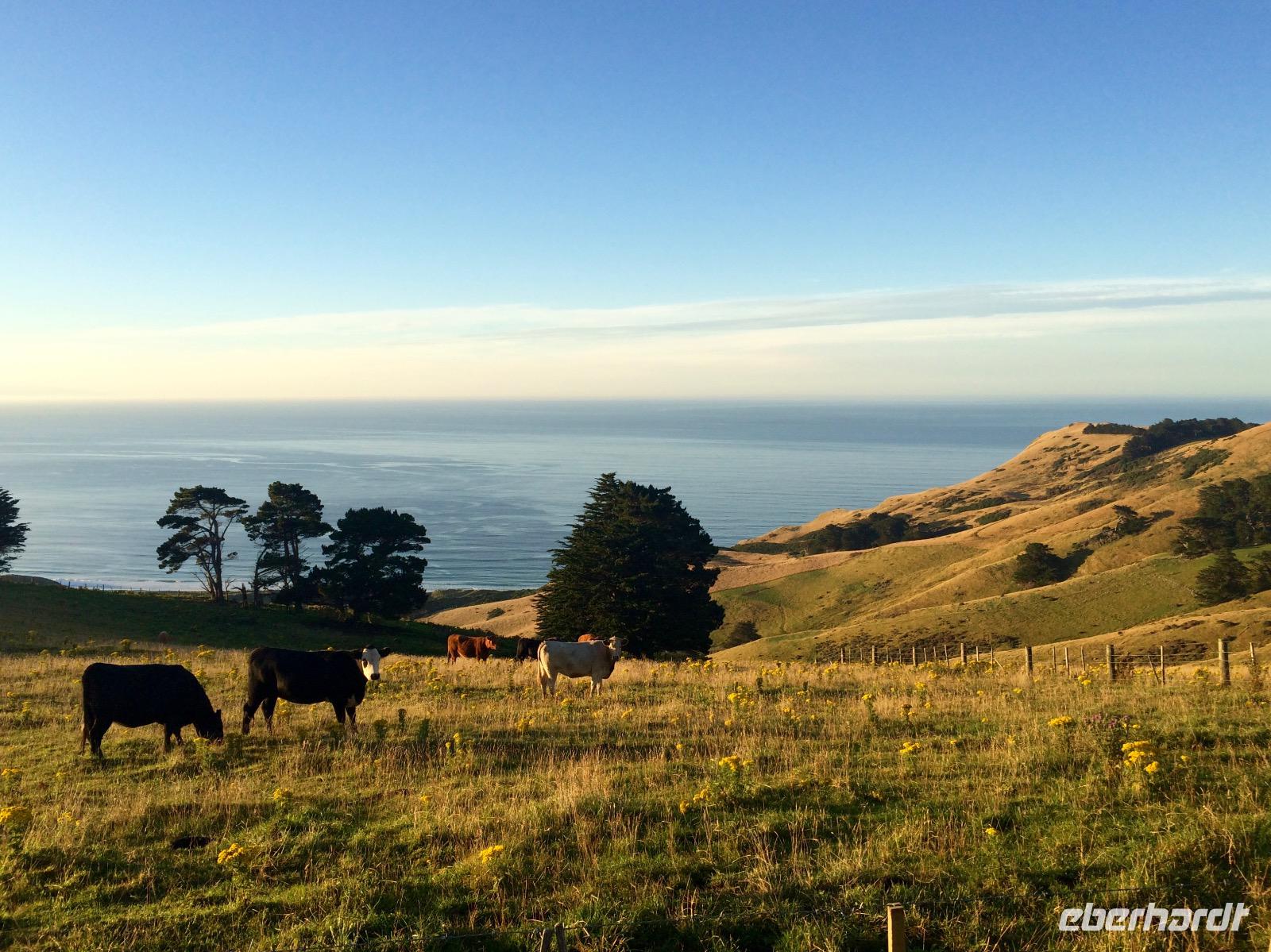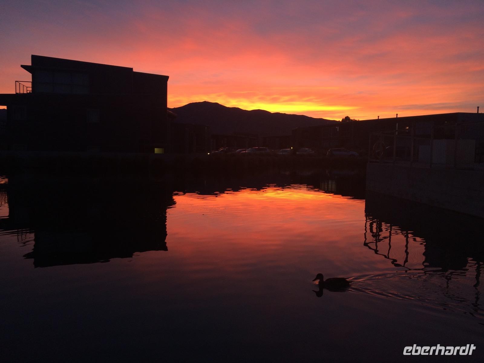 Feuerrot leuchtet der Himmel, als die Sonne hinter den Bergen aufgeht. Was für ein traumhafter Anblick zur Begrüßung des Tages. Gut gelaunt begeben wir uns auf die nächste Etappe unserer Reise durch die fruchtbare Ebene der Canterbury Plains und durch die Kleinstadt Geraldine schließlich auf die vulkanische Banks-Halbinsel. Die kurvenreiche Straße windet sich durch eine hügelige Landschaft und gibt immer wieder den Blick frei auf malerische Buchten. Die charmante, französisch geprägte Siedlung Akaroa verströmt mit den schmucken Holzhäuschen und Gärtchen ein vornehmes Flair. Vom Leuchtturm haben wir einen herrlichen Blick auf den Hafen. Endpunkt des Tages ist unser altbekanntes Christchurch.