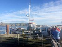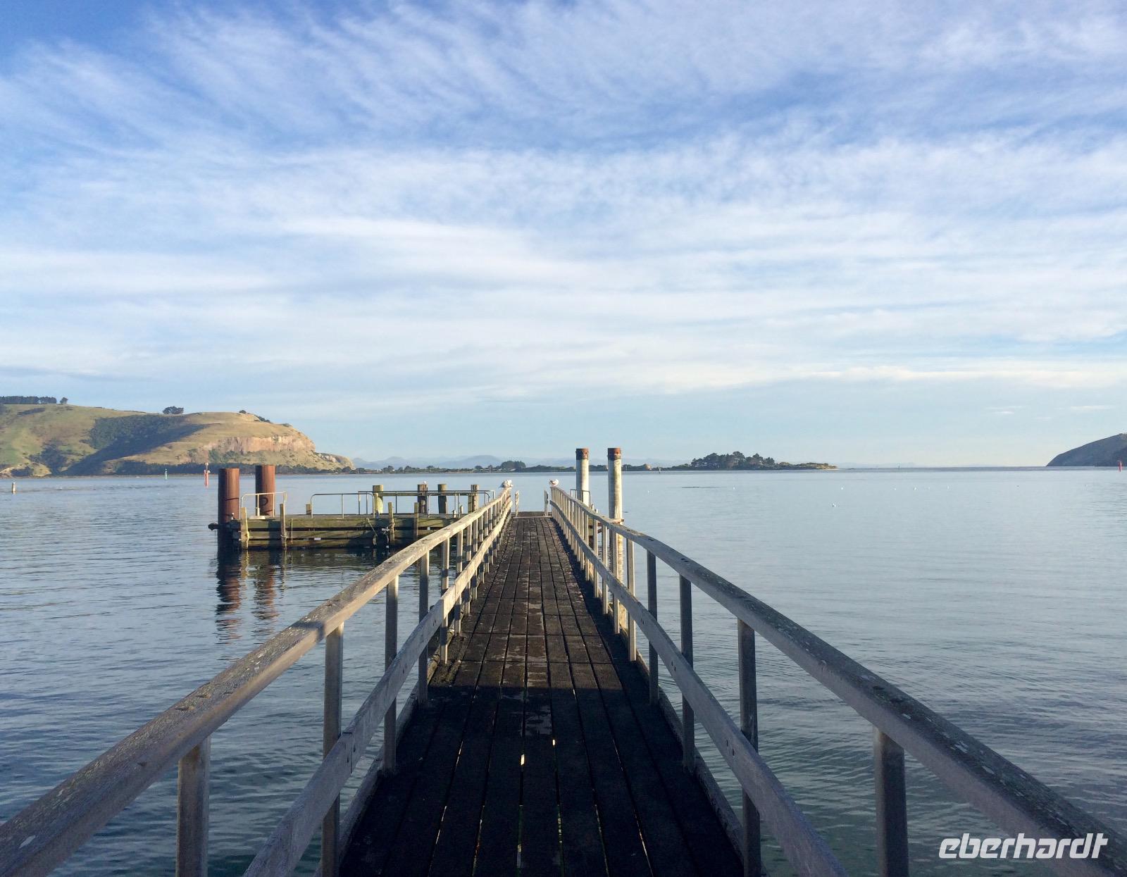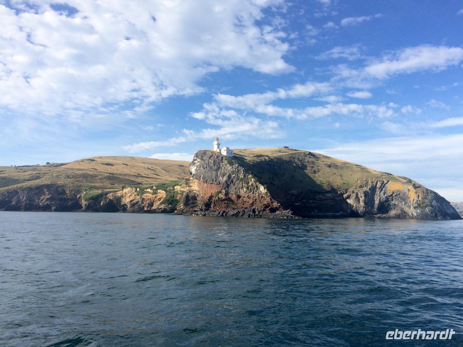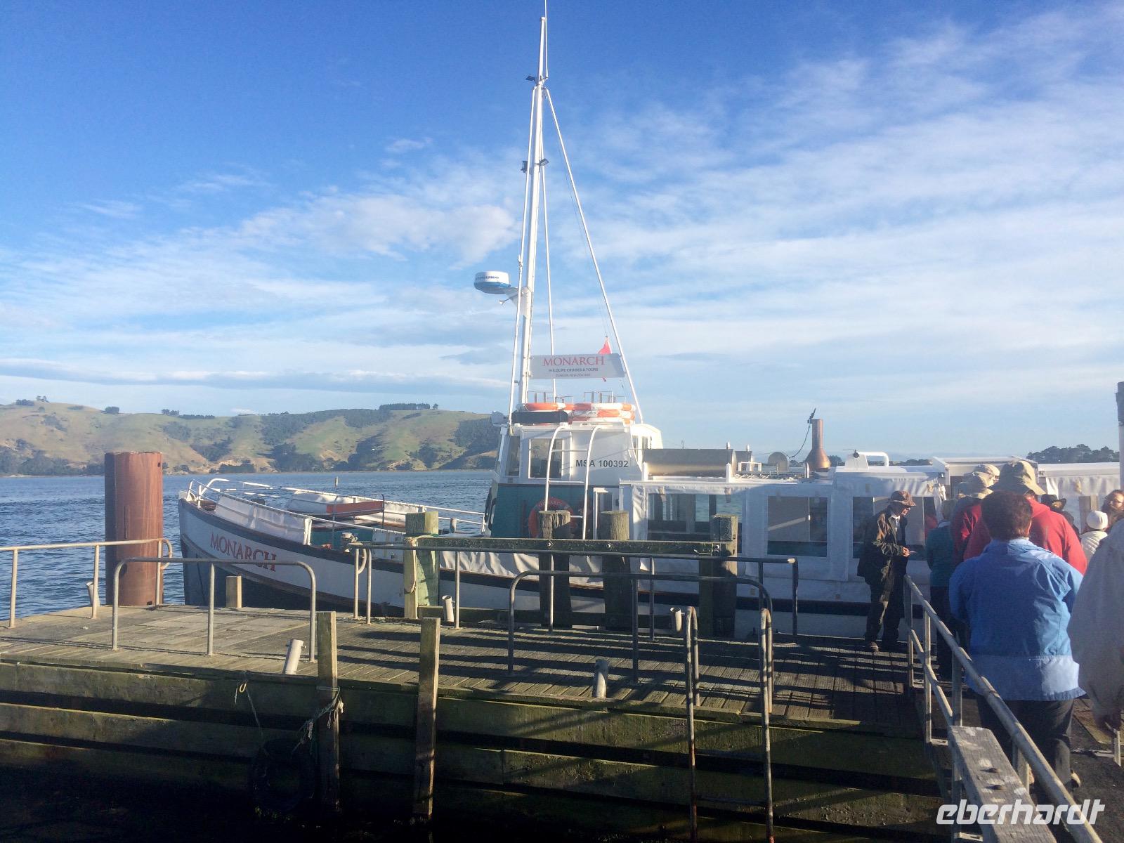 Vor den Toren der Studentenstadt Dunedin erstreckt sich die Otago Halbinsel. Am Ende liegt Taiaroa Head, wo sich die einzige Festland-Kolonie der Königs-Albtrosse befindet. Mit dem Boot unternehmen wir eine einstündige Fahrt um diese Landzunge. Chauffeur Dave hat uns extra eine private Tour vor der Öffnungszeit organisiert. So haben wir nicht nur Glück mit wenig Seegang sondern können sogar die majestätischen Königsalbatrosse fliegen sehen. Mit einer Flügelspanne von bis zu drei Metern können diese Vögel an die 100 km/h schnell fliegen. Darüber hinaus gesellt sich eine verspielte Delfinfamilie zum Greifen nah zu unserem Boot und wir können niedliche Pelzrobben und Kormorane beobachten.