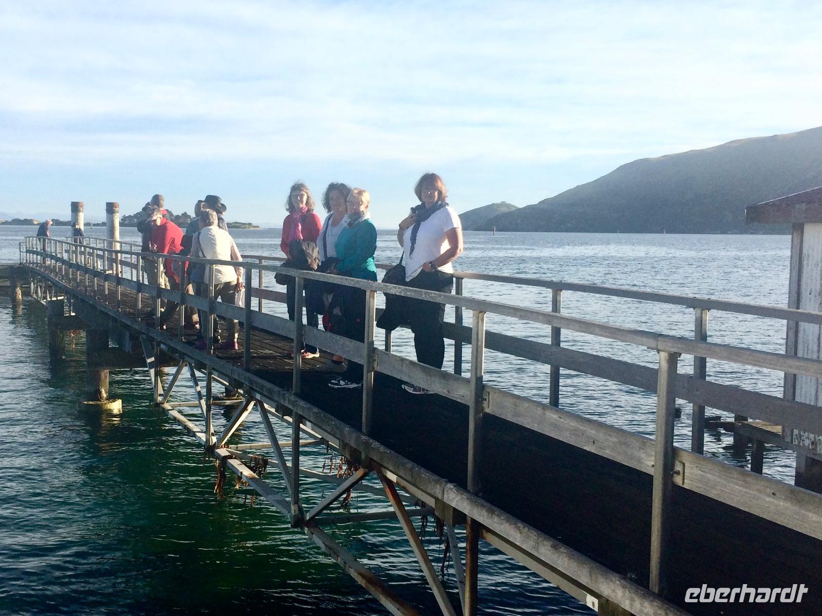 Am frühen Morgen lichtet sich der Anker und es geht hinaus auf das tosende Tasmanische Meer. Die Berggipfel verstecken sich in den tief hängenden Wolken, was eine mystische Stimmung zaubert. Mit 1.692 Metern ist der Mitre Peak (die Bischofsmütze) einer der weltweit höchsten Berge, der direkt vom Meeresboden hochsteigt. Am Sealrock herrscht eher verhaltene Motivation, sich groß zu bewegen bei der Seebärenkolonie. Einige von Ihnen nehmen ein erfrischendes Bad und drehen sich im Wasser, um die Verdauung anzuregen. Wir nehmen Abschied von den Bergen der Südalpen und nehmen Kurs auf die Ostküste. Durch weite Ebenen mit zahlreichen glücklichen Kühen und Schafen gelangen wir zur „Schottenstadt" Dunedin. Das schottische Erbe spiegelt sich in der Architektur wider, woher auch der Bezug zu Edinburgh rührt. Ein besonderes Schmuckstück ist der Bahnhof - von außen mit dem hell-dunklen Gestein und von innen mit den thematischen Mosaiken. Dieses schöne Meisterwerk halten wir mit einem großen Herz-Gruppenfoto fest, während uns Gernot vom Balkon aus fotografiert. An der steilsten Straße der Welt, der Baldwin Street, legen wir einen Halt ein und testen unsere Knie aus. Im großzügig angelegten Botanischen Garten gibt es wieder Faszinierendes von Fauna und Flora zu entdecken.
