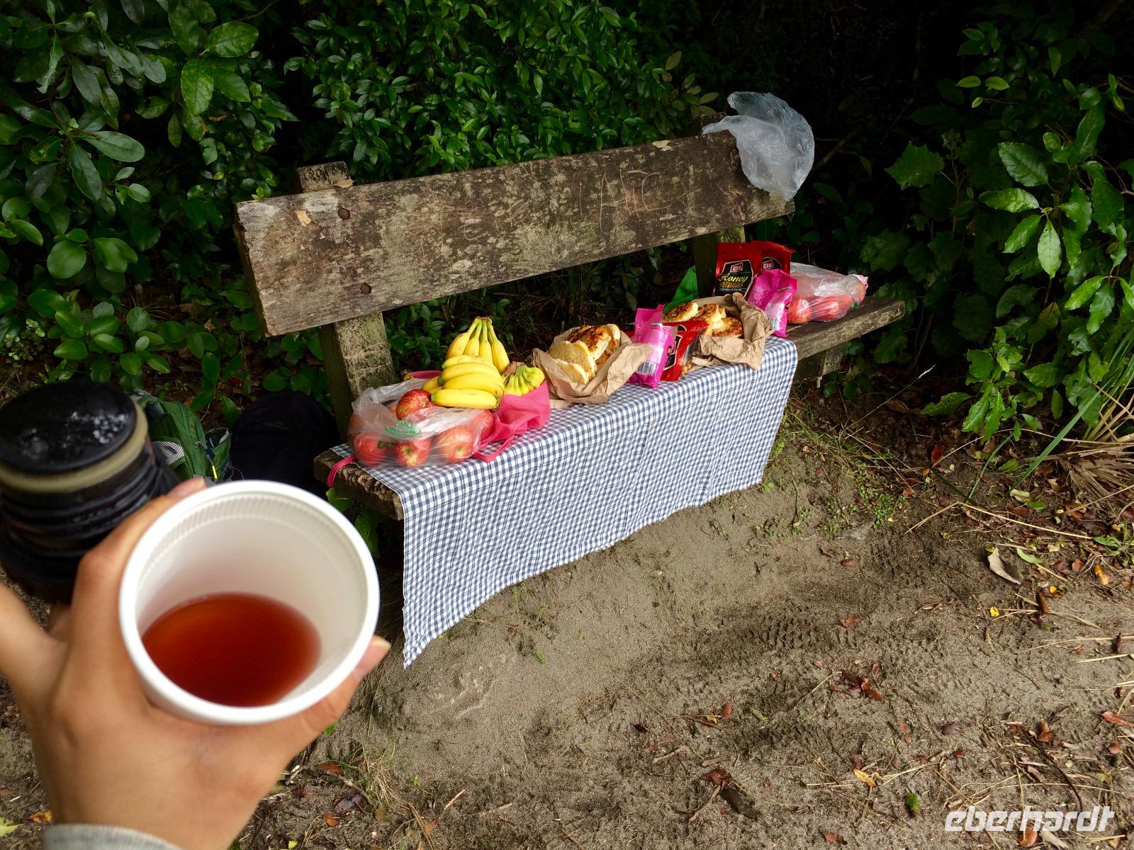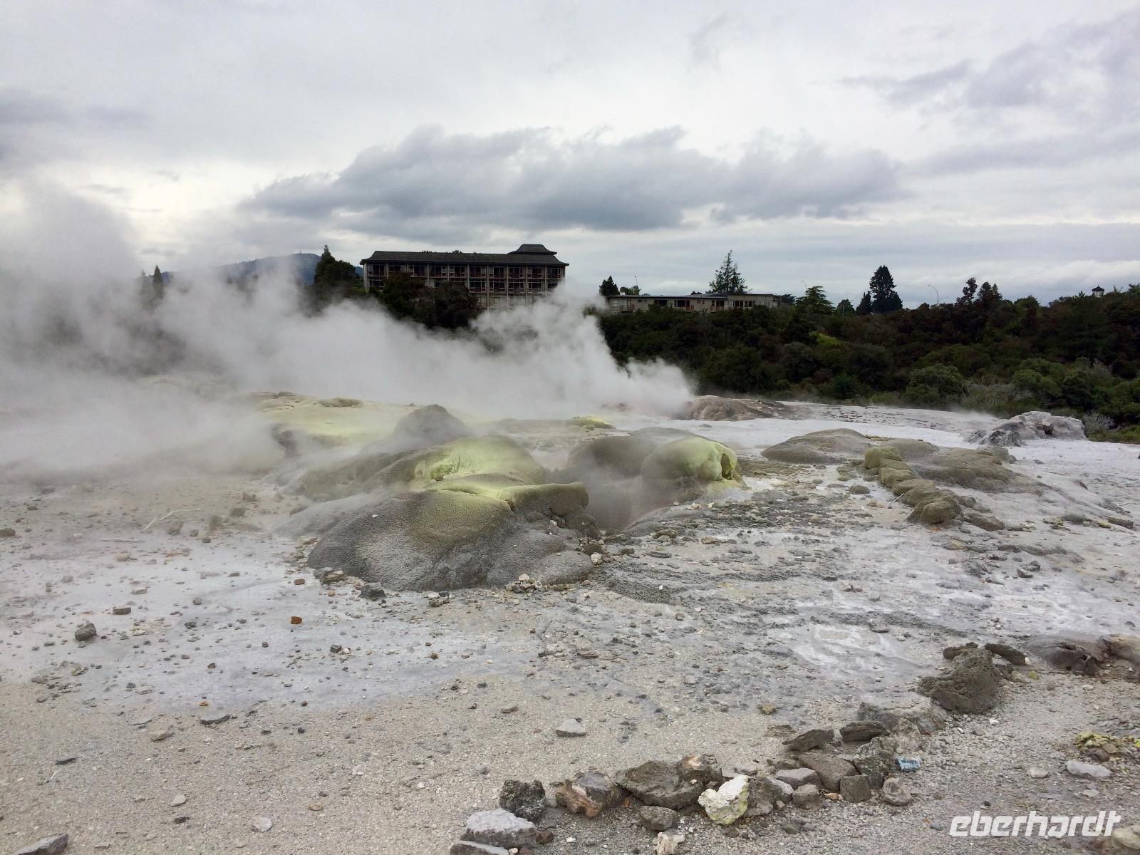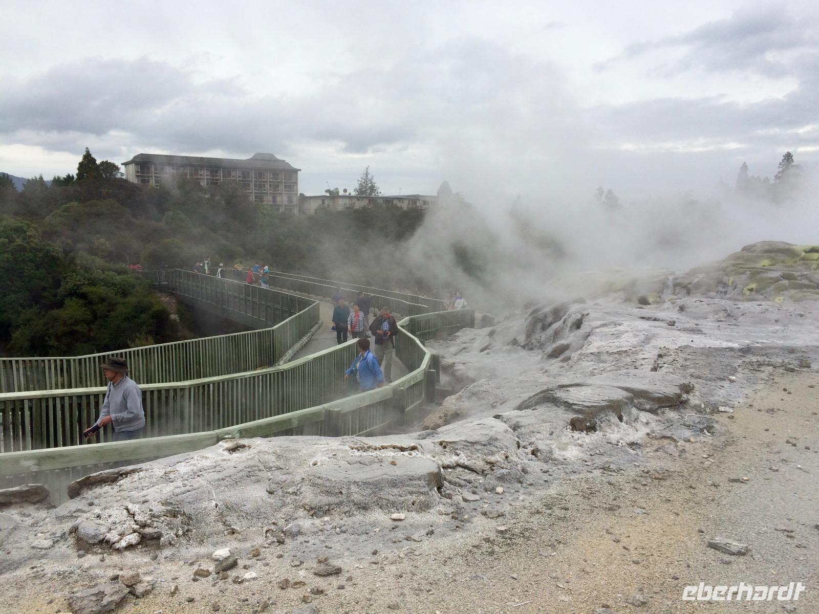 Es ist zwar bewölkt, als wir morgens aus dem Fenster schauen, doch Petrus hat Gnade mit uns und wir können durch die Wolkendecke rauf zum Skigebiet Whakapapa. Die Mondlandschaft mit dem Wolkenmeer zu unseren Füßen ist einmalig schön, dass sie unsere Herzen berühren. Wir bekommen sogar den Ruhapehu-Vulkan mit seiner Zipfelmütze aus Eis zu sehen. - Ein Traum! Anschließend haben wir eine Verabredung mit zwei Maori-Frauen. Obwohl wir erst einmal an ihnen vorbei gefahren sind, begrüßen uns Ngahuia und Naf beim zweiten Anlauf herzlichst mit einem Maori-Lied. Auf der Wanderung im Tongariro-Nationalpark erzählt uns Ngahuia mit viel Euphorie und dramatischem Talent die Entstehung der Welt sowie des Nationalparkes mit den drei Brüdervulkanen nach den Mythen der Maori. Am See bereiten Sie uns als Überraschung ein kleines Picknick zu und eine Bastelstunde mit neuseeländischem Flax. Im Großen und Ganzen gibt es zwei wichtige Gründe, Rotorua zu besuchen: geothermale Aktivitäten und Maori-Kultur. Das ganze Gebiet ist übersät mit kollabierten Kratern, heißen Seen, Schlammtümpeln und dampfenden Erdspalten, die so bildhafte Namen tragen wie Devils Home und Devils Bath (Heim und Bad des Teufels). Und tatsächlich hat die Natur hier ein kleines Kunstwerk der Farben und Formen geschaffen. Der Abend steht ganz im Zeichen der Maori. Bei einem Hangi im Te Puia bekommen wir einen Eindruck von den Traditionen der Ureinwohner Neuseelands und auch das anschließende Essen, das zum Teil im Erdofen gegart wird, ist äußerst schmackhaft. Vom starken Regen lassen wir uns nicht die gute Laune nehmen und haben viel Spaß bei der Maori-Show, dem Geschrei - ähm ich meine Gesang zu lauschen sowie den Tänzern zuzuschauen. Applaus für die großartige Leistung!
