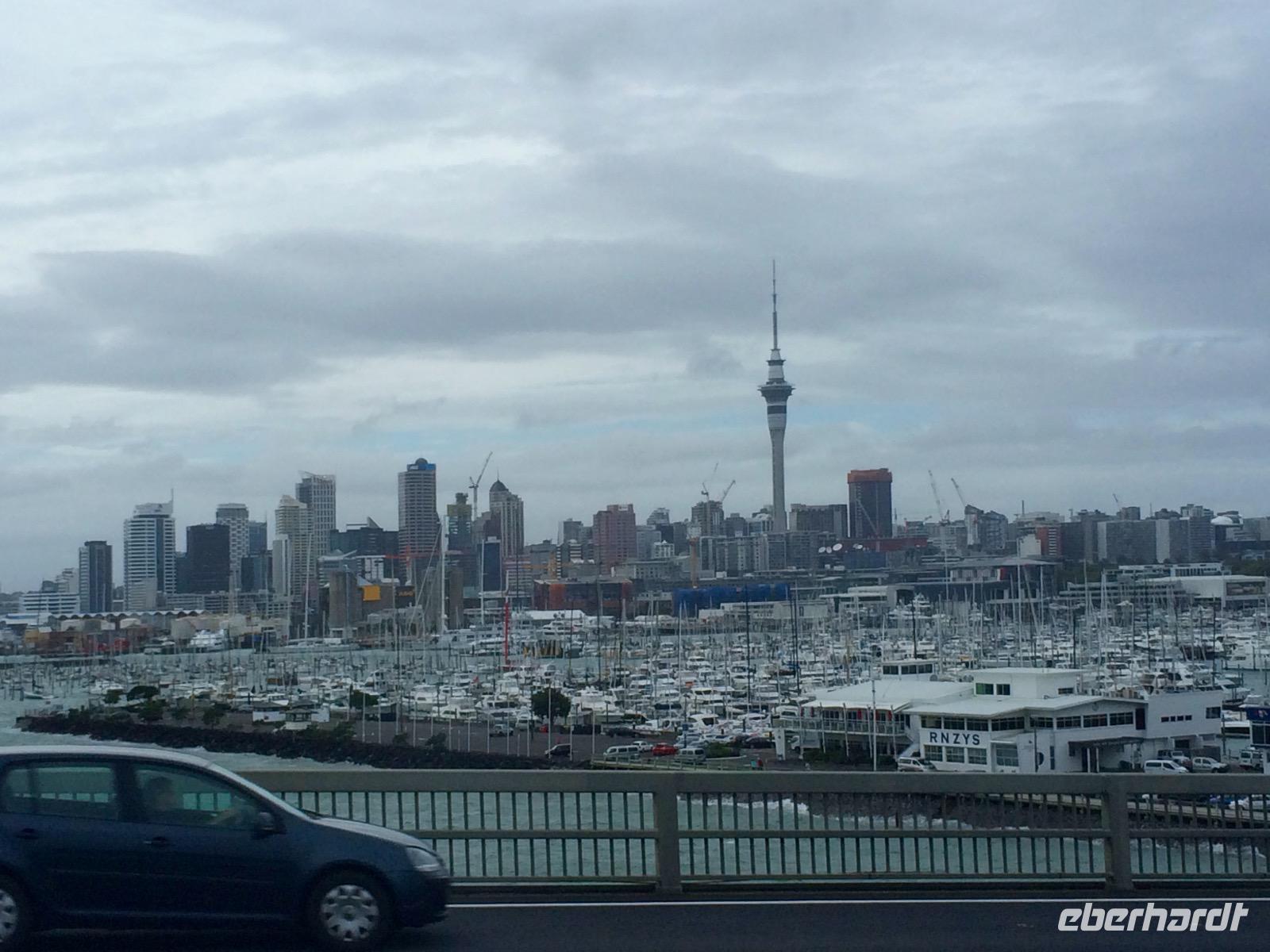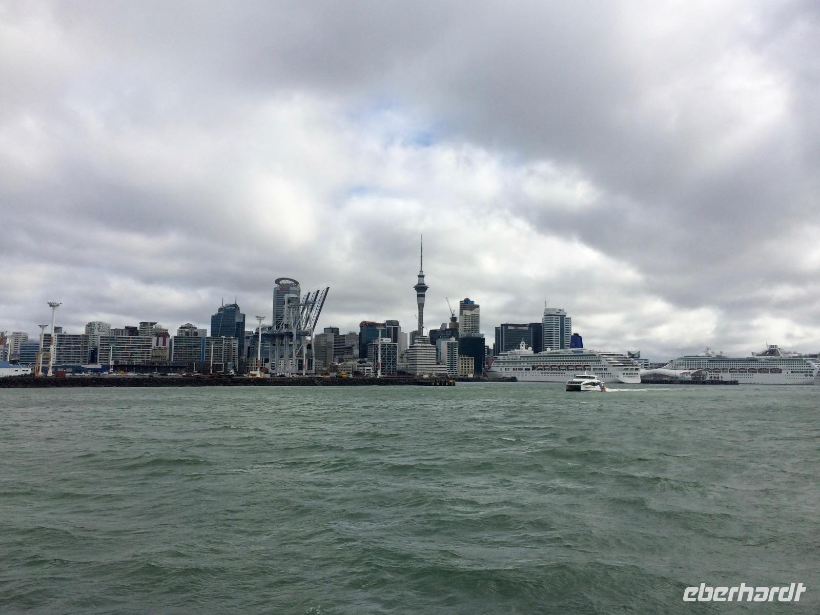 Wir sind gespannt auf die Erkundungstour durch Neuseelands größte Stadt. Schon von weitem ist der Skytower sichtbar, der 328 Meter in den Himmel ragt. Auckland trägt den treffenden Beinamen „City of Sails", die Stadt der Segel. Wir unternehmen eine Stadtrundfahrt. Genau zur Mittagspause hört es auf zu regnen und so bekommen wir noch eine freundlichere Seite Aucklands zu sehen. Der Nachmittag bleibt für eigene Erkundungen und Shoppingmöglichkeiten frei. Einige Gäste kommen mit mir auf die Devonport-Insel. Auf der Fährüberfahrt bekommt man den besten Blick auf die Skyline. Der Hafen mit den unzähligen Booten und der Skyline im Hintergrund bietet ein passendes Motiv zum Abschluss unserer Reise.