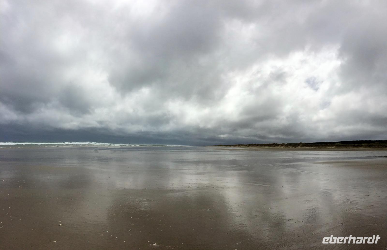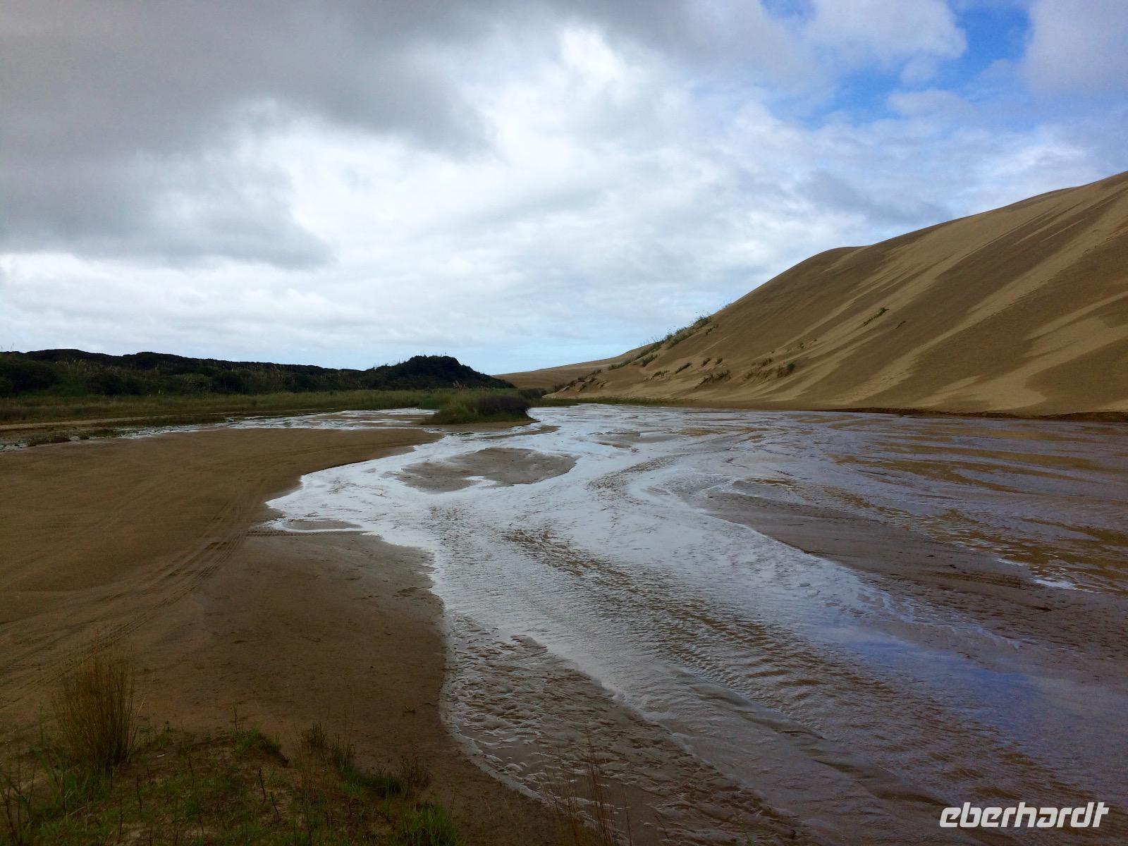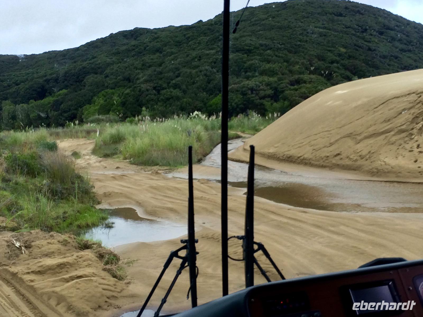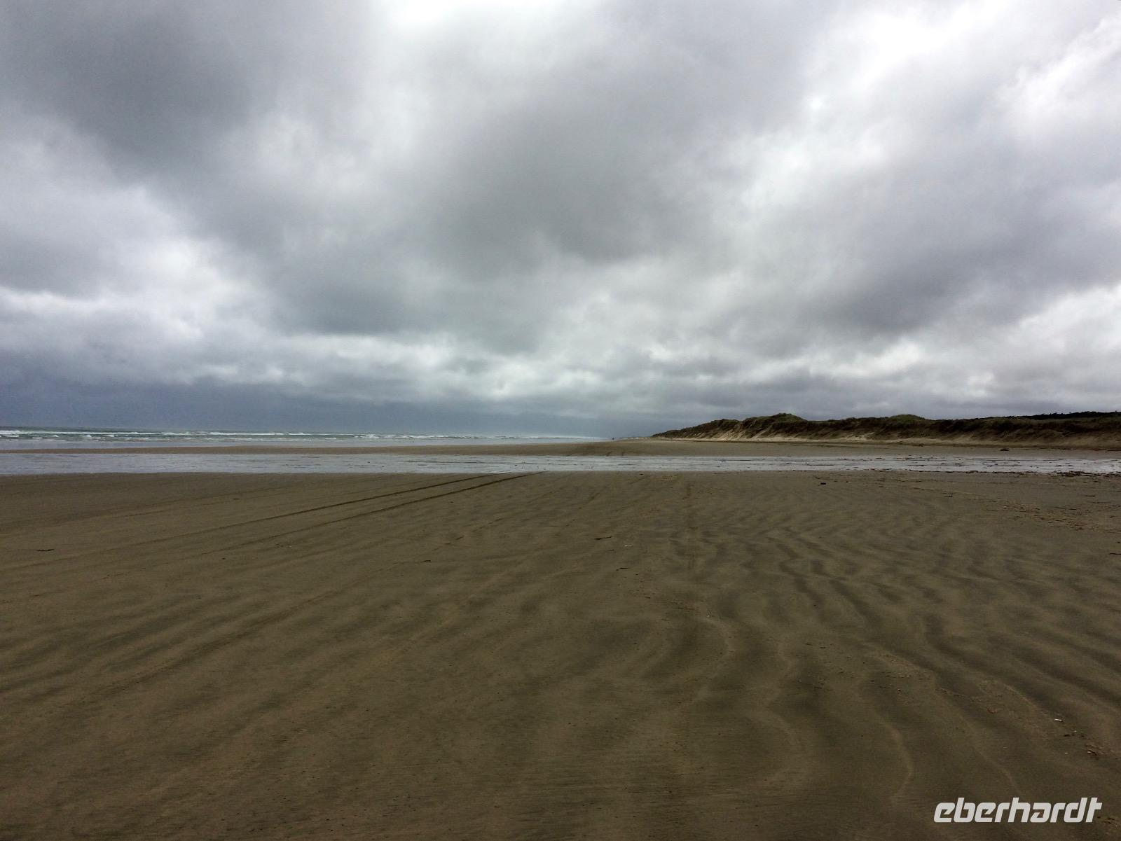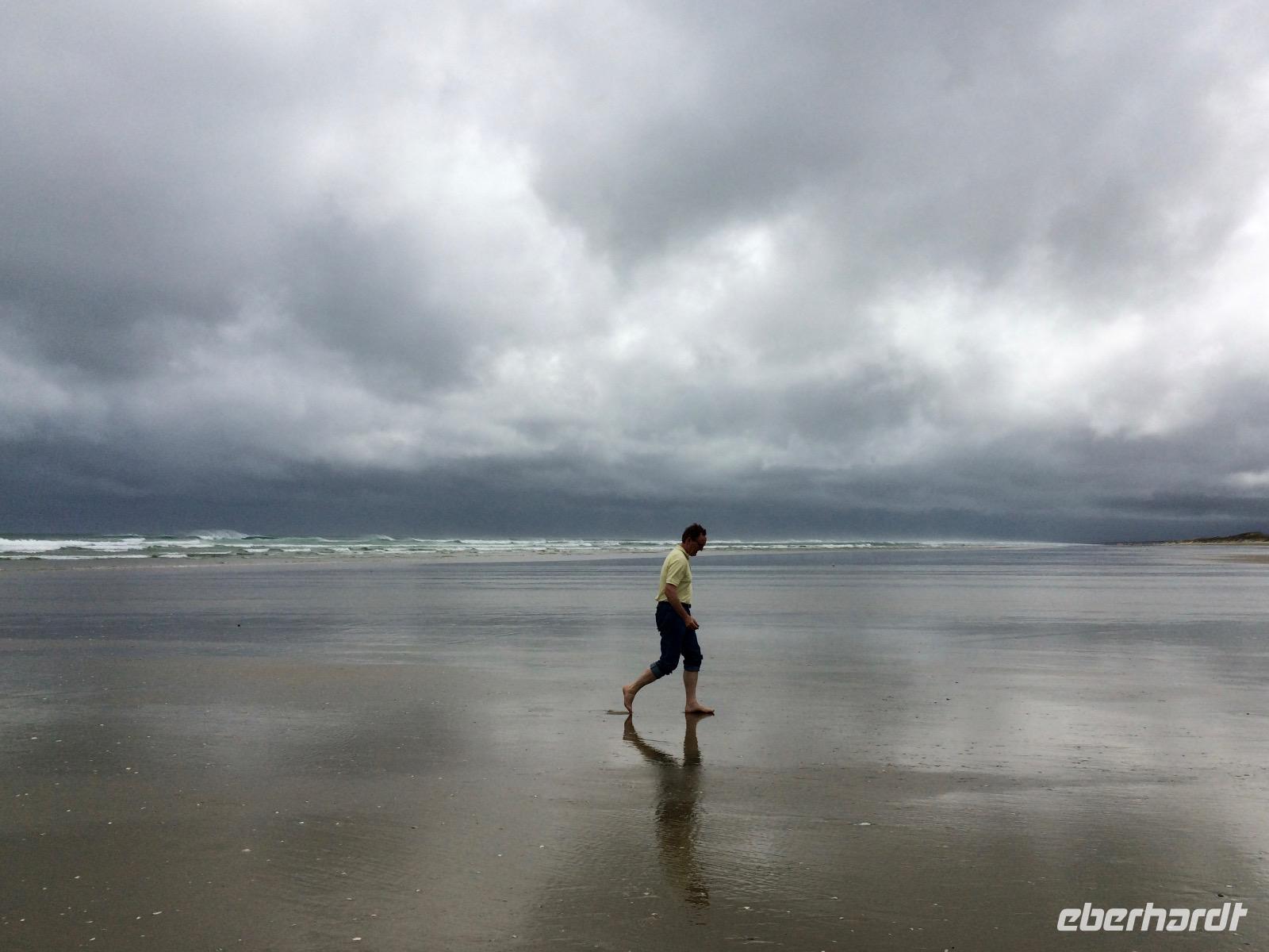 Die Bay of Islands bietet eine Vielfalt an Ausflugsmöglichkeiten. Eine Ganztagestour zum Cape Reinga zeigt die Highlights des Northland. Wir sind nicht mehr allein unter uns wie auf der Südinsel. Gernot nennt die anderen Touristen gern Heuschrecken, aber die Schönheit der Natur ist nicht minder schön. Die Route führt vorbei an grünen Weiden und Kiefernwäldern bis ganz in den Norden der Insel. Dieser Ort ist in der Mythologie der Maori von besonders spiritueller Bedeutung, denn hier beginnt die Reise der Seelen der Verstorbenen ins Jenseits. Hier, wo die Tasmanische See auf den Südpazifik trifft, befindet sich das Cape Reinga mit dem Leuchtturm. Der Tag fängt recht grau an, doch als wir am Nordkap Neuseelands ankommen, werden die Wolken wie von magischen Händen beiseite geschoben, um die Sonne hervorblinzeln zu lassen. Die Kulisse aus leuchtend blauem Meer, grünem New Zealand Flax und weißen Sanddünen unter einem azurblauen Himmel bietet unendlich viele Fotomotive. Doch Vorsicht! Nicht vom Winde verwehen lassen! Im kleinen Örtchen Mangonui soll es eine der besten Fish & Chips Läden des ganzen Landes geben - davon wollen wir uns natürlich selbst überzeugen. Nach dem Mittagessen geht es bergab - im wahrsten Sinne des Wortes. Wer möchte, kann mit dem Boogie-Board die Sanddünen hinunter düsen... zwei Mal können wir in der Gruppe sogar das „Sandboarding-Diplom" verleihen ;-)! Die Gezeiten bestimmen, ob man auf dem Hin- oder Rückweg über den 90-Mile-Beach fährt. Für uns steht diese spektakuläre Etappe nun auf dem Programm. Am Strand versuchen Angler ihr Glück beim Fischen, doch von dem großen Fischerwettbewerb, den uns Chris versprochen hat, keine Spur. Einst war die Region durch endlose Moore (swamps) geprägt, in denen die bis zu zweitausend Jahre alten Kauribäume bestens konserviert wurden. Nach 45.000 Jahren im Untergrund wurden diese Baumriesen gefunden und geborgen. Auch das wertvolle Harz des Kauri (gum) hat zu Beginn des 19. Jahrhunderts viele Glücksritter an diesen Ort gezogen, der heute als Gumdigger Place bezeichnet wird. Chris singt uns zum Abschluss die Nationalhymne der Maoris vor und beglückt unsere Ohren mit einer tollen Zugabe von "What a wonderful Life". Ein langer, aber aufregender Tag geht mit einem Bad im Meer oder einem leckeren Meeresfrüchte-Abendessen zu Ende.