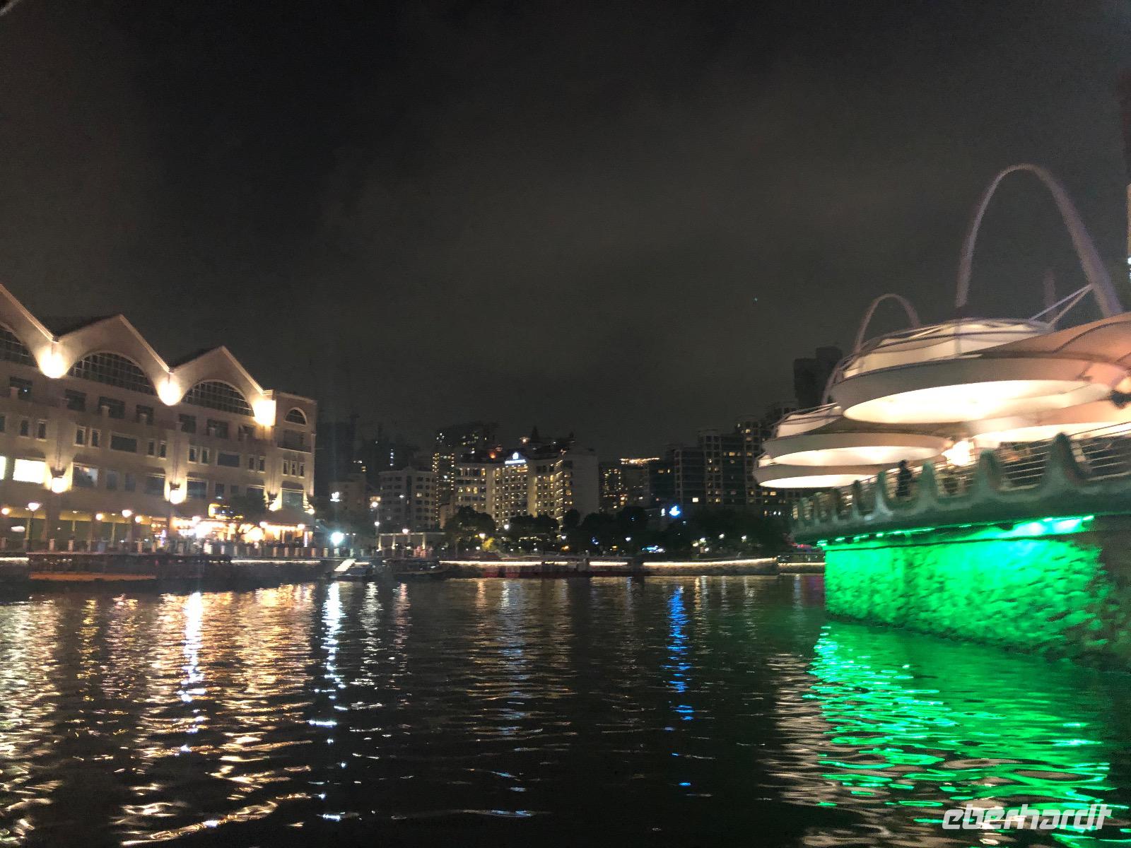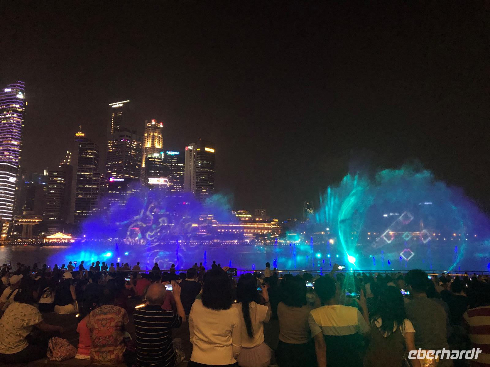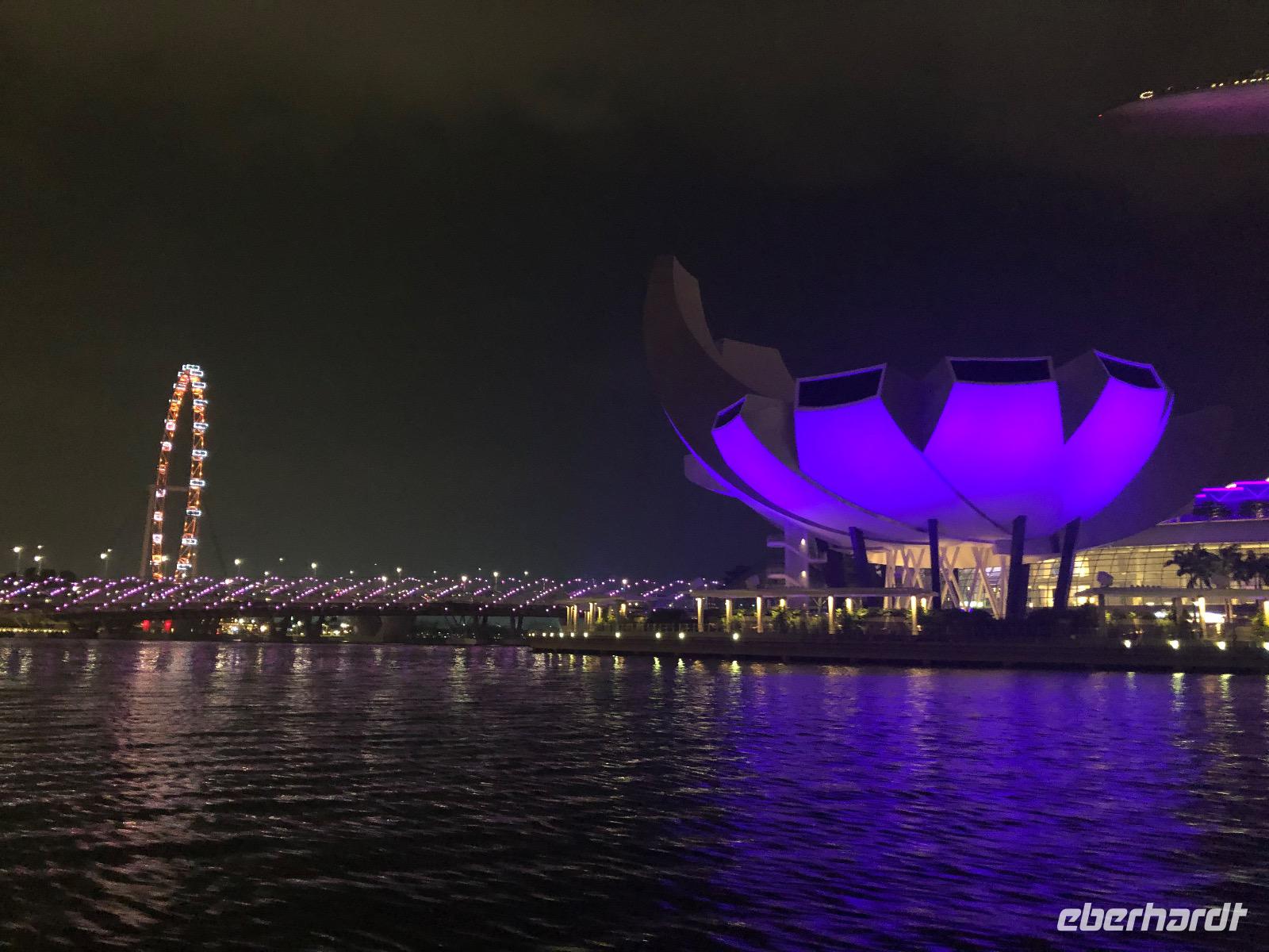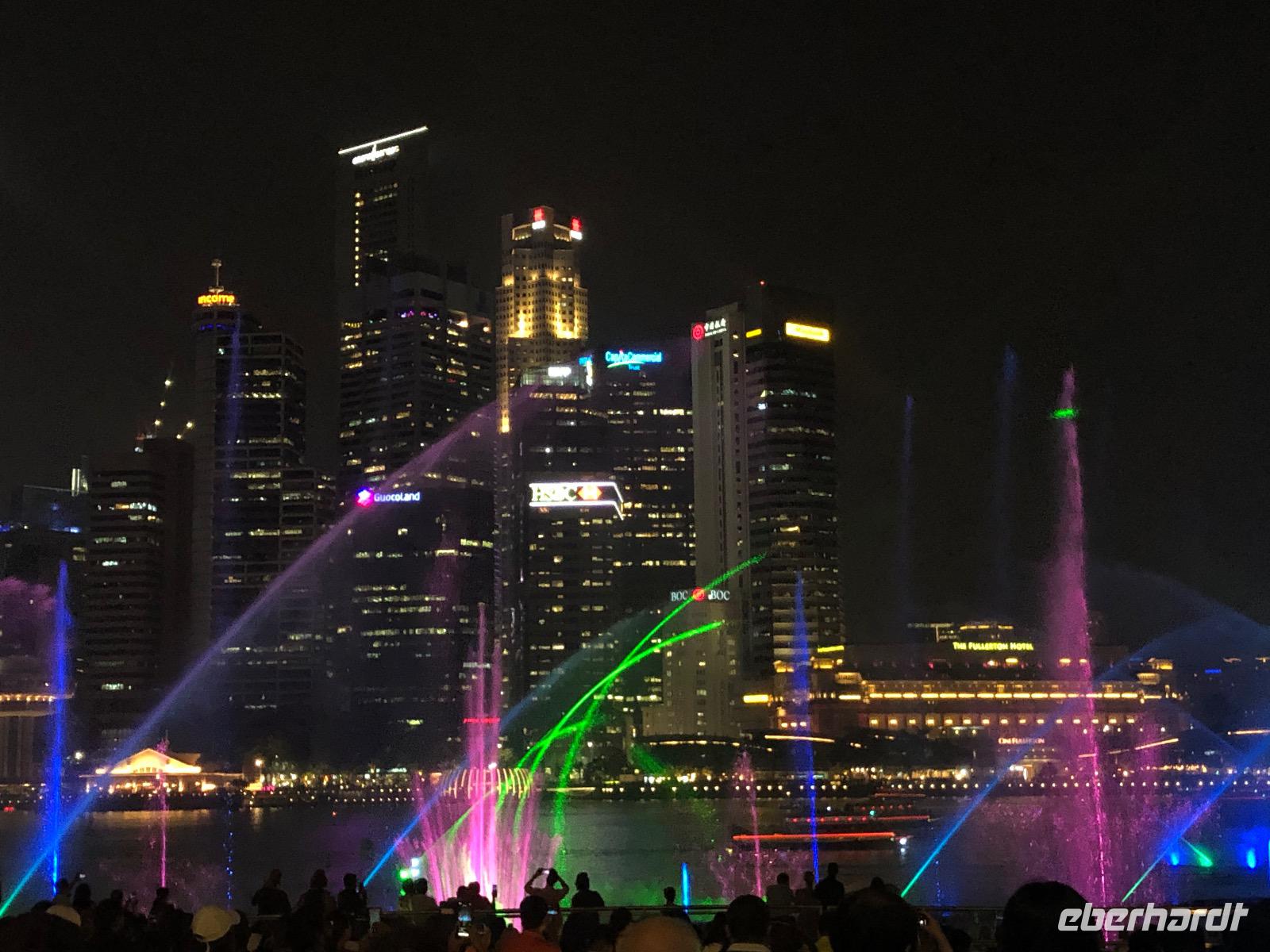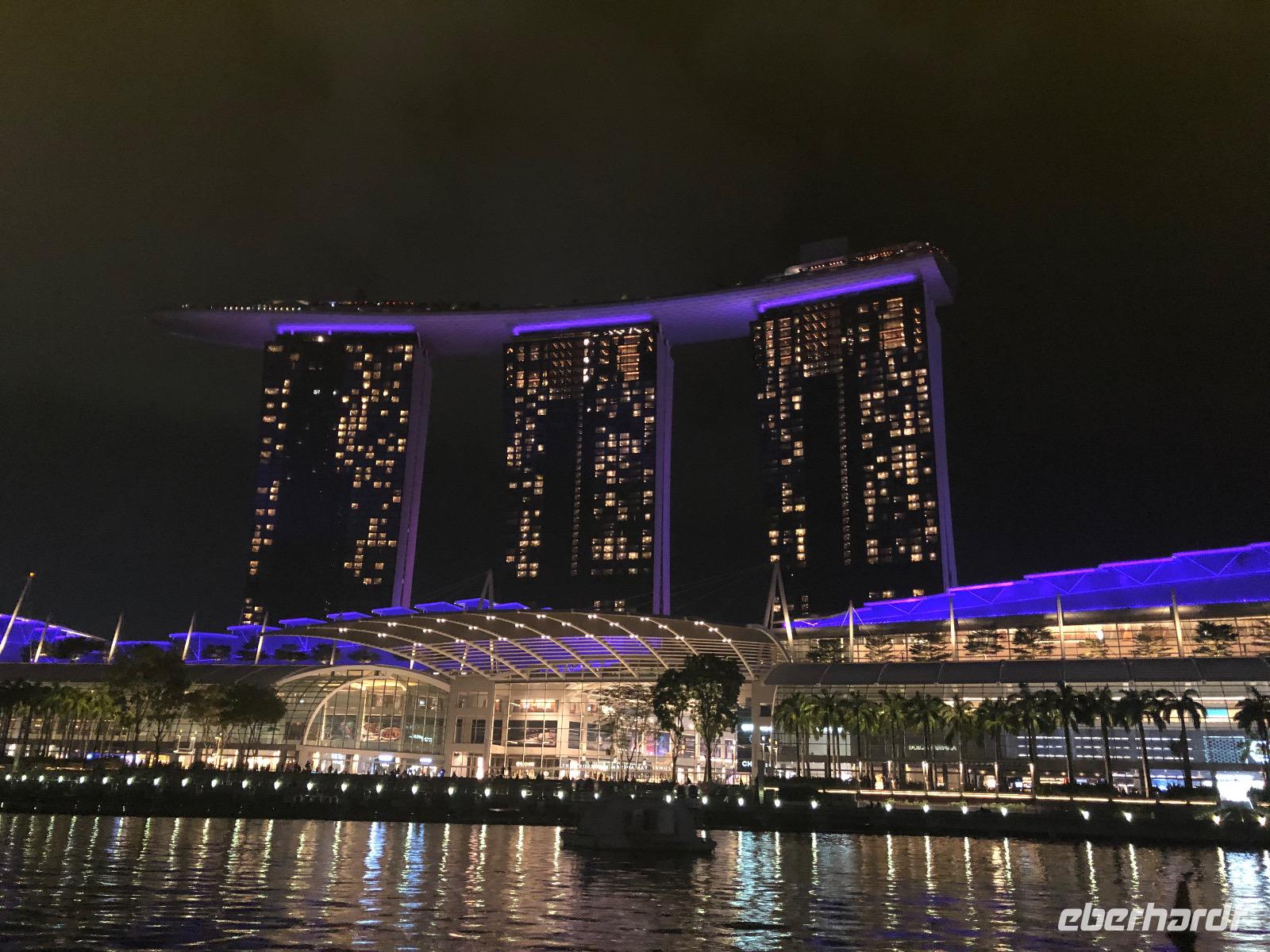 Am Ausgang wartet Martine auf uns. Im Gegensatz zum Flugzeug, wo es teilweise wieder bitter kalt war, ist es hier schwül und sehr warm. Martine ist unsere örtliche Reiseleiterin in Singapur. Sie ist fröhlich und aufgeschlossen und ihr Lieblingswort ist LIEBES. Martine bringt uns zum Hotel und obwohl es schon abends ist, wollen wir dort nicht bleiben. Wir haben nur den einen Abend in Singapur. Martine holt uns ab und wir fahren mit der U-Bahn zum Marina Bay. Martine hat die Tickets bereits besorgt, wir müssen nur lernen, wie man hier durch die Schranken kommt. Richtung Bukit Panjang sind es vier Stationen. Martine passt auf, dass niemand verloren geht. An der Station Bay Front steigen wir aus. Rechts, links, geradeaus, irgendwie gelangen wir zum Ausgang vom Hotel Marina Bay Sands, wo allabendlich eine Lasershow mit Musik und tanzenden Fontänen stattfindet. Anschließend treffen wir uns bei Chanel und folgen den Massen Richtung Gardens by the Bay zur nächsten Show. Zum Hotel zurück führt uns eine Bootsfahrt, wo wir noch einmal vom Wasser aus, also vom Singapur River, die spektakuläre Umgebung betrachten können.
