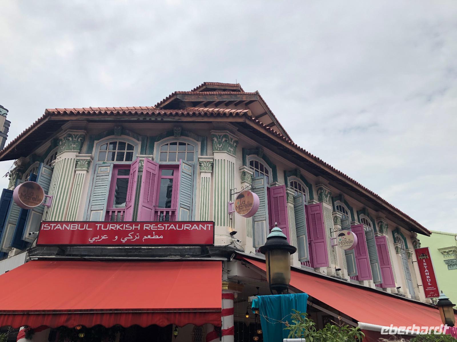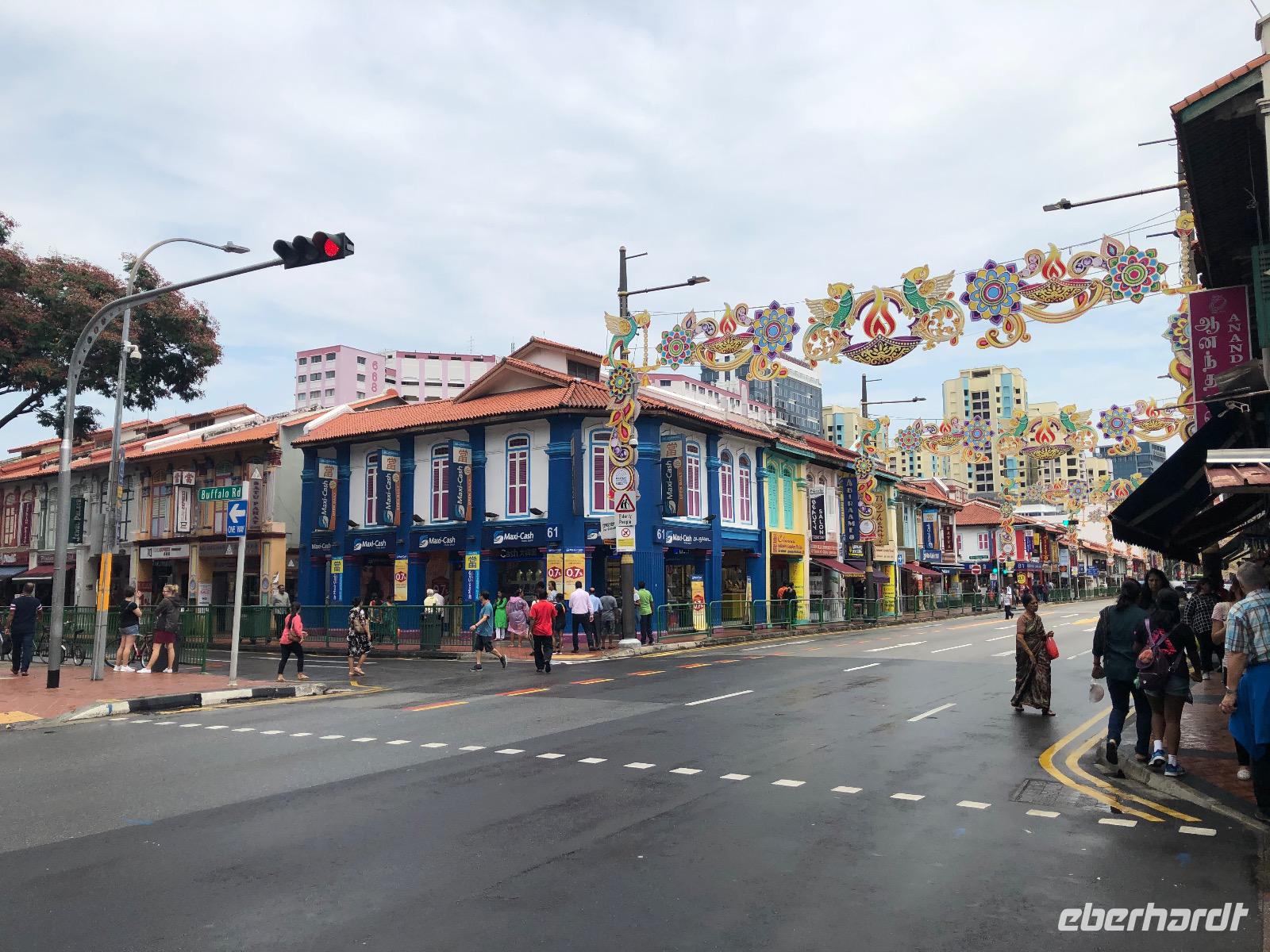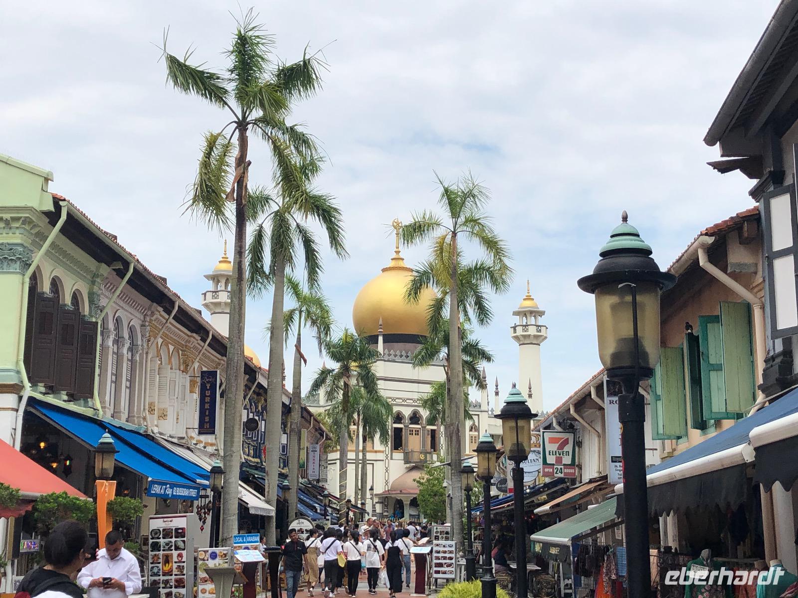 Unser nächstes Ziel ist das indische Viertel. Zwei große Pfauen begrüßen ankommende Gäste. Gerade vorbei ist das indische Neujahrsfest, das Festival des Lichts. Alles ist bunt und es riecht nach Räucherkerzen. Man kann hier teure Saris, Goldschmuck oder auch allerlei Tinnef kaufen. Im arabischen Viertel wird gerade zum Gebet gerufen. Es ist Freitag um zwölf und die Muslime strömen in die Moschee. In Singapur leben Menschen verschiedener Religionen friedlich zusammen. Man akzeptiert und toleriert einander und so kommt es, dass man auch zusammen feiert, zum Beispiel vier Mal das Neujahrsfest, auch nicht schlecht, oder?