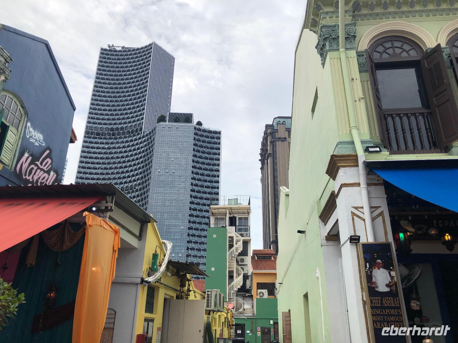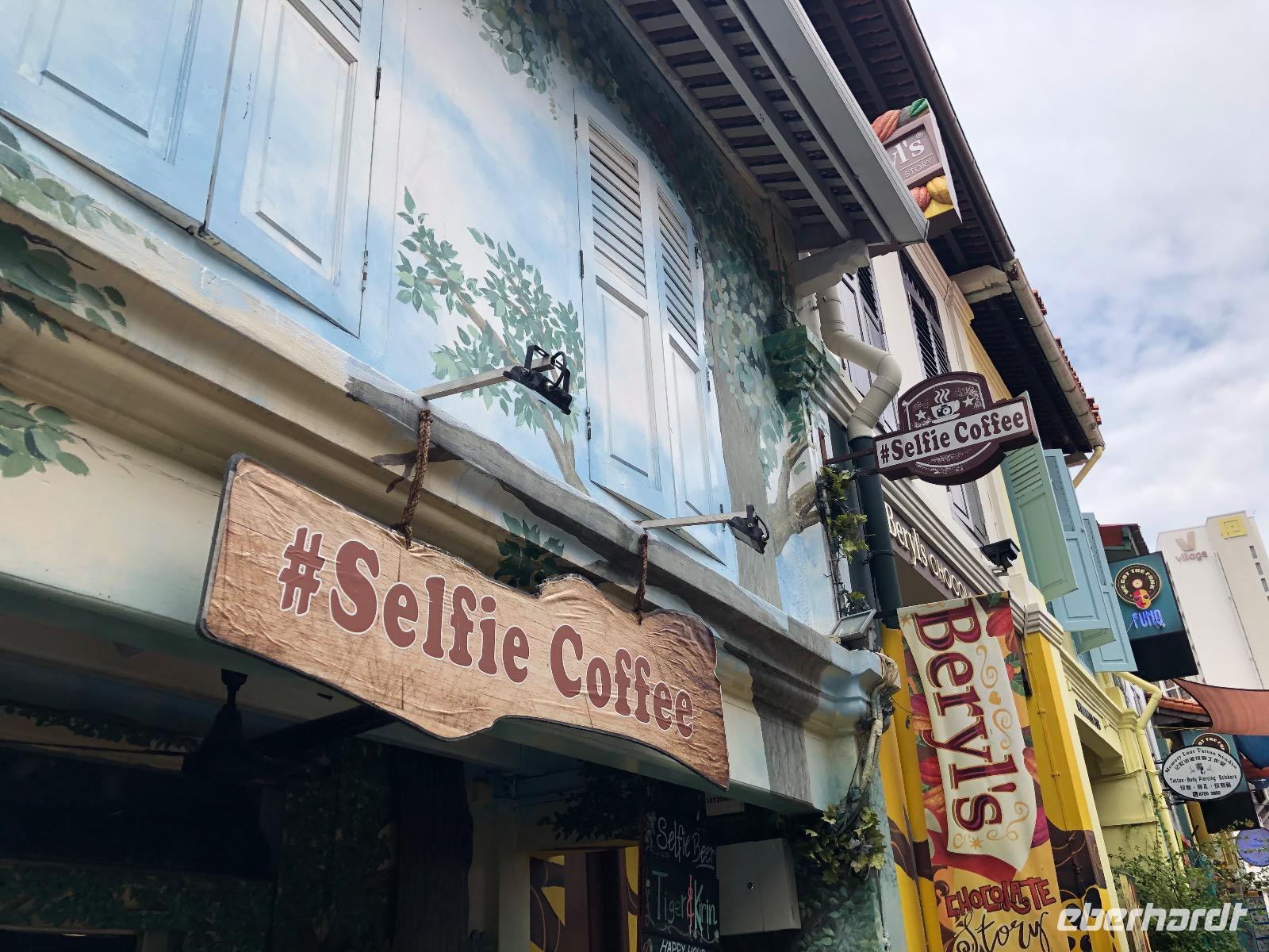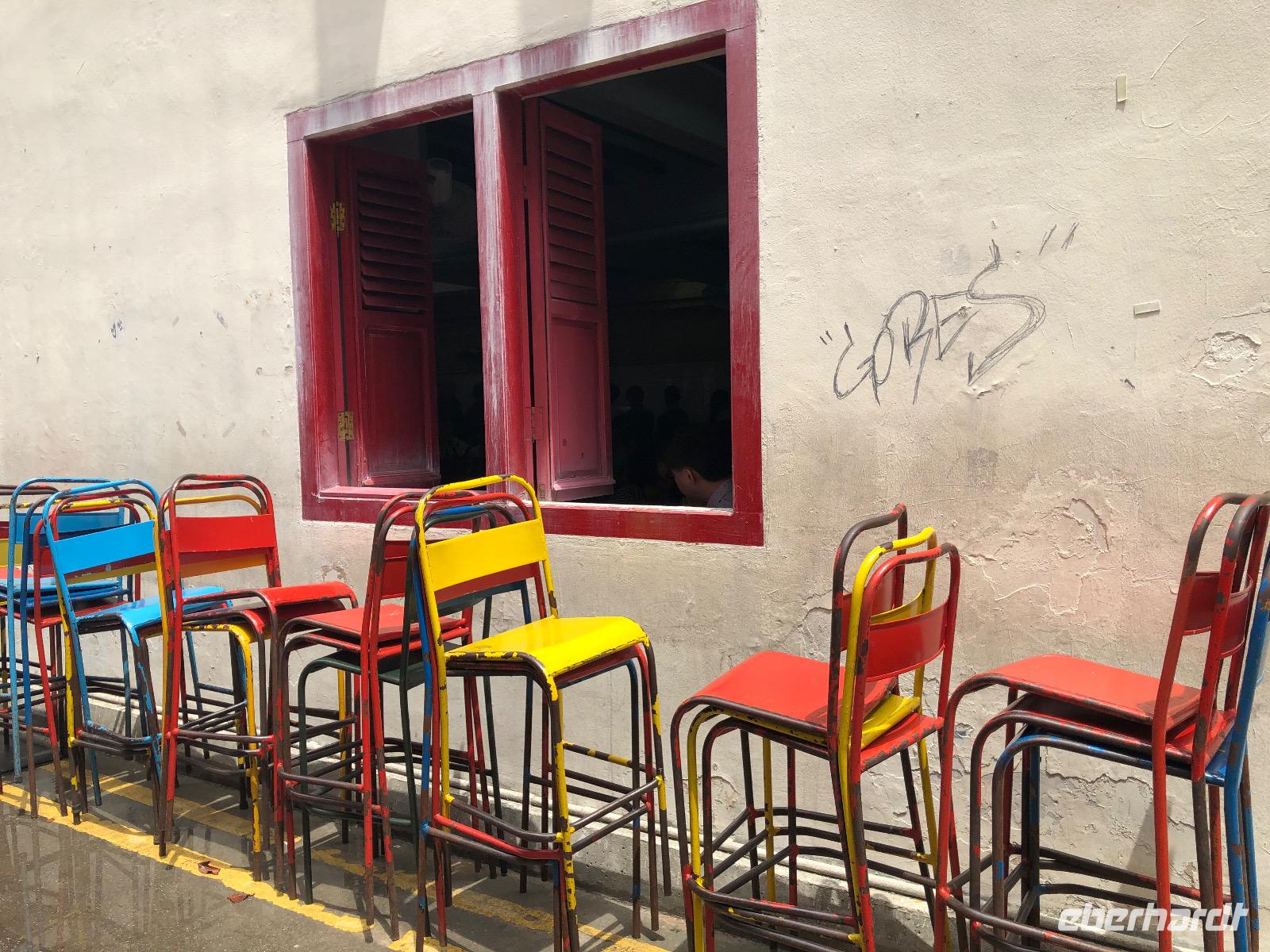 Das berühmte Raffles Hotel hat seit August auch wieder geöffnet. Leider übernachten wir dort nicht, fünfzehntausend Dollar pro Nacht überschreiten dann doch ein wenig unser Budget. Weiter geht es durch das koloniale Viertel, wo sich die schneeweiße Kirche befindet, die aus einem Gemisch mit Eiern angestrichen wurde. Wir überqueren eine Brücke am Fullerton Hotel, die zur Formel Eins Strecke gehört. In Chinatown legen wir unsere Mittagspause ein. Die Schmidtstraße rauf und runter sind überall Garküchen, wo wir für sechs Singapur Dollar (oder mehr) einen Teller Nudeln oder Reis bekommen. Viele Souvenirläden laden zum Shoppen ein und wir besuchen einen buddhistischen Tempel.