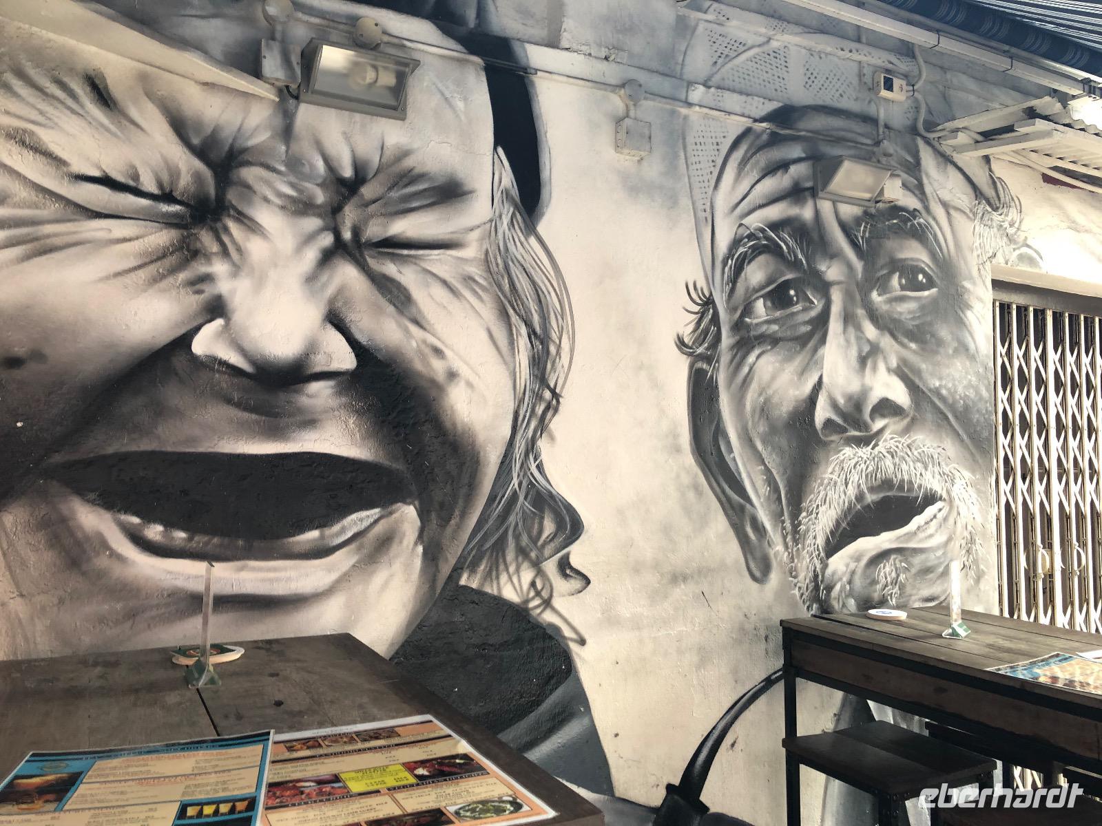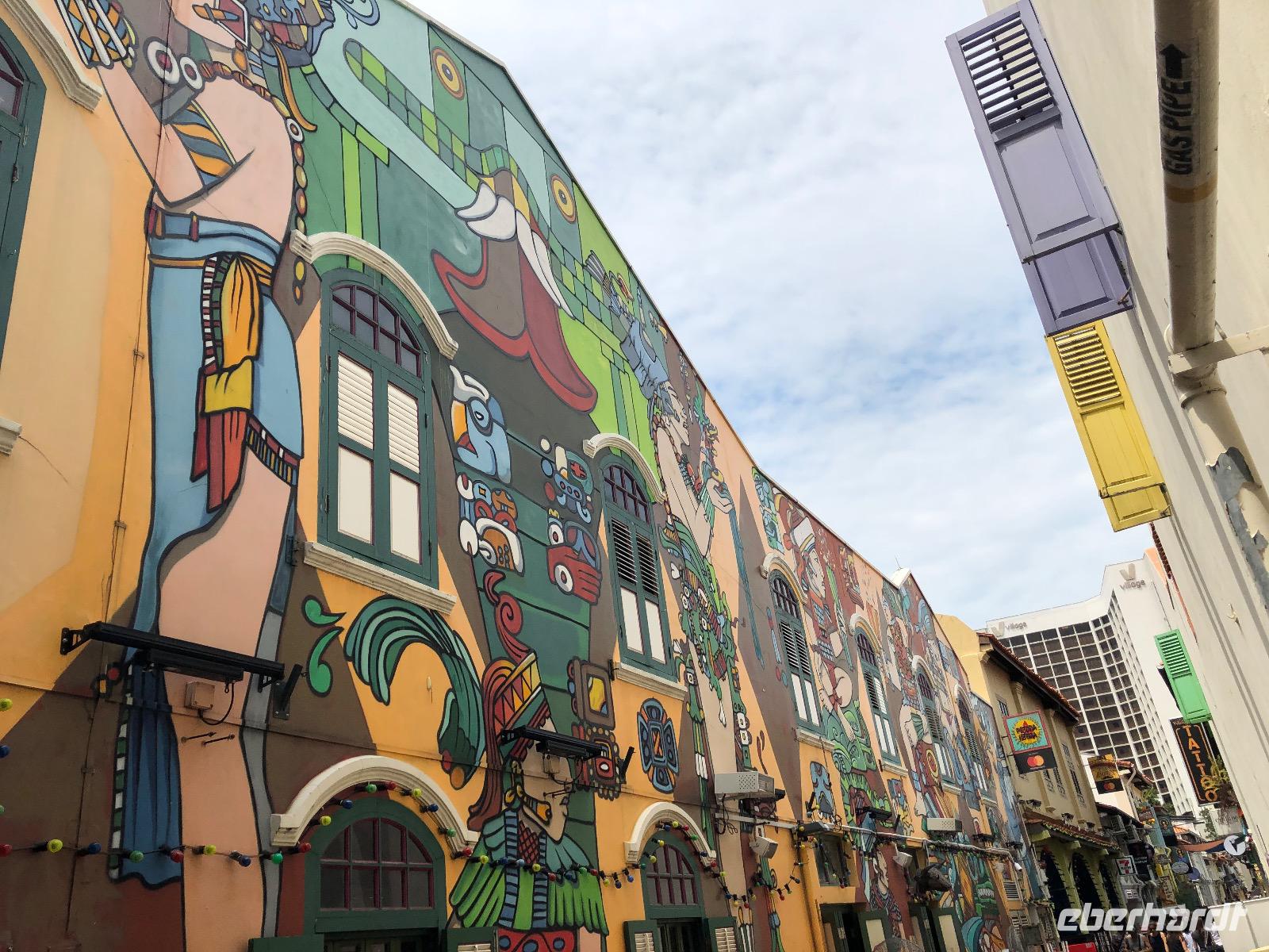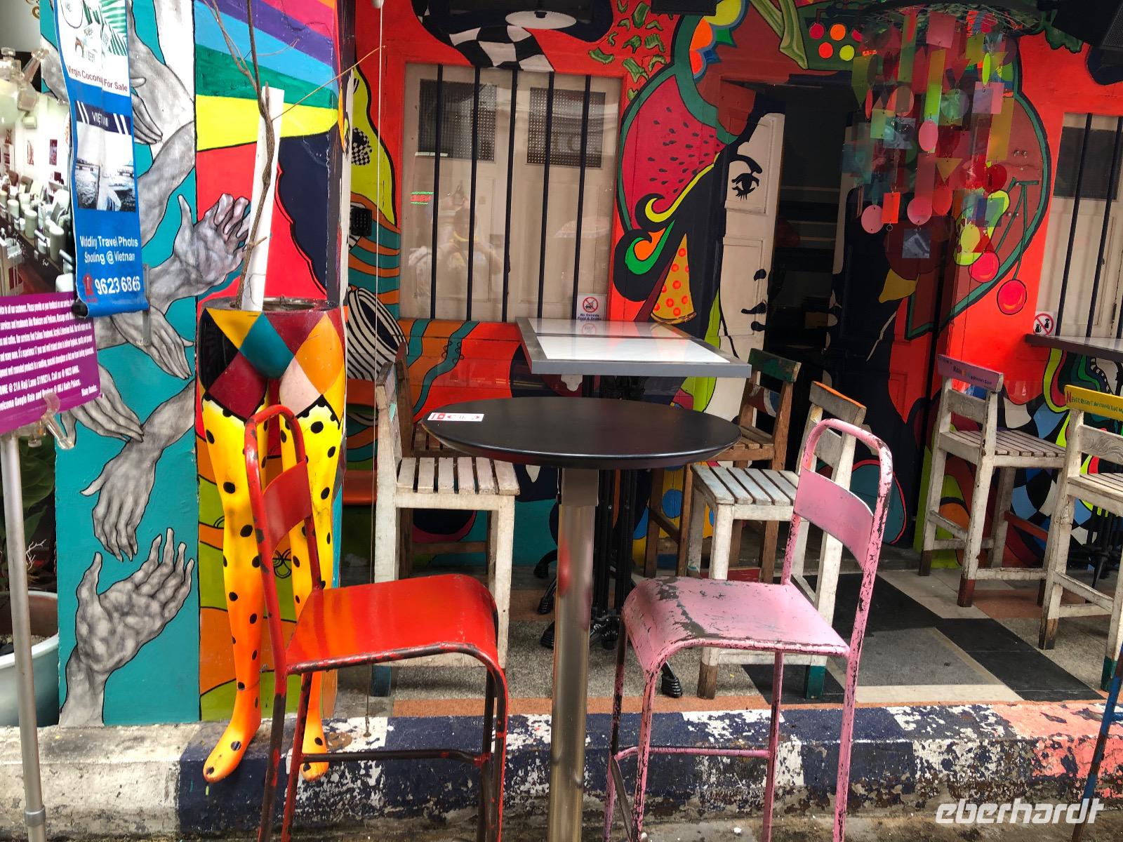 Das berühmte Raffles Hotel hat seit August auch wieder geöffnet. Leider übernachten wir dort nicht, fünfzehntausend Dollar pro Nacht überschreiten dann doch ein wenig unser Budget. Weiter geht es durch das koloniale Viertel, wo sich die schneeweiße Kirche befindet, die aus einem Gemisch mit Eiern angestrichen wurde. Wir überqueren eine Brücke am Fullerton Hotel, die zur Formel Eins Strecke gehört. In Chinatown legen wir unsere Mittagspause ein. Die Schmidtstraße rauf und runter sind überall Garküchen, wo wir für sechs Singapur Dollar (oder mehr) einen Teller Nudeln oder Reis bekommen. Viele Souvenirläden laden zum Shoppen ein und wir besuchen einen buddhistischen Tempel.