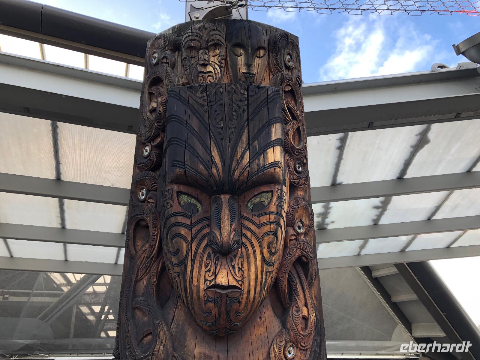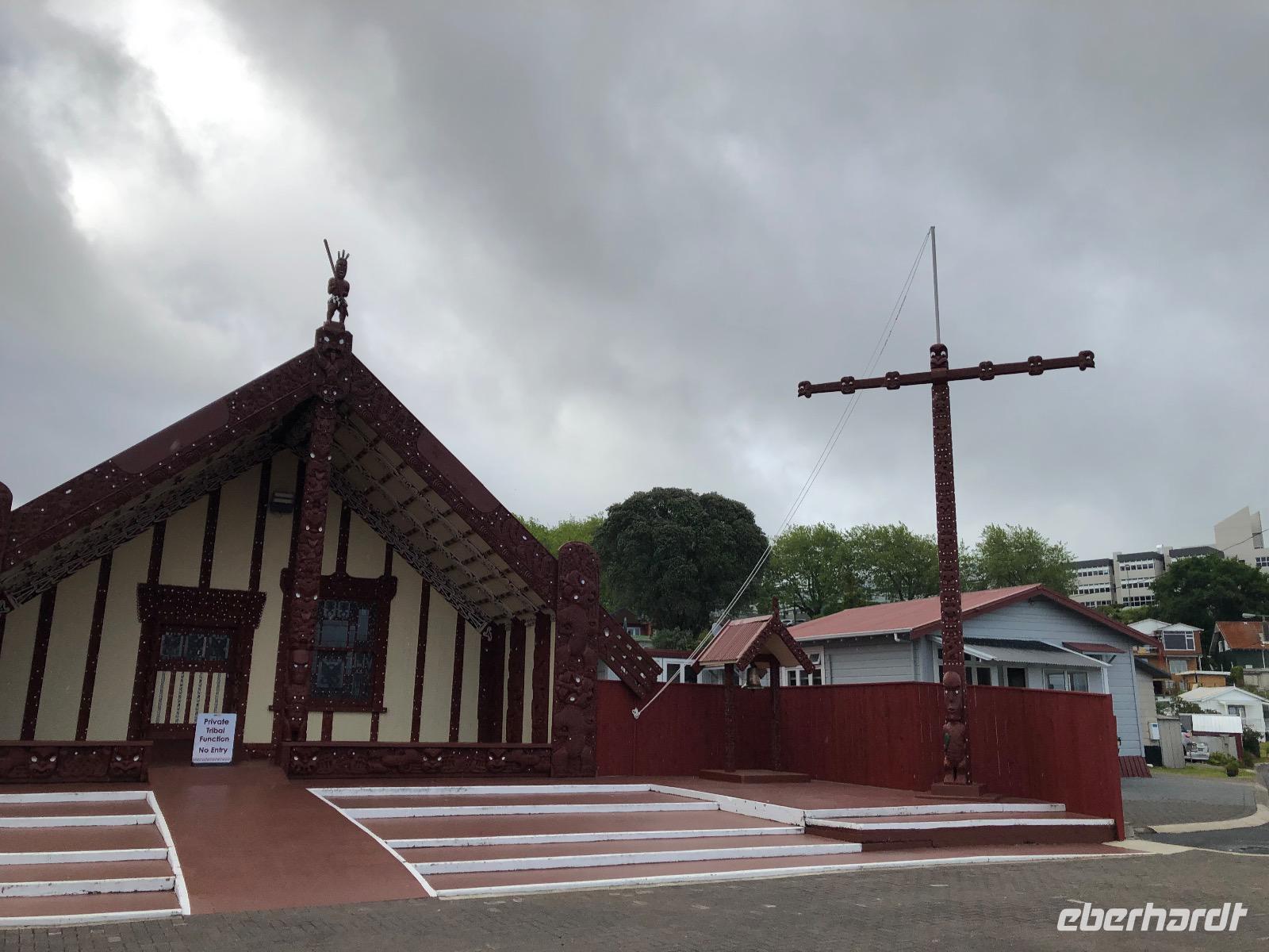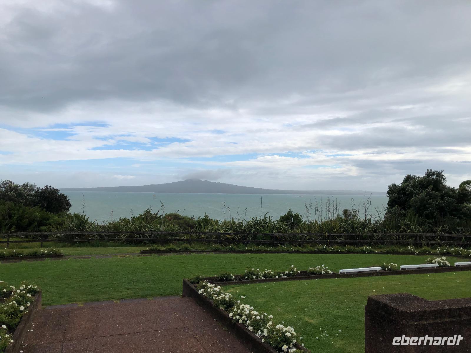 Am frühen Morgen regnet und stürmt es wie verrückt. Noch aber kuscheln wir uns in die bequemen Betten und lassen den Regen Regen sein. Und nach dem Frühstück (der nette Hotelkoch begrüßt uns freundlich auf Deutsch und fragt nach unserem woher und wohin) lässt der Regen dann auch nach. Wir verladen die Koffer in den Bus. Nach zehn Minuten legen wir am Bastion Point den ersten Stopp ein. Hier befindet sich eine Gedenkstätte zu Ehren der Maori Protestbewegung gegen den Verkauf von Maori Land Ende der 1970er Jahre.