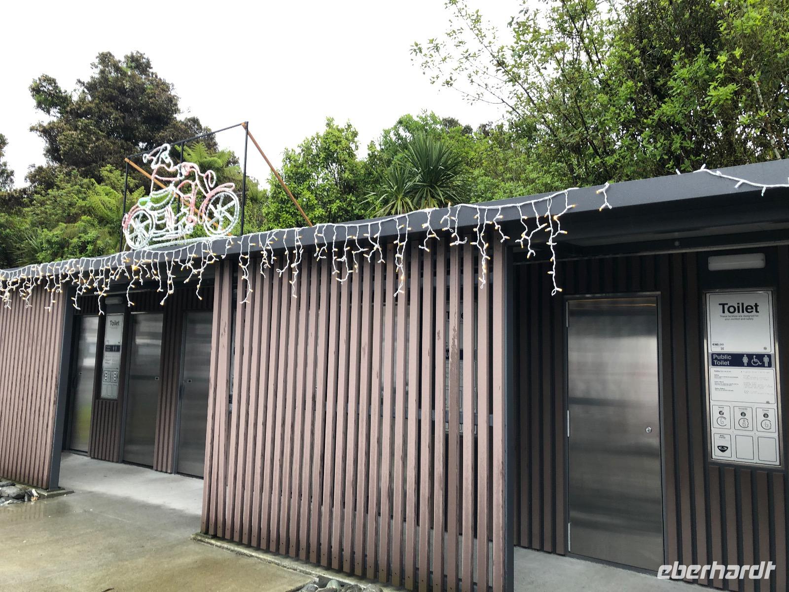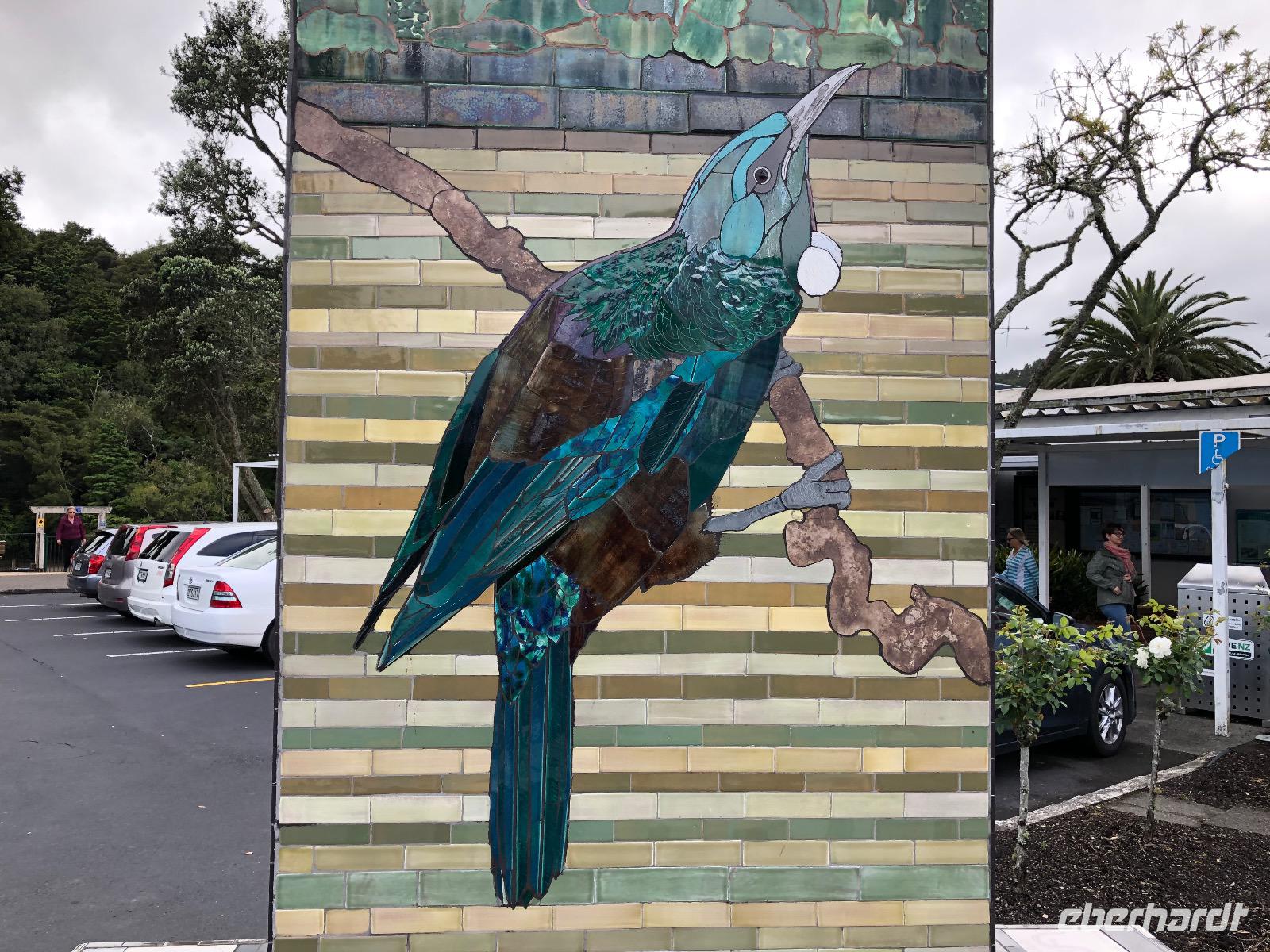 Unser erstes Ziel heute ist Kawakawa, wo wir ein WC aufsuchen, das von Friedensreich Hundertwasser gestaltet wurde. Hundertwasser wohnte hier ab 1973 und ließ dieses bunte Häuschen 1999 bauen. In Kawakawa gibt es ein Little German Restaurant, wo wir eine Kaffeepause einlegen.