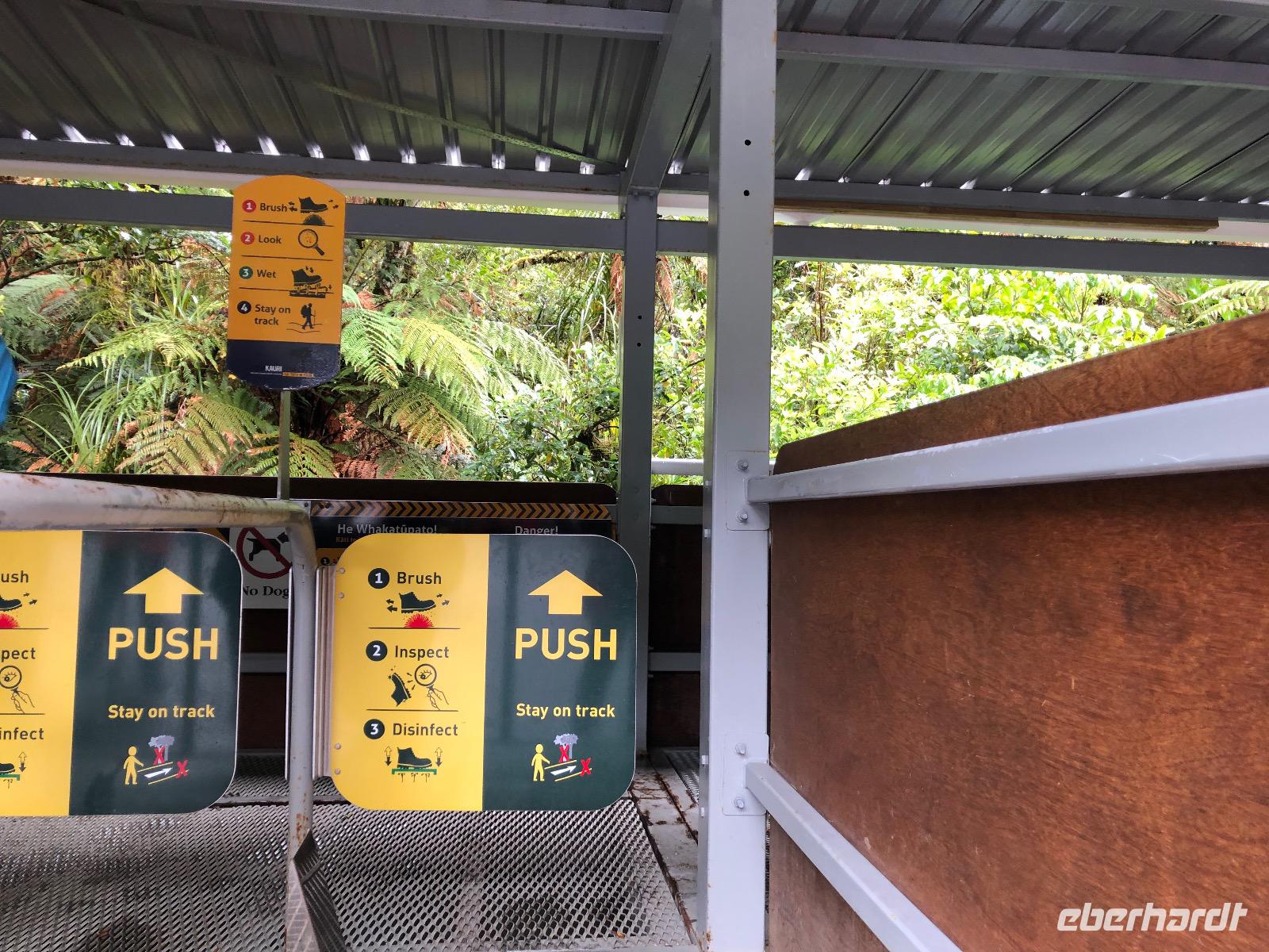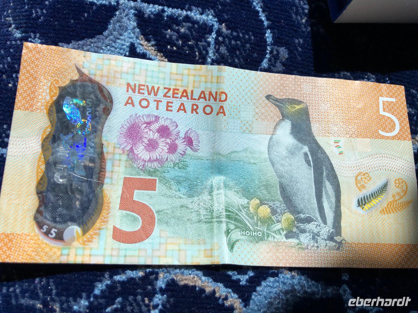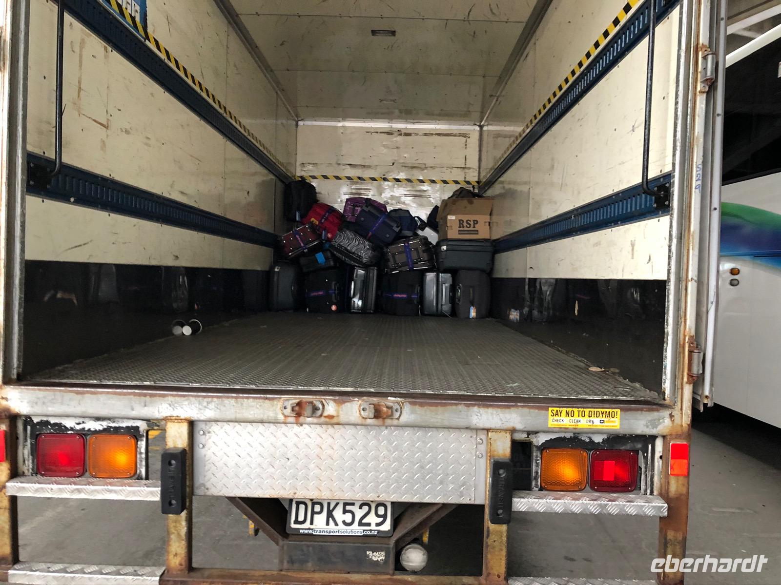 Nachdem auch diese zehn Stunden Flug überstanden sind, landen wir pünktlich in Auckland. Die Passkontrolle kann elektronisch absolviert werden. Das geht schnell und unkompliziert, klappt aber nicht bei jedem. Der Pass muss auf den Scanner gelegt werden und dann muss man drei Fragen (auf Deutsch gestellt) beantworten: Bleiben Sie länger als 30 Tage? Haben Sie ein Rückflugticket? Und: Waren Sie schon einmal im Gefängnis? Man muss nur Ja oder Nein antippen, weiter nichts. Dann durchgehen, Gesichtsscanner, fertig. Oder lange Schlange. Nun folgt die Abholung der Koffer und die Zollkontrolle. Hier werden wir gefragt, ob wir frische Lebensmittel oder Früchte dabei haben. Ein einfaches Nein wird akzeptiert, fertig. Nur ein Koffer muss zur Spezialkontrolle. Beim Bargeldtausch 100 € in Australische Dollar werden 11 Dollar Gebühr fällig (am Geldautomaten später nur 3).