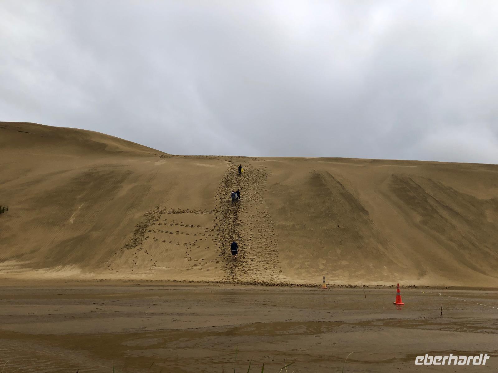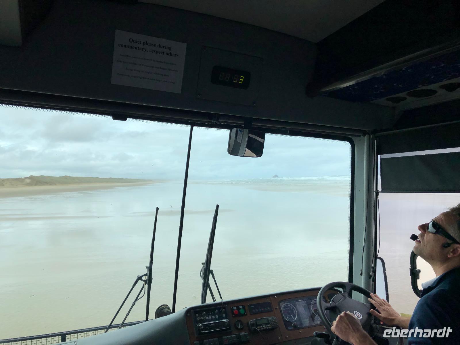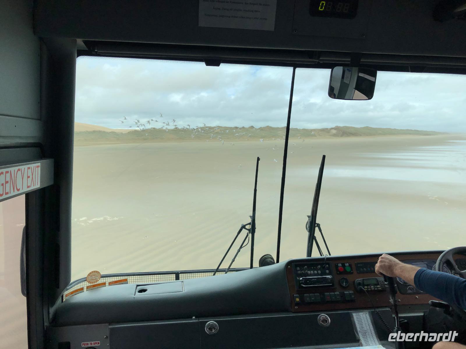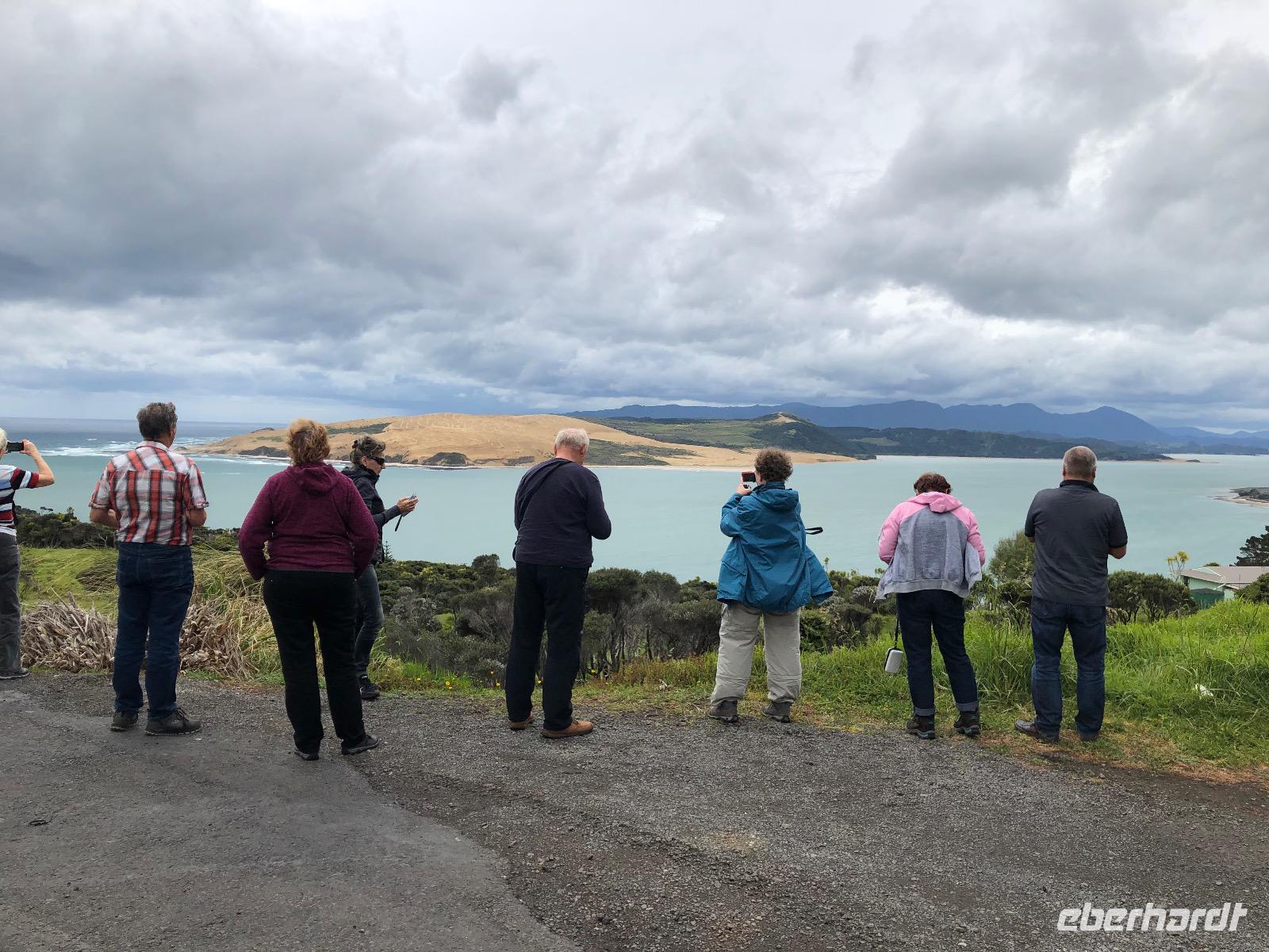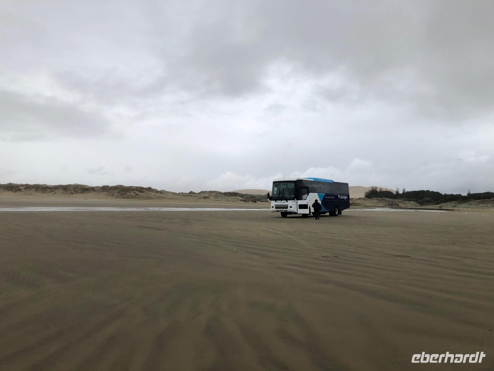 Der Regen hört auf und die Sonne scheint. Circa eine Viertel Stunde (bergab) zu Fuß benötigen wir, um zum 1941 erbauten Leuchtturm zu gelangen. Hier ist jetzt Neuseeland wirklich zu Ende. Wir können unser Glück über die fantastische Aussicht kaum fassen. Sogar die vorgelagerten THREE KINGS ISLANDS (Drei Königs Inseln) sind gut zu sehen. Weiter geht unsere Fahrt zu den großen Dünen. Hier können wir einem speziellen Sport der Neuseeländer frönen - Sanddünensurfen ist angesagt. Zum Glück haben wir vier junge Frauen im Bus, die nicht zu unserer Gruppe gehören, aber mit uns gemeinsam an dem Ausflug teilnehmen. Drei von den Mädchen stürzen sich begeistert ins Abenteuer und wir dürfen zusehen. Ariel unser Driver/Guide (Busfahrer/Reiseleiter) erklärt ihnen anschaulich, wie sie sich auf das Brett legen sollen. Anschließend erklimmen sie die Düne und Rauschen mit lautem Gejohle Kopf voraus und auf dem Brett liegend diese wieder hinunter. Gut gemacht, Mädels. Nun folgt einer der Höhepunkte des Tages. Ariel ist nicht zu bremsen. Zu unserem großen Vergnügen lässt er den Bus durch Pfützen jagen, dass es nur so spritzt. Sand, Wasser, Sand... Ariel hat sichtlich Spaß und wir auch. Der Bus dreht sich im Kreis, fährt ins Wasser der Tasmanischen See und wieder raus. Bald erreichen wir den 90 Meilen Strand. Und tatsächlich fahren wir über eine Stunde direkt am Strand entlang. Hier ist kein Mensch zu sehen. Und das über viele Kilometer. Erst später begegnen wir einigen Verrückten, die hier wandern oder joggen. Nach dieser Tour hat der Bus dringend eine Wäsche nötig. Wir werden derweil in einem Café mit Souvenirshop abgesetzt. Der Plan, wenn es denn einen gibt, geht auf und Souvenire wandern in unser Gepäck. Alle glücklich. Hier gibt es auch ein freies WLAN und so erreicht uns die Nachricht, dass unsere Bootsausflügler auch einen spannenden Tag hatten, mit hohen Wellen und Delfinen. Unser letzter Programmpunkt ist die Versorgung mit Fish&Chips. Ein Tag mit vielen Erlebnissen neigt sich dem Ende zu.