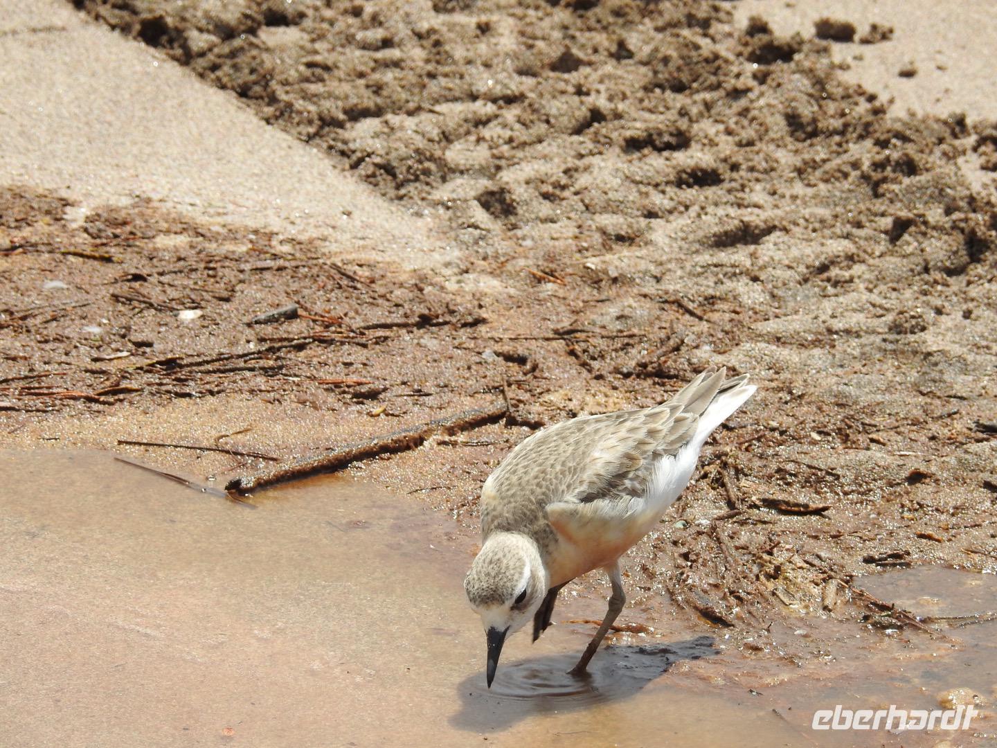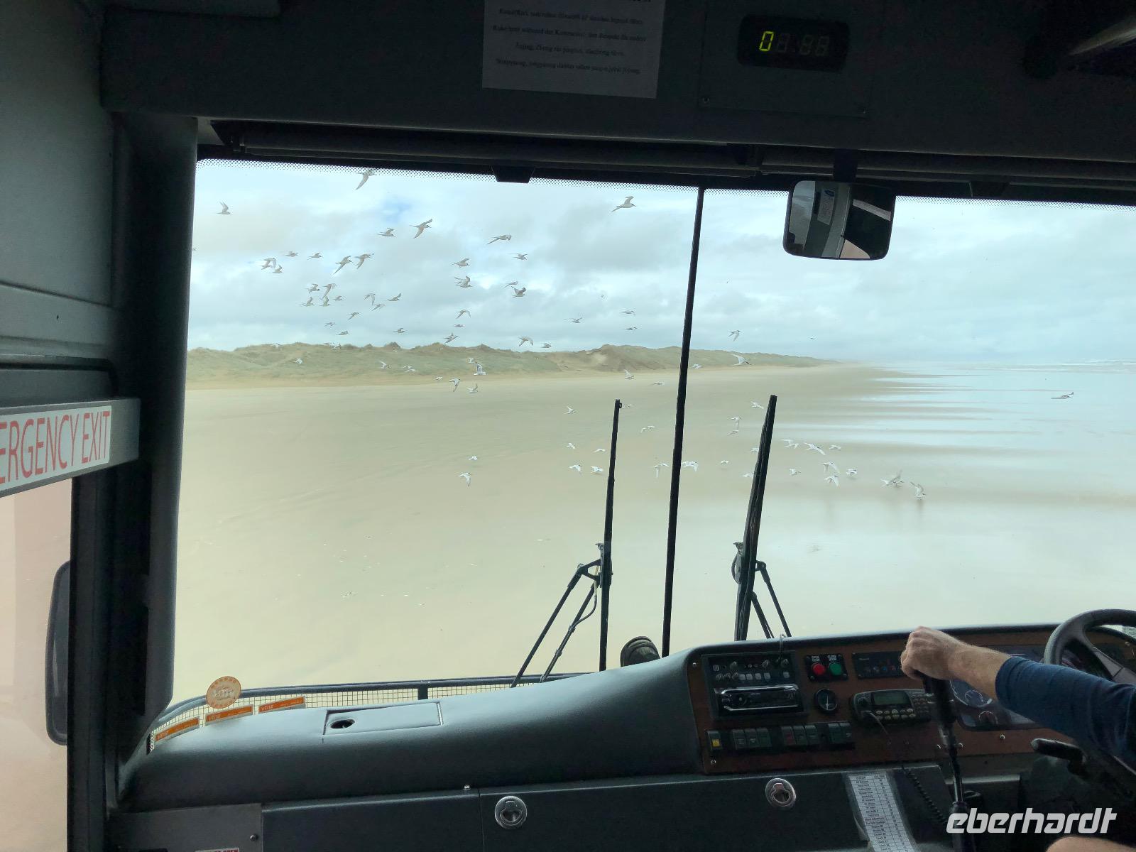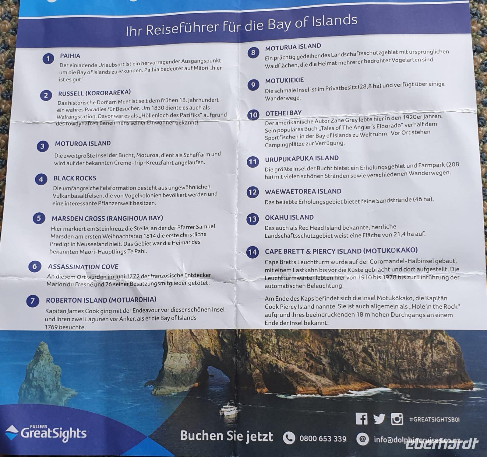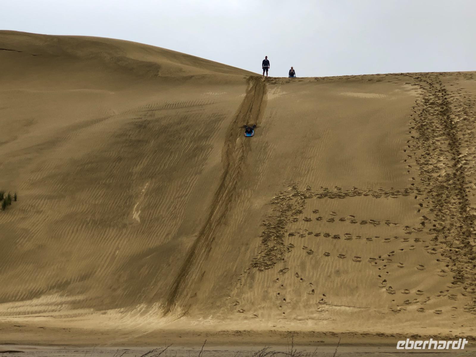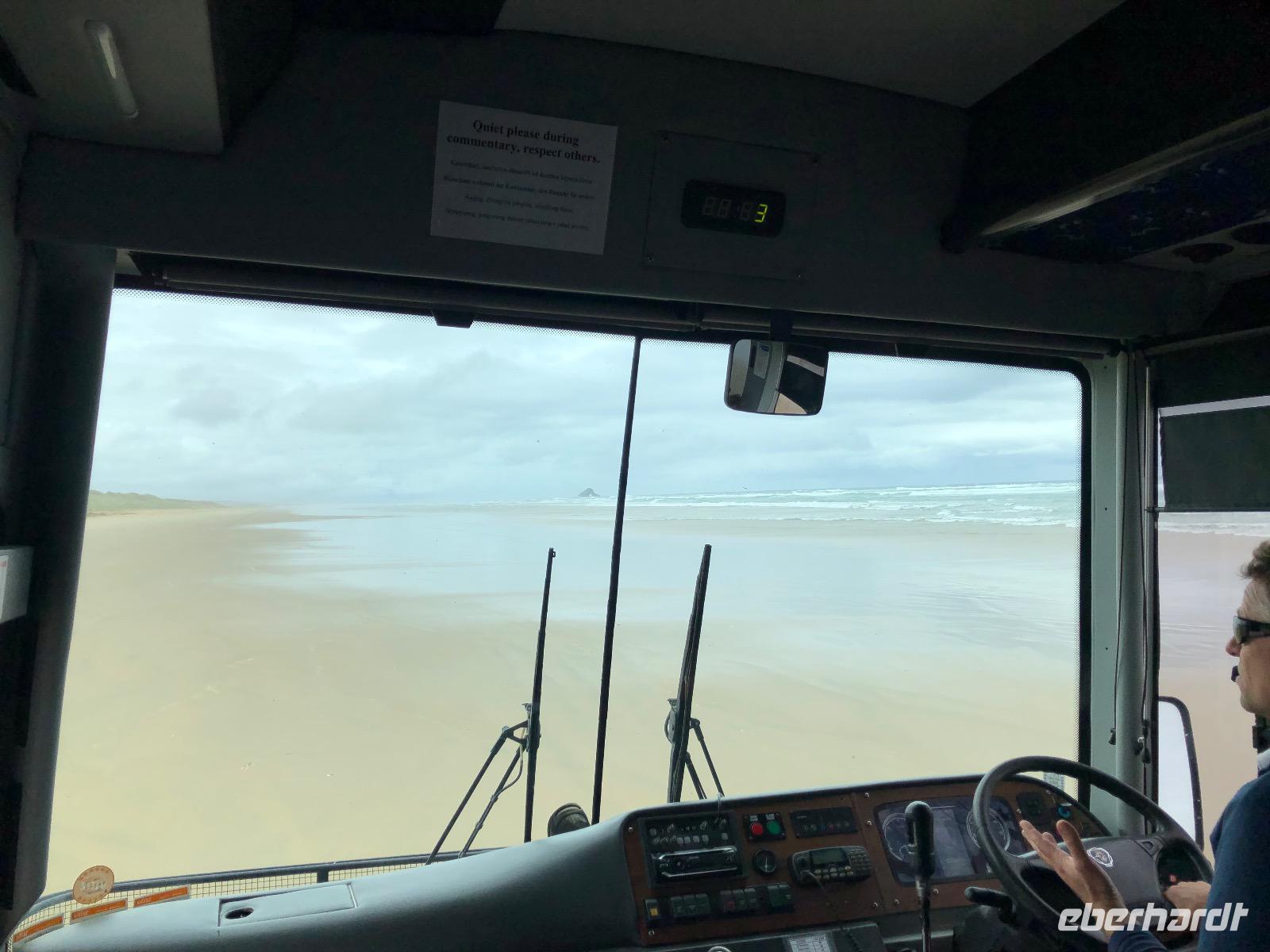 Der Regen hört auf und die Sonne scheint. Circa eine Viertel Stunde (bergab) zu Fuß benötigen wir, um zum 1941 erbauten Leuchtturm zu gelangen. Hier ist jetzt Neuseeland wirklich zu Ende. Wir können unser Glück über die fantastische Aussicht kaum fassen. Sogar die vorgelagerten THREE KINGS ISLANDS (Drei Königs Inseln) sind gut zu sehen. Weiter geht unsere Fahrt zu den großen Dünen. Hier können wir einem speziellen Sport der Neuseeländer frönen - Sanddünensurfen ist angesagt. Zum Glück haben wir vier junge Frauen im Bus, die nicht zu unserer Gruppe gehören, aber mit uns gemeinsam an dem Ausflug teilnehmen. Drei von den Mädchen stürzen sich begeistert ins Abenteuer und wir dürfen zusehen. Ariel unser Driver/Guide (Busfahrer/Reiseleiter) erklärt ihnen anschaulich, wie sie sich auf das Brett legen sollen. Anschließend erklimmen sie die Düne und Rauschen mit lautem Gejohle Kopf voraus und auf dem Brett liegend diese wieder hinunter. Gut gemacht, Mädels. Nun folgt einer der Höhepunkte des Tages. Ariel ist nicht zu bremsen. Zu unserem großen Vergnügen lässt er den Bus durch Pfützen jagen, dass es nur so spritzt. Sand, Wasser, Sand... Ariel hat sichtlich Spaß und wir auch. Der Bus dreht sich im Kreis, fährt ins Wasser der Tasmanischen See und wieder raus. Bald erreichen wir den 90 Meilen Strand. Und tatsächlich fahren wir über eine Stunde direkt am Strand entlang. Hier ist kein Mensch zu sehen. Und das über viele Kilometer. Erst später begegnen wir einigen Verrückten, die hier wandern oder joggen. Nach dieser Tour hat der Bus dringend eine Wäsche nötig. Wir werden derweil in einem Café mit Souvenirshop abgesetzt. Der Plan, wenn es denn einen gibt, geht auf und Souvenire wandern in unser Gepäck. Alle glücklich. Hier gibt es auch ein freies WLAN und so erreicht uns die Nachricht, dass unsere Bootsausflügler auch einen spannenden Tag hatten, mit hohen Wellen und Delfinen. Unser letzter Programmpunkt ist die Versorgung mit Fish&Chips. Ein Tag mit vielen Erlebnissen neigt sich dem Ende zu.