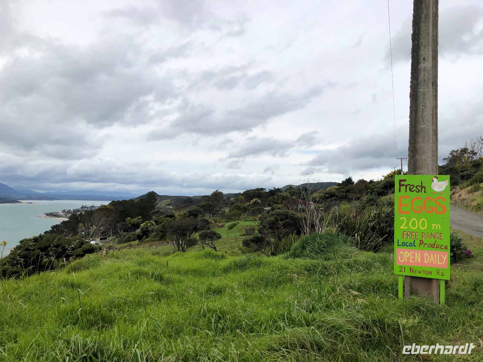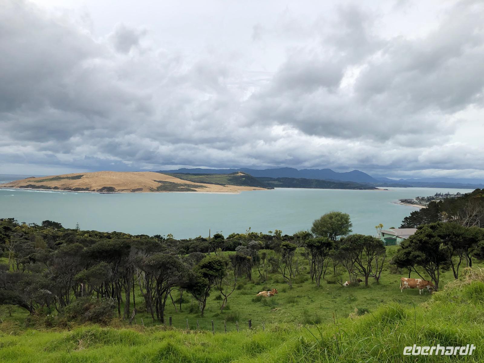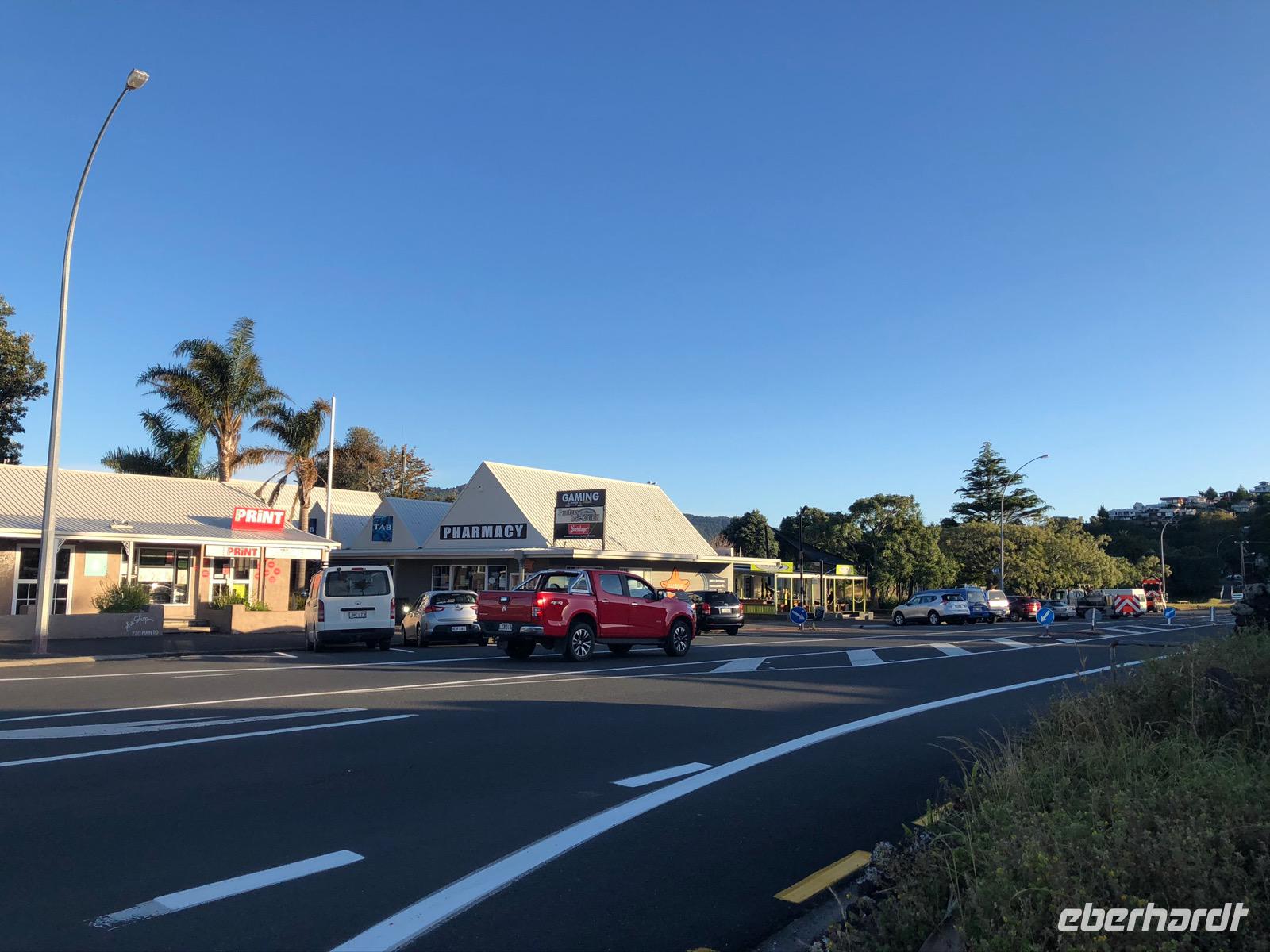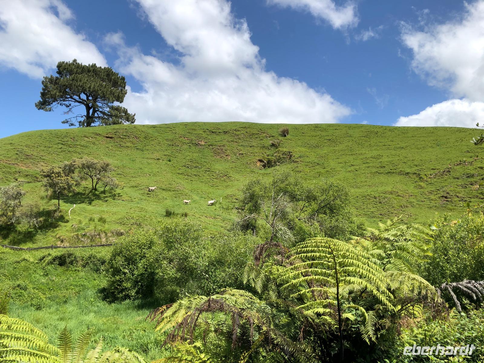 Wir verlassen Auckland und reisen Richtung Norden. Links und rechts wird die Landschaft hügliger und grün. Wir fahren entlang der Hibiskusküste, eine beliebte Urlaubergegend für Neuseeländer.