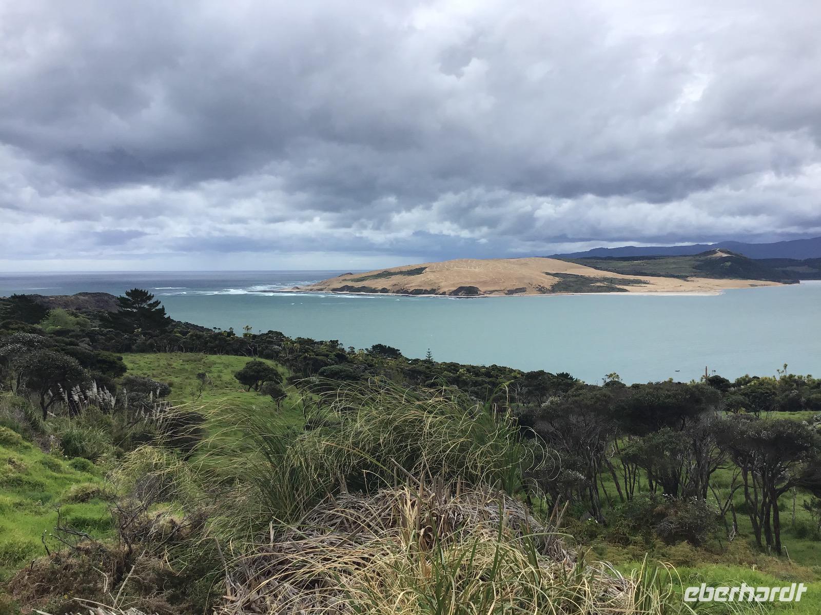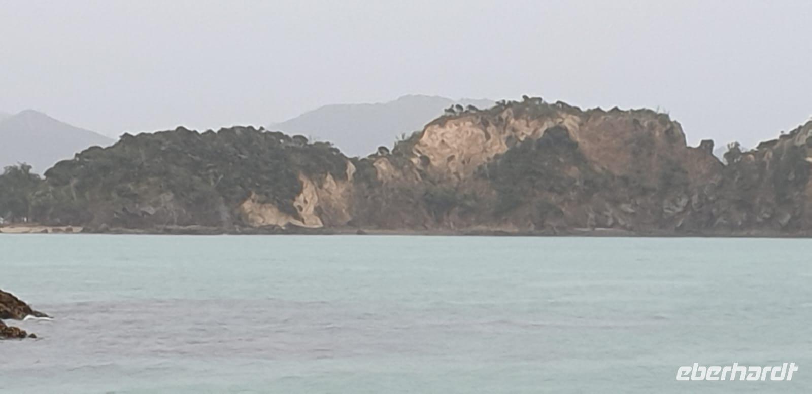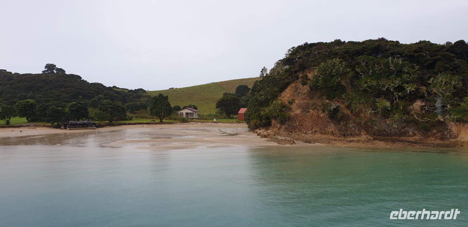 Kurz nach 16 Uhr erreichen wir die Coromandel Halbinsel. Über grünen Hügeln und unter blauem Himmel schwebt die lange weiße Wolke. Mitte des 19. Jahrhunderts wurde hier Gold entdeckt und tausende Glücksritter kamen, in der Hoffnung auf den Fund ihres Lebens. Das Vorkommen war jedoch bald erschöpft und die Goldgräber zogen weiter.