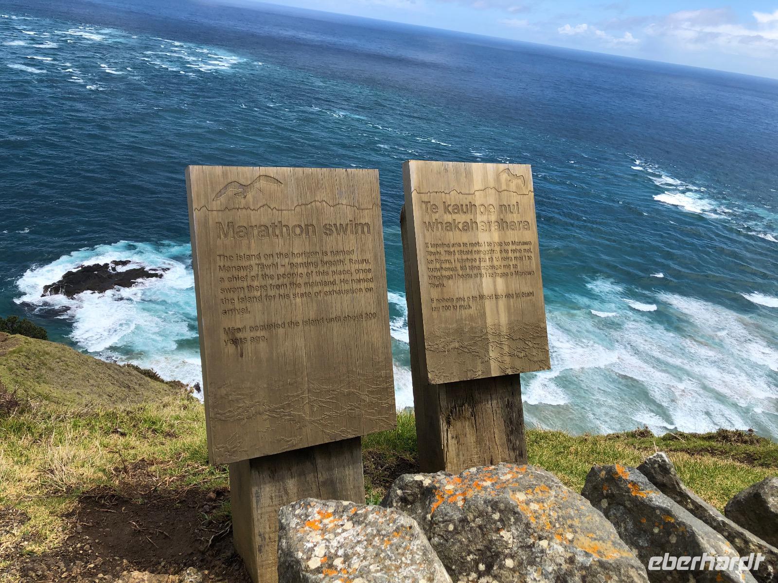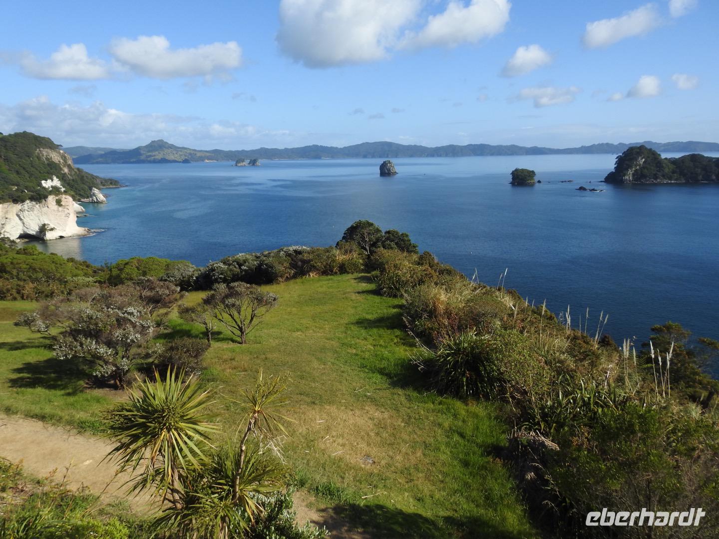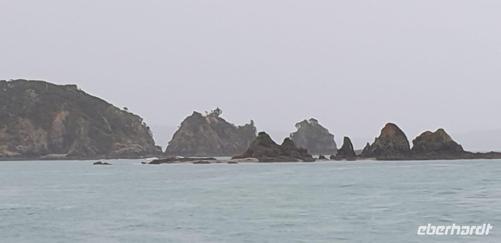 Kurz nach 16 Uhr erreichen wir die Coromandel Halbinsel. Über grünen Hügeln und unter blauem Himmel schwebt die lange weiße Wolke. Mitte des 19. Jahrhunderts wurde hier Gold entdeckt und tausende Glücksritter kamen, in der Hoffnung auf den Fund ihres Lebens. Das Vorkommen war jedoch bald erschöpft und die Goldgräber zogen weiter.