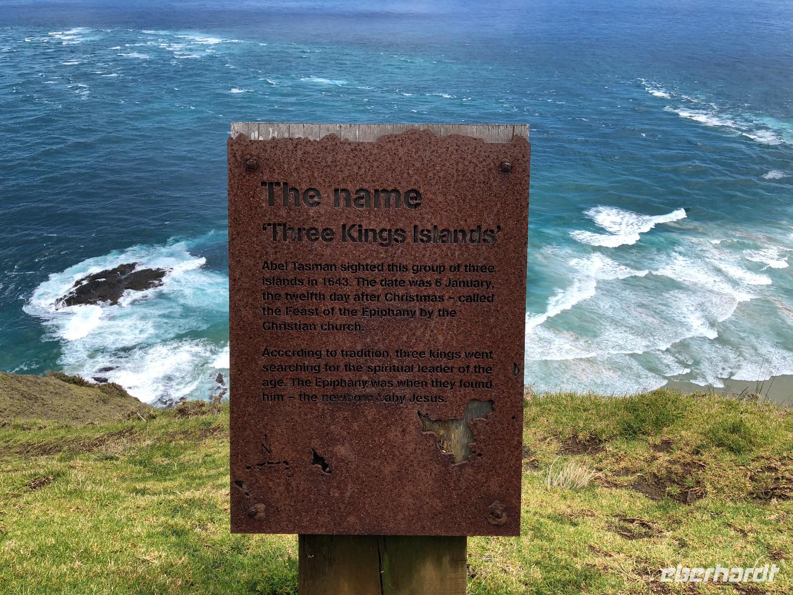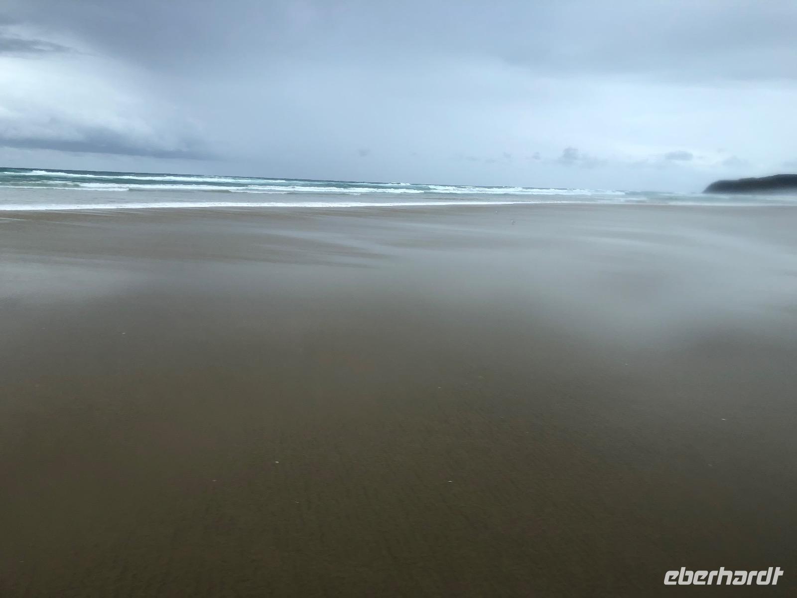 Gegen elf kommen wir an Parengarenga Harbour vorbei. Typisch ist hier weißer Quarzsand, der bei Sonnenschein die Augen blenden kann. So dicht kommen wir aber gar nicht heran. Wir verfolgen weiter unseren Weg Richtung Norden zum Kap Reinga. Endlich sind auch mal ein paar Schafe zu sehen, bisher gab es fast nur Kühe auf der Weide. Es regnet in Strömen. Gegen zwölf erreichen wir Cape Reina, die nördliche Spitze Neuseelands. Cape Reinga bedeutet UNTERWELT, denn hier gibt es einen Baum, von dem die Maoris glauben, dass ihre Verstorbenen über diesen ihre Reise in die Unterwelt antreten.