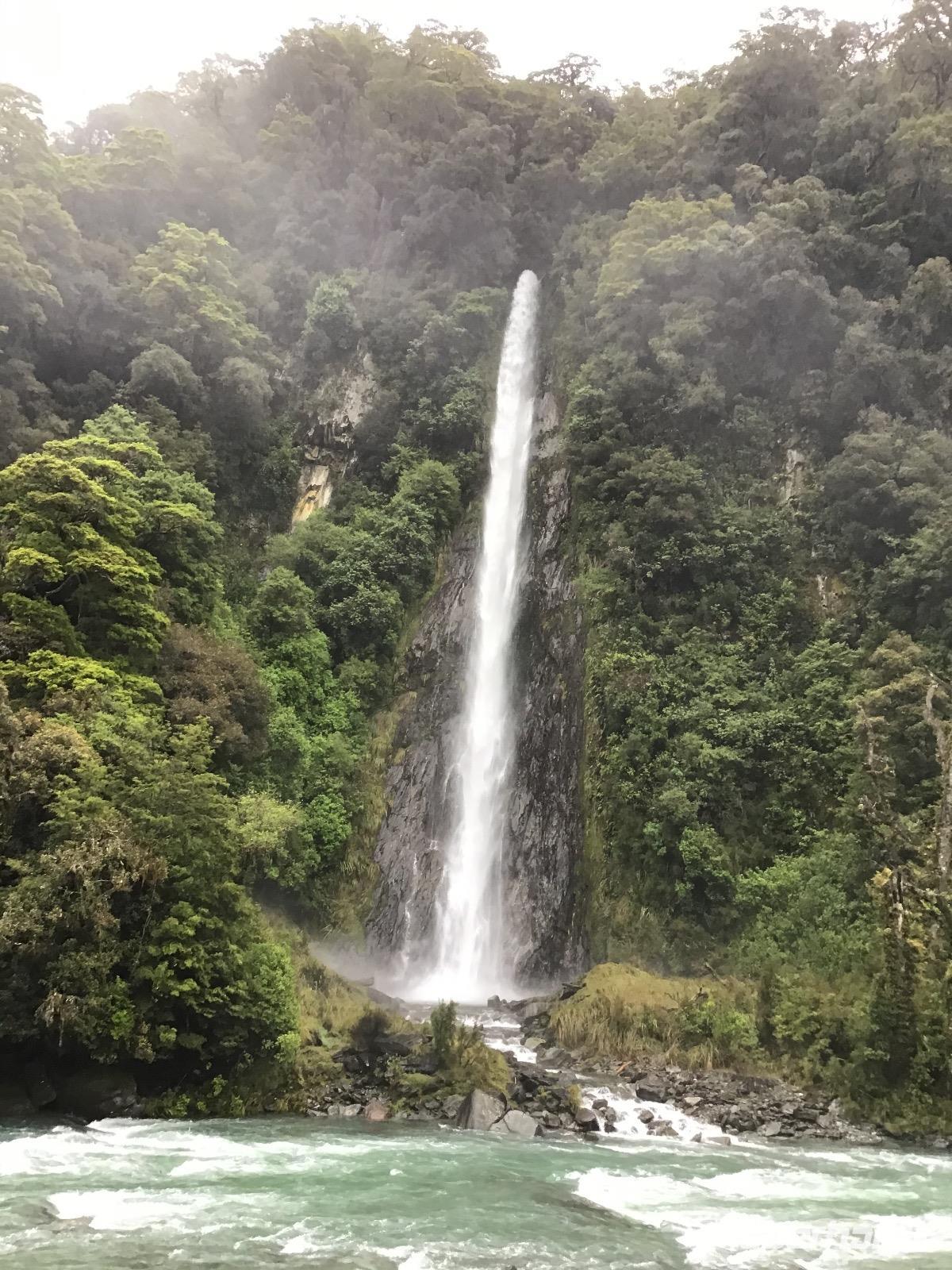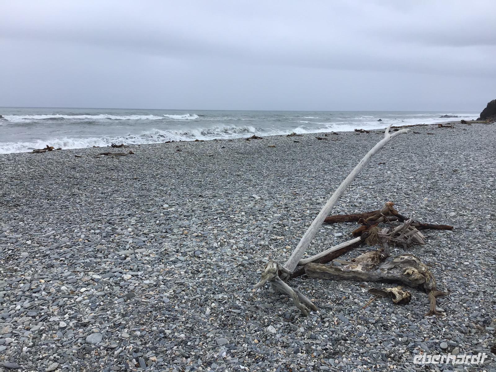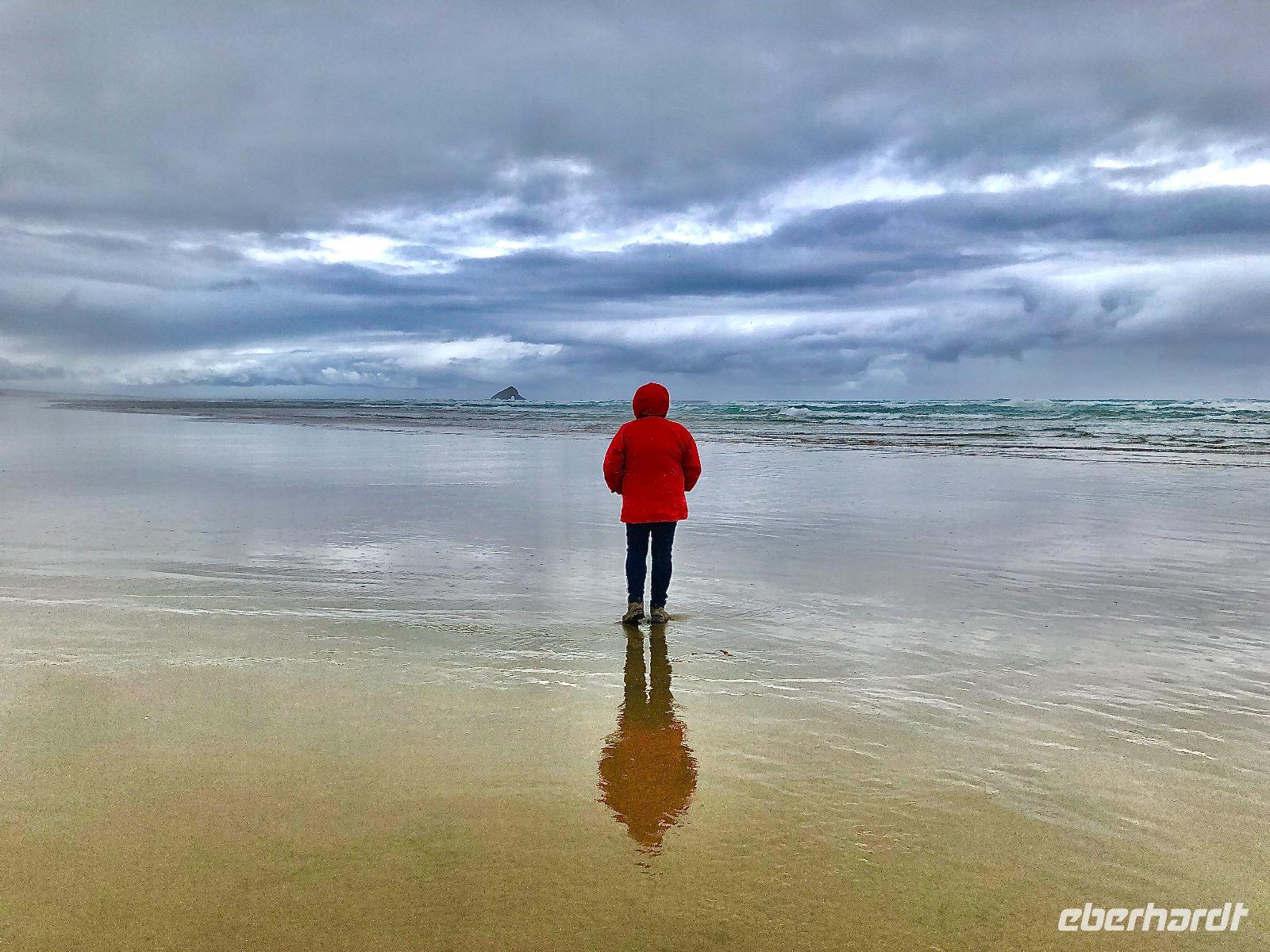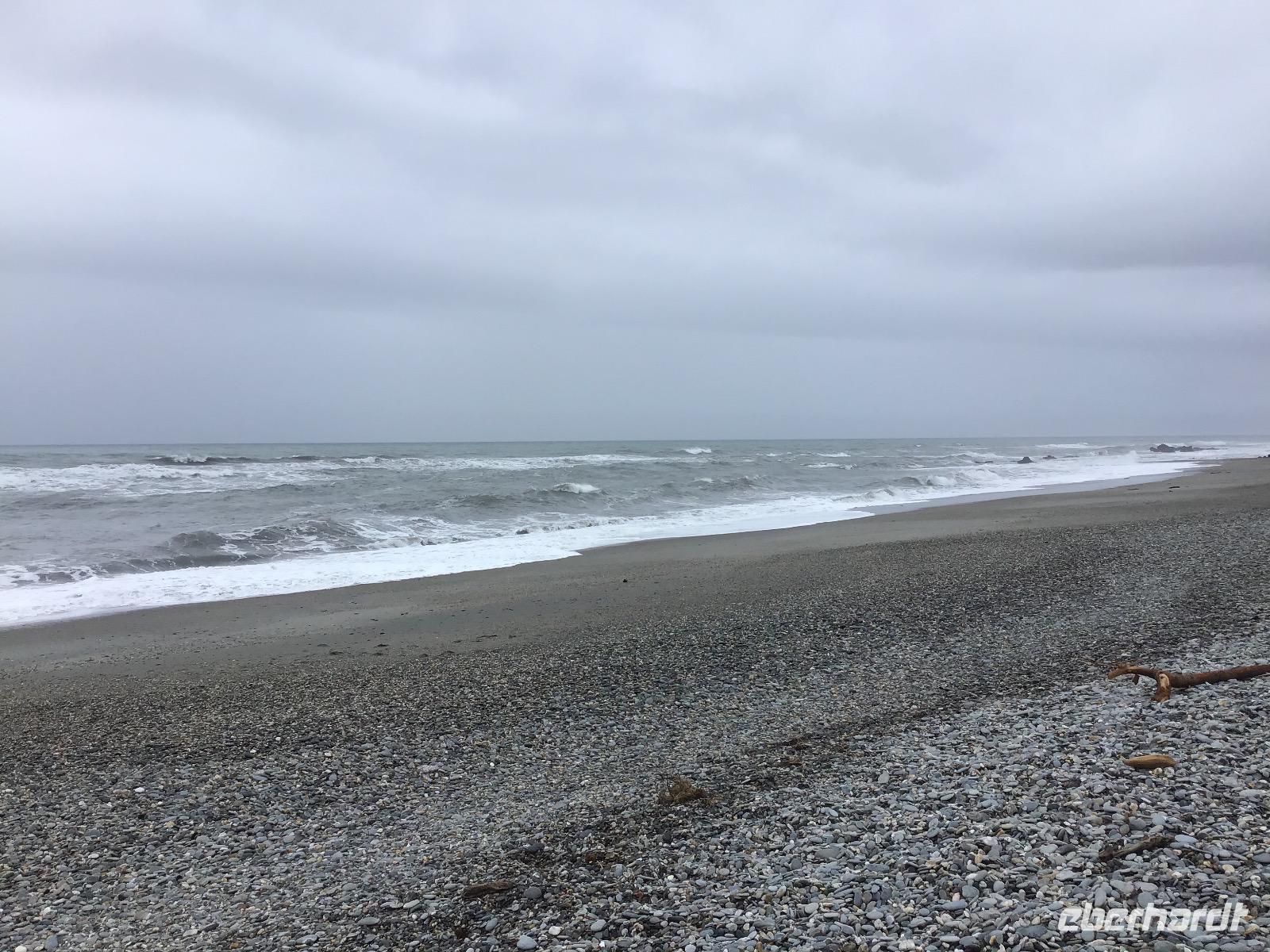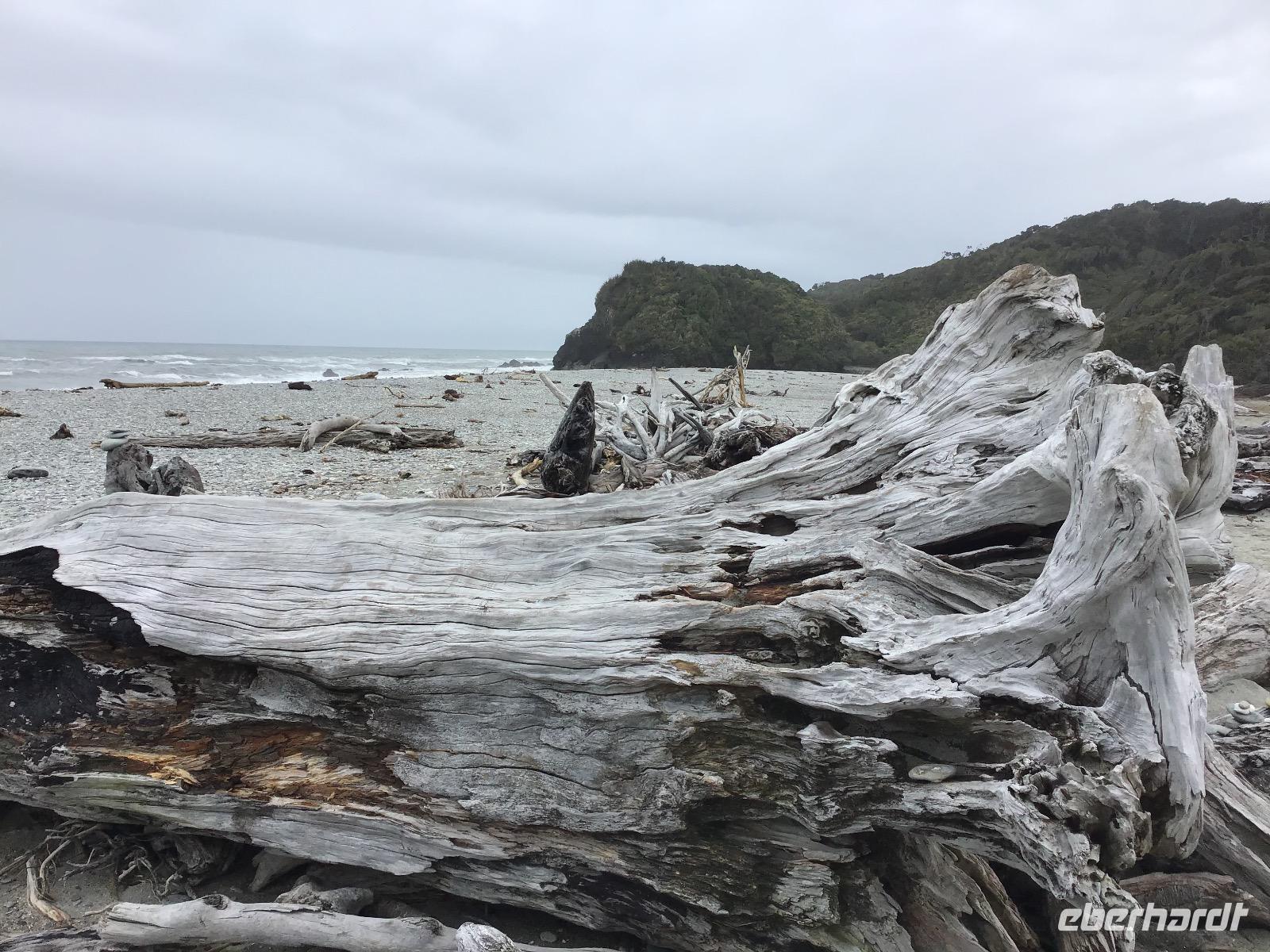 Heute erwischt es uns wettertechnisch gesehen. Am Wanakasee ist es nur wolkig, dann aber hört der Regen nicht mehr auf. Wir legen an einigen Stellen Fotostopps ein, an klaren Seen mit schneebedeckten Bergen im Hintergrund. In Makarora kehren wir zum Mittagessen ein. Fish and Ships oder ein Sandwich oder eine hausgemachte Gemüsesuppe, für jeden findet sich etwas. Das Personal ist freundlich und schnell und es gibt einen kleinen Shop. Nächstes Ziel ist der Thunder Creek Wasserfall, dessen Höhe von 90 Metern trotz des schlechten Wetters begeistert. Am Ship Creek teilt sich die Gruppe, einige spazieren am Strand entlang und spähen nach Pinguinspuren, die anderen laufen mit Gernot durch den Regenwald. Wir sind hier direkt an der schroffen Westküste Neuseelands. Man muss die Dünen überqueren, um an die menschenleere unbebaute Küste zu gelangen. Das Meer schwappt in wilden Wellen an den Strand. Kilometerweit knirschen die rundgewaschenen Steine unter den Füßen. Im Rausch der Brandung scheint alles Irdische zu vergehen.