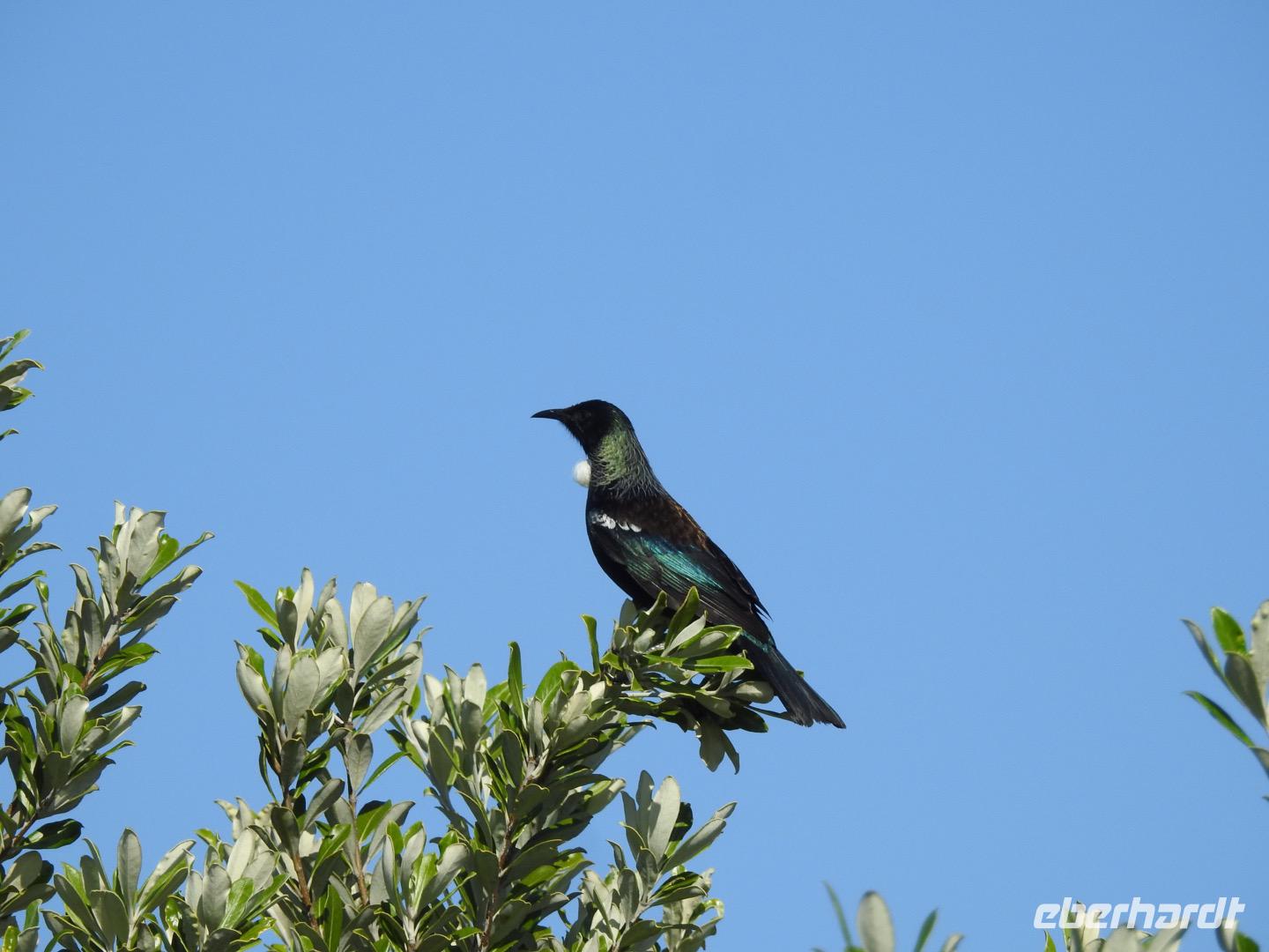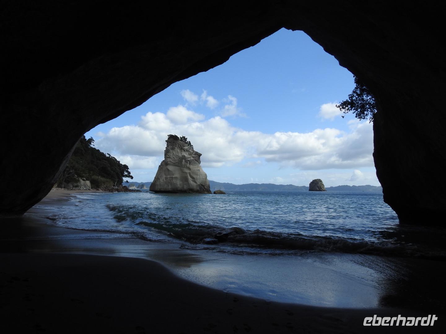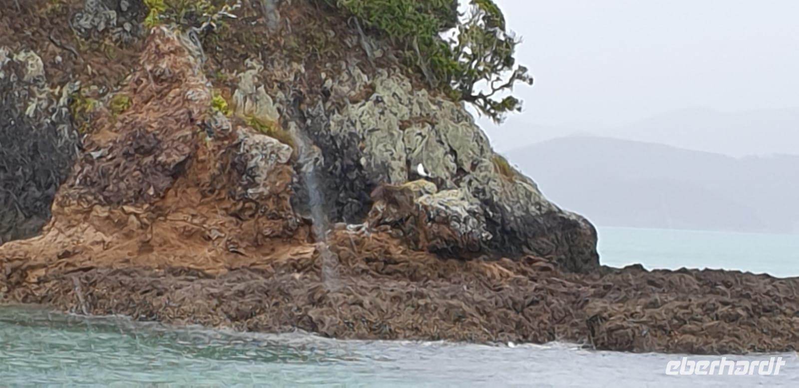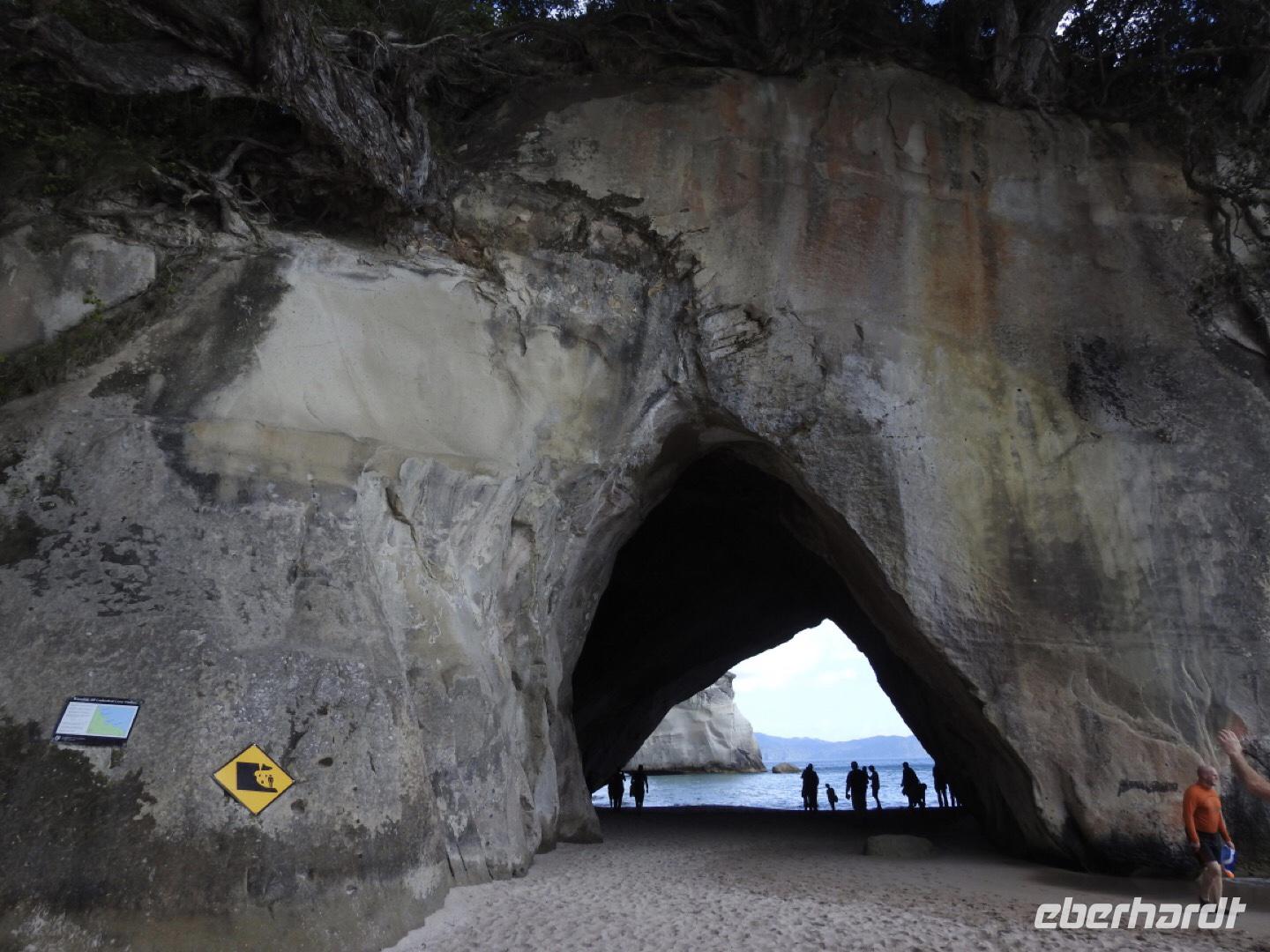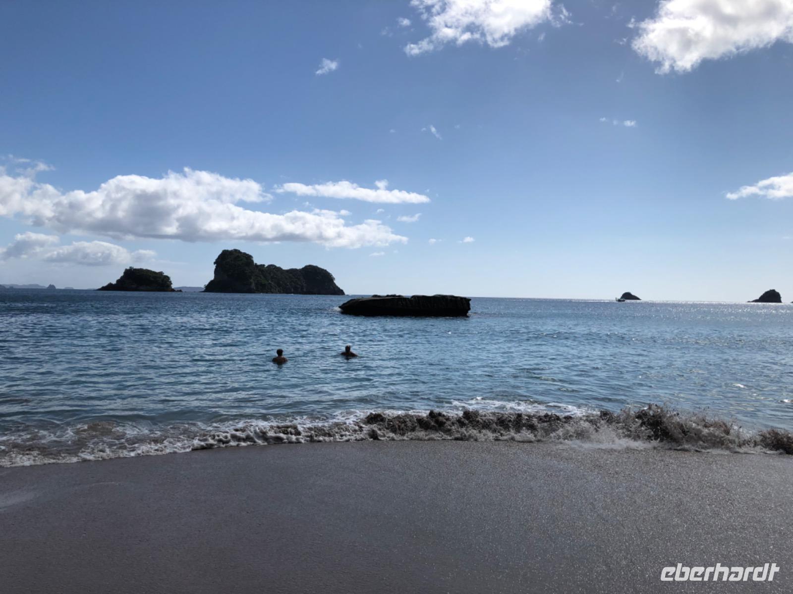 Am Vormittag unternehmen wir eine Wanderung zur Cathedrale Cove, welche eine bekannte Strandkulisse ist. Mit dem Fotografieren von neuseeländischen Vögeln unterwegs, benötigen wir eine knappe Stunde zu Fuß bis zur Bucht. Der Weg ist asphaltiert, es geht bergauf und bergab. Die Vegetation erinnert an Jurassic Park und es wäre nicht verwunderlich, wenn plötzlich ein Dinosaurier um die Ecke käme. Das Meer ist bewegt, trotzdem trauen sich einige von uns, ein Bad zu nehmen. Beeindruckend ist das natürlich entstandene riesengroße Loch im Felsen, das hier namensgebend war. Durch die Kathedrale kann man in eine andere einsame Bucht gelangen, mit etwas Glück sogar trockenen Fußes. Nachmittags fahren wir zum Hot Water Beach. Dylan, unser Busfahrer, hat Handtücher und Spaten geladen. Wir suchen uns ein Plätzchen am menschenleeren Strand. Mit den Spaten graben wir Löcher in den Sand bis wir auf heißes Wasser stoßen. Wenn man sich ganz flach hinlegt, kann man dann in der Pfütze baden.