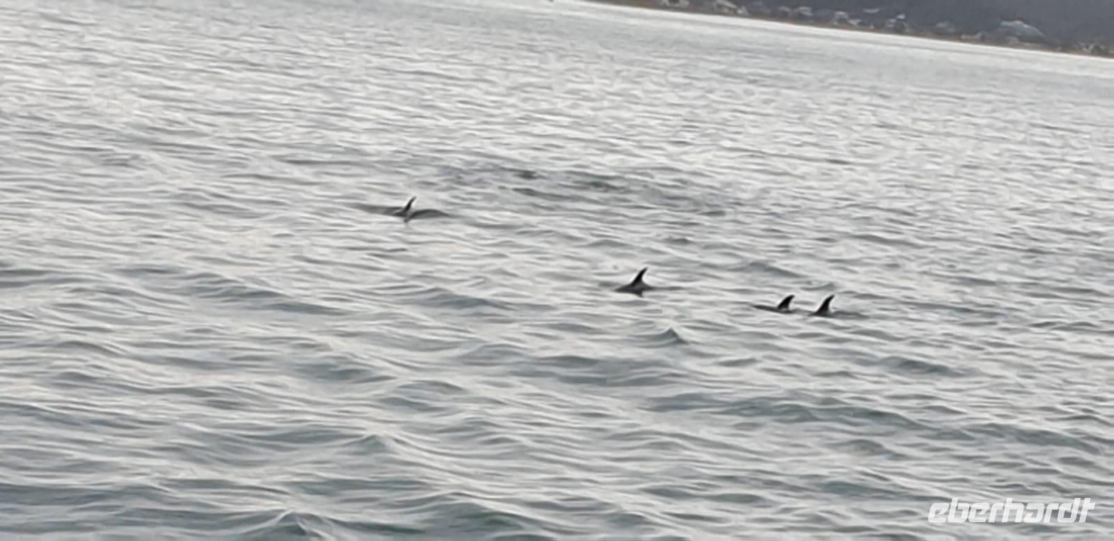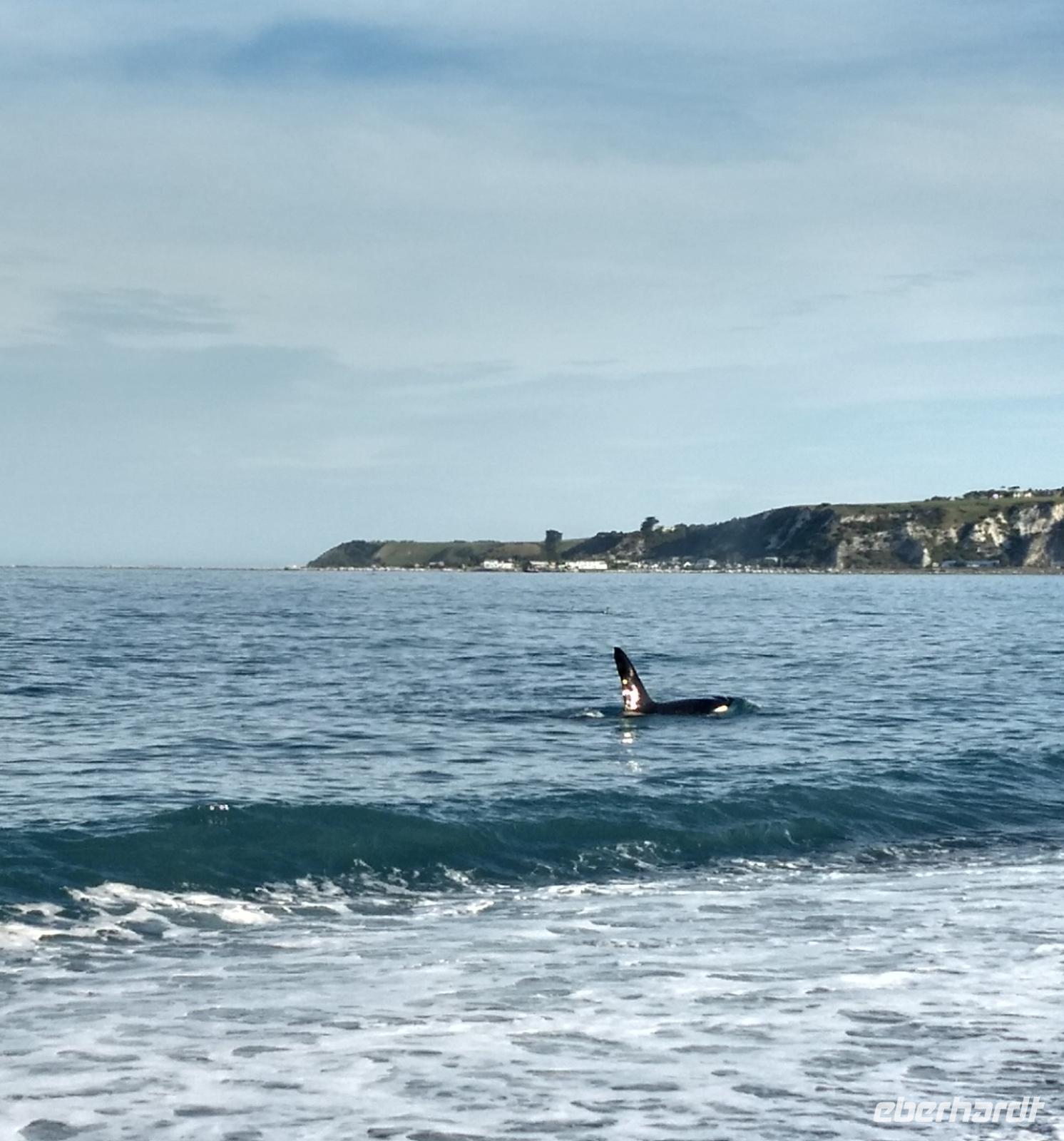 Irgendwann dreht Sam ab und fliegt zurück. Wir drehen noch eine Runde über Kaikoura, bevor er zur Landung ansetzt. Nun folgt noch ein Fotoshooting an der Maschine und alle sind glücklich. Der kleine Trupp fährt zurück ins Zentrum, um den anderen, größeren, Teil der Gruppe einzusammeln. Nun fahren wir zum Hotel. Die Zeit reicht aus, um noch vor dem Abendessen an den Strand zu gehen und die Aktiven, die das tun, werden mit Orcas und Delfinen belohnt.