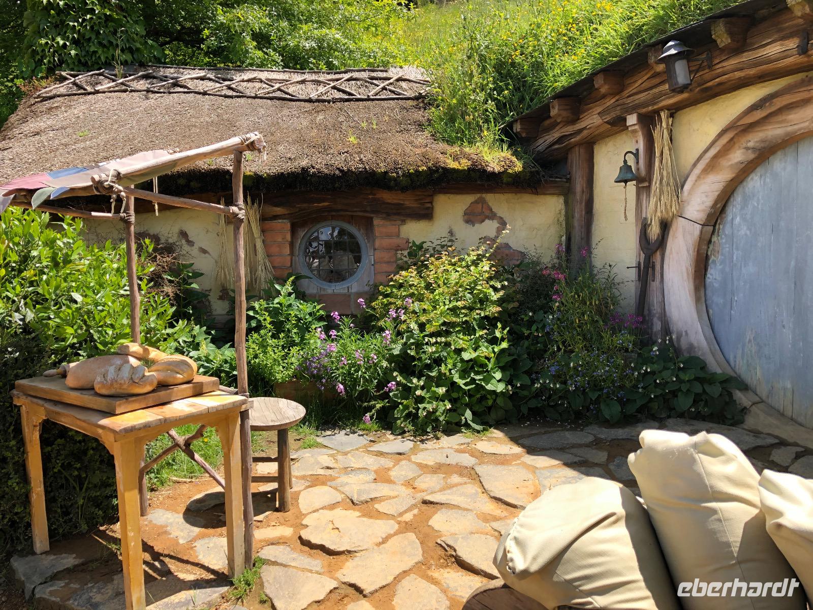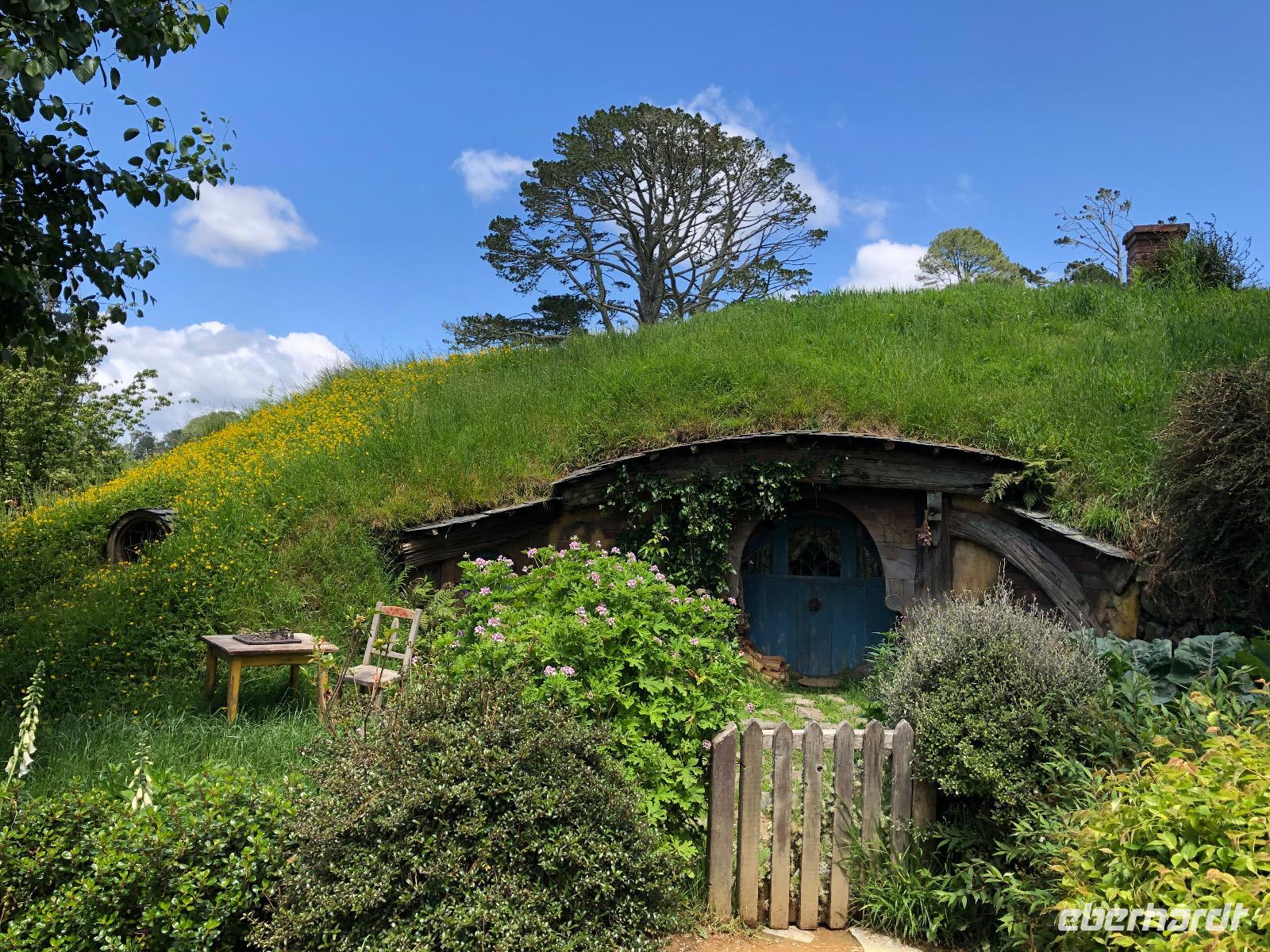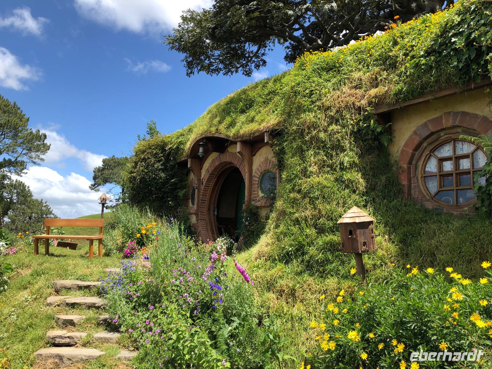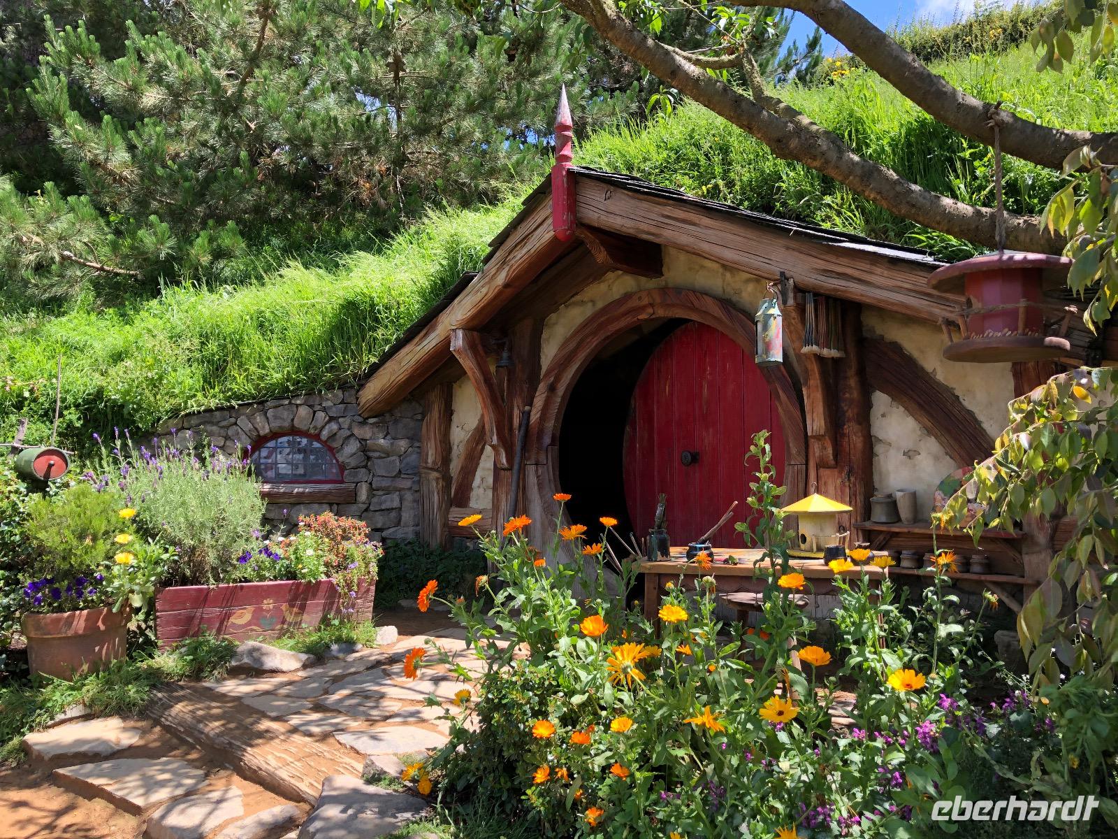 Ein Teil unserer Gruppe besucht heute Hobbiton, den Drehort vom Film HERR DER RINGE. Die Filmkulisse befindet sich auf einer ehemaligen Schaffarm inmitten von sanften grünen Hügeln, auf denen wollig weiße Schafe grasen. Besucher fühlen sich versetzt nach Mittelerde und spazieren entlang der Hobbithäuser, die grüne, rote oder gelbe kreisrunde Eingangstüren haben. Die Vorgärten sind lieblich gestaltet, in vielen Gärten hängt Hobbit-Wäsche auf der Leine. Der Himmel ist blau und die Sonne scheint, es ist wie im Märchenland. Die Führung endet im Green Dragon, wo wir auf ein eiskaltes Southfarthing Ingwerbier eingeladen sind.