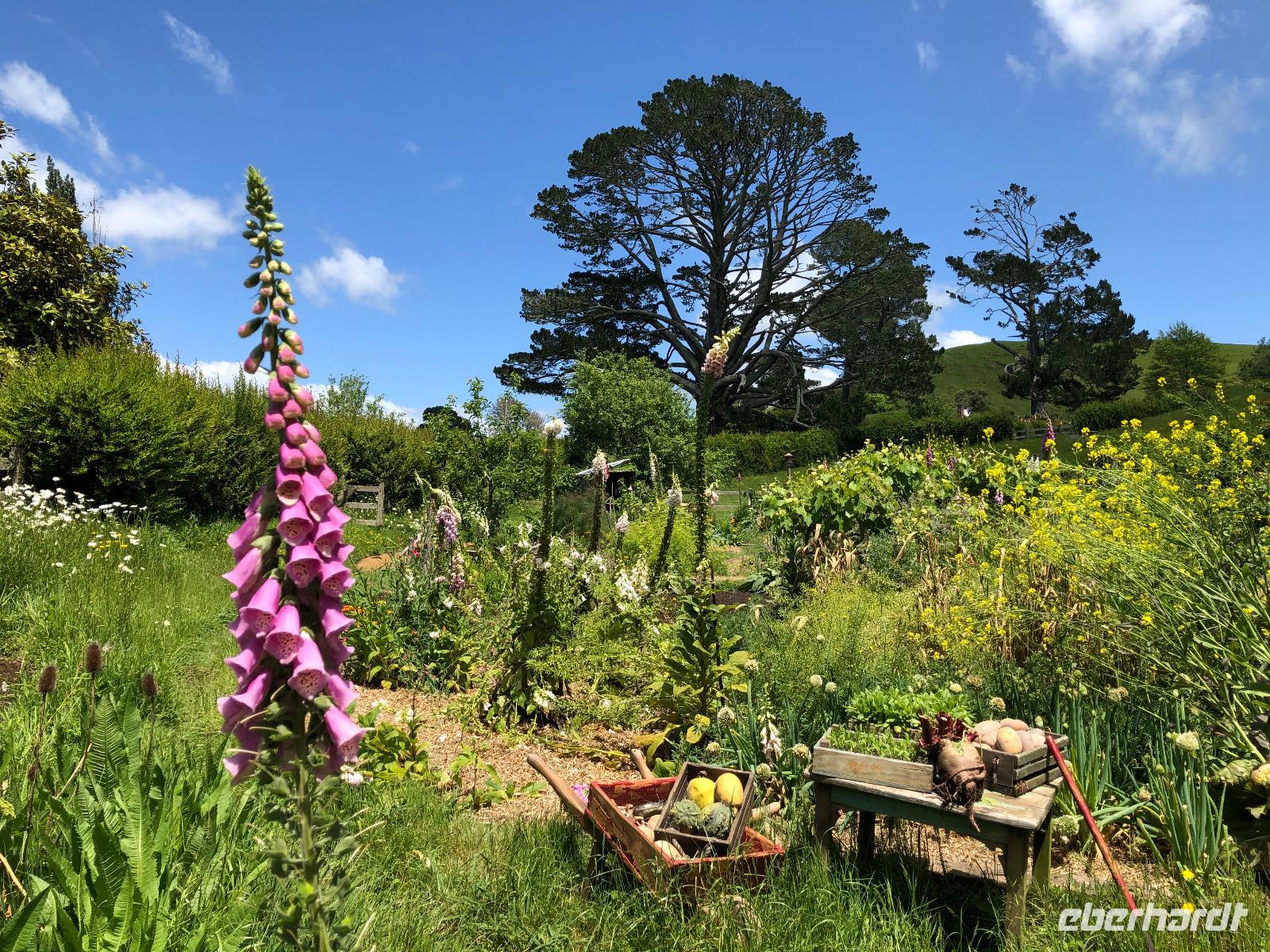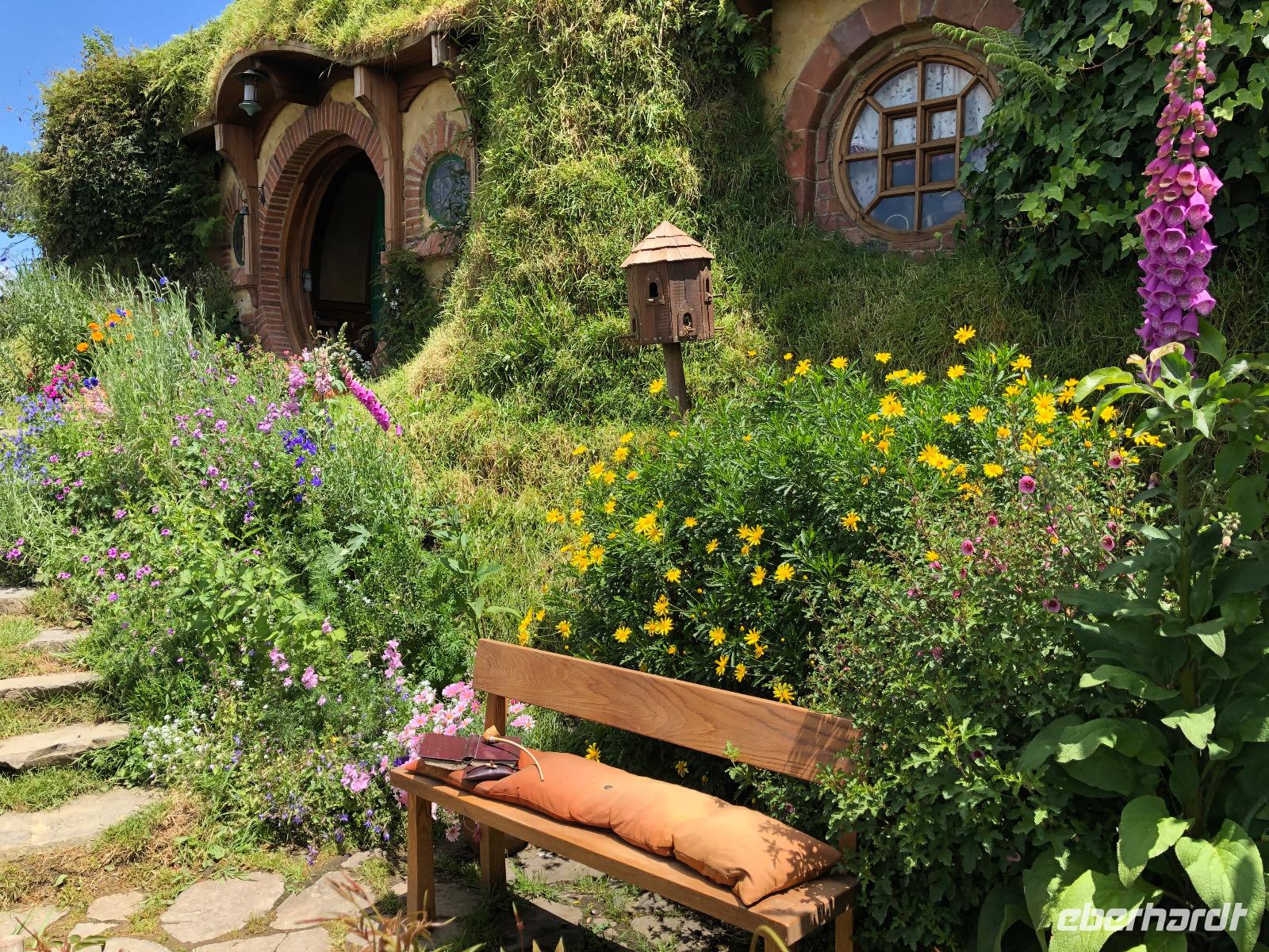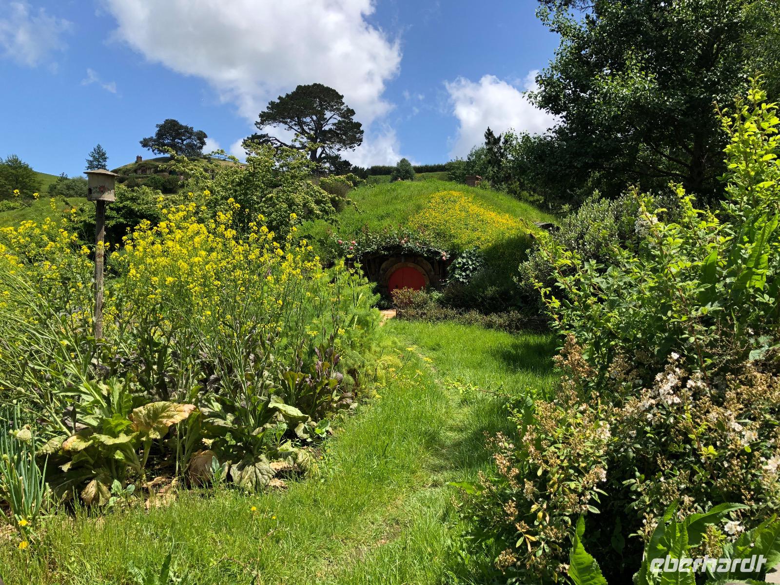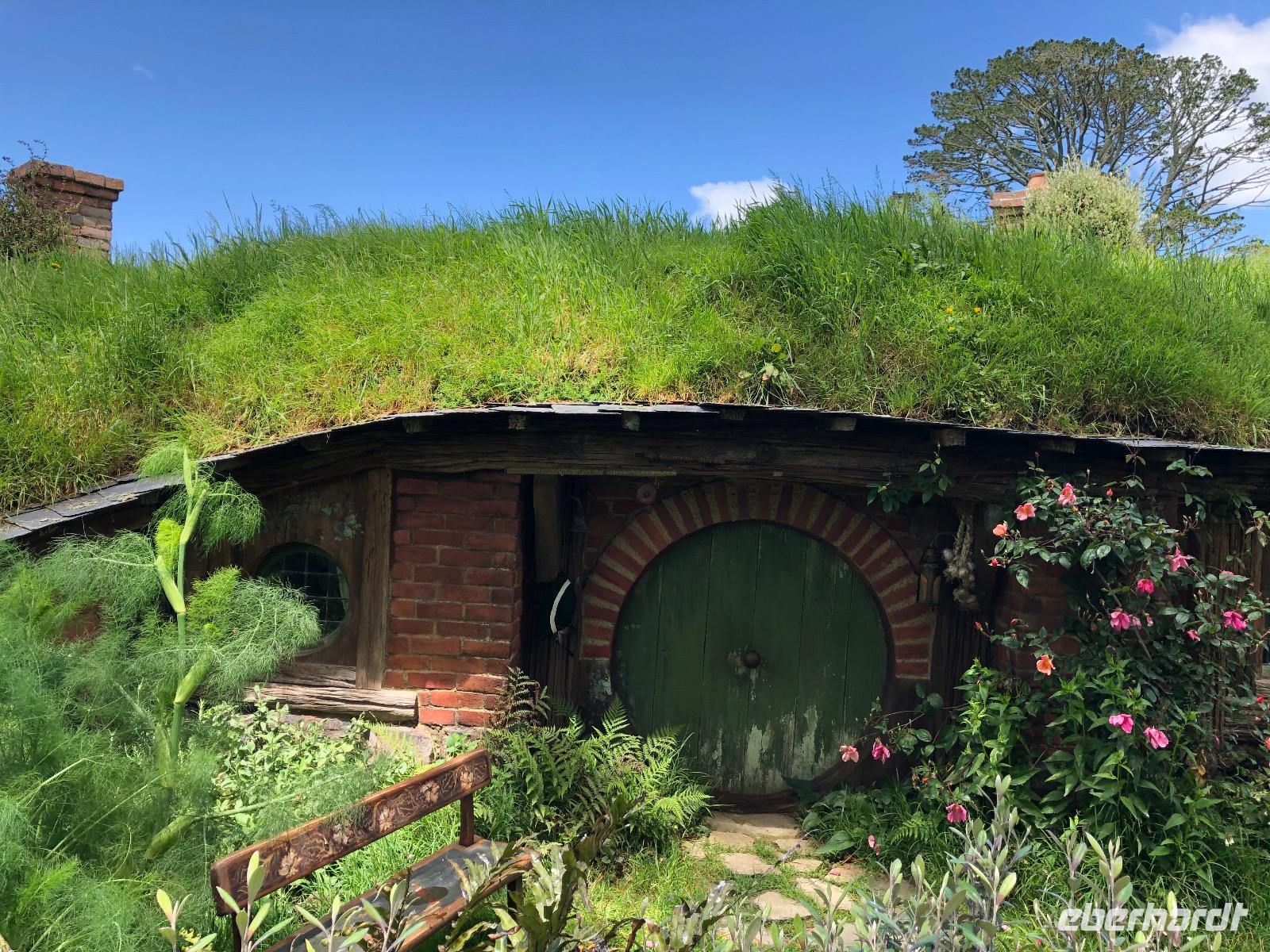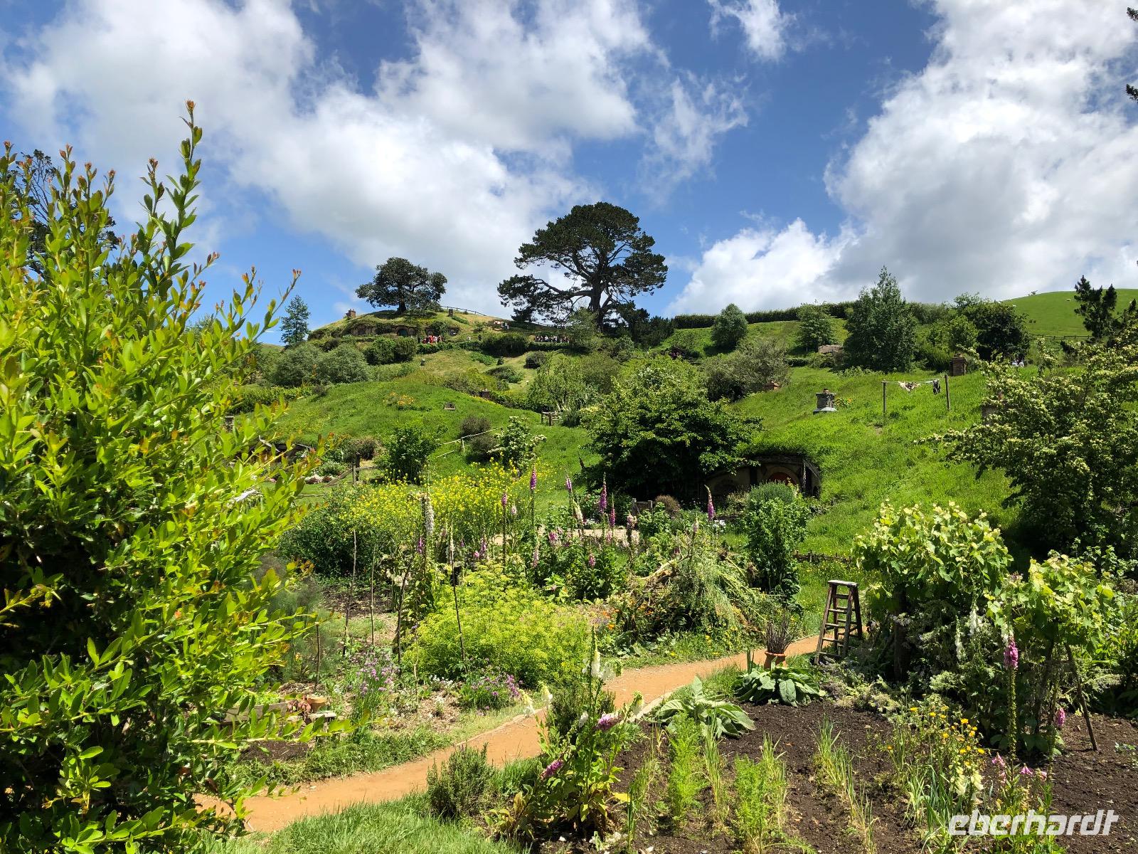 Ein Teil unserer Gruppe besucht heute Hobbiton, den Drehort vom Film HERR DER RINGE. Die Filmkulisse befindet sich auf einer ehemaligen Schaffarm inmitten von sanften grünen Hügeln, auf denen wollig weiße Schafe grasen. Besucher fühlen sich versetzt nach Mittelerde und spazieren entlang der Hobbithäuser, die grüne, rote oder gelbe kreisrunde Eingangstüren haben. Die Vorgärten sind lieblich gestaltet, in vielen Gärten hängt Hobbit-Wäsche auf der Leine. Der Himmel ist blau und die Sonne scheint, es ist wie im Märchenland. Die Führung endet im Green Dragon, wo wir auf ein eiskaltes Southfarthing Ingwerbier eingeladen sind.
