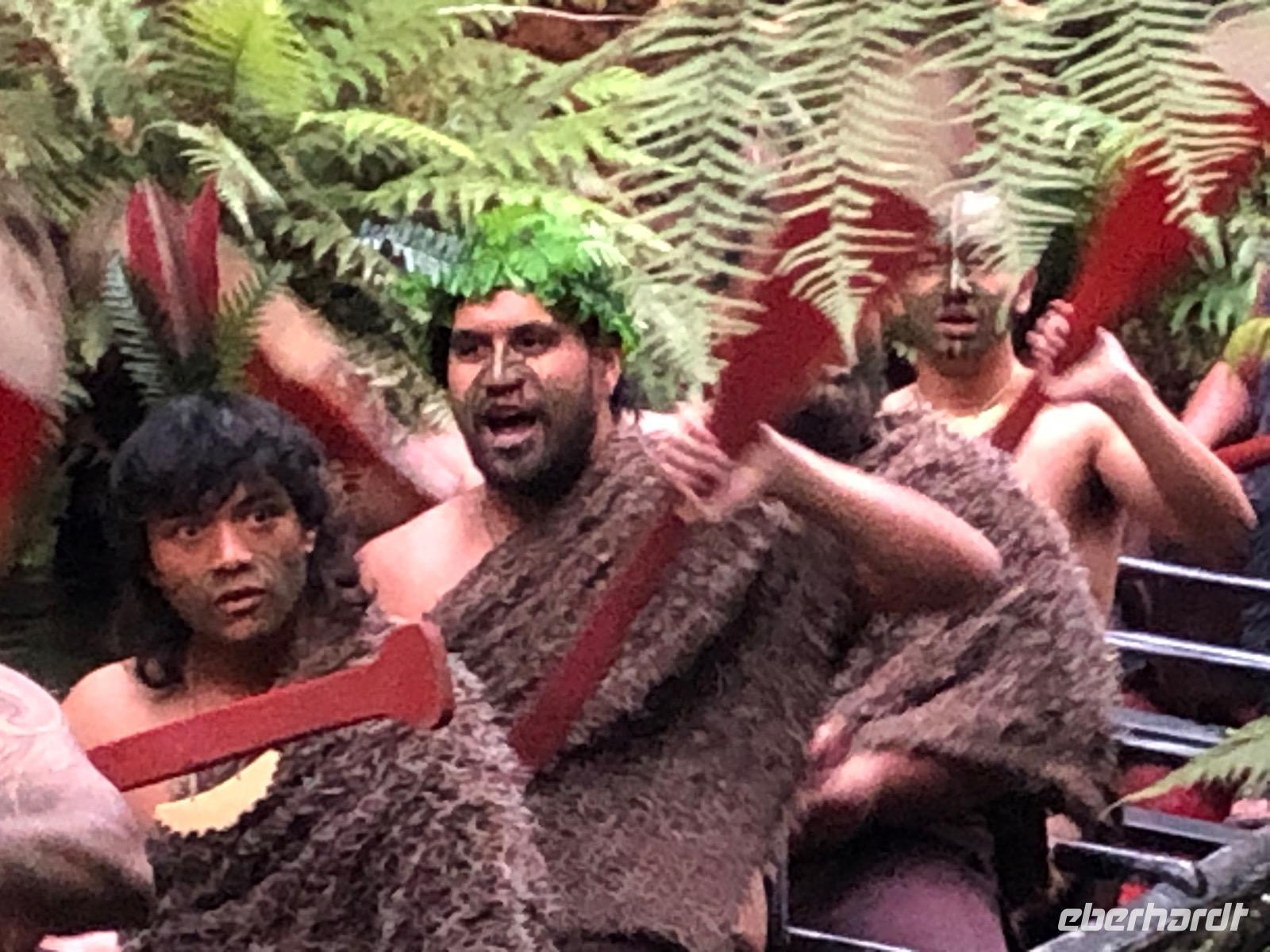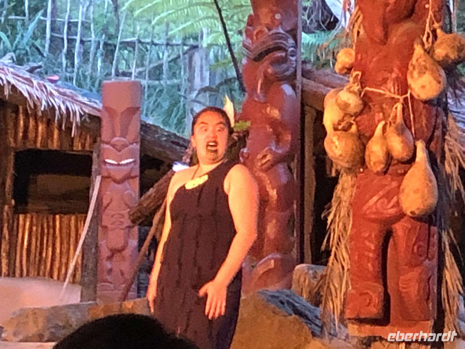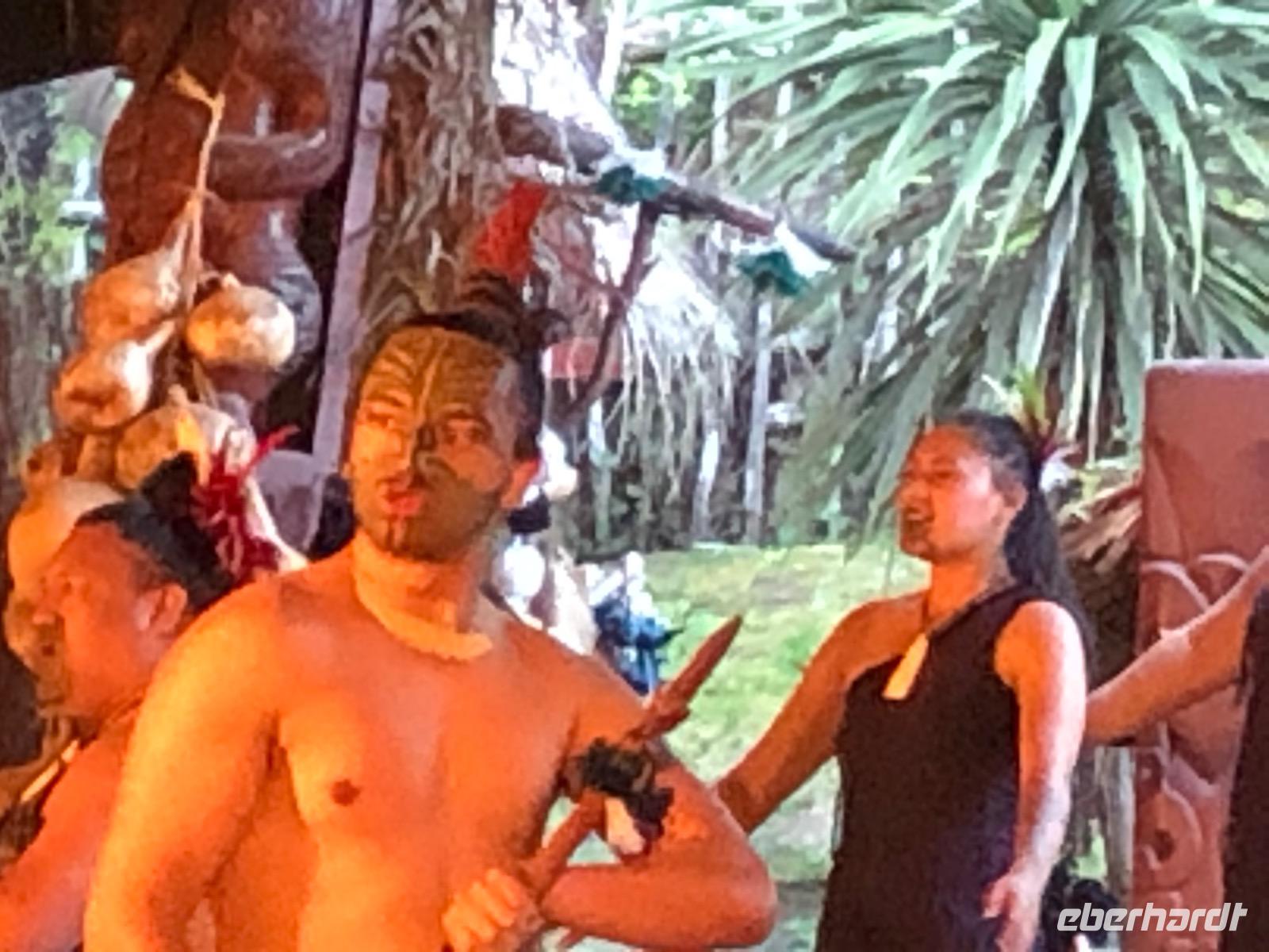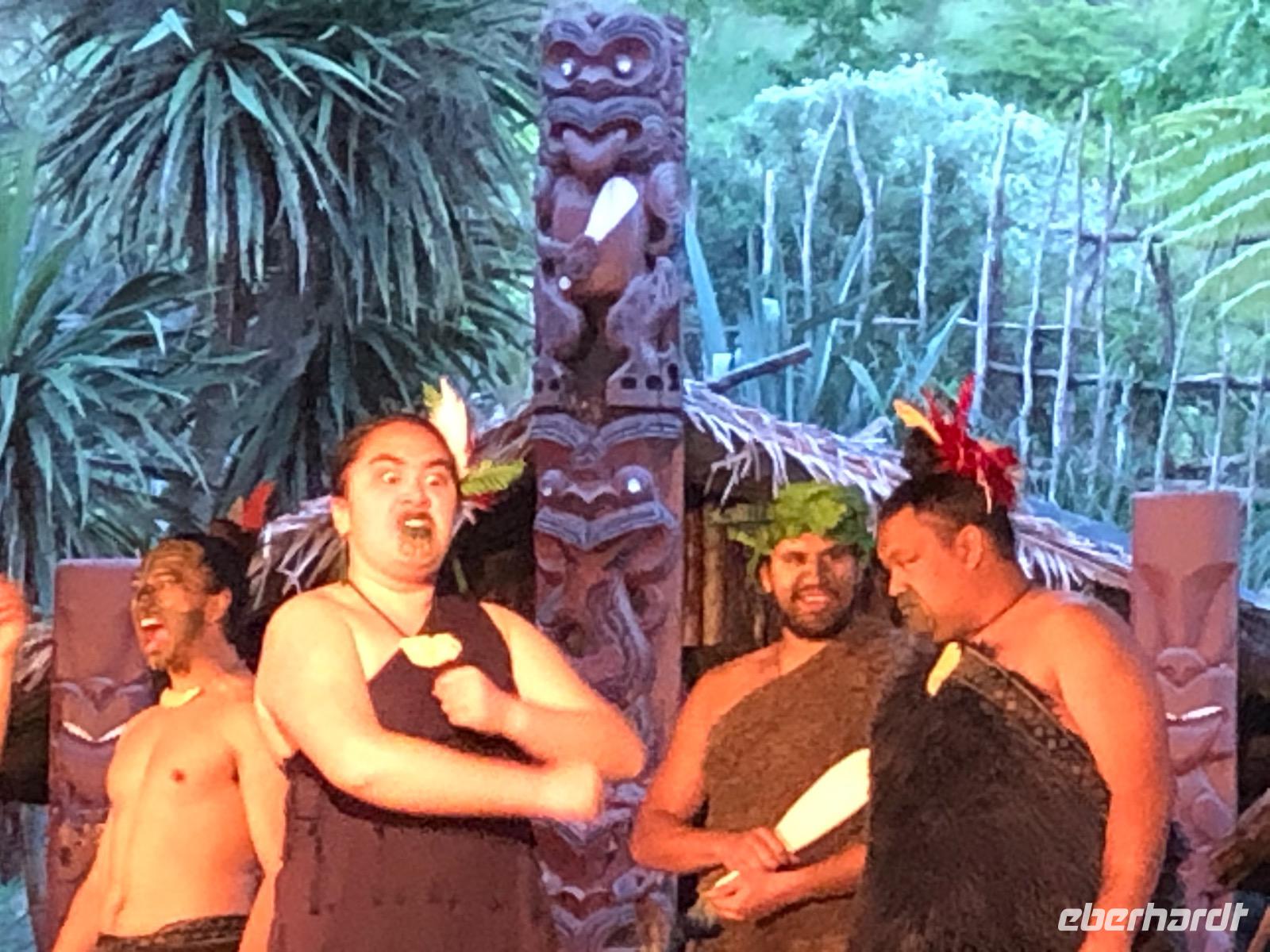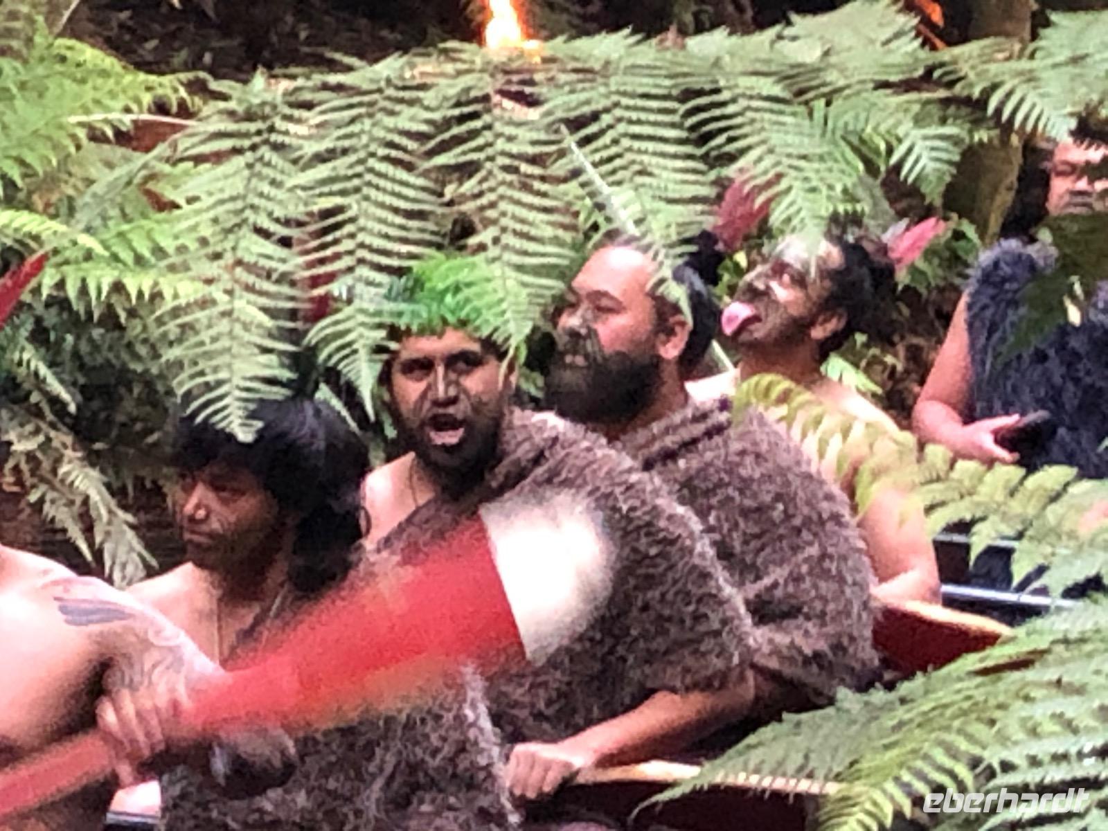 Heute besuchen wir eine Maoriveranstaltung mit anschließendem Hangi-Essen. Wir warten zusammen mit anderen Gästen vor dem Hotel auf unseren Transfer. Eine Gruppe nach der anderen wird abgeholt, die Fahrer sind Maoris, die wir später bei der Veranstaltung wieder sehen. Ein großer kräftiger Mann ist traditionell in ein Fell gekleidet und eine respektvolle Erscheinung. Unser Fahrer heißt John. Er ist nicht so spektakulär angezogen, nur mit einer Haifischzahnkette geschmückt. Wir werden freundlich empfangen und an zwei Tischen platziert. Später besichtigen wir den Erdofen, in dem unser Abendessen, das Hangi, gart. Am Flussufer kommt ein Kanu mit wilden Maoris an. Sie stoßen laute Kampfesrufe aus, wedeln bedrohlich mit den Paddeln, rollen mit den Augen und strecken die Zunge heraus. Dieses Minenspiel ist typisch und wiederholt sich später auf der Bühne. Die Vorstellung beginnt mit einem Ritual, wo der Häuptling Vertreter der Gäste nach Maori-Art empfängt. Während der Show, in der getanzt und gesungen wird, stellen die Maori auch verschiedene Waffen und Musikinstrumente vor. Die Frauen und Mädchen singen und lassen die Hüften kreisen, die Männer geben sich kämpferisch. Nach der Vorstellung beginnt das Hangi Essen. Es gibt Lamm und Huhn und verschiedene Kartoffelsorten. Nach dem Abendessen begeben wir uns mit John auf eine Glühwürmchen Wanderung. Und tatsächlich leuchten kleine grüne Punkte im Waldboden. Faszinierend.