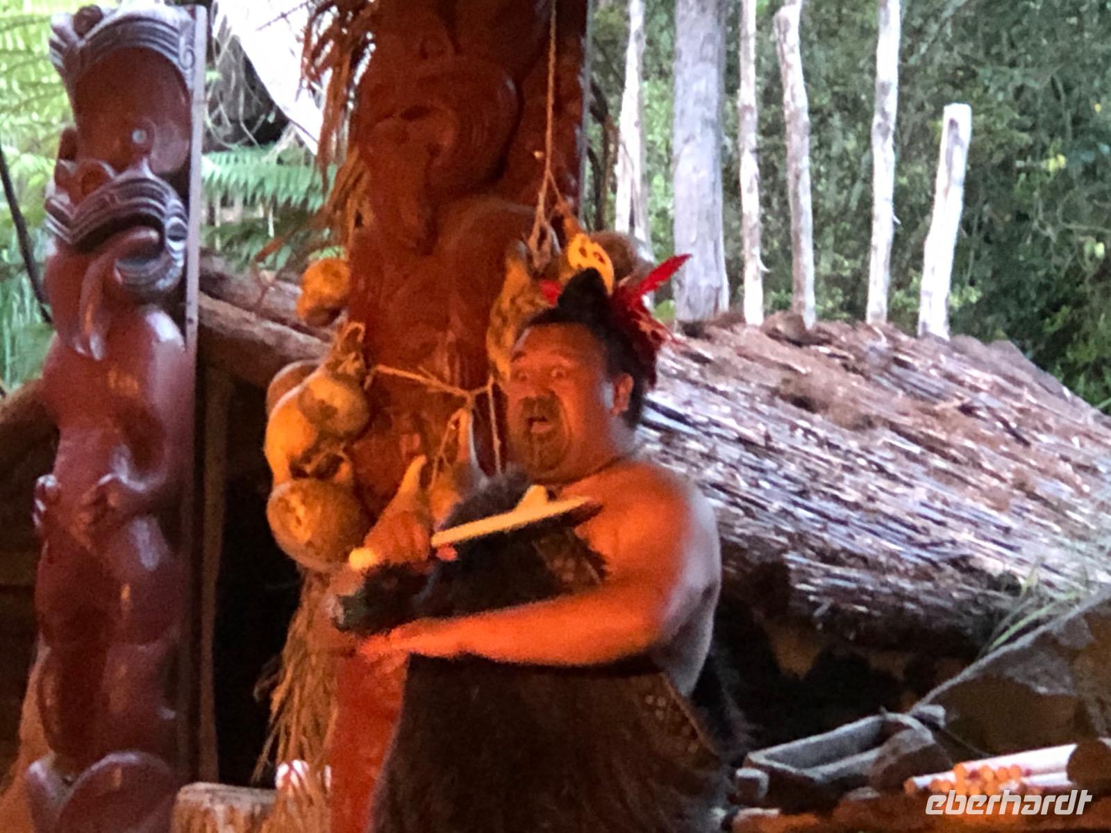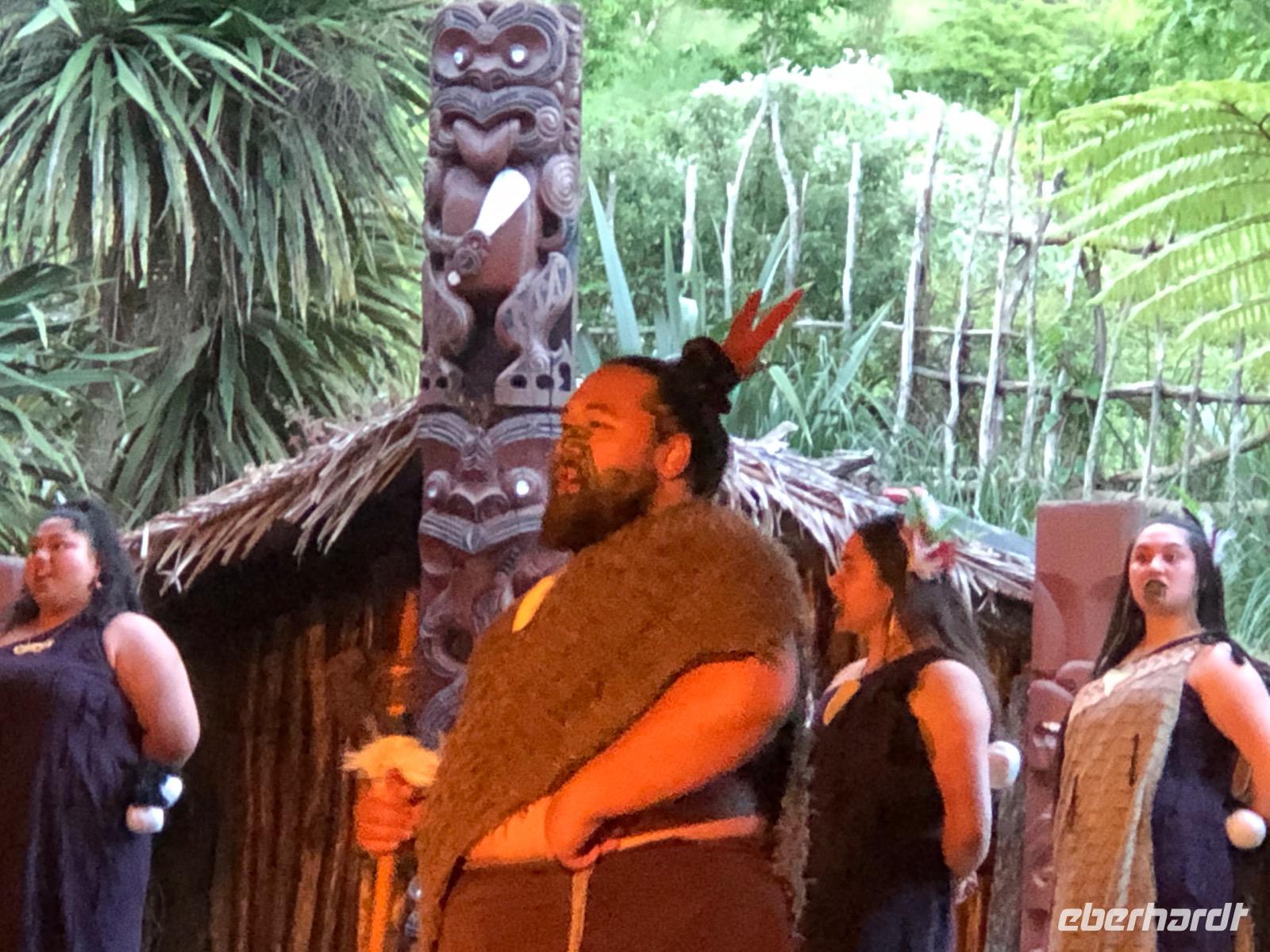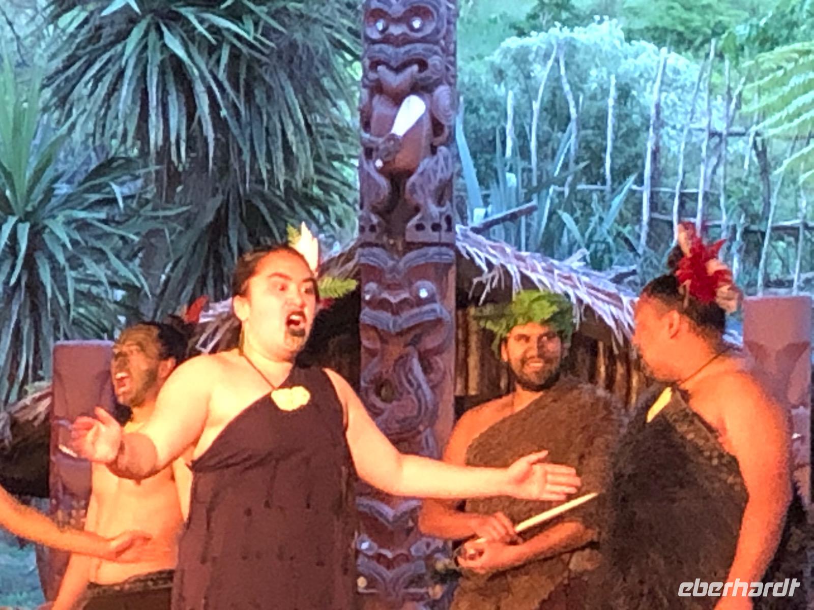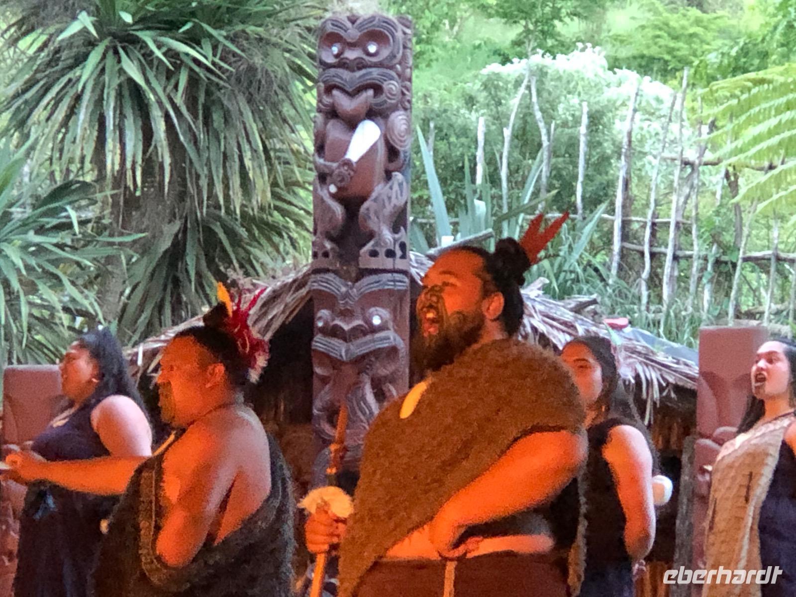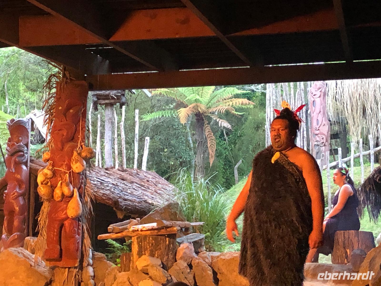 Heute besuchen wir eine Maoriveranstaltung mit anschließendem Hangi-Essen. Wir warten zusammen mit anderen Gästen vor dem Hotel auf unseren Transfer. Eine Gruppe nach der anderen wird abgeholt, die Fahrer sind Maoris, die wir später bei der Veranstaltung wieder sehen. Ein großer kräftiger Mann ist traditionell in ein Fell gekleidet und eine respektvolle Erscheinung. Unser Fahrer heißt John. Er ist nicht so spektakulär angezogen, nur mit einer Haifischzahnkette geschmückt. Wir werden freundlich empfangen und an zwei Tischen platziert. Später besichtigen wir den Erdofen, in dem unser Abendessen, das Hangi, gart. Am Flussufer kommt ein Kanu mit wilden Maoris an. Sie stoßen laute Kampfesrufe aus, wedeln bedrohlich mit den Paddeln, rollen mit den Augen und strecken die Zunge heraus. Dieses Minenspiel ist typisch und wiederholt sich später auf der Bühne. Die Vorstellung beginnt mit einem Ritual, wo der Häuptling Vertreter der Gäste nach Maori-Art empfängt. Während der Show, in der getanzt und gesungen wird, stellen die Maori auch verschiedene Waffen und Musikinstrumente vor. Die Frauen und Mädchen singen und lassen die Hüften kreisen, die Männer geben sich kämpferisch. Nach der Vorstellung beginnt das Hangi Essen. Es gibt Lamm und Huhn und verschiedene Kartoffelsorten. Nach dem Abendessen begeben wir uns mit John auf eine Glühwürmchen Wanderung. Und tatsächlich leuchten kleine grüne Punkte im Waldboden. Faszinierend.
