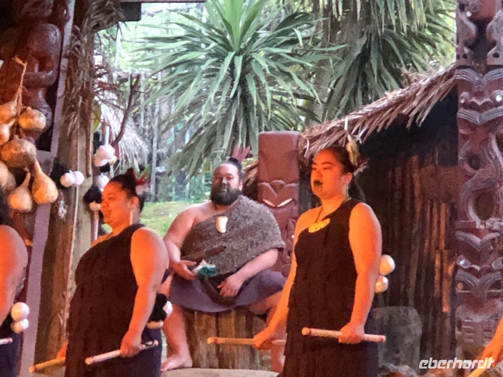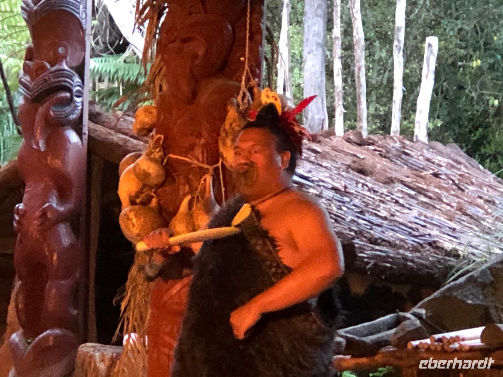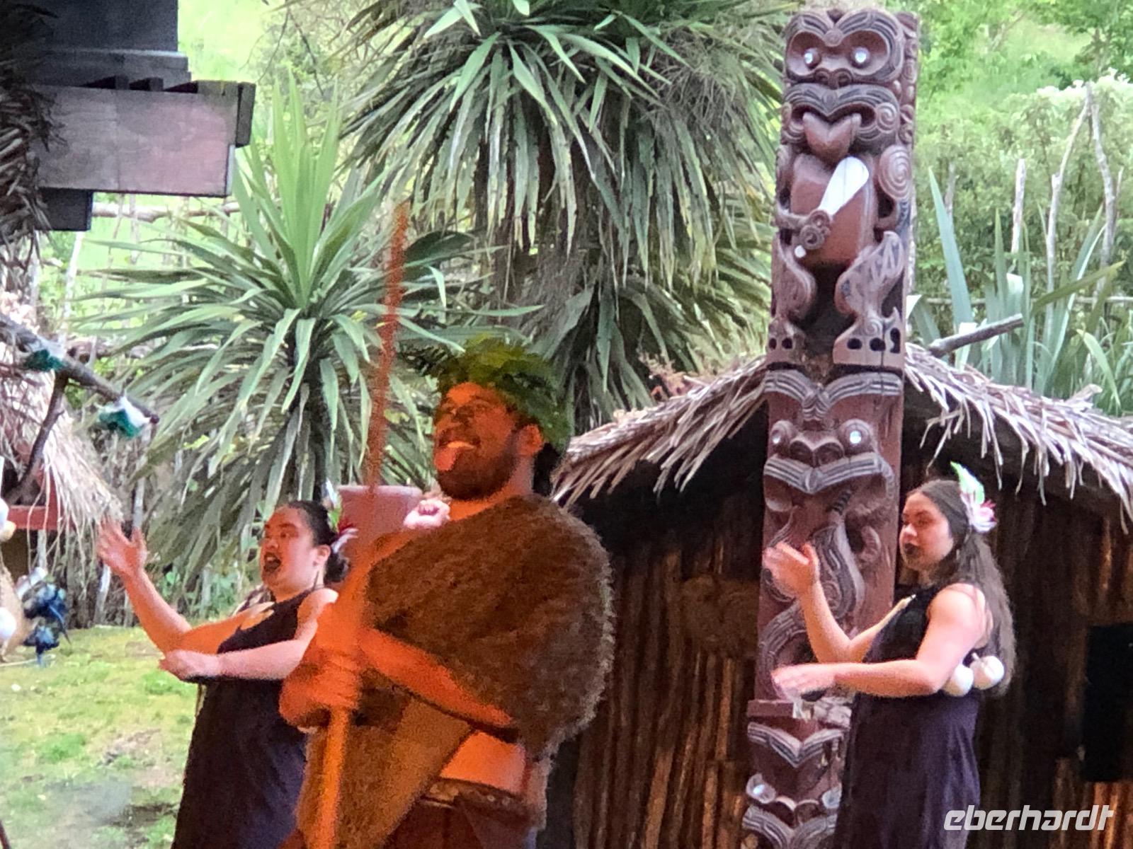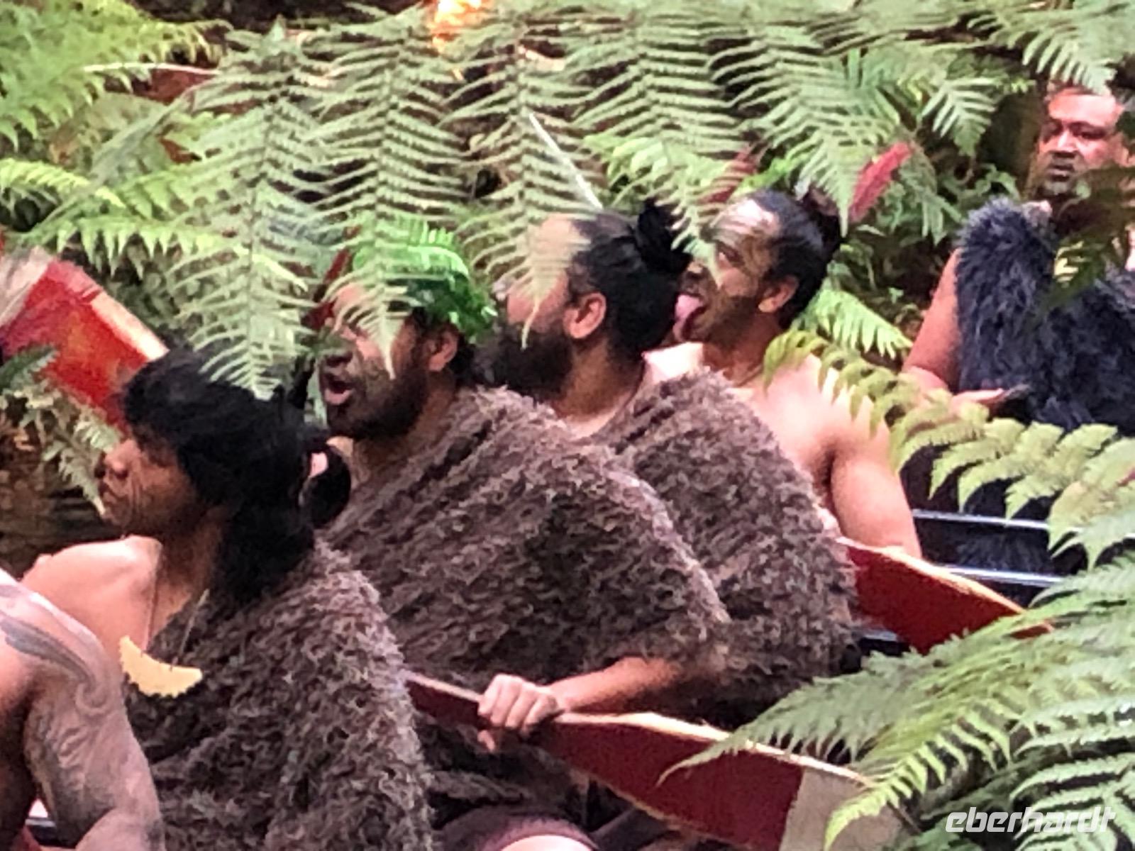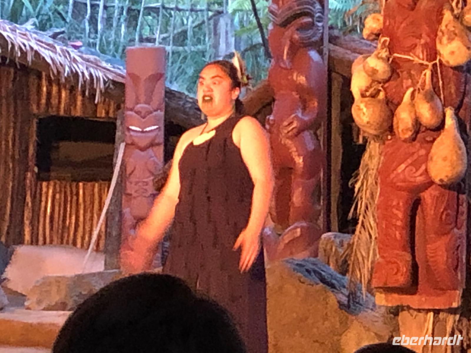 Heute besuchen wir eine Maoriveranstaltung mit anschließendem Hangi-Essen. Wir warten zusammen mit anderen Gästen vor dem Hotel auf unseren Transfer. Eine Gruppe nach der anderen wird abgeholt, die Fahrer sind Maoris, die wir später bei der Veranstaltung wieder sehen. Ein großer kräftiger Mann ist traditionell in ein Fell gekleidet und eine respektvolle Erscheinung. Unser Fahrer heißt John. Er ist nicht so spektakulär angezogen, nur mit einer Haifischzahnkette geschmückt. Wir werden freundlich empfangen und an zwei Tischen platziert. Später besichtigen wir den Erdofen, in dem unser Abendessen, das Hangi, gart. Am Flussufer kommt ein Kanu mit wilden Maoris an. Sie stoßen laute Kampfesrufe aus, wedeln bedrohlich mit den Paddeln, rollen mit den Augen und strecken die Zunge heraus. Dieses Minenspiel ist typisch und wiederholt sich später auf der Bühne. Die Vorstellung beginnt mit einem Ritual, wo der Häuptling Vertreter der Gäste nach Maori-Art empfängt. Während der Show, in der getanzt und gesungen wird, stellen die Maori auch verschiedene Waffen und Musikinstrumente vor. Die Frauen und Mädchen singen und lassen die Hüften kreisen, die Männer geben sich kämpferisch. Nach der Vorstellung beginnt das Hangi Essen. Es gibt Lamm und Huhn und verschiedene Kartoffelsorten. Nach dem Abendessen begeben wir uns mit John auf eine Glühwürmchen Wanderung. Und tatsächlich leuchten kleine grüne Punkte im Waldboden. Faszinierend.