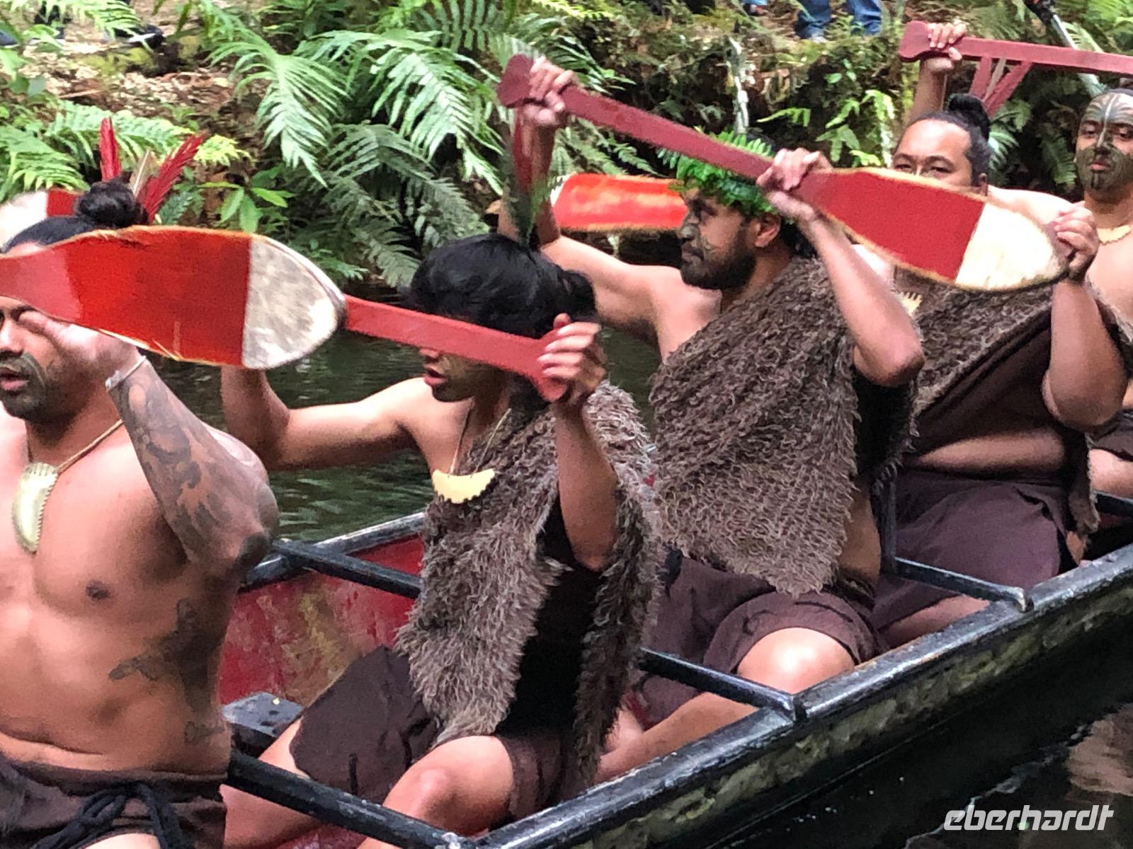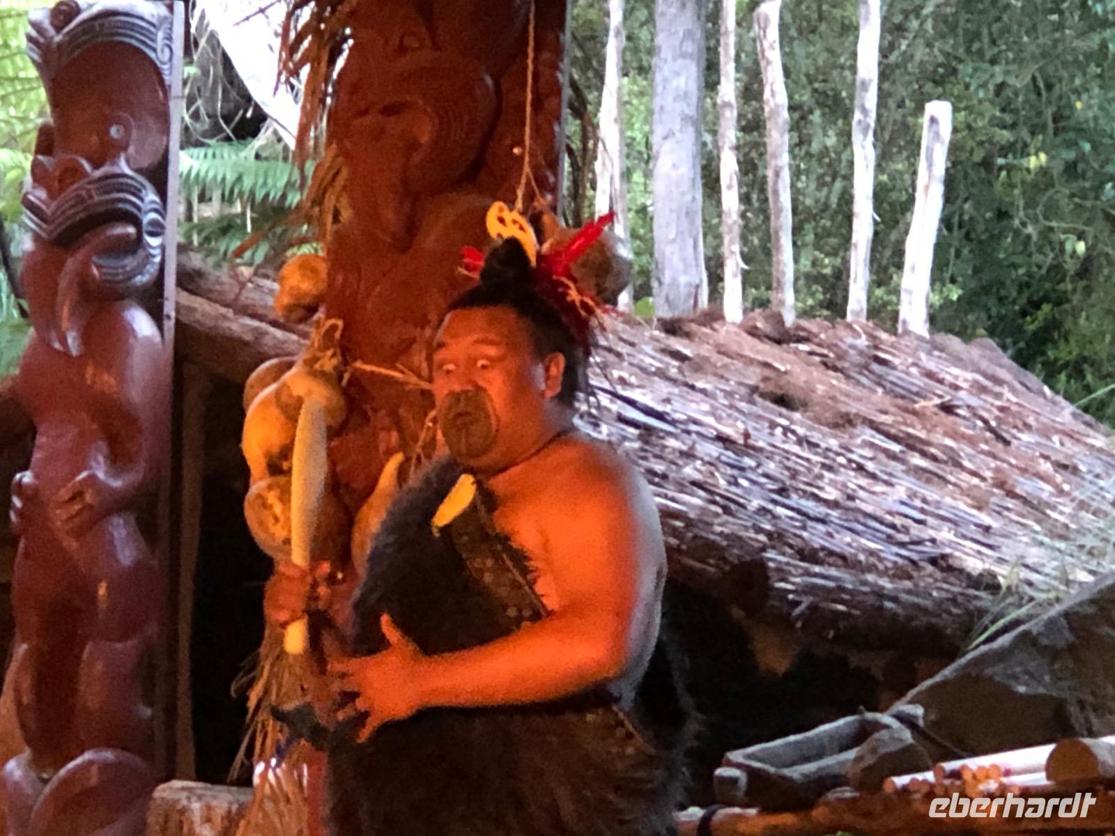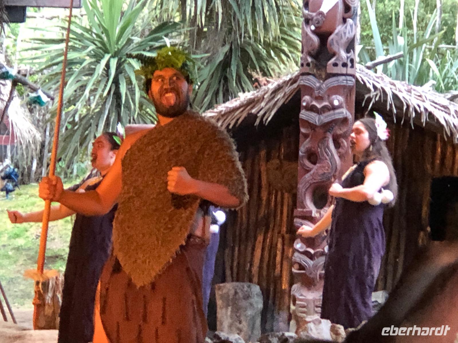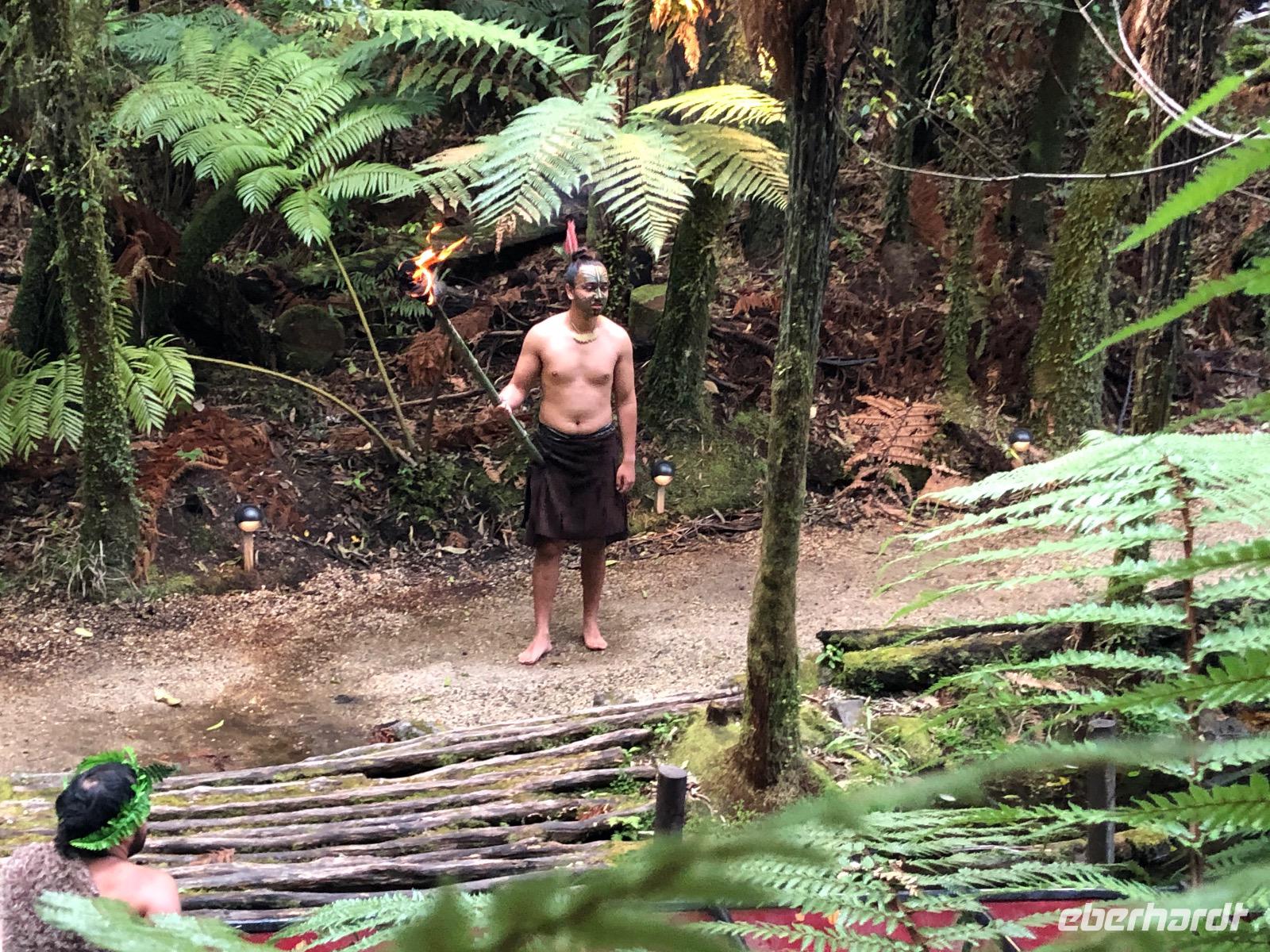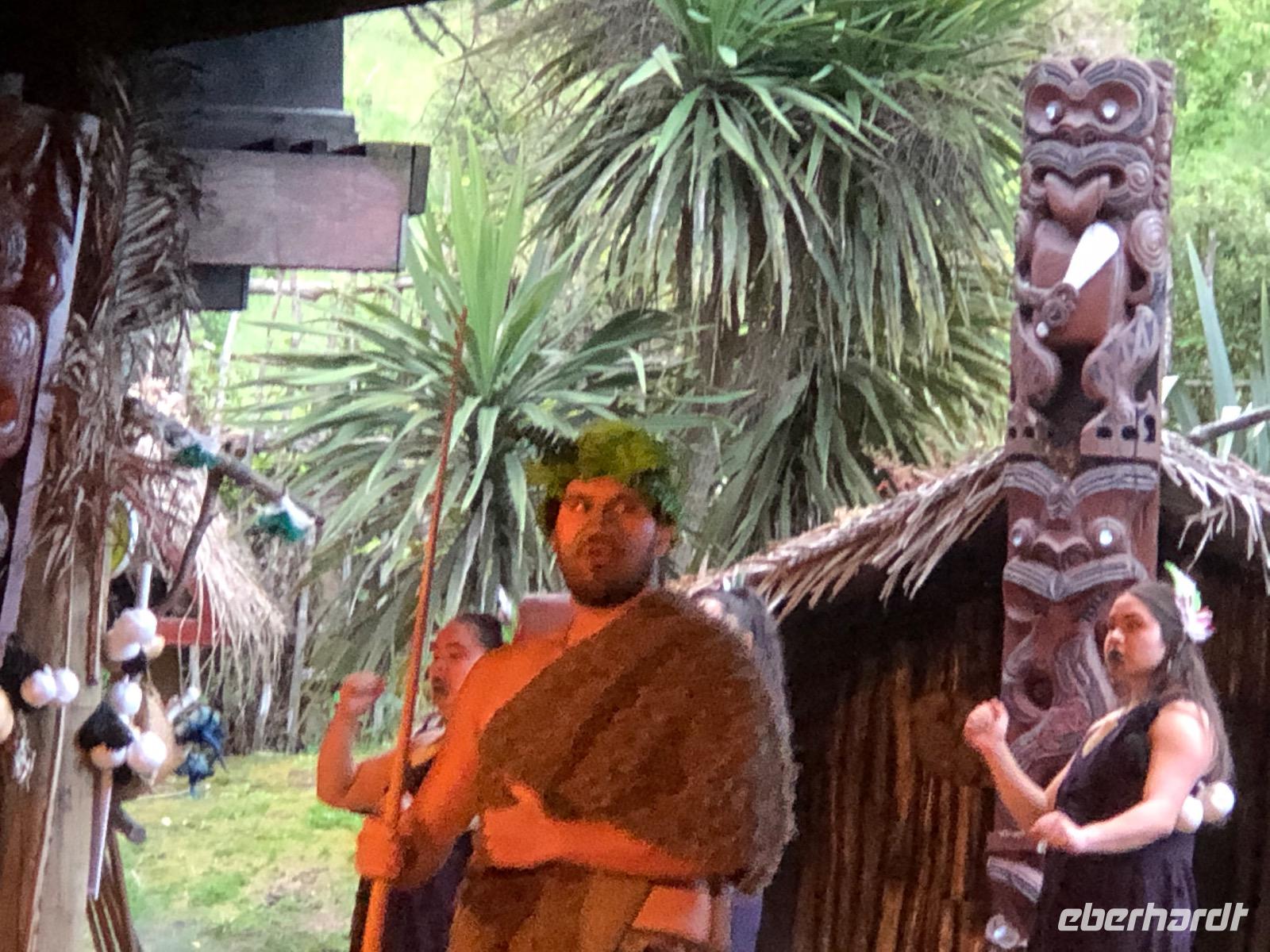 Heute besuchen wir eine Maoriveranstaltung mit anschließendem Hangi-Essen. Wir warten zusammen mit anderen Gästen vor dem Hotel auf unseren Transfer. Eine Gruppe nach der anderen wird abgeholt, die Fahrer sind Maoris, die wir später bei der Veranstaltung wieder sehen. Ein großer kräftiger Mann ist traditionell in ein Fell gekleidet und eine respektvolle Erscheinung. Unser Fahrer heißt John. Er ist nicht so spektakulär angezogen, nur mit einer Haifischzahnkette geschmückt. Wir werden freundlich empfangen und an zwei Tischen platziert. Später besichtigen wir den Erdofen, in dem unser Abendessen, das Hangi, gart. Am Flussufer kommt ein Kanu mit wilden Maoris an. Sie stoßen laute Kampfesrufe aus, wedeln bedrohlich mit den Paddeln, rollen mit den Augen und strecken die Zunge heraus. Dieses Minenspiel ist typisch und wiederholt sich später auf der Bühne. Die Vorstellung beginnt mit einem Ritual, wo der Häuptling Vertreter der Gäste nach Maori-Art empfängt. Während der Show, in der getanzt und gesungen wird, stellen die Maori auch verschiedene Waffen und Musikinstrumente vor. Die Frauen und Mädchen singen und lassen die Hüften kreisen, die Männer geben sich kämpferisch. Nach der Vorstellung beginnt das Hangi Essen. Es gibt Lamm und Huhn und verschiedene Kartoffelsorten. Nach dem Abendessen begeben wir uns mit John auf eine Glühwürmchen Wanderung. Und tatsächlich leuchten kleine grüne Punkte im Waldboden. Faszinierend.