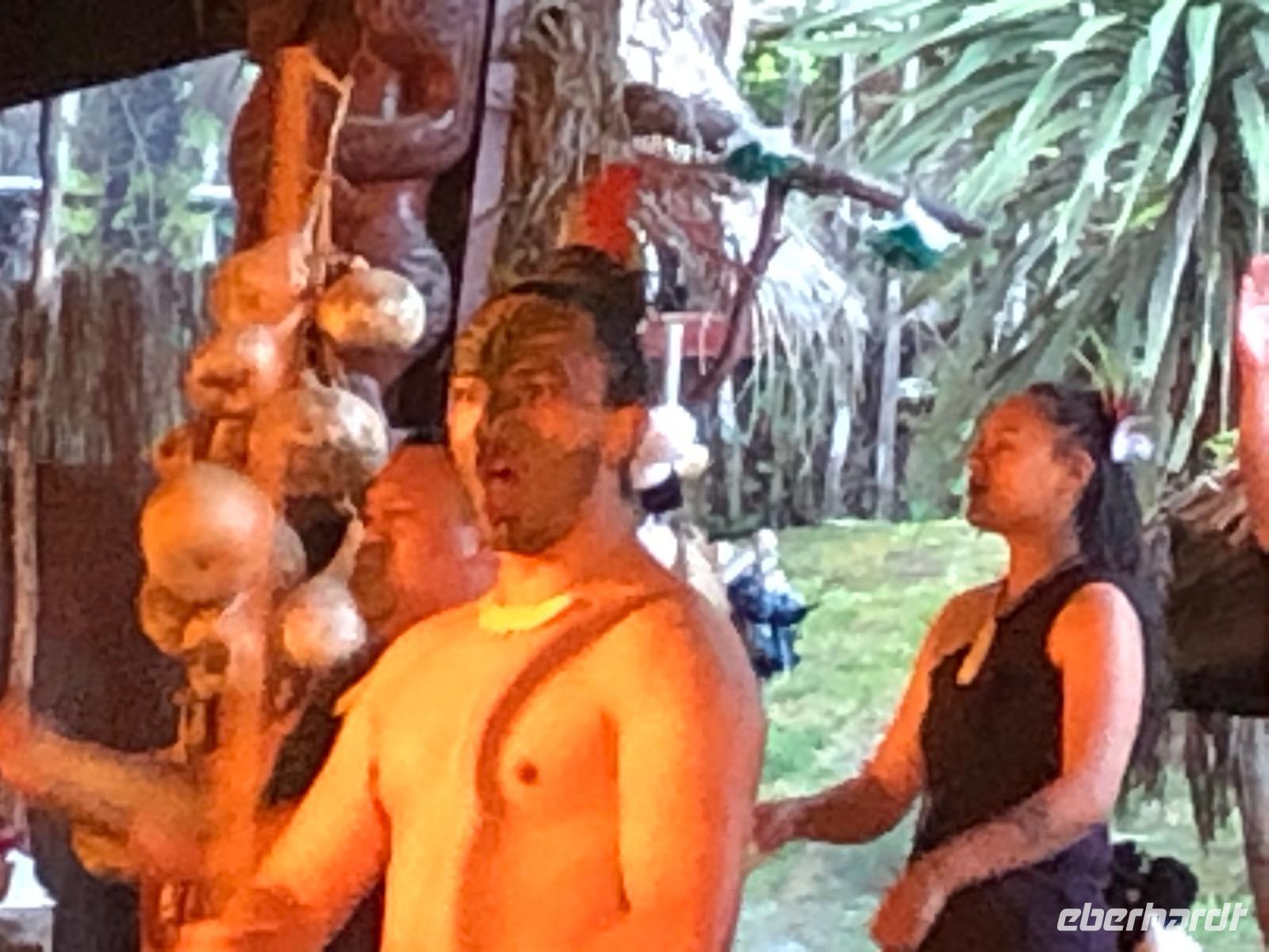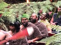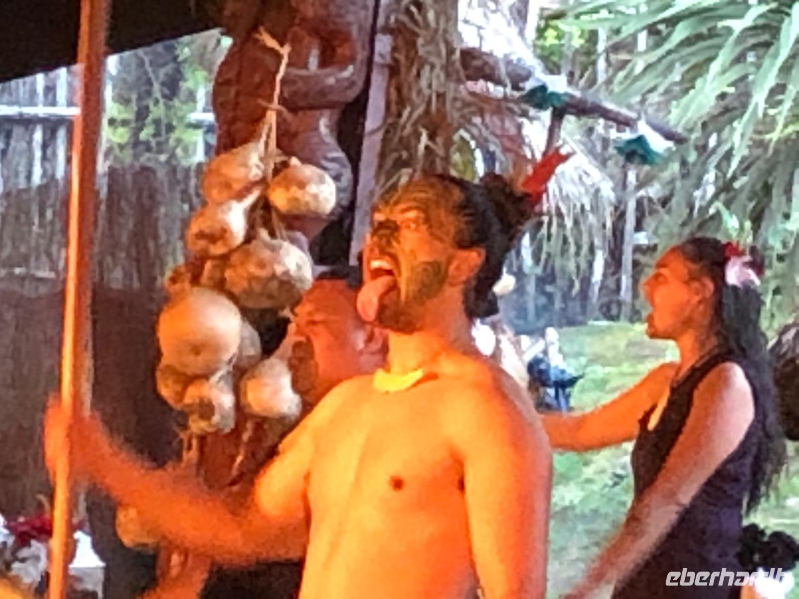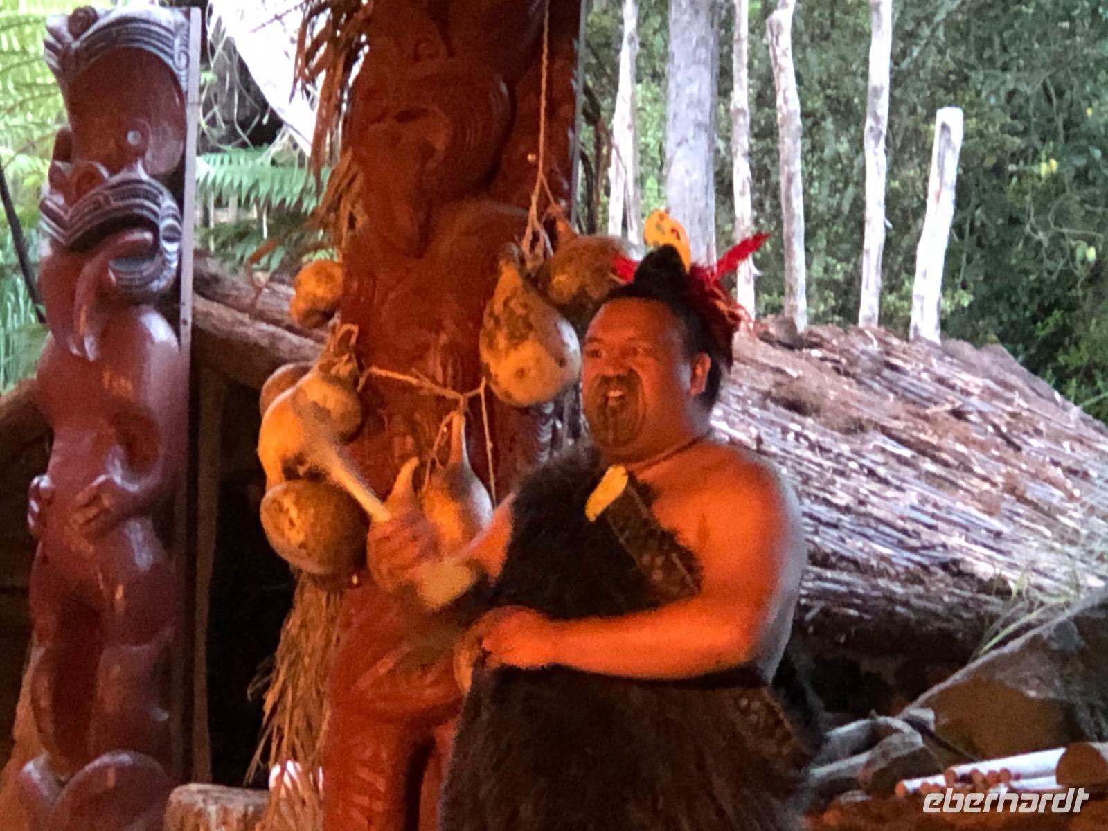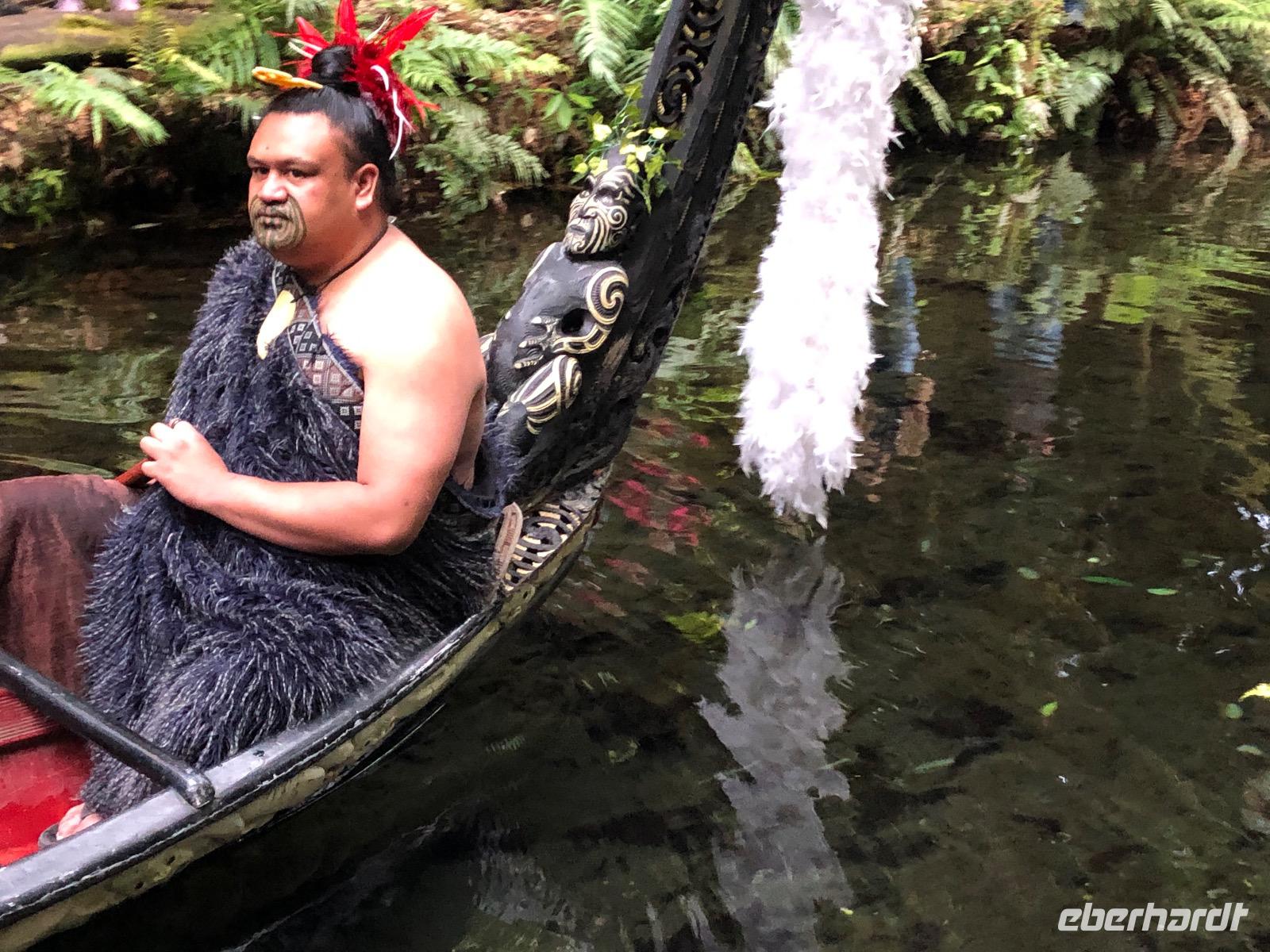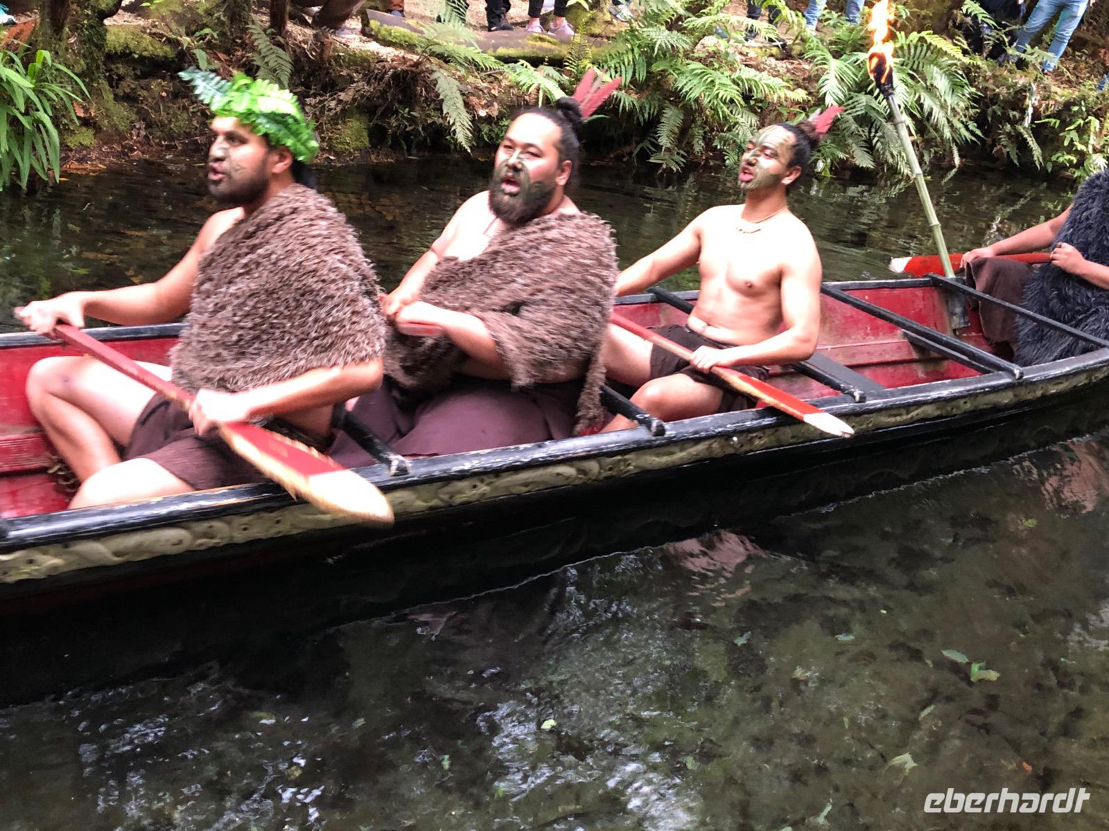 Heute besuchen wir eine Maoriveranstaltung mit anschließendem Hangi-Essen. Wir warten zusammen mit anderen Gästen vor dem Hotel auf unseren Transfer. Eine Gruppe nach der anderen wird abgeholt, die Fahrer sind Maoris, die wir später bei der Veranstaltung wieder sehen. Ein großer kräftiger Mann ist traditionell in ein Fell gekleidet und eine respektvolle Erscheinung. Unser Fahrer heißt John. Er ist nicht so spektakulär angezogen, nur mit einer Haifischzahnkette geschmückt. Wir werden freundlich empfangen und an zwei Tischen platziert. Später besichtigen wir den Erdofen, in dem unser Abendessen, das Hangi, gart. Am Flussufer kommt ein Kanu mit wilden Maoris an. Sie stoßen laute Kampfesrufe aus, wedeln bedrohlich mit den Paddeln, rollen mit den Augen und strecken die Zunge heraus. Dieses Minenspiel ist typisch und wiederholt sich später auf der Bühne. Die Vorstellung beginnt mit einem Ritual, wo der Häuptling Vertreter der Gäste nach Maori-Art empfängt. Während der Show, in der getanzt und gesungen wird, stellen die Maori auch verschiedene Waffen und Musikinstrumente vor. Die Frauen und Mädchen singen und lassen die Hüften kreisen, die Männer geben sich kämpferisch. Nach der Vorstellung beginnt das Hangi Essen. Es gibt Lamm und Huhn und verschiedene Kartoffelsorten. Nach dem Abendessen begeben wir uns mit John auf eine Glühwürmchen Wanderung. Und tatsächlich leuchten kleine grüne Punkte im Waldboden. Faszinierend.