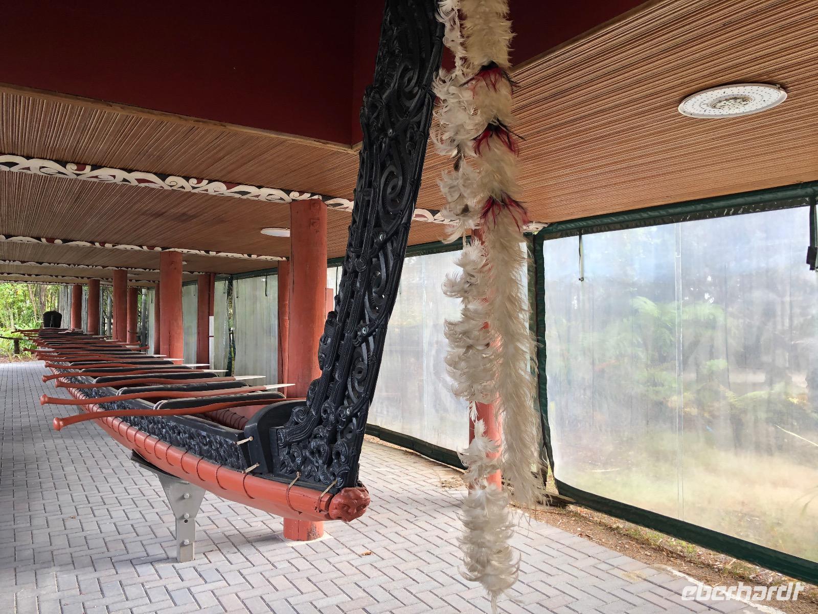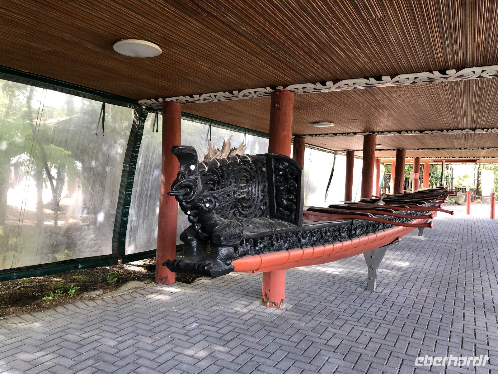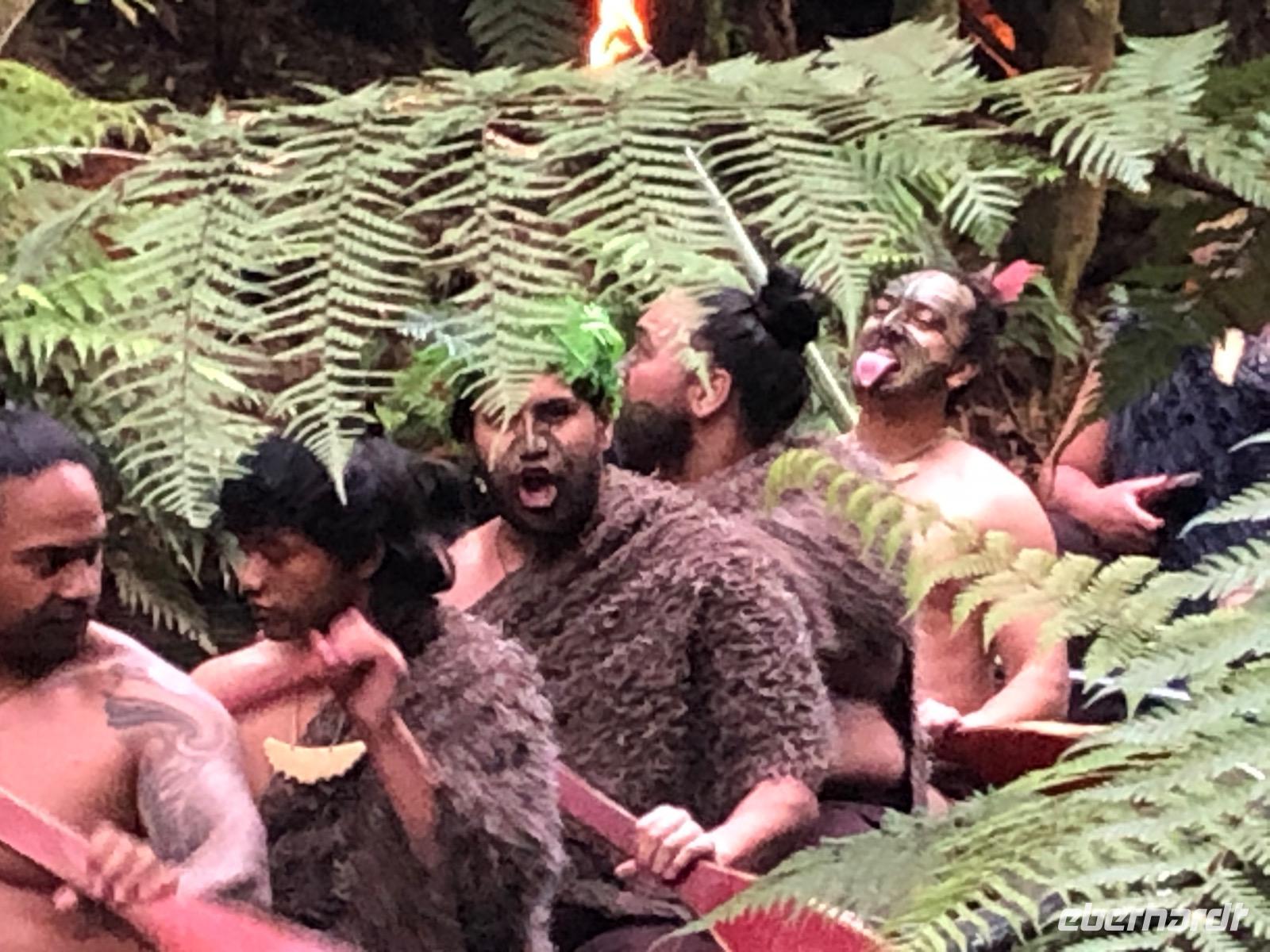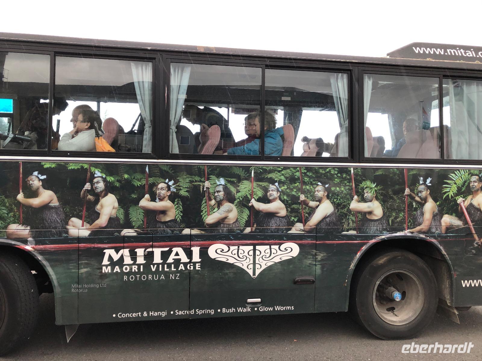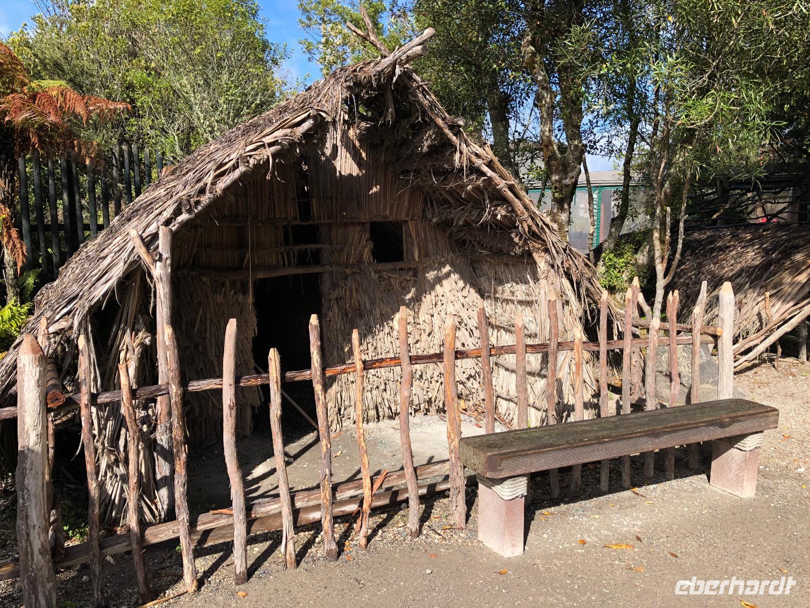Heute besuchen wir eine Maoriveranstaltung mit anschließendem Hangi-Essen. Wir warten zusammen mit anderen Gästen vor dem Hotel auf unseren Transfer. Eine Gruppe nach der anderen wird abgeholt, die Fahrer sind Maoris, die wir später bei der Veranstaltung wieder sehen. Ein großer kräftiger Mann ist traditionell in ein Fell gekleidet und eine respektvolle Erscheinung. Unser Fahrer heißt John. Er ist nicht so spektakulär angezogen, nur mit einer Haifischzahnkette geschmückt. Wir werden freundlich empfangen und an zwei Tischen platziert. Später besichtigen wir den Erdofen, in dem unser Abendessen, das Hangi, gart. Am Flussufer kommt ein Kanu mit wilden Maoris an. Sie stoßen laute Kampfesrufe aus, wedeln bedrohlich mit den Paddeln, rollen mit den Augen und strecken die Zunge heraus. Dieses Minenspiel ist typisch und wiederholt sich später auf der Bühne. Die Vorstellung beginnt mit einem Ritual, wo der Häuptling Vertreter der Gäste nach Maori-Art empfängt. Während der Show, in der getanzt und gesungen wird, stellen die Maori auch verschiedene Waffen und Musikinstrumente vor. Die Frauen und Mädchen singen und lassen die Hüften kreisen, die Männer geben sich kämpferisch. Nach der Vorstellung beginnt das Hangi Essen. Es gibt Lamm und Huhn und verschiedene Kartoffelsorten. Nach dem Abendessen begeben wir uns mit John auf eine Glühwürmchen Wanderung. Und tatsächlich leuchten kleine grüne Punkte im Waldboden. Faszinierend.