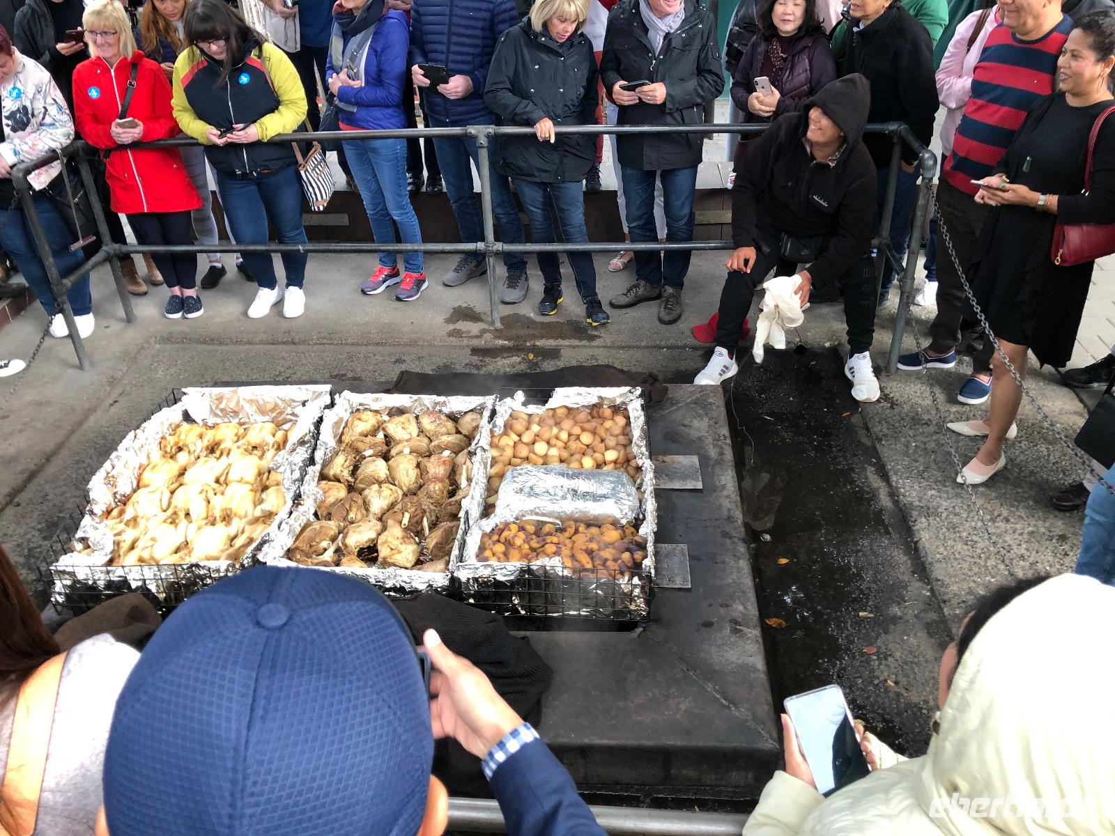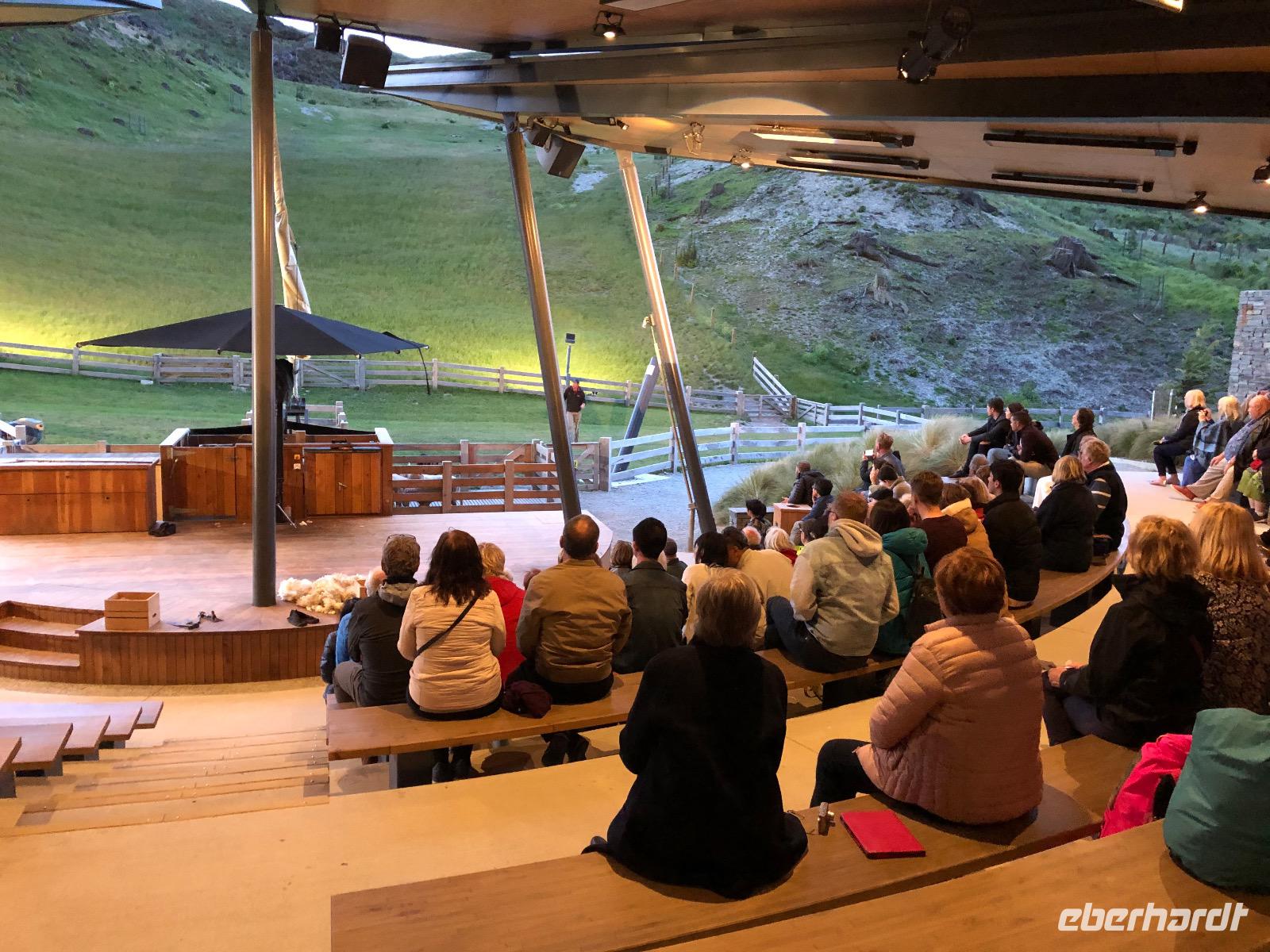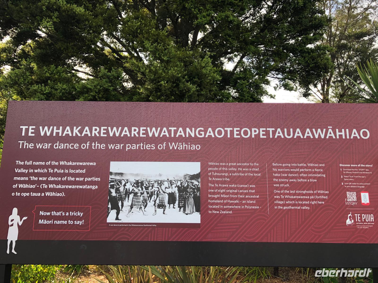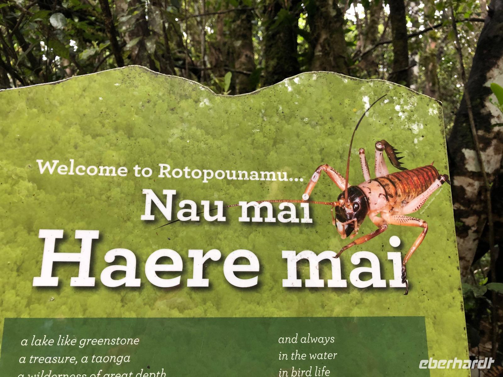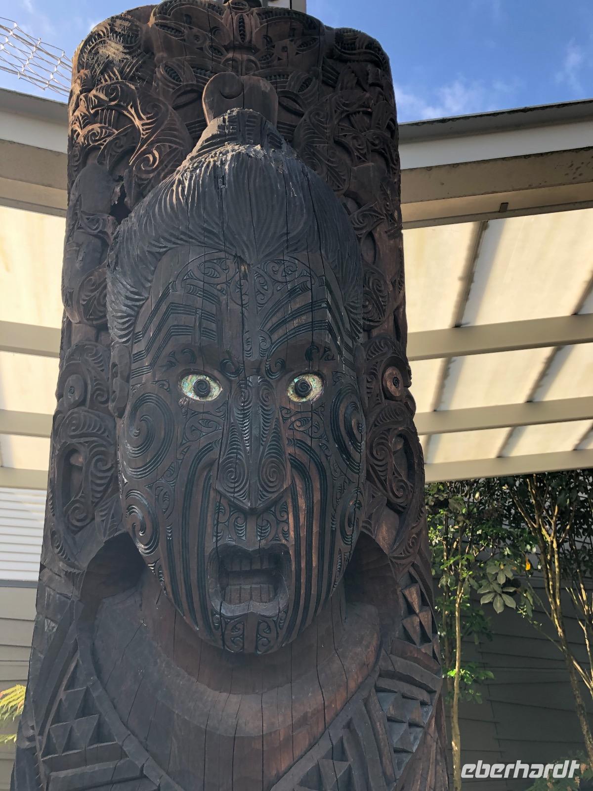 Heute besuchen wir eine Maoriveranstaltung mit anschließendem Hangi-Essen. Wir warten zusammen mit anderen Gästen vor dem Hotel auf unseren Transfer. Eine Gruppe nach der anderen wird abgeholt, die Fahrer sind Maoris, die wir später bei der Veranstaltung wieder sehen. Ein großer kräftiger Mann ist traditionell in ein Fell gekleidet und eine respektvolle Erscheinung. Unser Fahrer heißt John. Er ist nicht so spektakulär angezogen, nur mit einer Haifischzahnkette geschmückt. Wir werden freundlich empfangen und an zwei Tischen platziert. Später besichtigen wir den Erdofen, in dem unser Abendessen, das Hangi, gart. Am Flussufer kommt ein Kanu mit wilden Maoris an. Sie stoßen laute Kampfesrufe aus, wedeln bedrohlich mit den Paddeln, rollen mit den Augen und strecken die Zunge heraus. Dieses Minenspiel ist typisch und wiederholt sich später auf der Bühne. Die Vorstellung beginnt mit einem Ritual, wo der Häuptling Vertreter der Gäste nach Maori-Art empfängt. Während der Show, in der getanzt und gesungen wird, stellen die Maori auch verschiedene Waffen und Musikinstrumente vor. Die Frauen und Mädchen singen und lassen die Hüften kreisen, die Männer geben sich kämpferisch. Nach der Vorstellung beginnt das Hangi Essen. Es gibt Lamm und Huhn und verschiedene Kartoffelsorten. Nach dem Abendessen begeben wir uns mit John auf eine Glühwürmchen Wanderung. Und tatsächlich leuchten kleine grüne Punkte im Waldboden. Faszinierend.