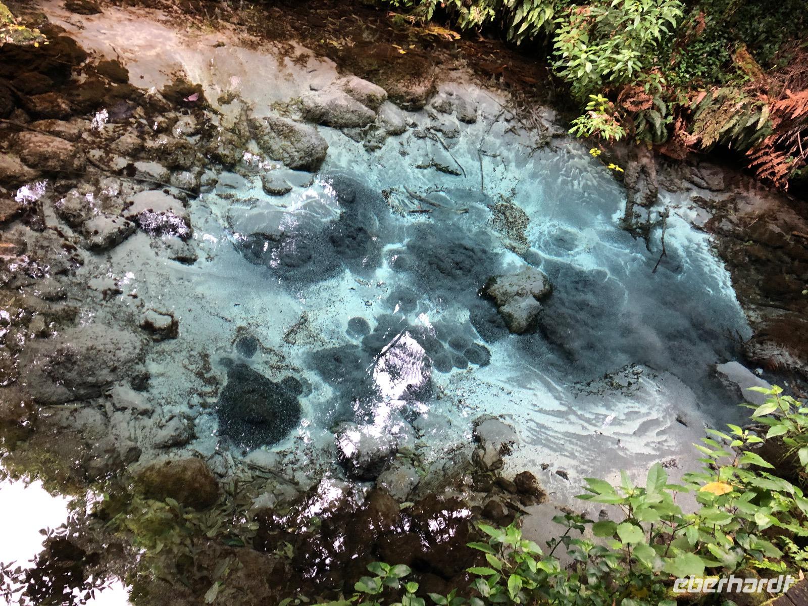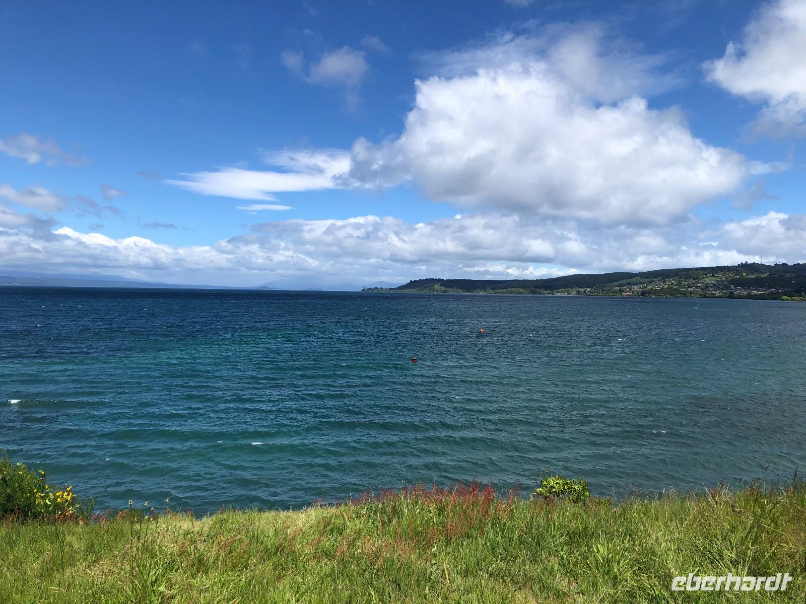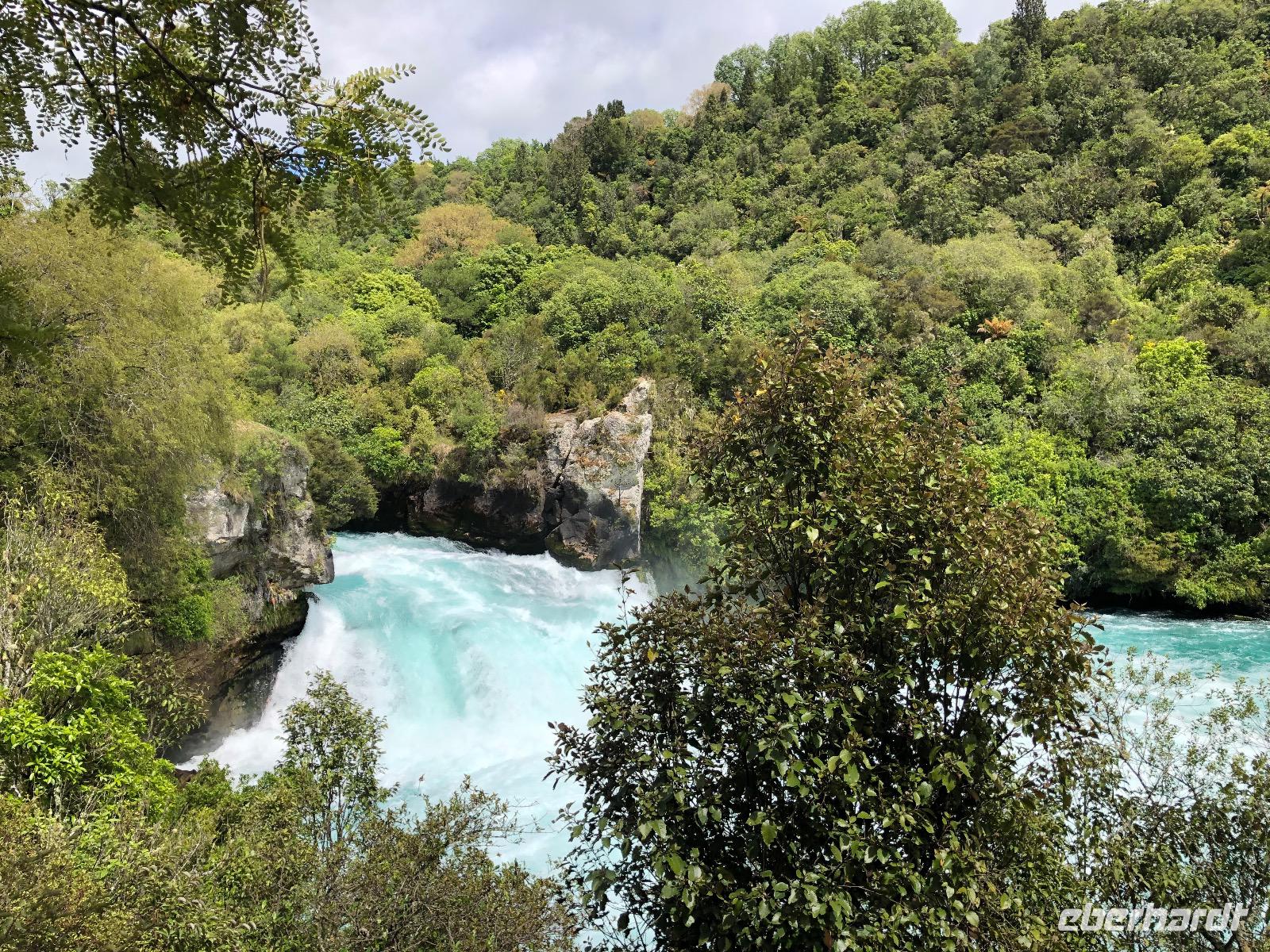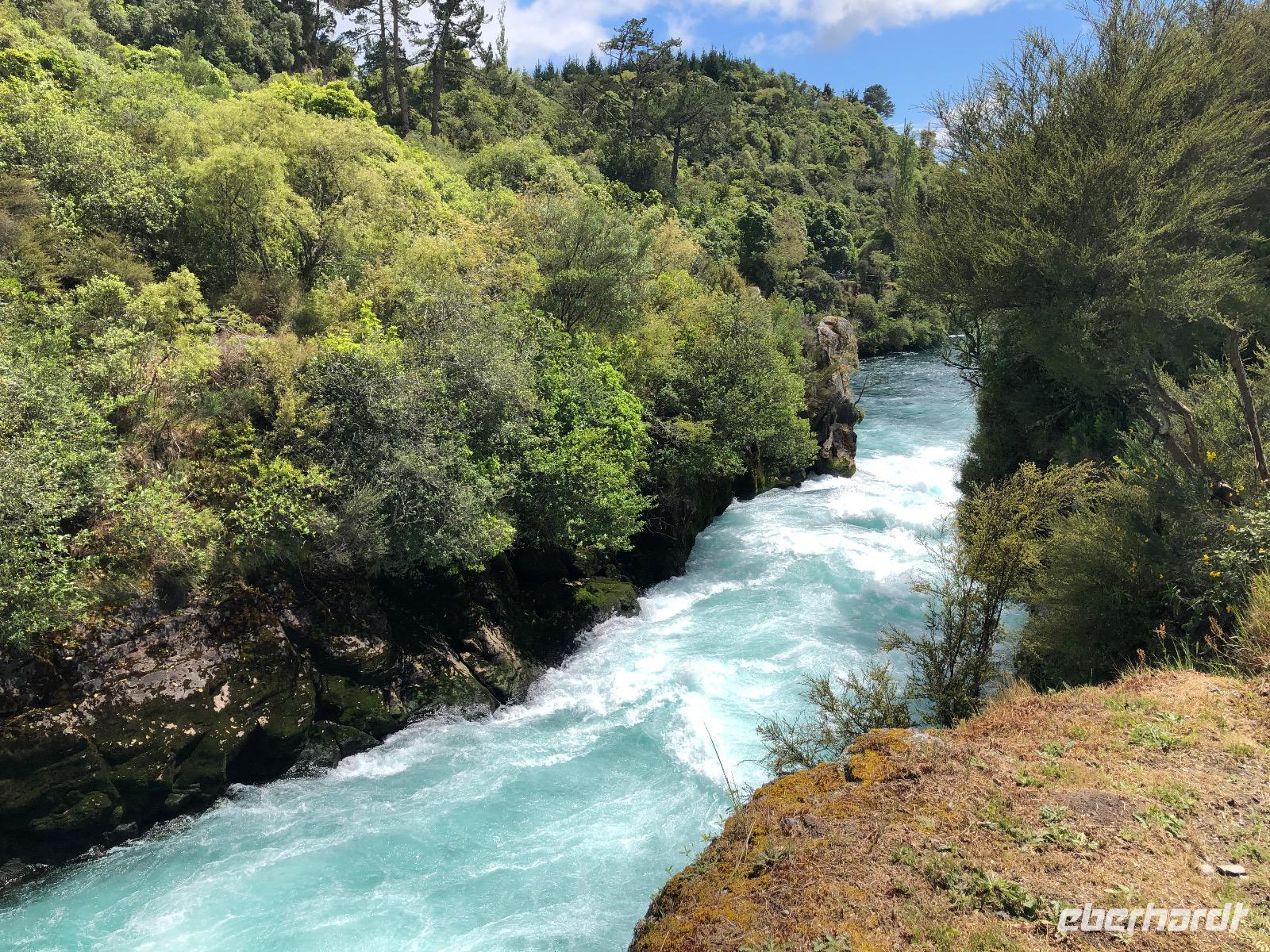 Bevor wir Taupo erreichen, legen wir einen Fotostopp an den Huka Falls ein. Das stahlblaue Wasser schießt hier durch eine schmale Schlucht und über eine Felsstufe von elf Metern stürzen pro Sekunde 220.000 Liter Wasser in die Tiefe. In Taupo halten wir uns nur für eine halbe Stunde auf. Zeit für einen Imbiss und einen Blick auf den größten See Neuseelands. Die Landschaft, die wir nun durchqueren, ist geprägt von grünen Nadelbäumen vermischt mit tausenden gelben Ginsterbüschen. Es sieht aus wie Rührei mit Spinat.