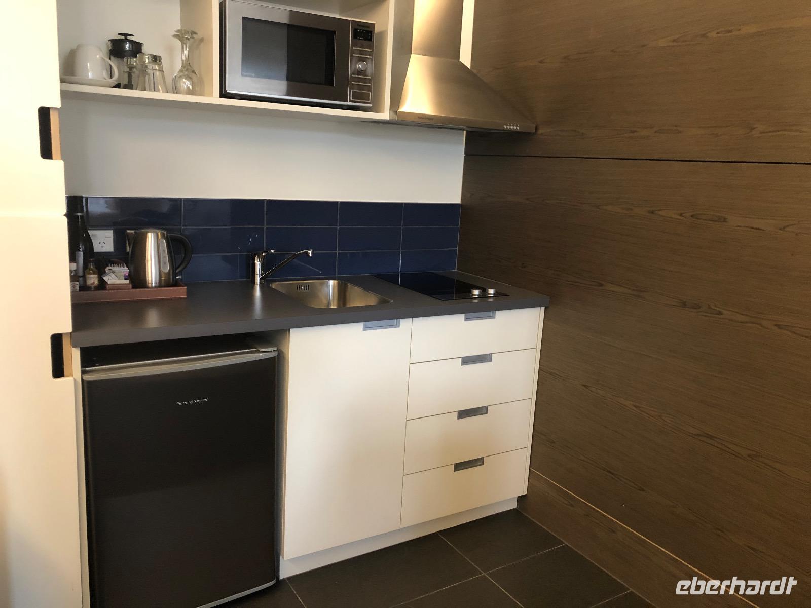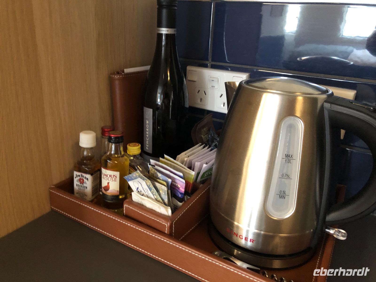 In den Zimmern gibt es einen Wasserkocher, Tee und Kaffe, im Kühlschrank steht eine kleine Flasche Milch.
