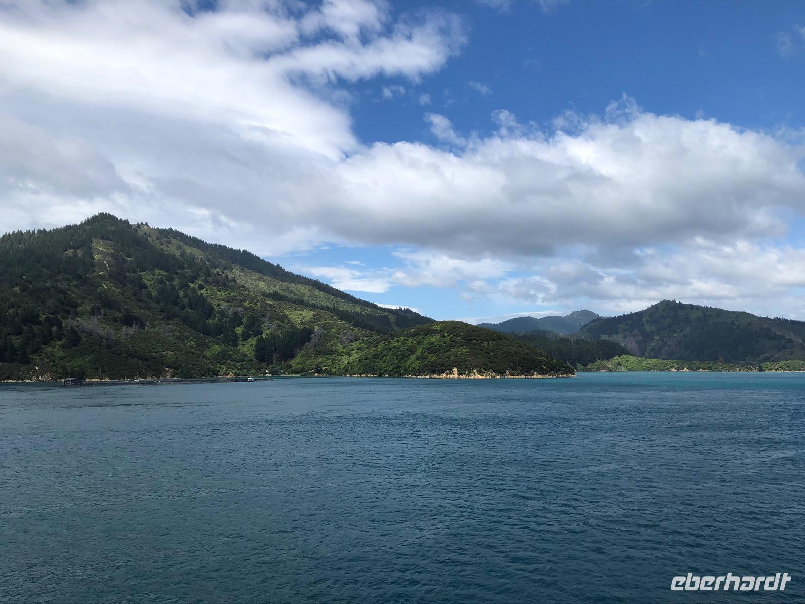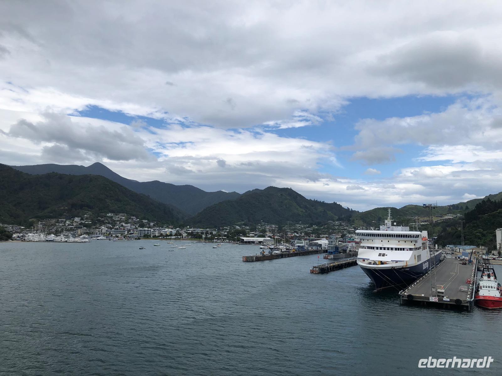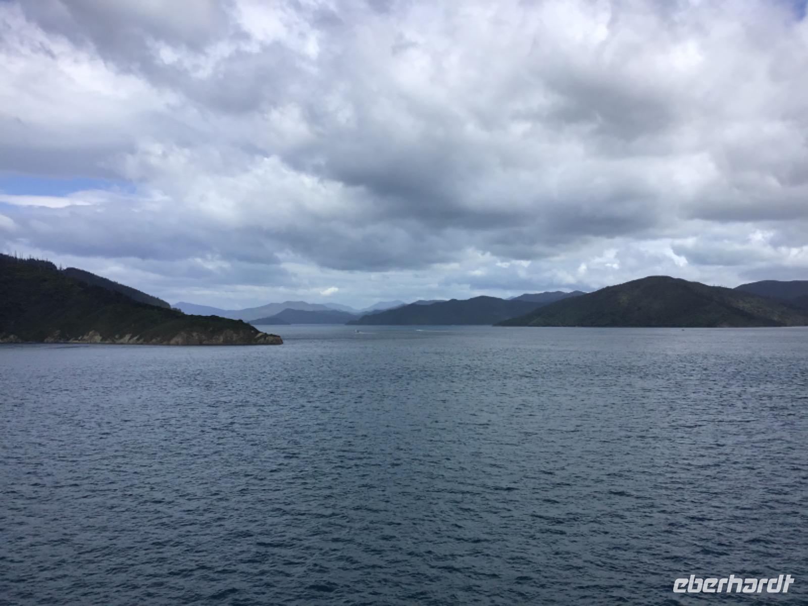 Wir fahren nur wenig früher ab als sonst. Gegen neun soll unsere Fähre ablegen. Dylan bringt uns zum Hafen und die Verabschiedung ist herzlich. Die Abfertigung unkompliziert und dann geht es auch schon los. Circa 1350 Passagiere fahren täglich mit der Fähre von Norden nach Süden bzw. umgekehrt. Platz genug ist für alle, es gibt mehrere Restaurants, auch kostenpflichtige Lounges und Außendecks. Die Ausfahrt von Wellington ist windig, doch sobald wir die Bucht verlassen und auf das offene Meer kommen, wird es stürmisch und das Außendeck geschlossen. Erst eine Stunde vor Ankunft, wiederum in einer Bucht, dürfen wir wieder an die frische Luft und die Einfahrt nach Picton beobachten. Unser Busfahrer auf der Südinsel heißt Dale.