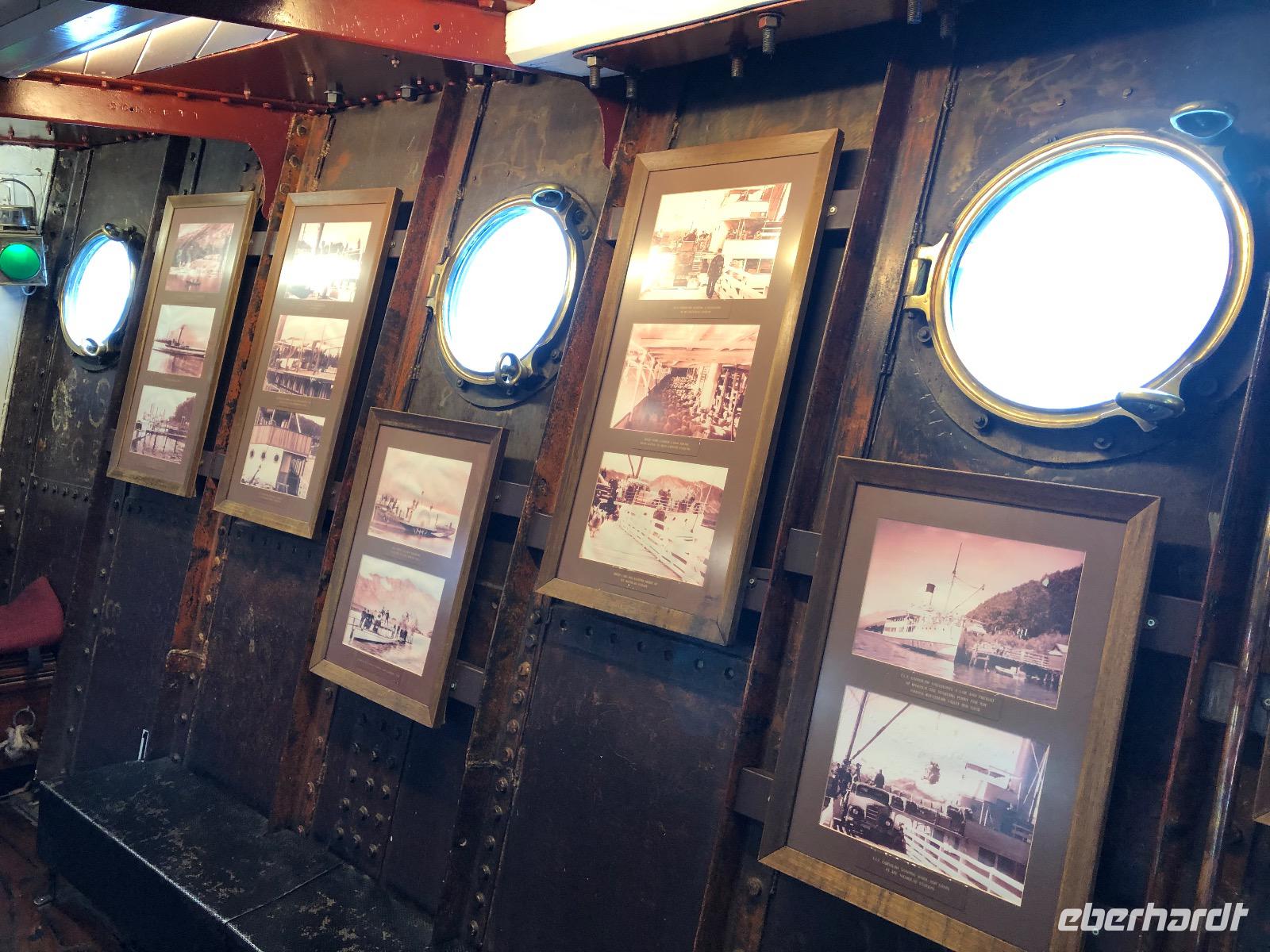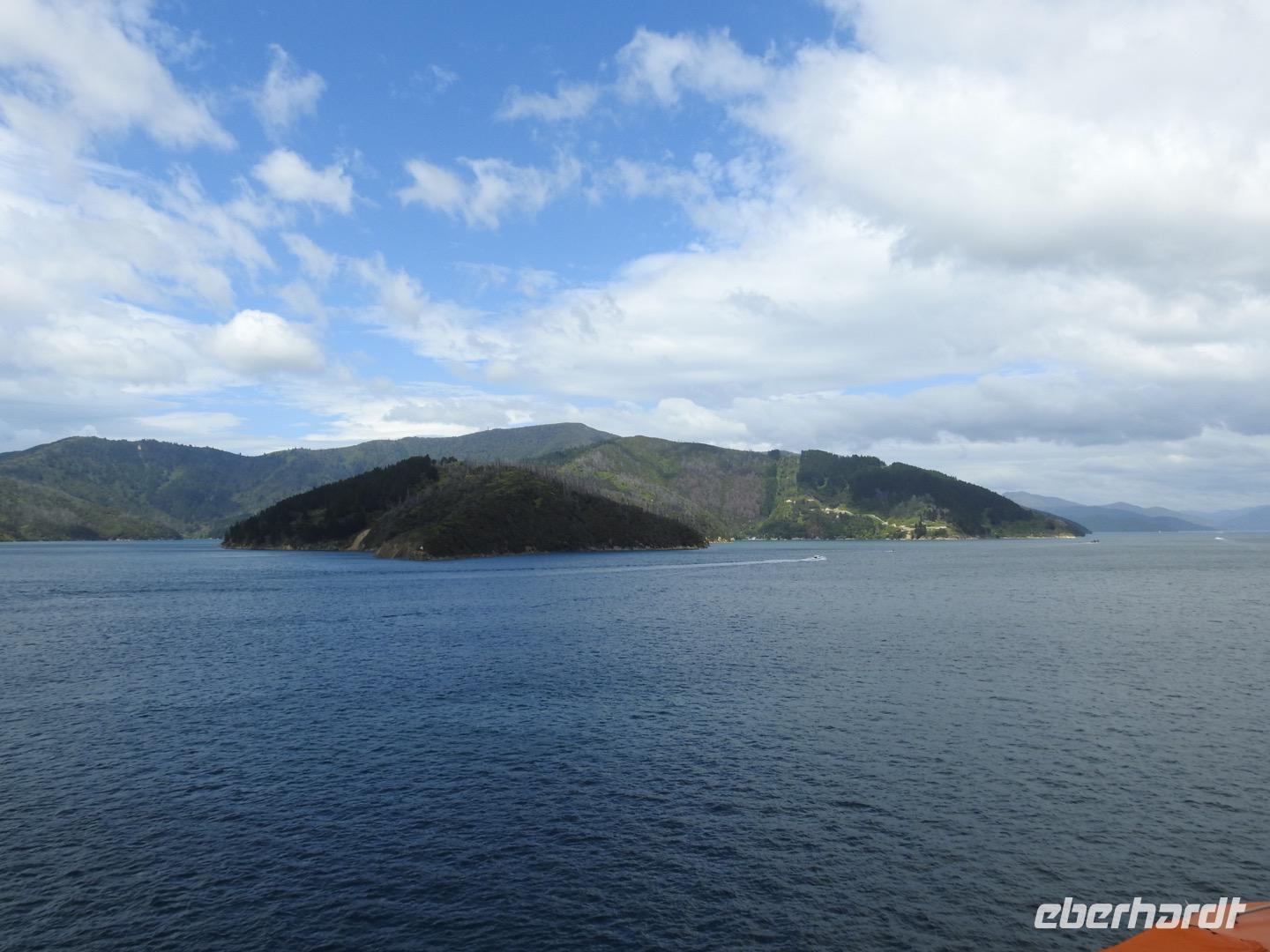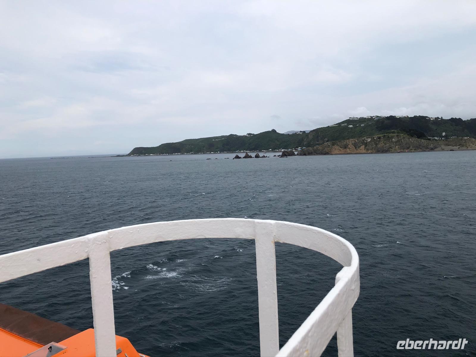 Wir fahren nur wenig früher ab als sonst. Gegen neun soll unsere Fähre ablegen. Dylan bringt uns zum Hafen und die Verabschiedung ist herzlich. Die Abfertigung unkompliziert und dann geht es auch schon los. Circa 1350 Passagiere fahren täglich mit der Fähre von Norden nach Süden bzw. umgekehrt. Platz genug ist für alle, es gibt mehrere Restaurants, auch kostenpflichtige Lounges und Außendecks. Die Ausfahrt von Wellington ist windig, doch sobald wir die Bucht verlassen und auf das offene Meer kommen, wird es stürmisch und das Außendeck geschlossen. Erst eine Stunde vor Ankunft, wiederum in einer Bucht, dürfen wir wieder an die frische Luft und die Einfahrt nach Picton beobachten. Unser Busfahrer auf der Südinsel heißt Dale.