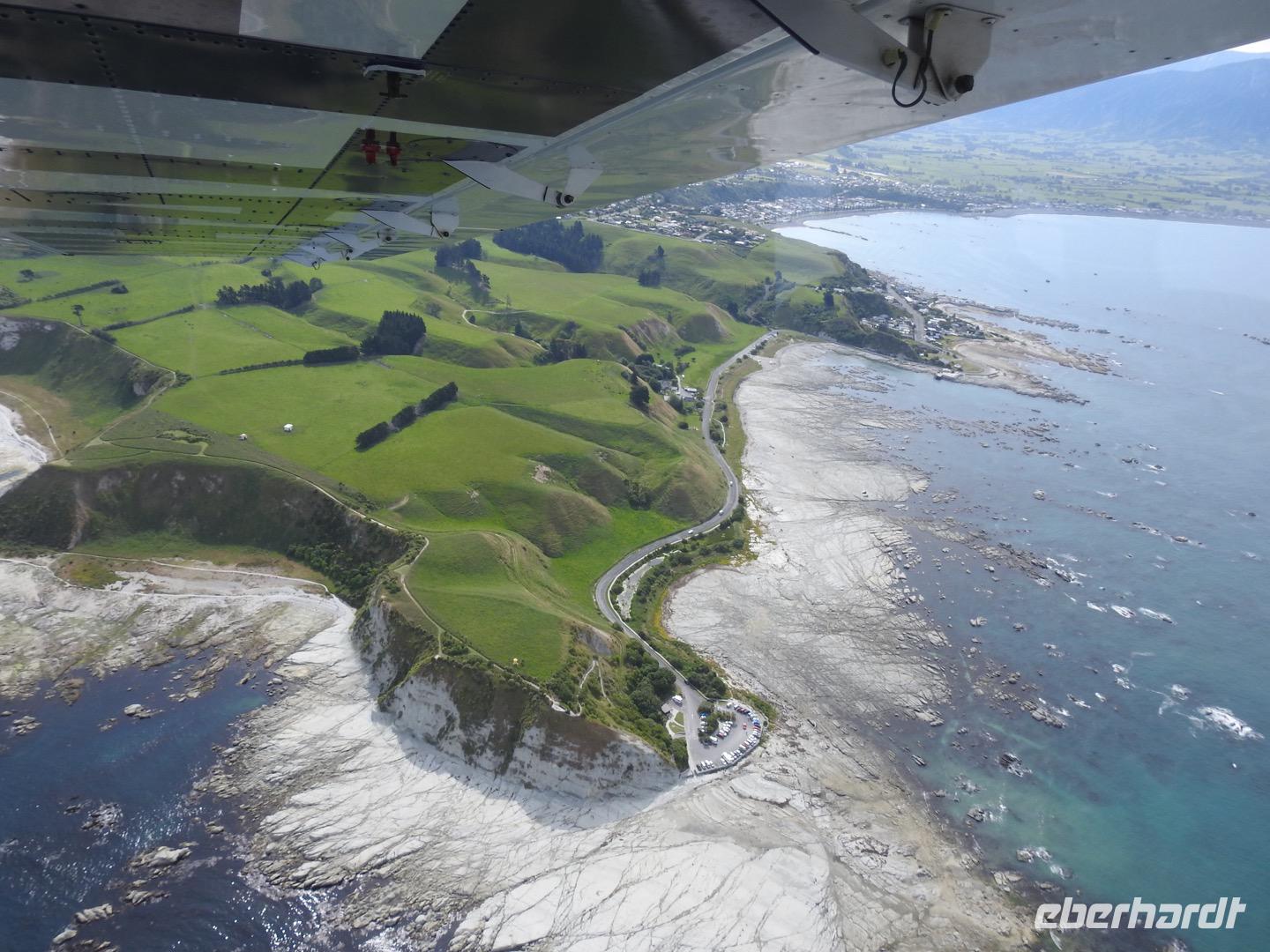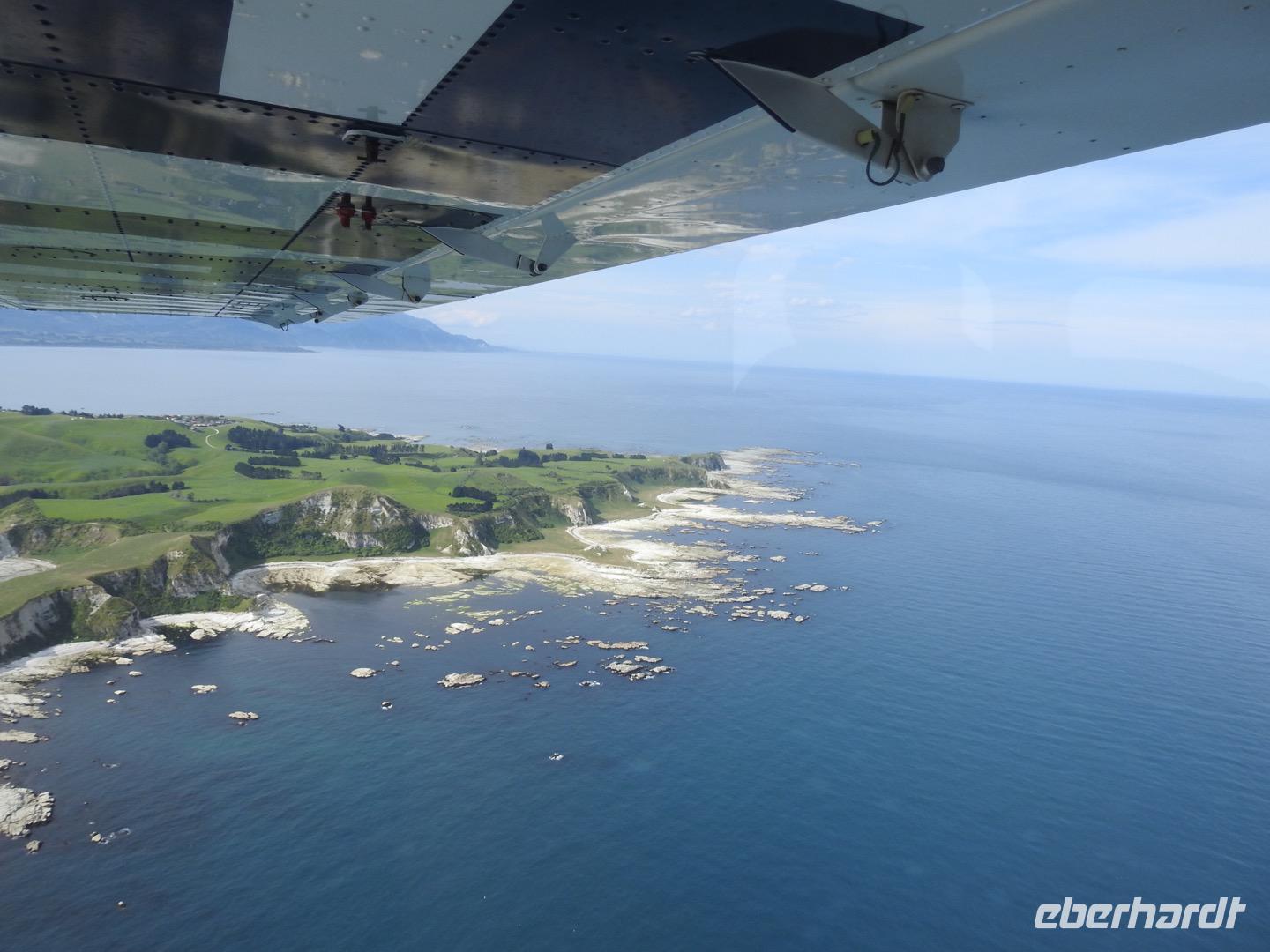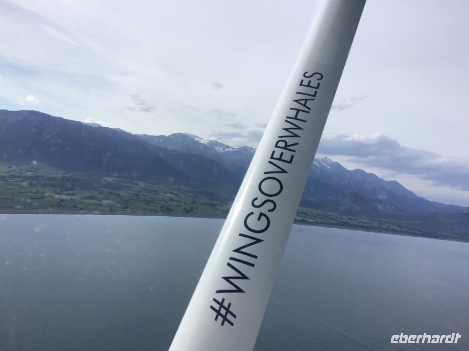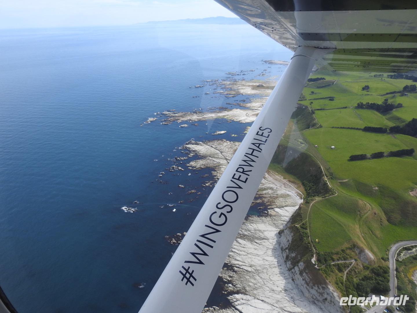 Der Weg weiter nach Süden ist geprägt von riesigen Weinanbauflächen. An einer Bucht, wo sich Robben tummeln, legen wir einen Fotostopp ein. In Kaikoura haben wir die Möglichkeit, an einem Rundflug über die Region teilzunehmen, mit der Aussicht auf Wale. Nur wenige Gäste entscheiden sich dafür. Wir füllen direkt ein Flugzeug. Im Büro von Wingsoverwhales (Flügel über Wale), so heißt die Agentur, die das Whalewatching per Flug anbietet, werden wir freundlich begrüßt. Zunächst erhalten wir Informationen über die Wale, die es hier zu sehen gäbe oder aber auch nicht. Anschließend erfolgt die Sicherheitsbelehrung und wir werden mit Schwimmwesten ausgestattet. Endlich geht es zum Flieger. Einer darf neben dem Piloten sitzen, die anderen in Zweierreihen dahinter. Jeder hat einen Fensterplatz. Es ist sehr eng. Wir setzen unserer Ohrschützer auf und dann geht es los. Pilot Sam startet das Flugzeug. Ziemlich schnell gewinnen wir an Höhe und bald schon rauschen wir über das türkisblaue Wasser. Keine Wale in Sicht. Gefühlt dauert es ganz schön lange, bis wir endlich einen Wal entdecken. Er schwimmt gut sichtbar an der Wasseroberfläche und Sam steuert das Flugzeug so, dass wir auf beiden Seiten in den Sichtgenuss kommen. Wal bläst und schwimmt und schwimmt.