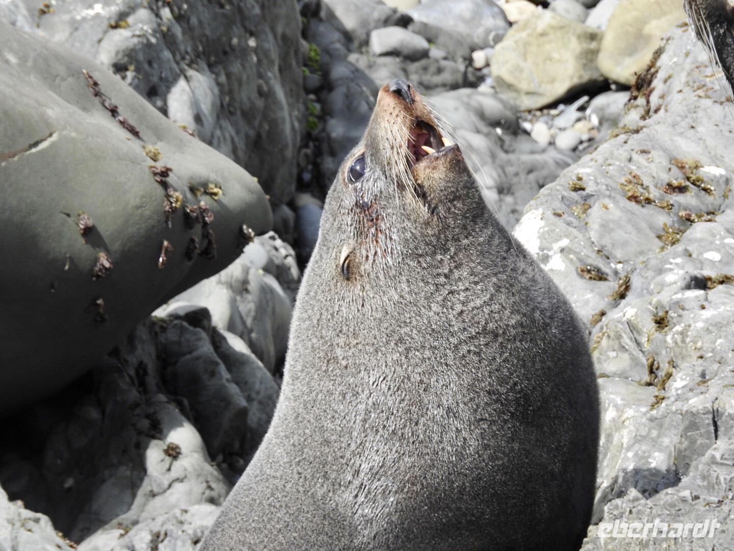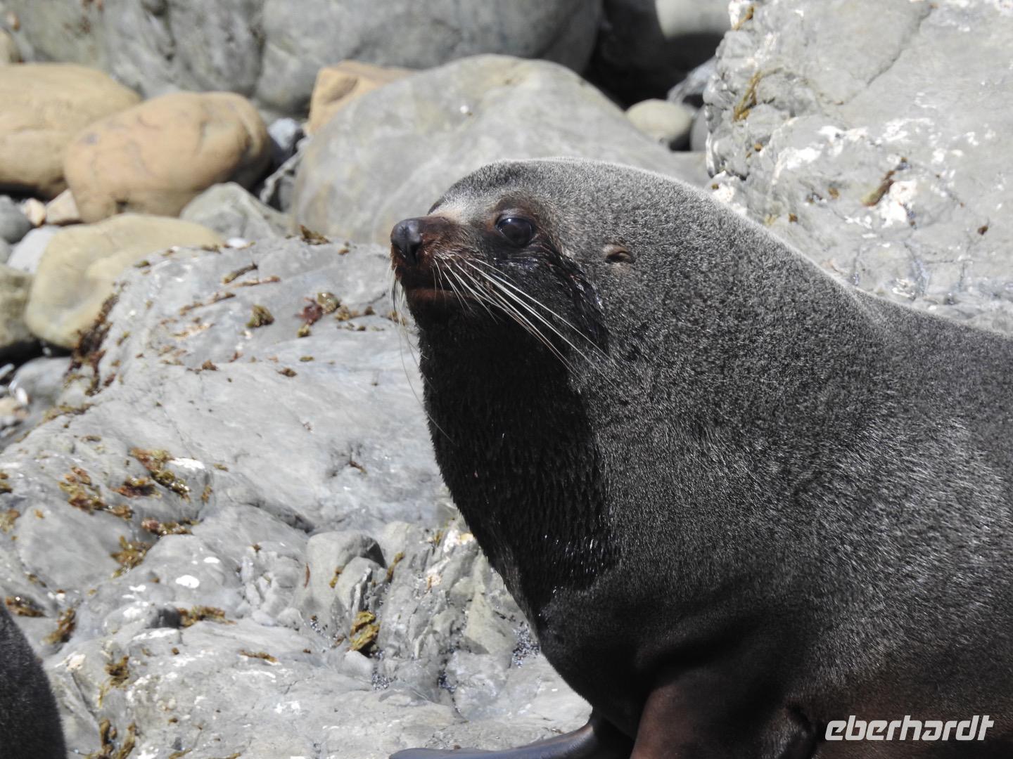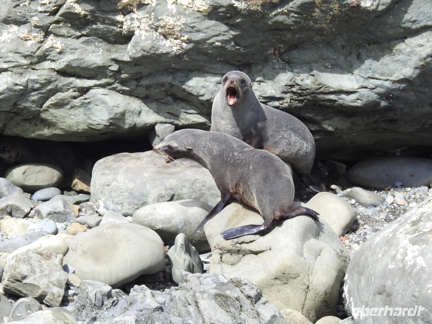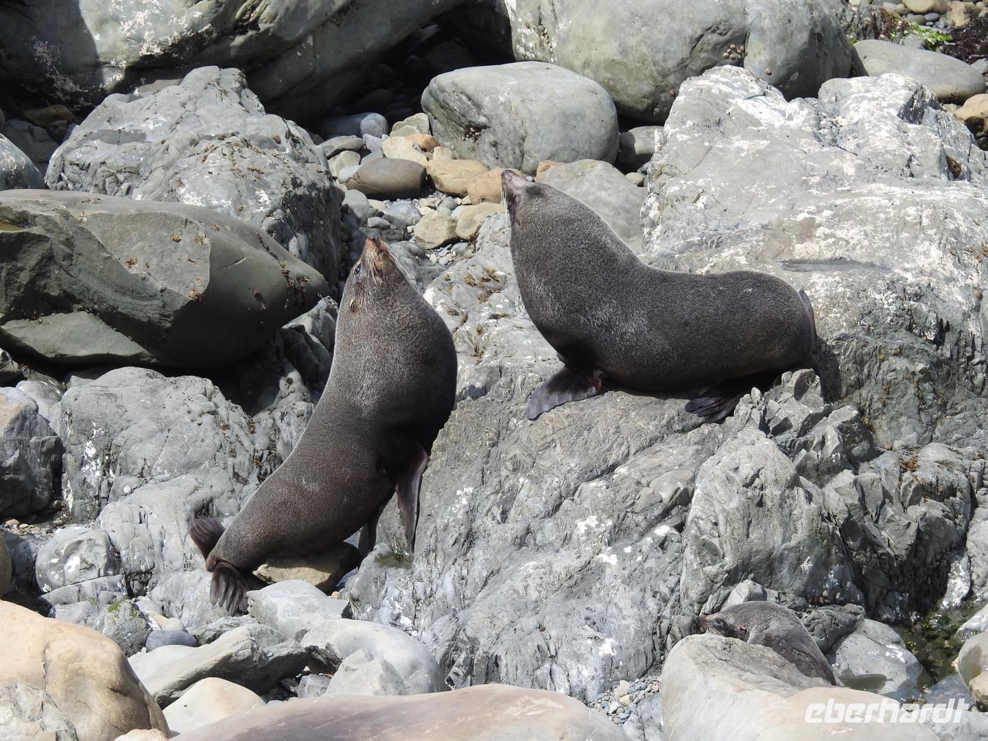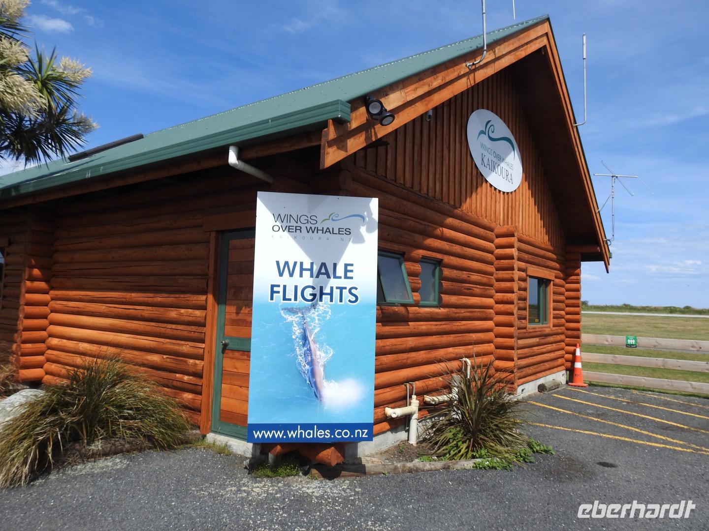Der Weg weiter nach Süden ist geprägt von riesigen Weinanbauflächen. An einer Bucht, wo sich Robben tummeln, legen wir einen Fotostopp ein. In Kaikoura haben wir die Möglichkeit, an einem Rundflug über die Region teilzunehmen, mit der Aussicht auf Wale. Nur wenige Gäste entscheiden sich dafür. Wir füllen direkt ein Flugzeug. Im Büro von Wingsoverwhales (Flügel über Wale), so heißt die Agentur, die das Whalewatching per Flug anbietet, werden wir freundlich begrüßt. Zunächst erhalten wir Informationen über die Wale, die es hier zu sehen gäbe oder aber auch nicht. Anschließend erfolgt die Sicherheitsbelehrung und wir werden mit Schwimmwesten ausgestattet. Endlich geht es zum Flieger. Einer darf neben dem Piloten sitzen, die anderen in Zweierreihen dahinter. Jeder hat einen Fensterplatz. Es ist sehr eng. Wir setzen unserer Ohrschützer auf und dann geht es los. Pilot Sam startet das Flugzeug. Ziemlich schnell gewinnen wir an Höhe und bald schon rauschen wir über das türkisblaue Wasser. Keine Wale in Sicht. Gefühlt dauert es ganz schön lange, bis wir endlich einen Wal entdecken. Er schwimmt gut sichtbar an der Wasseroberfläche und Sam steuert das Flugzeug so, dass wir auf beiden Seiten in den Sichtgenuss kommen. Wal bläst und schwimmt und schwimmt.