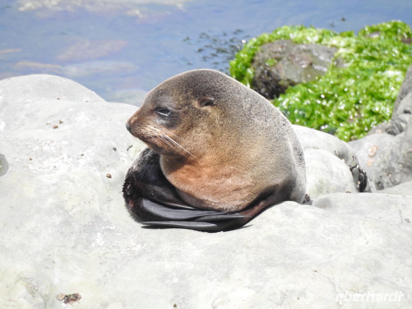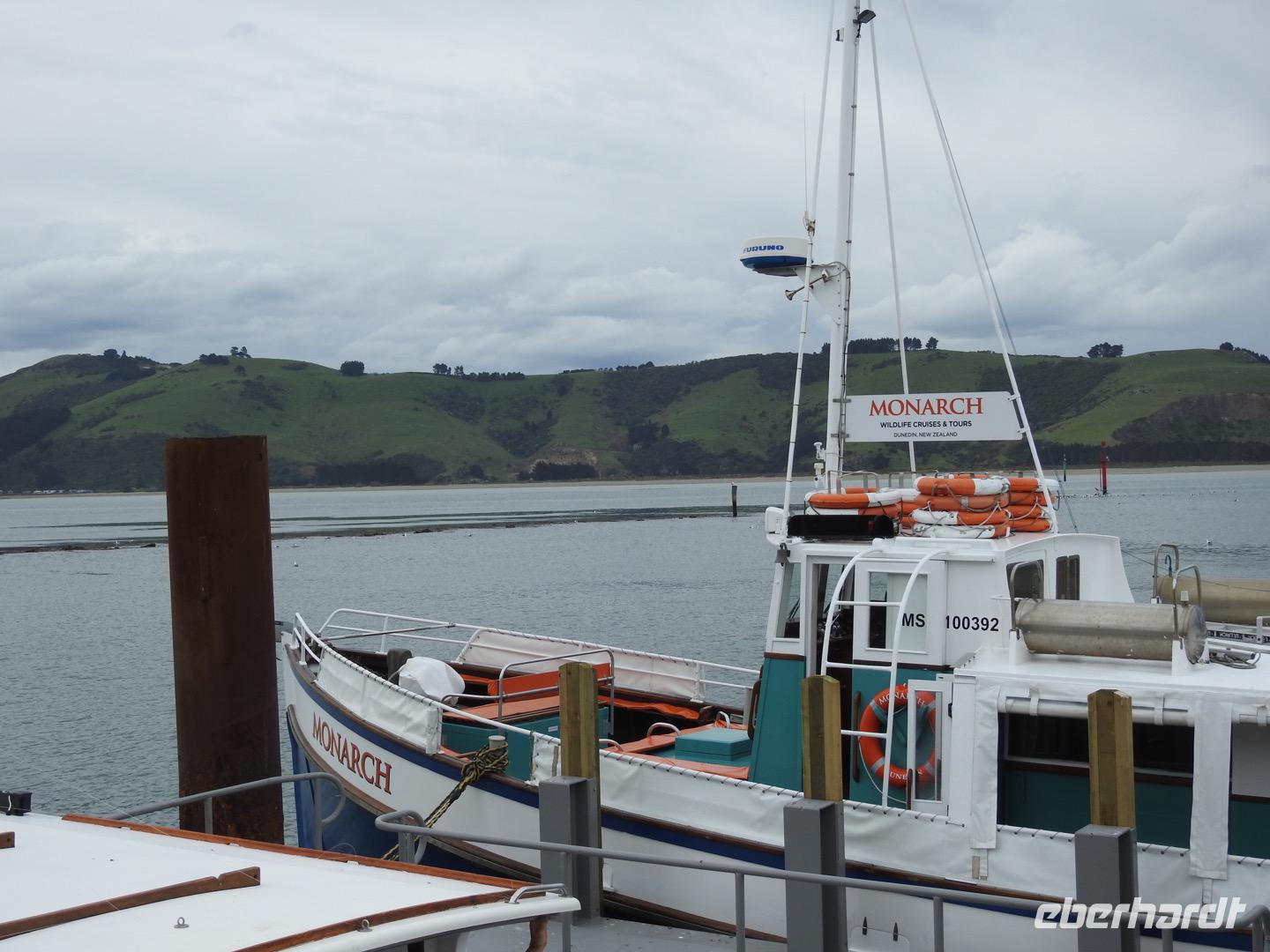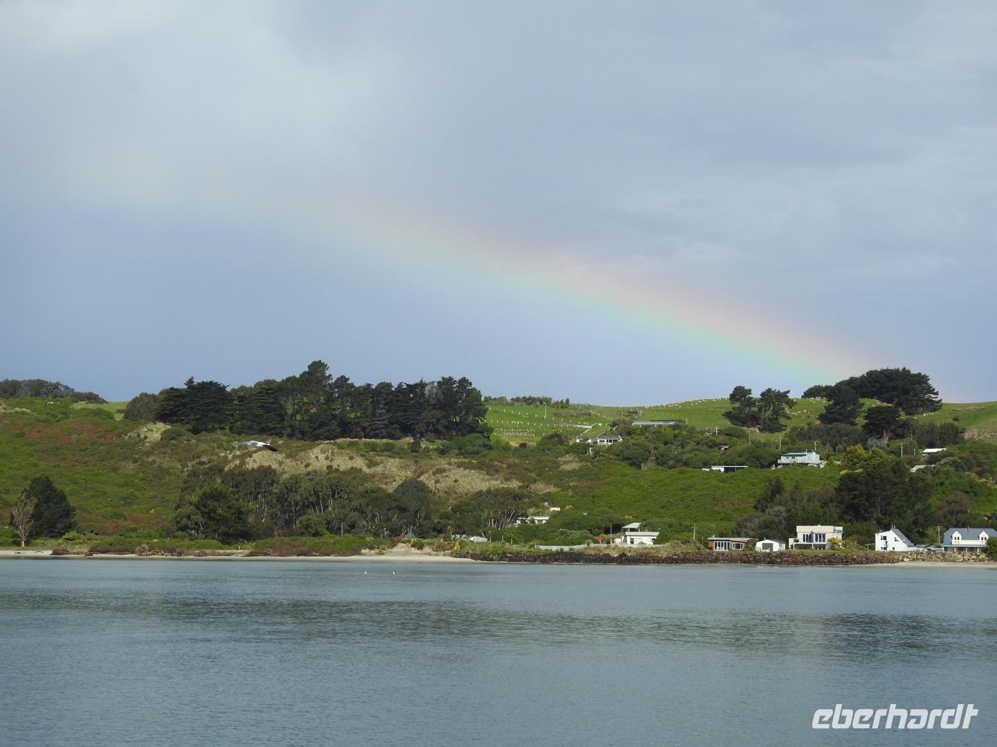 In Omaru reicht die Zeit für einen Kaffee. Wir schlendern vorbei an den cremefarbenen Bauten aus Kalkstein, bevor wir unseren Weg Richtung Dunedin fortsetzen. Mittags erreichen wir den Koekohe Beach. Markant sind hier die kugelrunden Felsbrocken, die den Strand zieren. Sie sind bis zu zwei Meter hoch und jede wiegt mehrere Tonnen. Nachmittags unternehmen wir eine Bootsfahrt. Wir erwarten Albatrosse, Pinguine und Seelöwen zu sehen. Auf dem relativ kleinen Boot können wir vorn oder hinten draußen sitzen, wem das zu kalt ist, der kann sich auch Innen aufhalten. Wir bekommen riesengroße Wetterjacken zur Verfügung gestellt, die sogar über unsere Anoraks passen. Der Kapitän spricht mit sonorer Stimme und erklärt, was es zu sehen gibt. Wir kommen an einem Leuchtturm vorbei und schon zeigen sich die ersten Albatrosse. Später gleiten sie majestätisch über uns hinweg und an unserem Boot vorbei. Obwohl der Kapitän meinte, es wäre heute ein ruhiger Tag, ist es mit dem Fotografieren schwierig, weil das Boot sich doch ganz schön in den Wellen bewegt. Wir nähern uns einem Felsen, auf dem sich Seelöwen aalen. Auch ein blauer Pinguin soll zu sehen sein. Einige, mit scharfen Augen, können ihn auch entdecken. Ein kleiner Regenschauer erwischt uns, kann uns aber nicht vom Deck vertreiben. Auf dem Rückweg scheint dann wieder die Sonne und ein Regenbogen erscheint.