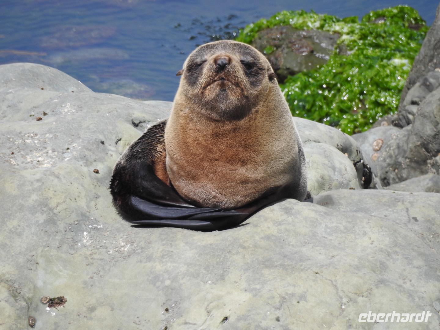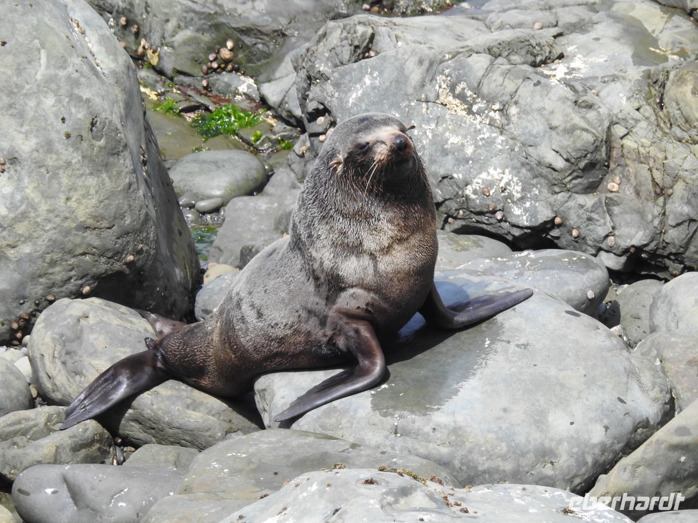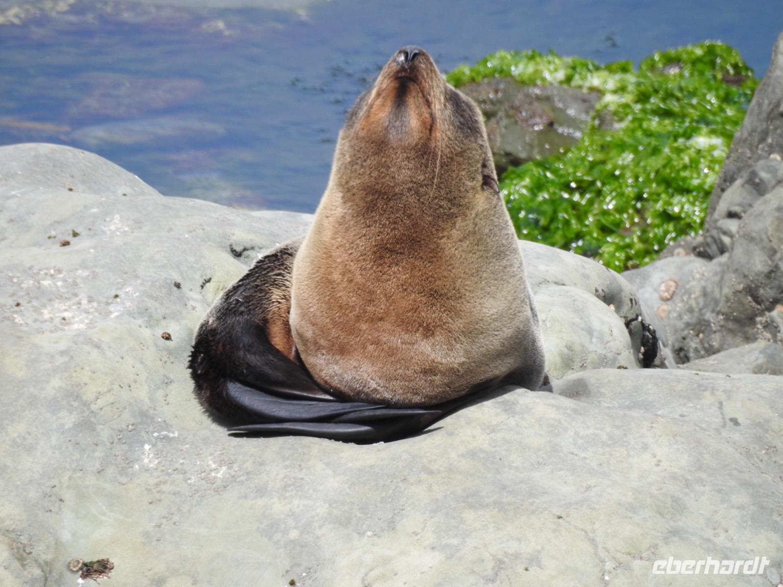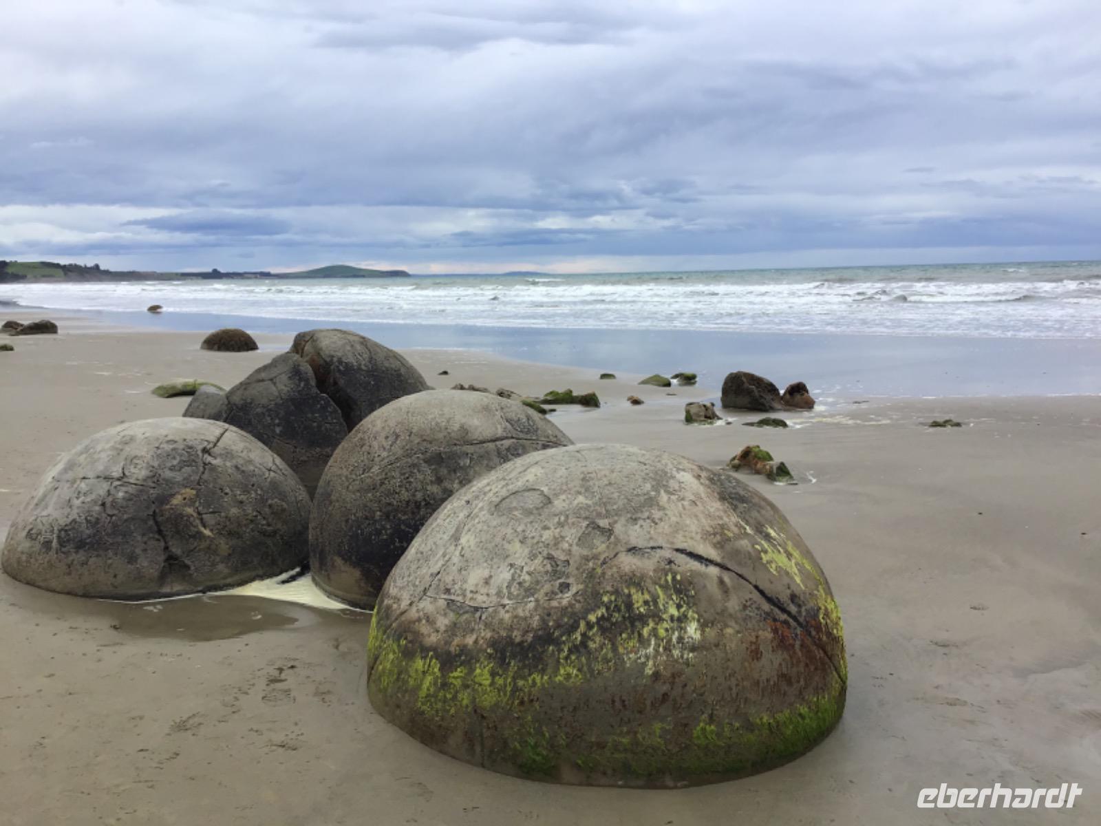 In Omaru reicht die Zeit für einen Kaffee. Wir schlendern vorbei an den cremefarbenen Bauten aus Kalkstein, bevor wir unseren Weg Richtung Dunedin fortsetzen. Mittags erreichen wir den Koekohe Beach. Markant sind hier die kugelrunden Felsbrocken, die den Strand zieren. Sie sind bis zu zwei Meter hoch und jede wiegt mehrere Tonnen. Nachmittags unternehmen wir eine Bootsfahrt. Wir erwarten Albatrosse, Pinguine und Seelöwen zu sehen. Auf dem relativ kleinen Boot können wir vorn oder hinten draußen sitzen, wem das zu kalt ist, der kann sich auch Innen aufhalten. Wir bekommen riesengroße Wetterjacken zur Verfügung gestellt, die sogar über unsere Anoraks passen. Der Kapitän spricht mit sonorer Stimme und erklärt, was es zu sehen gibt. Wir kommen an einem Leuchtturm vorbei und schon zeigen sich die ersten Albatrosse. Später gleiten sie majestätisch über uns hinweg und an unserem Boot vorbei. Obwohl der Kapitän meinte, es wäre heute ein ruhiger Tag, ist es mit dem Fotografieren schwierig, weil das Boot sich doch ganz schön in den Wellen bewegt. Wir nähern uns einem Felsen, auf dem sich Seelöwen aalen. Auch ein blauer Pinguin soll zu sehen sein. Einige, mit scharfen Augen, können ihn auch entdecken. Ein kleiner Regenschauer erwischt uns, kann uns aber nicht vom Deck vertreiben. Auf dem Rückweg scheint dann wieder die Sonne und ein Regenbogen erscheint.